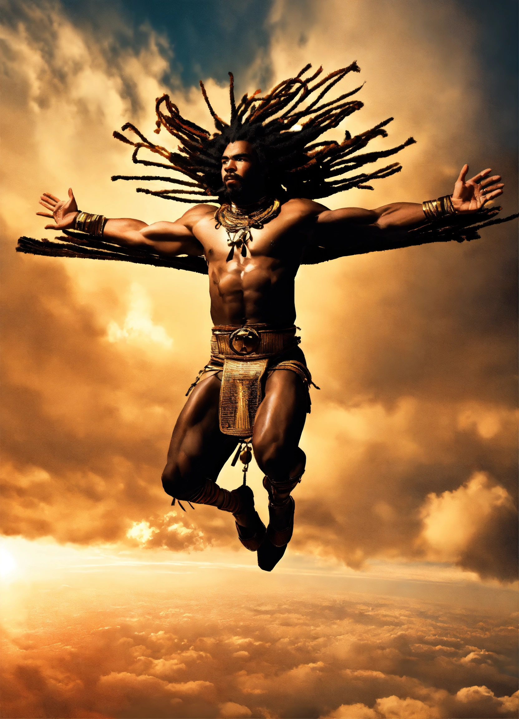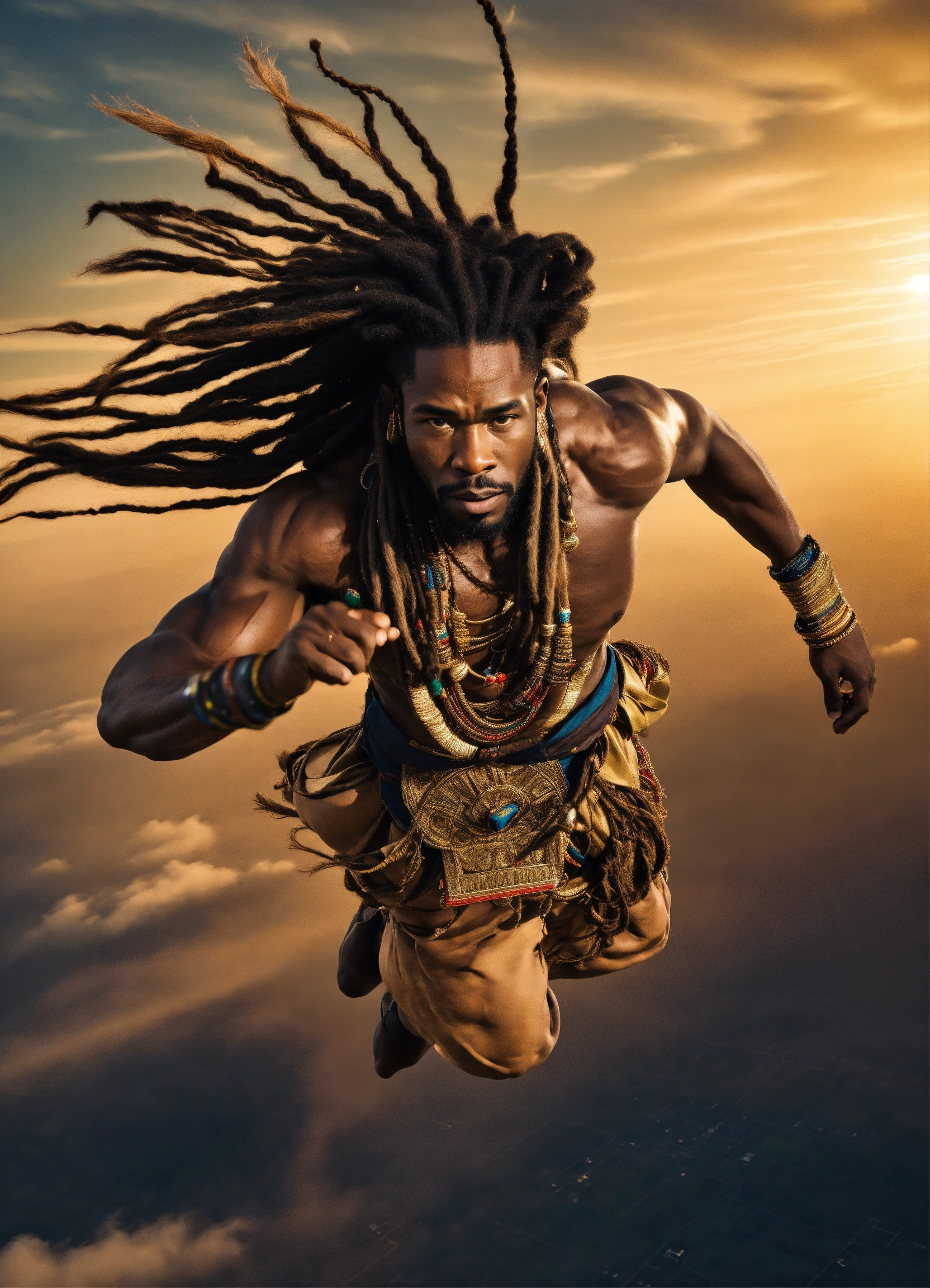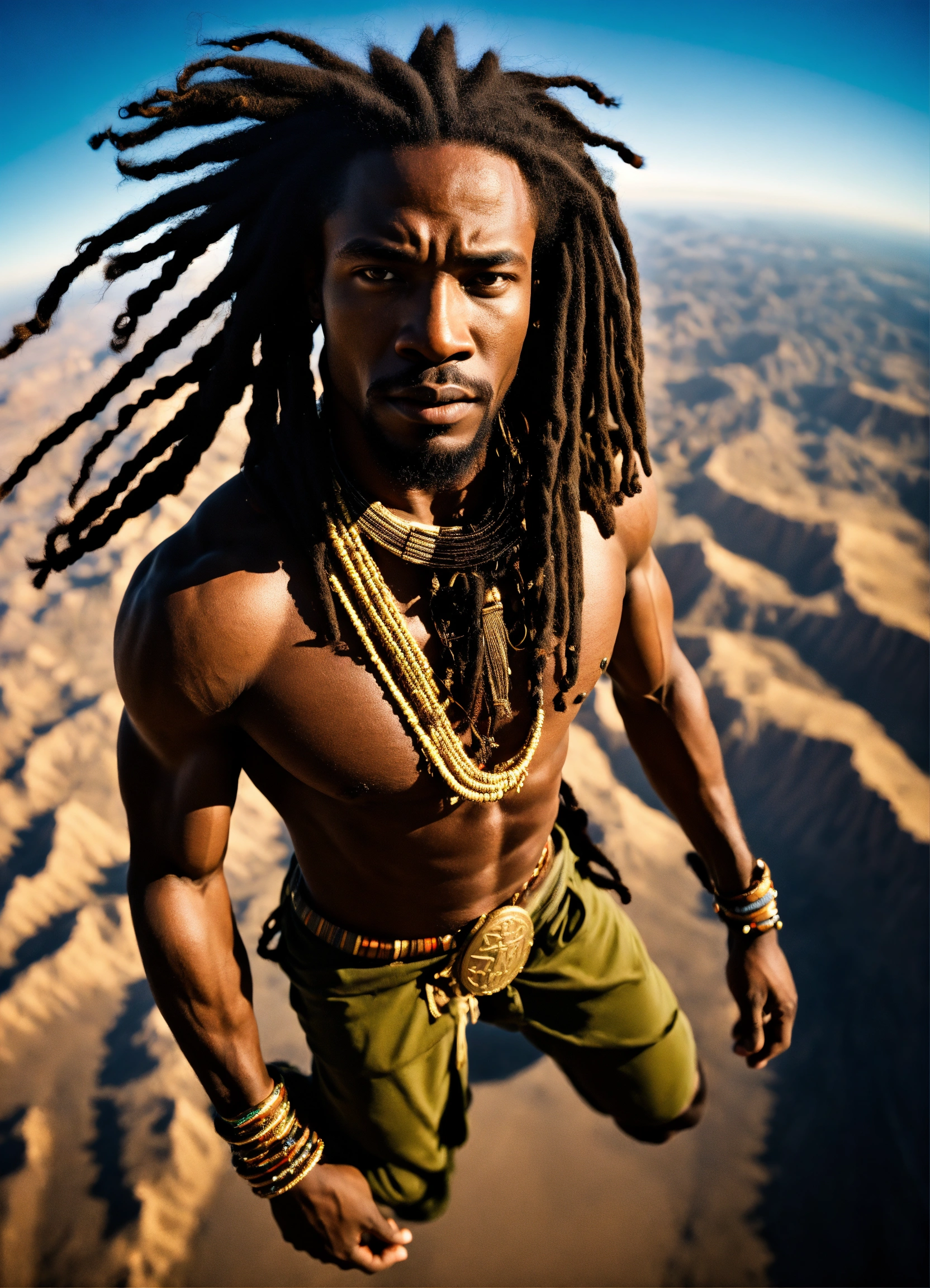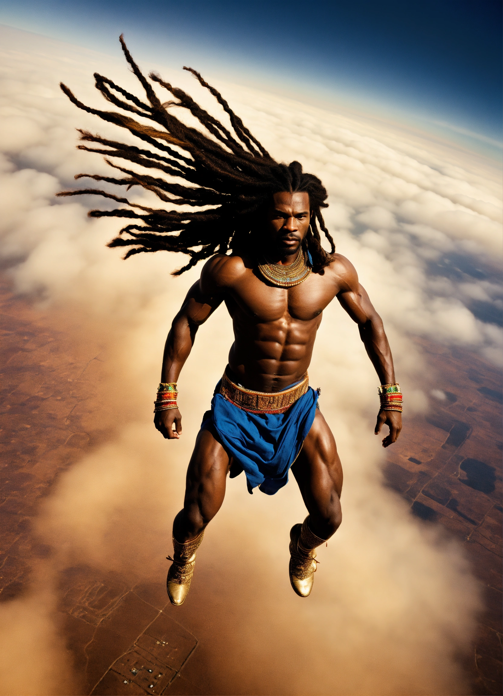 Dramatic aerial photograph of a muscular african pharaoh with long dreadlocks, falling without a parachute at 10. 000 feet in the sky, facing towards the camera. the framing should be a full body shot and include his entire body but no margin around him. please add motion blur to make the shot dynamic