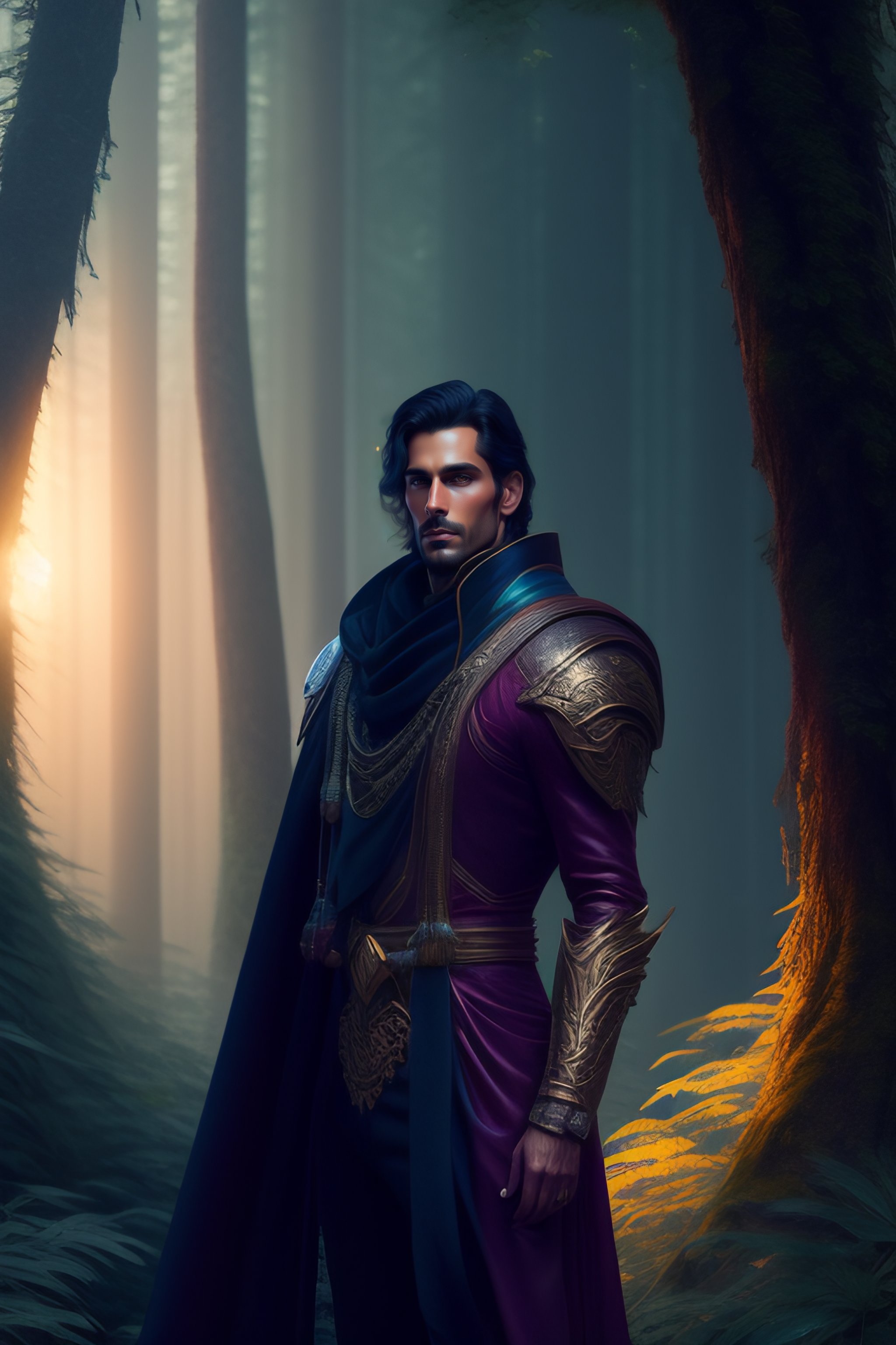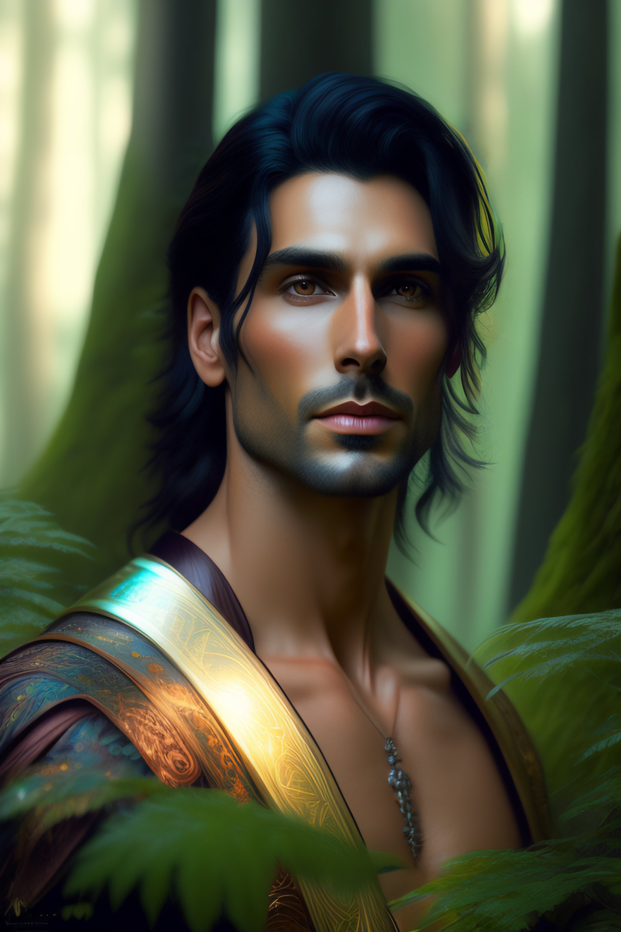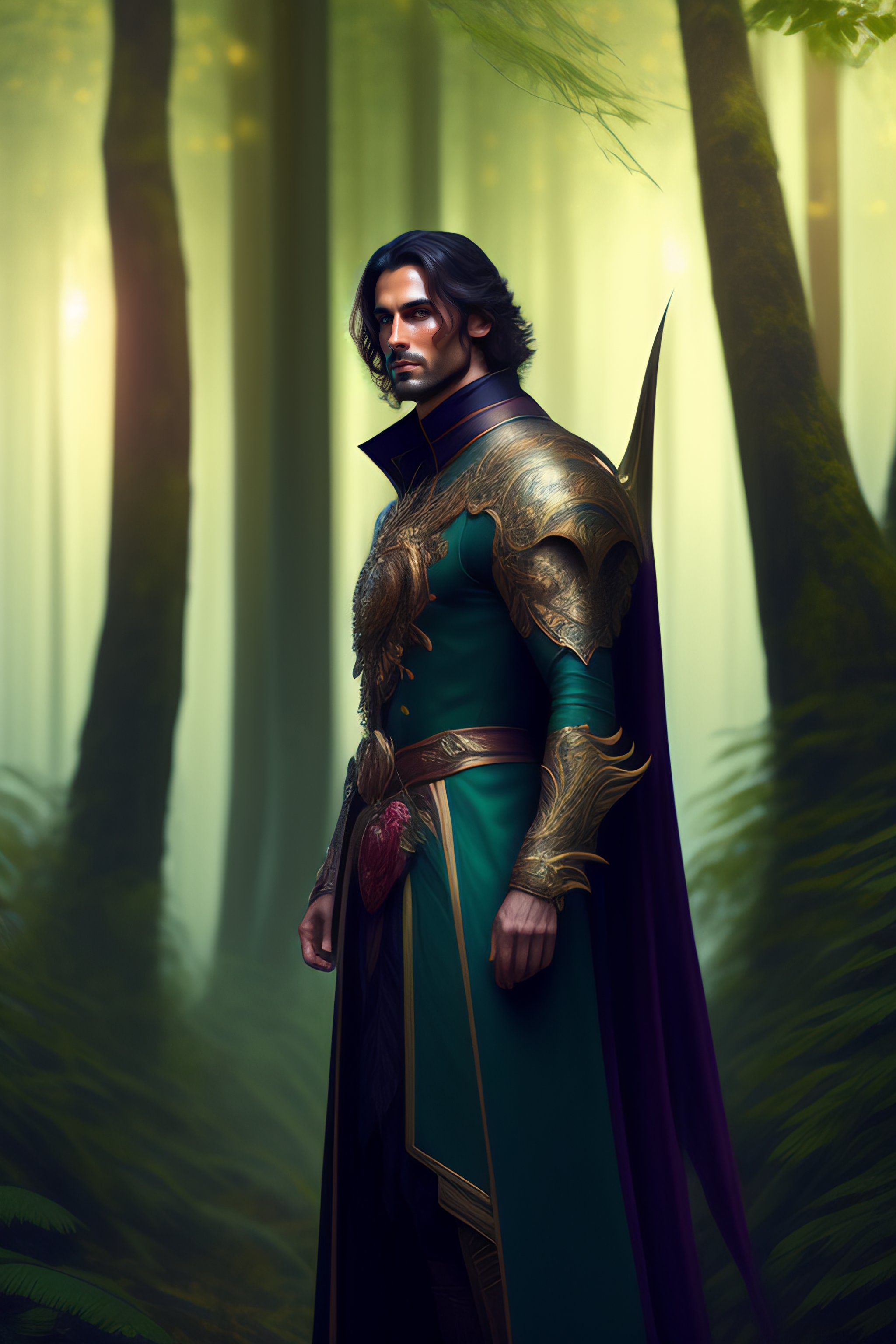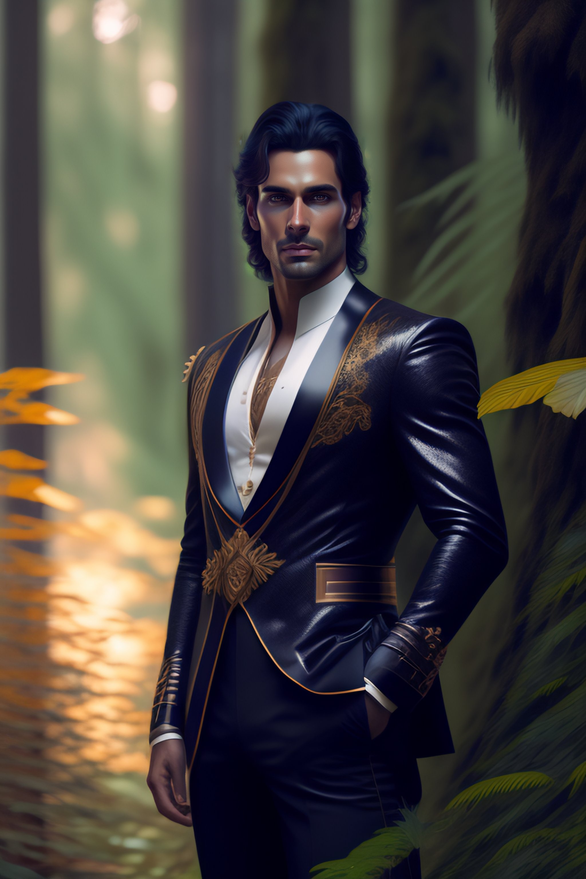 Full length shot of handsome dark haired male standing in alien colorful forest, highly detailed, digital painting, deviantart, artstation, concept art, matte, sharp focus, photo realistic, detailed face, realistic pale skin, greg rutkowski and alphonse mucha