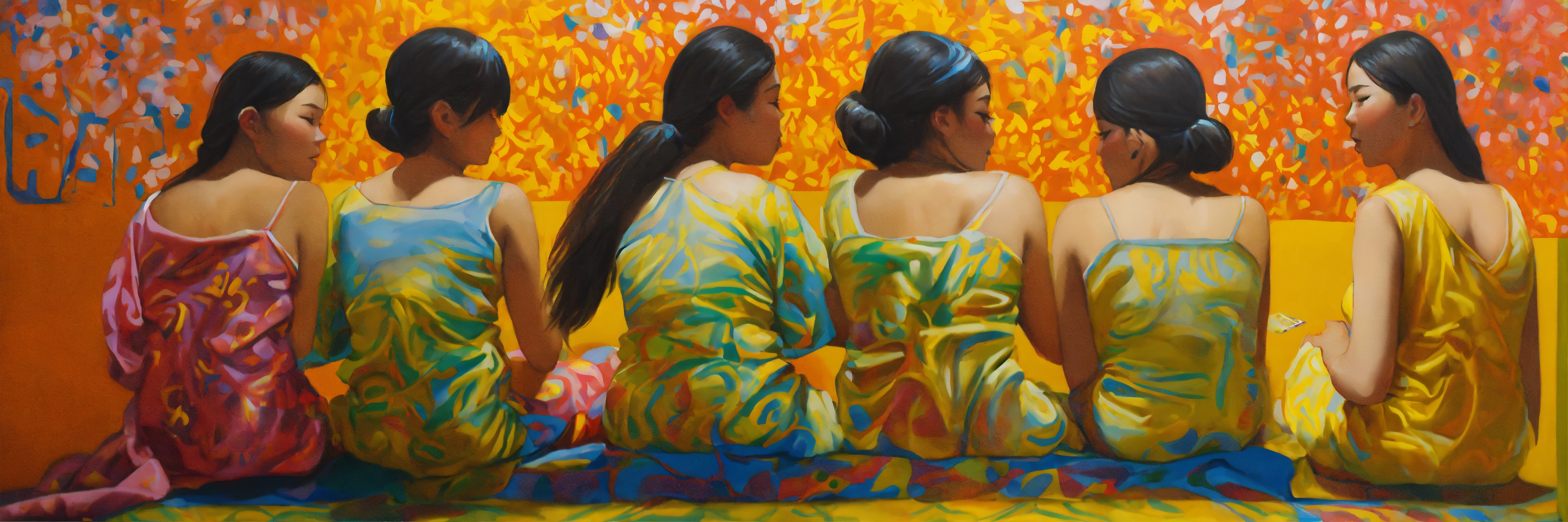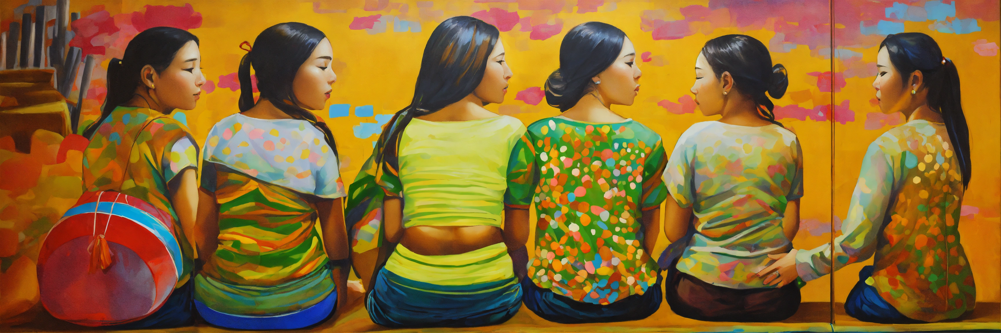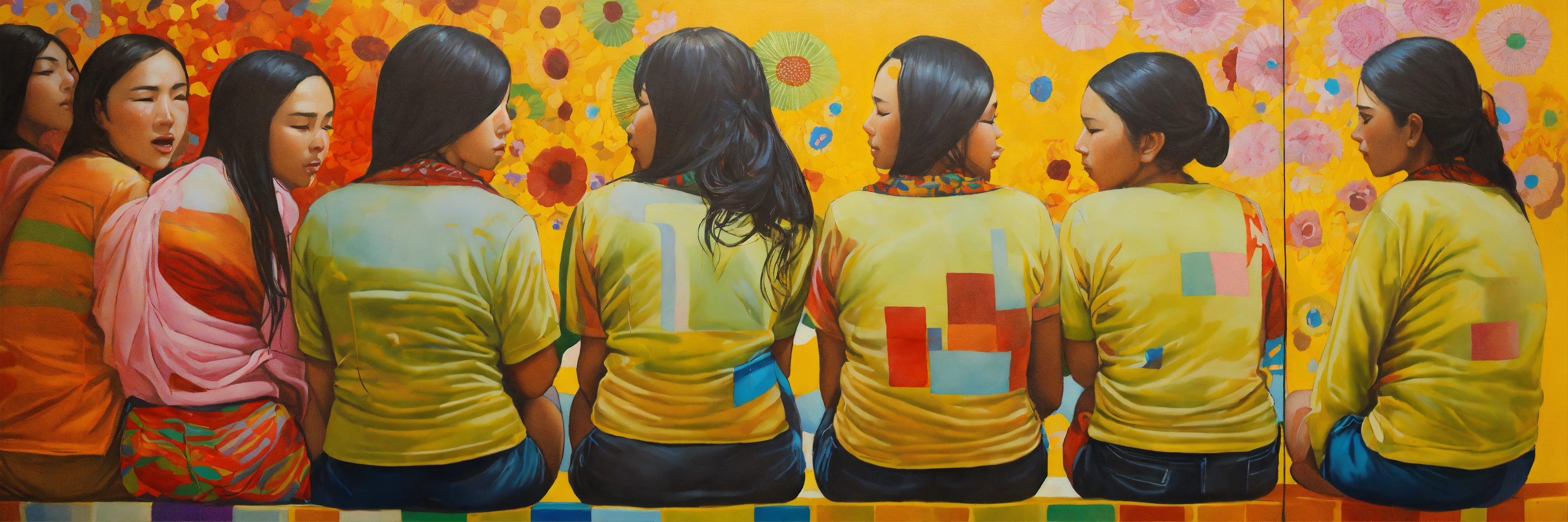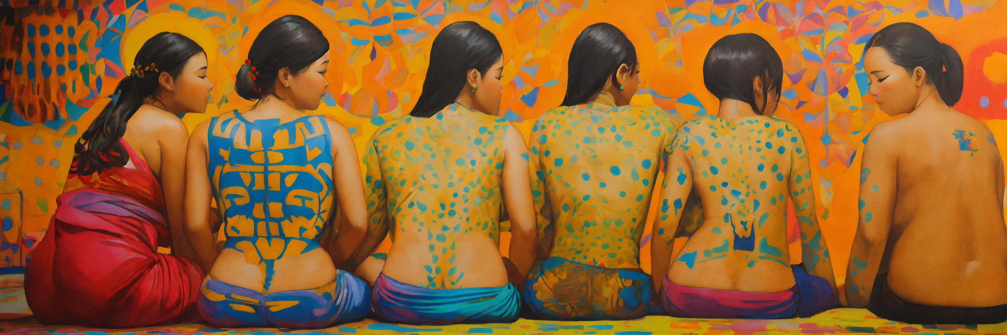 Pintura, de mujeres de distintas etnias o razas, todas comparten una tela o frazada colorida que las protege, no uses fottografías, quiero pintura, that showcases empathy osea the emotional involvement of a person in a reality outside of their own, usually in the feelings of another person, graffiti. abrazo entre dos mujeres, cariño, altruismo, ai weiwei style. by belkis ayún and yayoi kusama