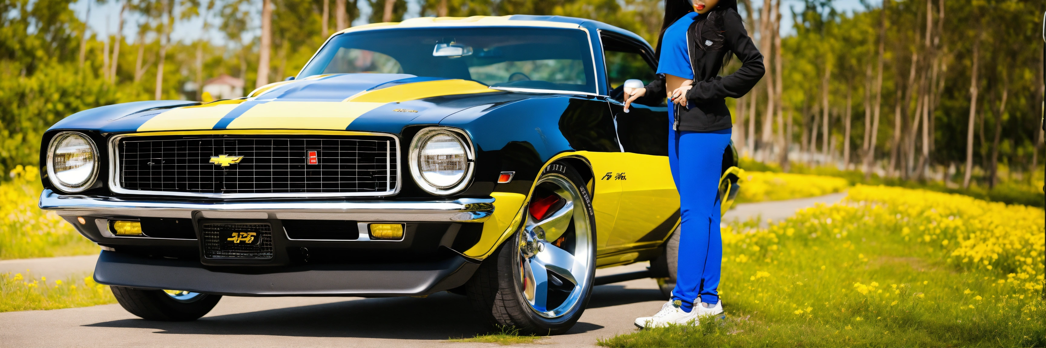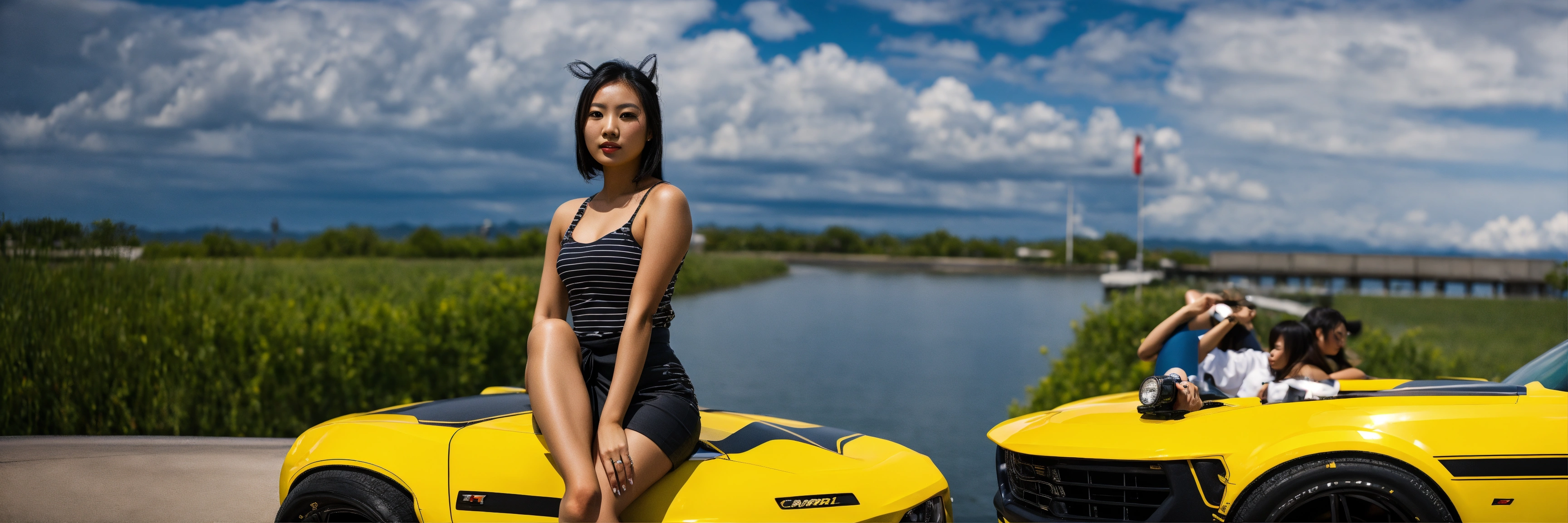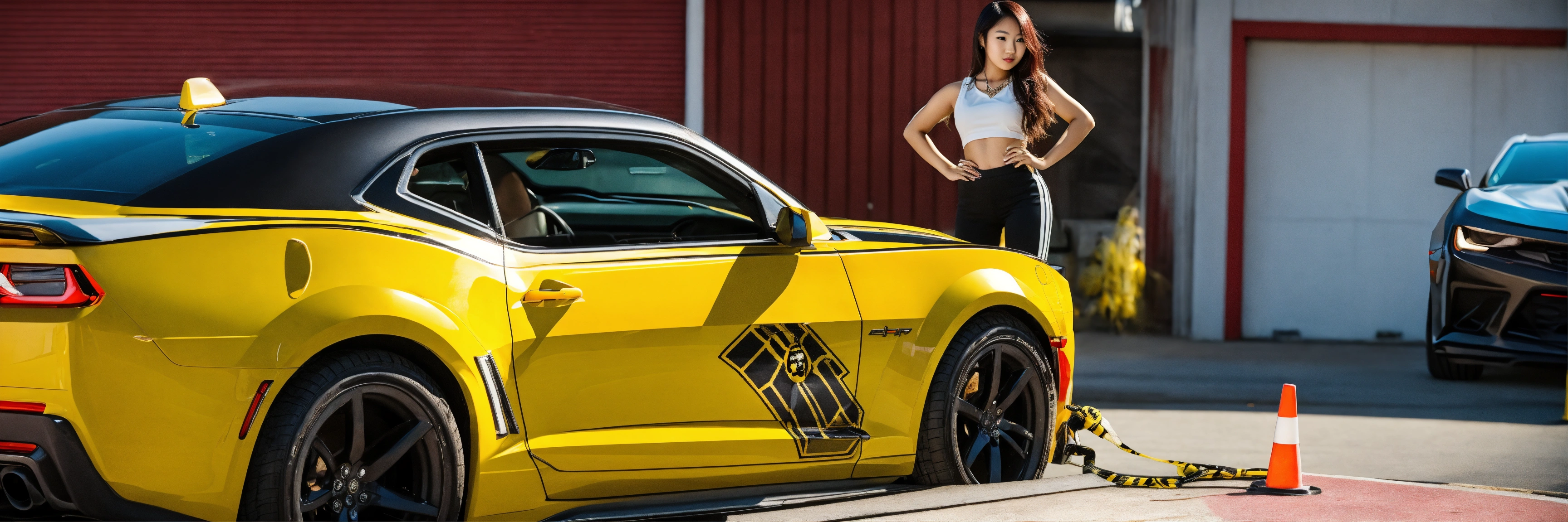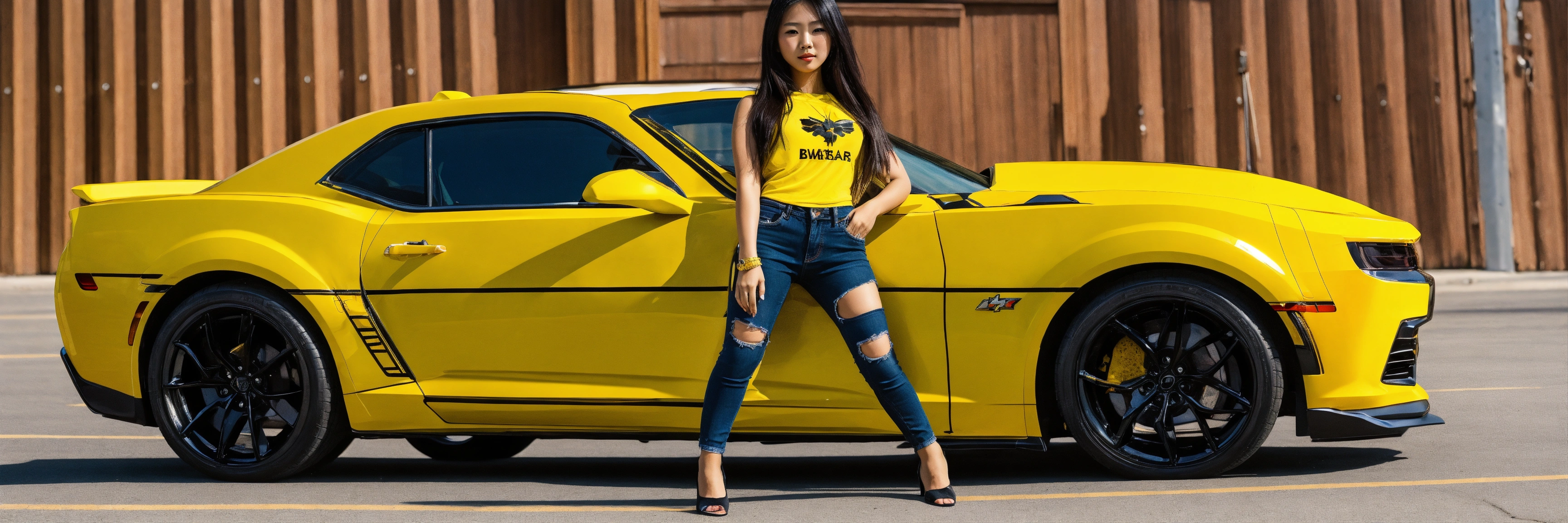 Asian girl posing on the hood bumblebee camaro