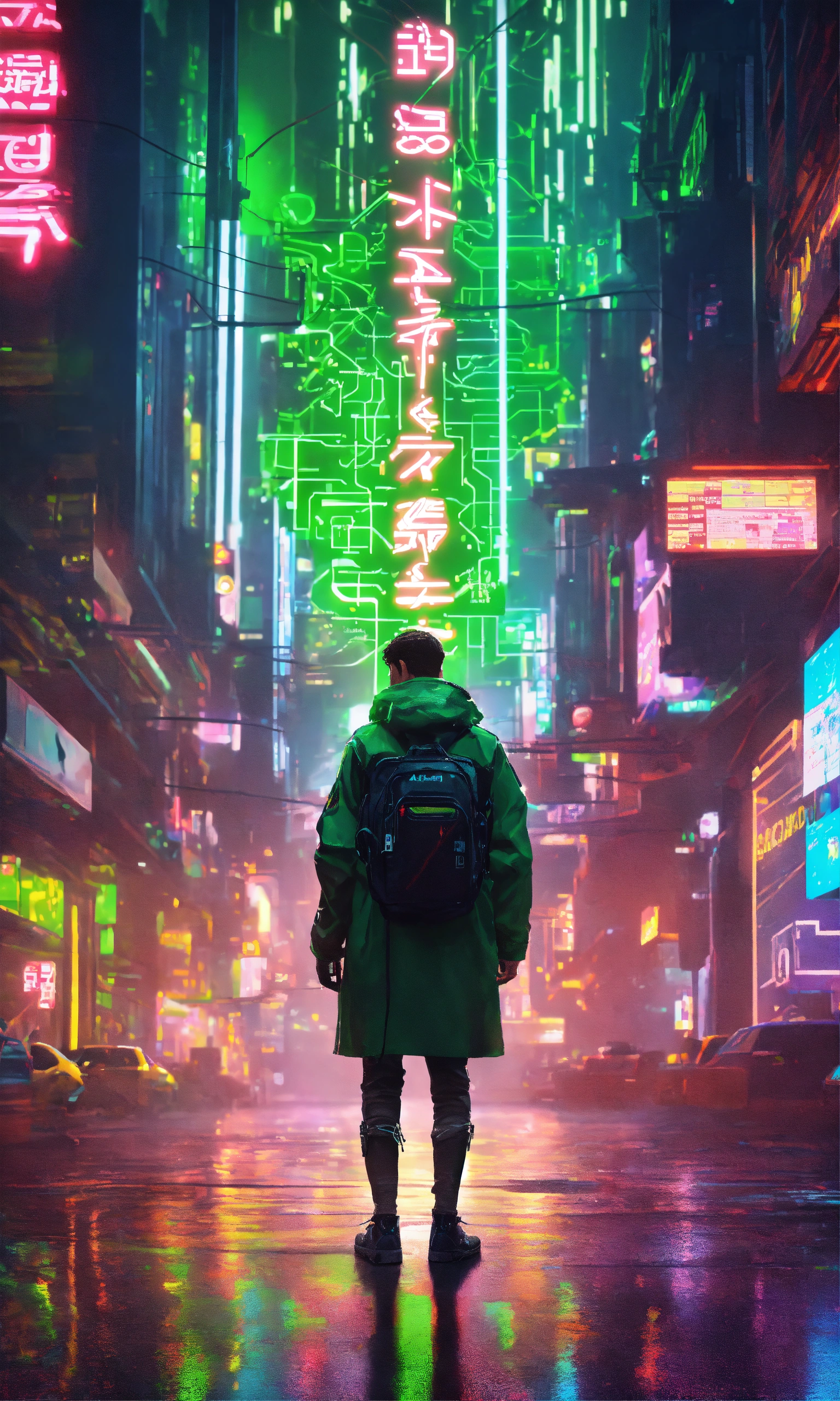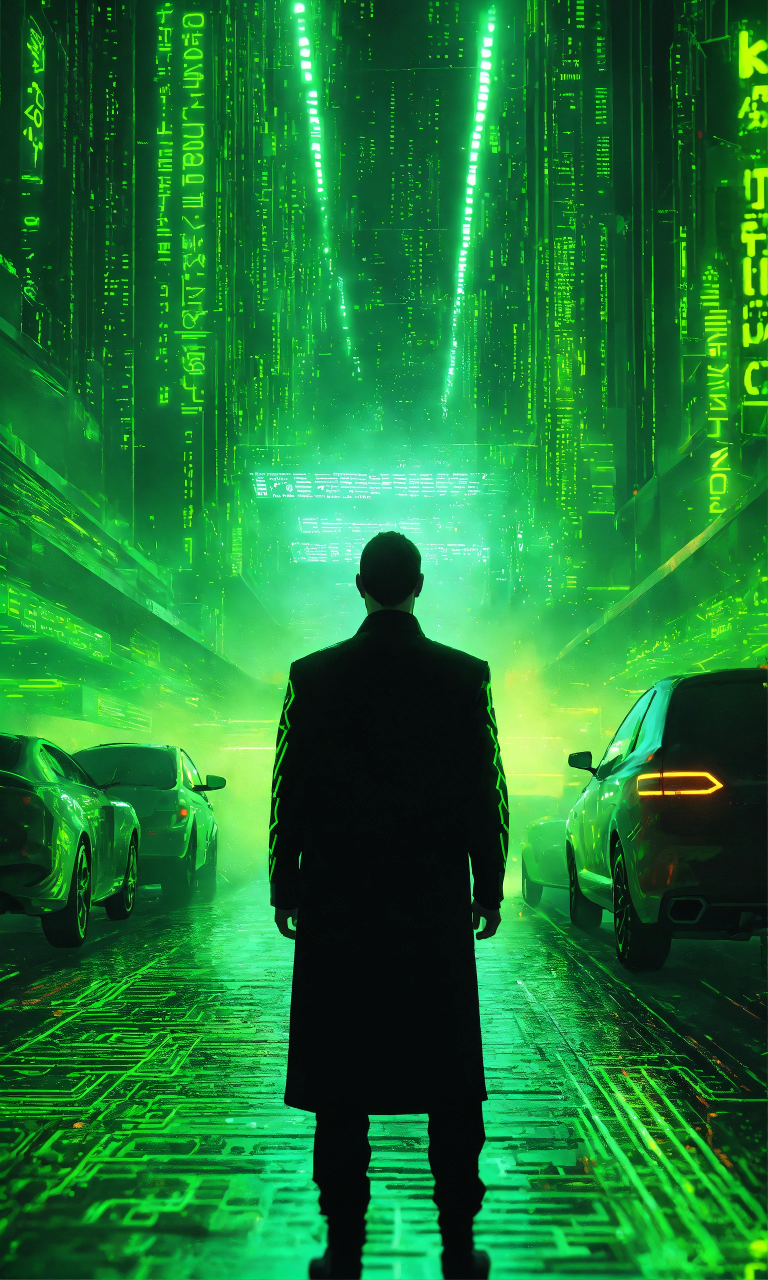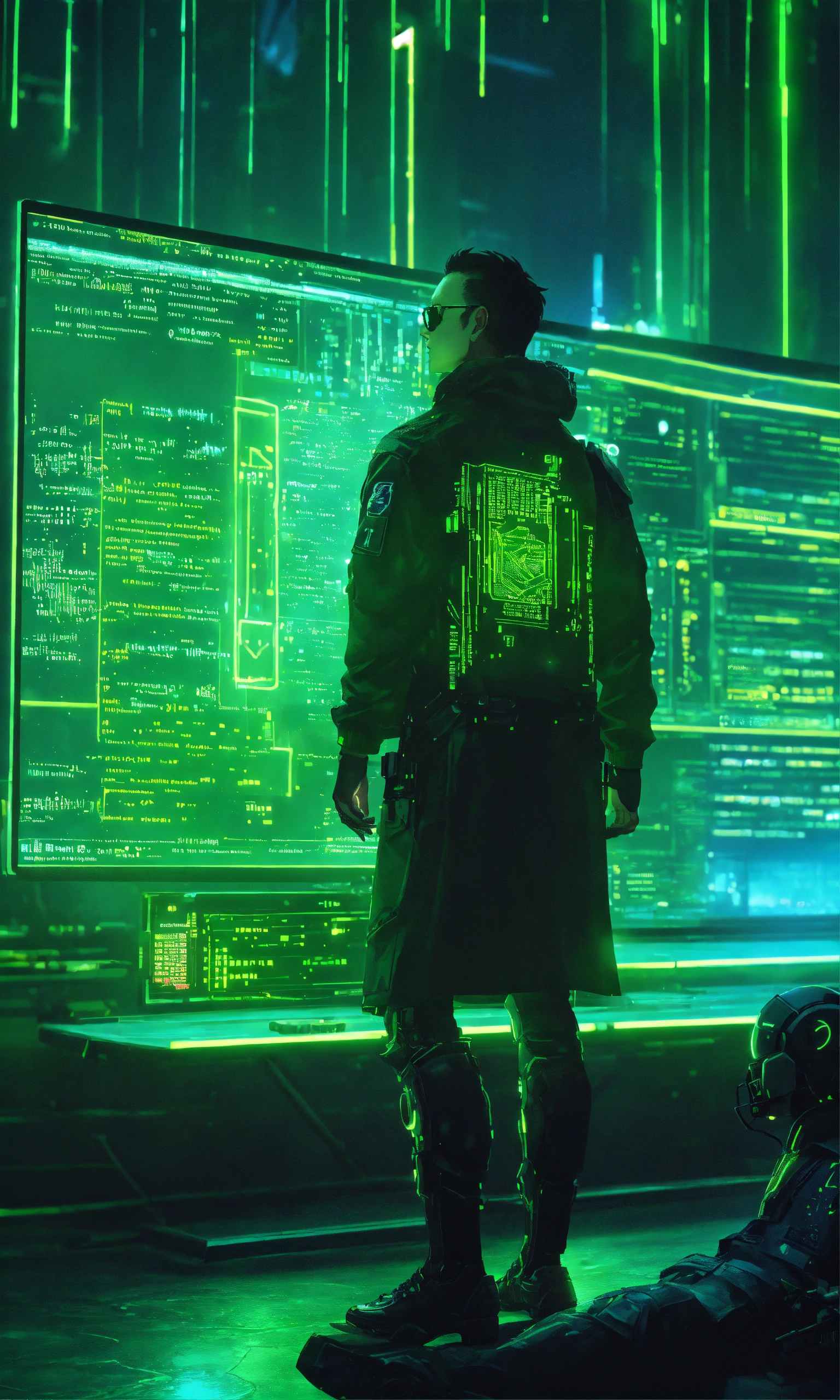 Text text android, green and black futuristic, cyberpunk coder, cutting-edge software for mathematical analysis of football games. immersed in a neon-lit futuristic ambient with lots of computer. lightning bolts are emanating from its eyes as it skillfully operates a computer, processing intricate statistics and data related to football matches. in the background, a mesmerizing rain of binary code, displaying '010101' patterns, falls from the sky, creating a matrix-style atmosphere. the image is in 8k resolution, hyper-realistic, and hyper-detailed. the neon lights cast vibrant glows on the android's figure, and volumetric lighting enhances the cyberpunk ambiance.