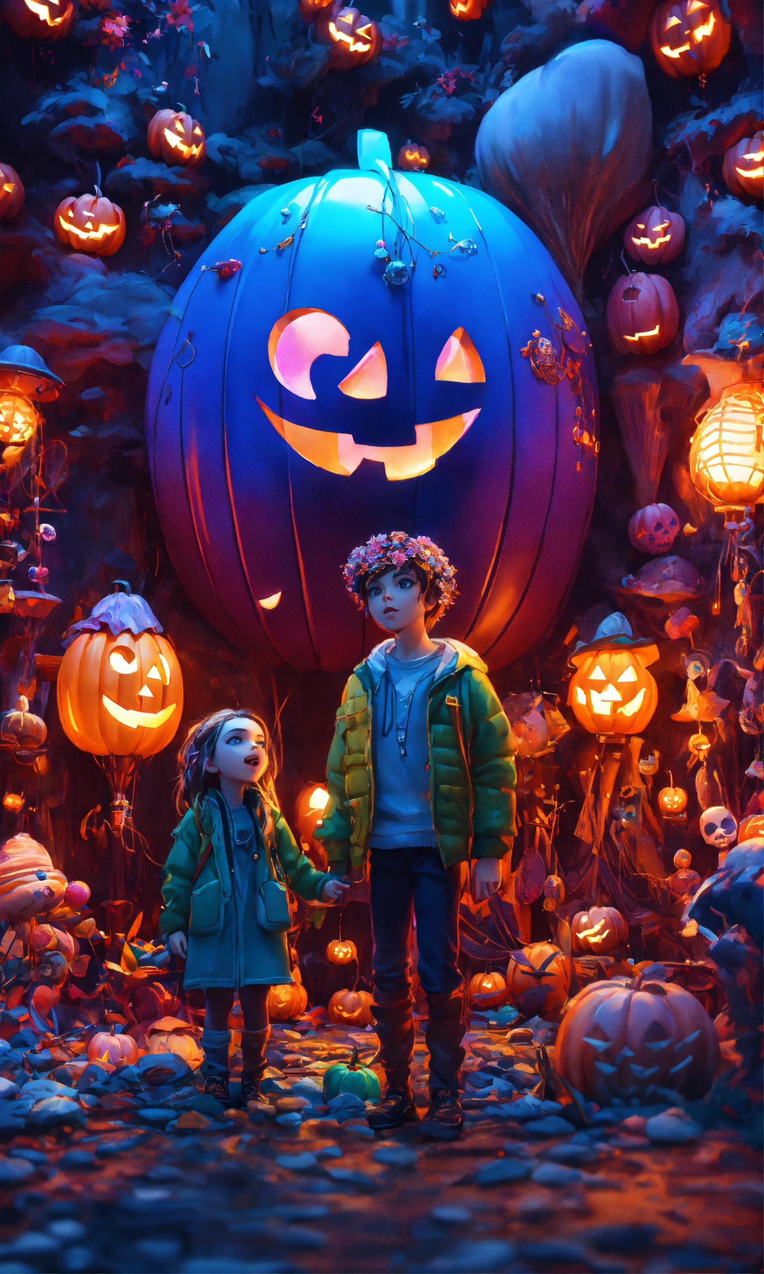 Unsplash art, a quirky portrait of a cute girl and boy couples 3d, pixar style, halloween colors, hyper detailed intricately detailed, fantastical, intricate detail, splashy, fantasy, concept art, 8k resolution, masterpiece, melting, complex background, intricate detailed, dark colors, fantasy, concept art, digital art, intricate, oil on canvas, masterpiece, expert, insanely detailed, 4k resolution.