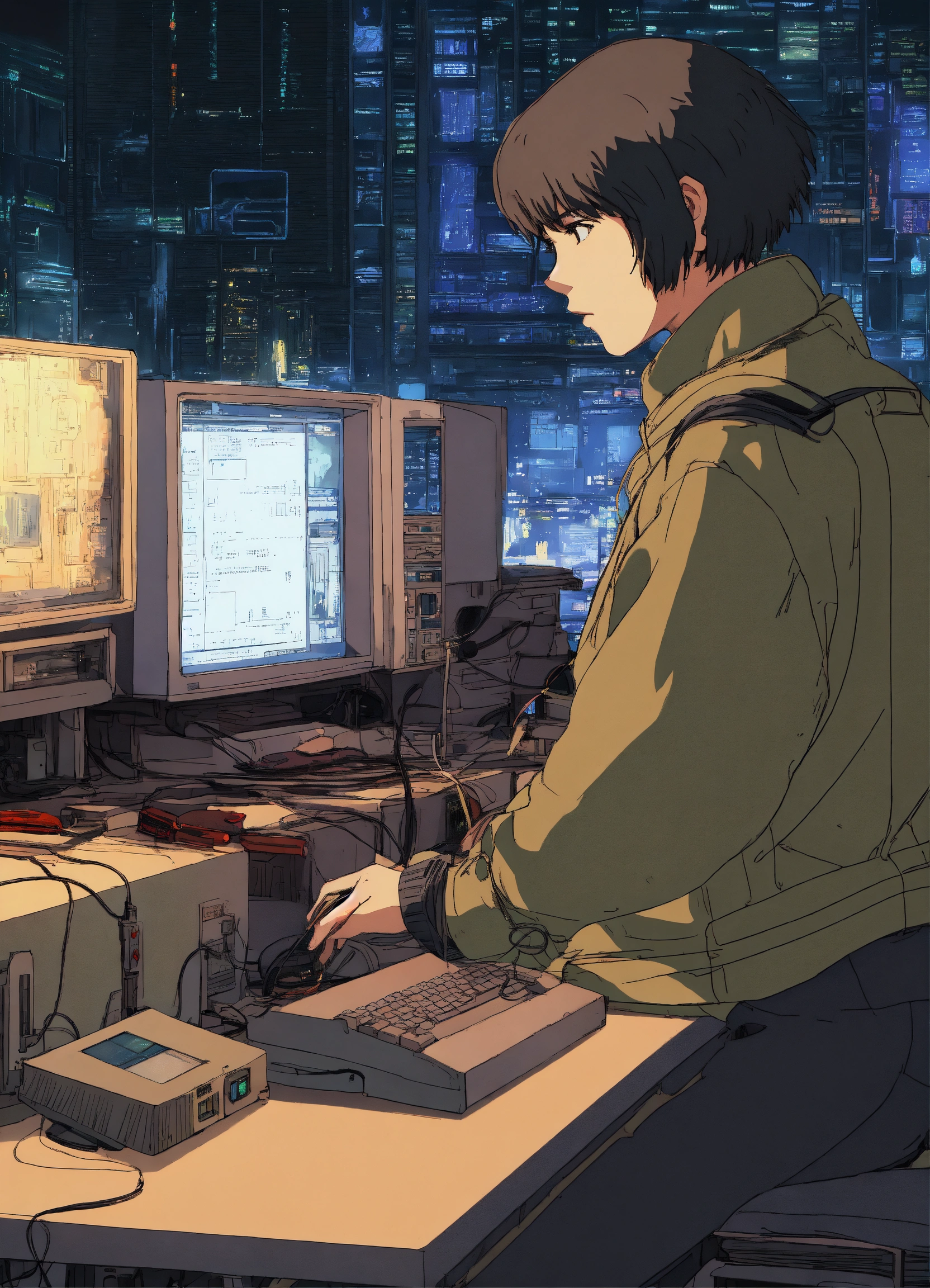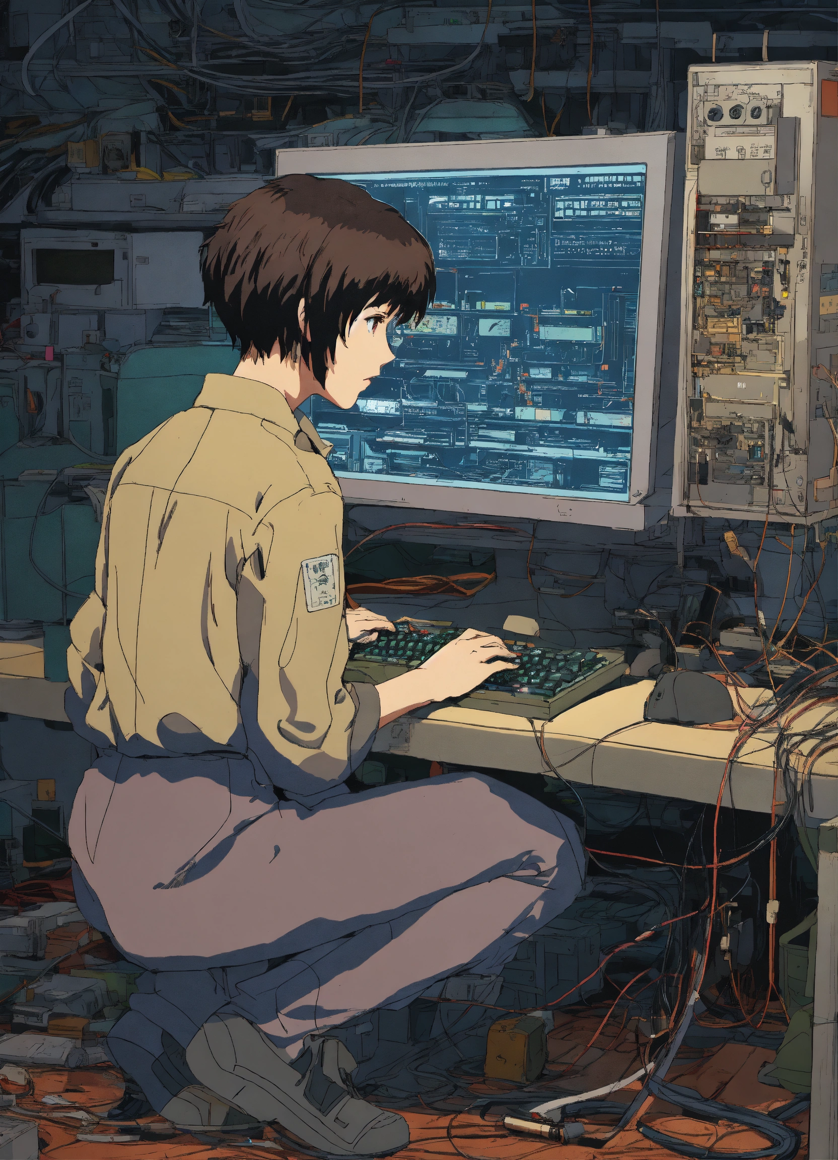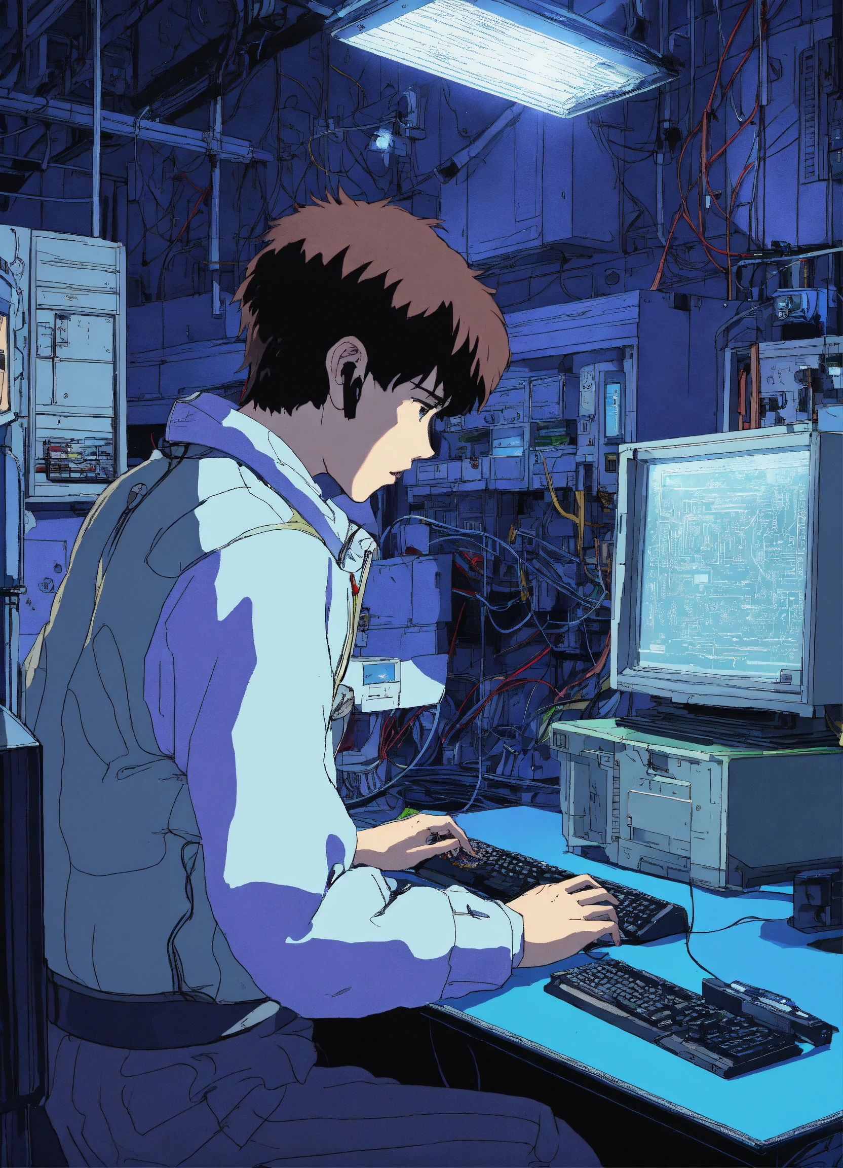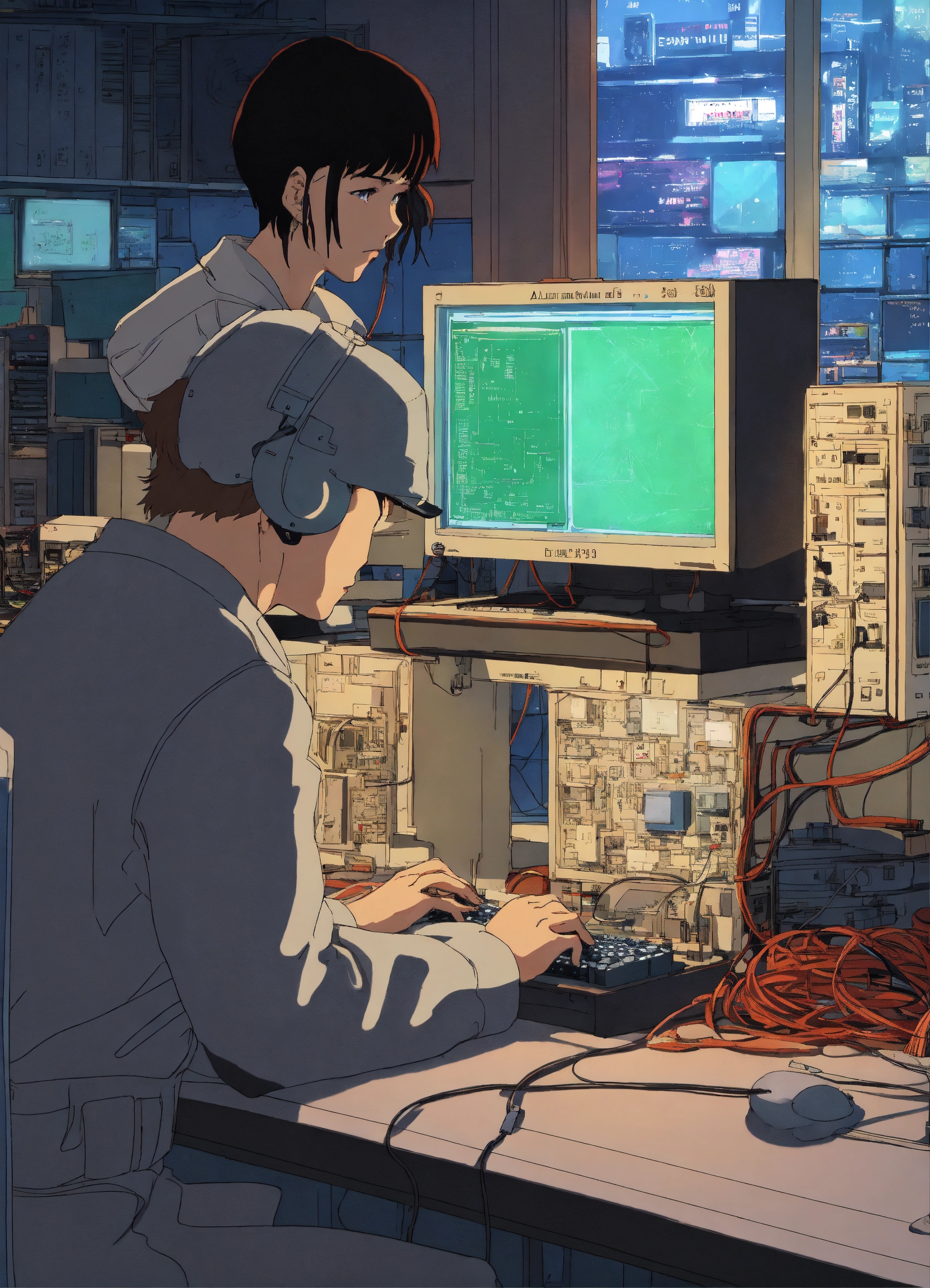 Alexander graham bell fixing computers, repairing computers, anime, retro anime, 1980s anime, 1990s anime, ghost in the shell, serial experiments lain, 4k, rule of thirds, extreme detail, detailed drawing, trending artstation, hd, sharp focus, backlit, symmetrical features, film grain