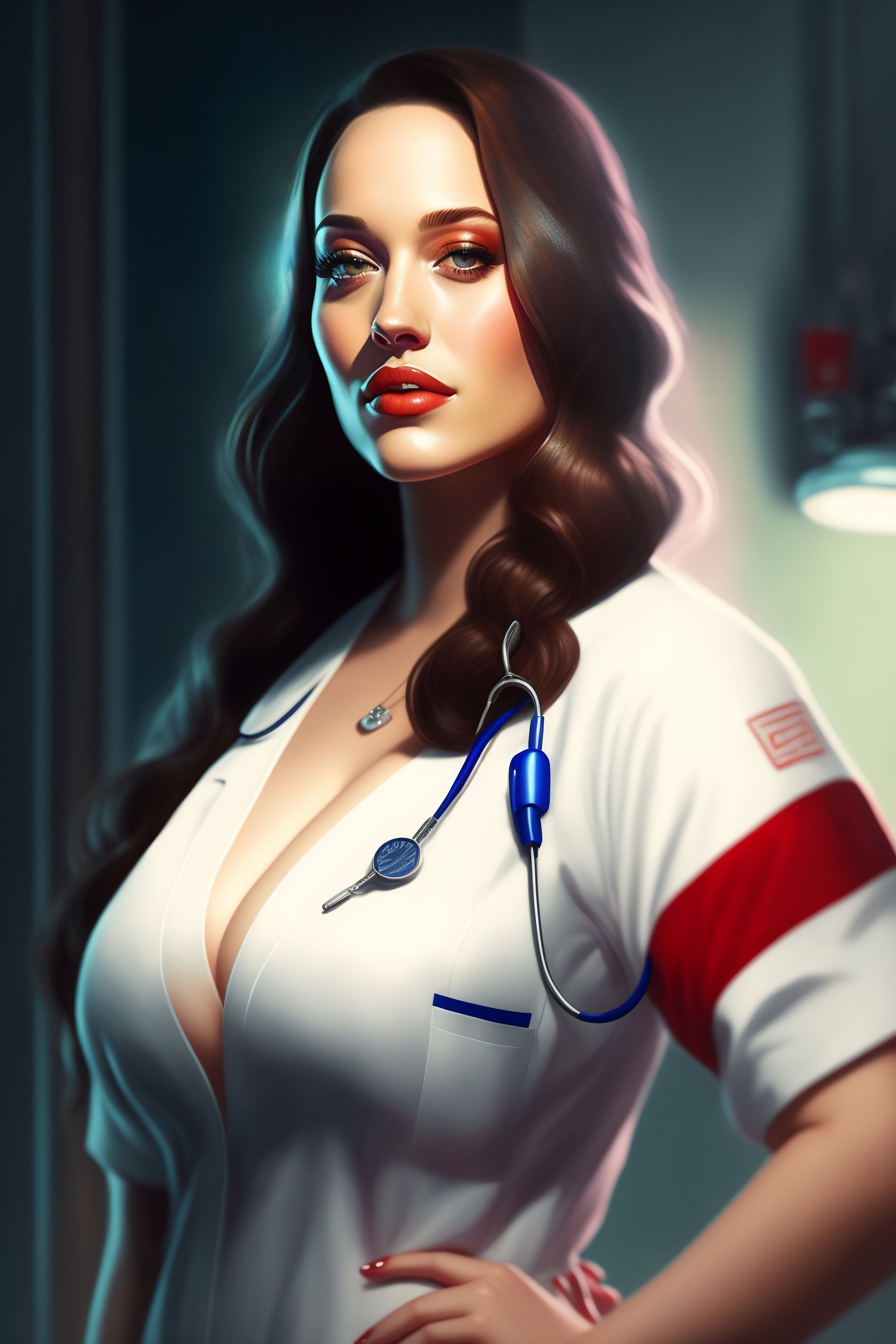 A portrait of a kat dennings in a low cut outfit as a sexy nurse in a hospital by ruan jia and mandy jurgens and artgerm and william-adolphe bouguerea, highly detailed, trending on artstation, award winning, h 768