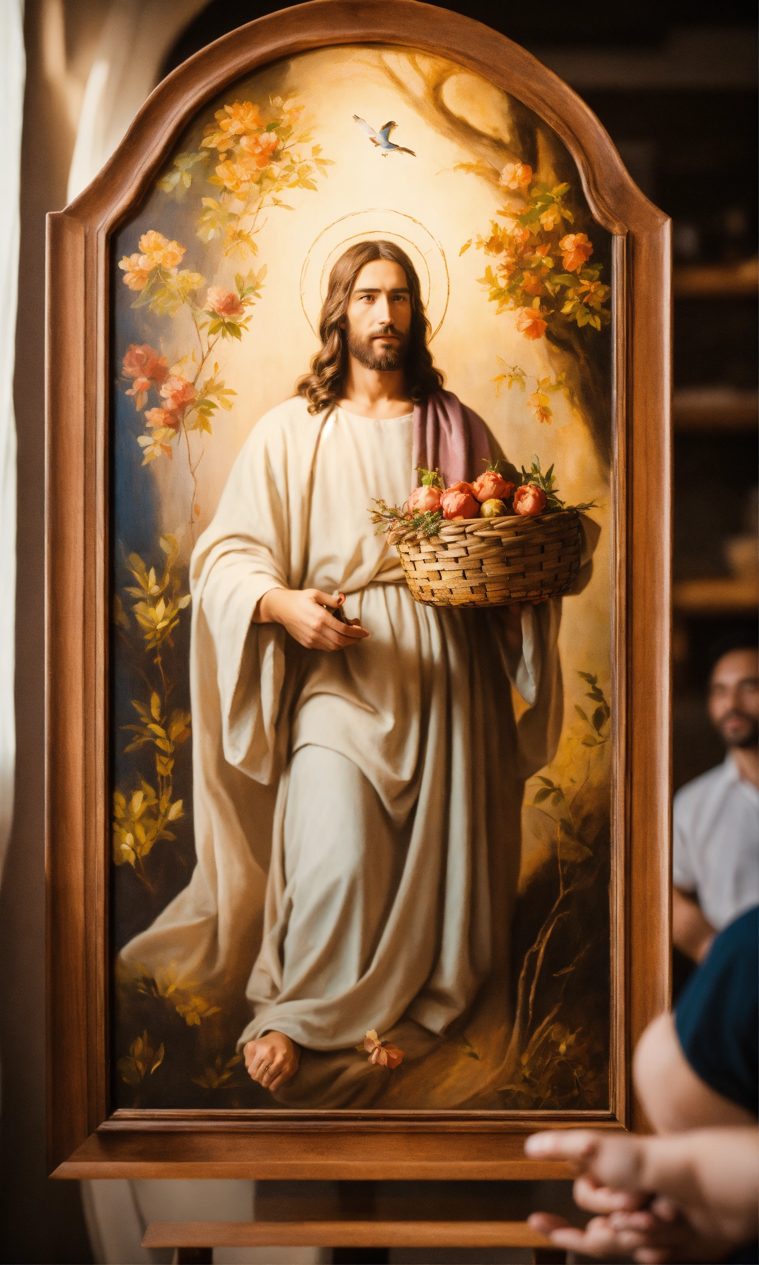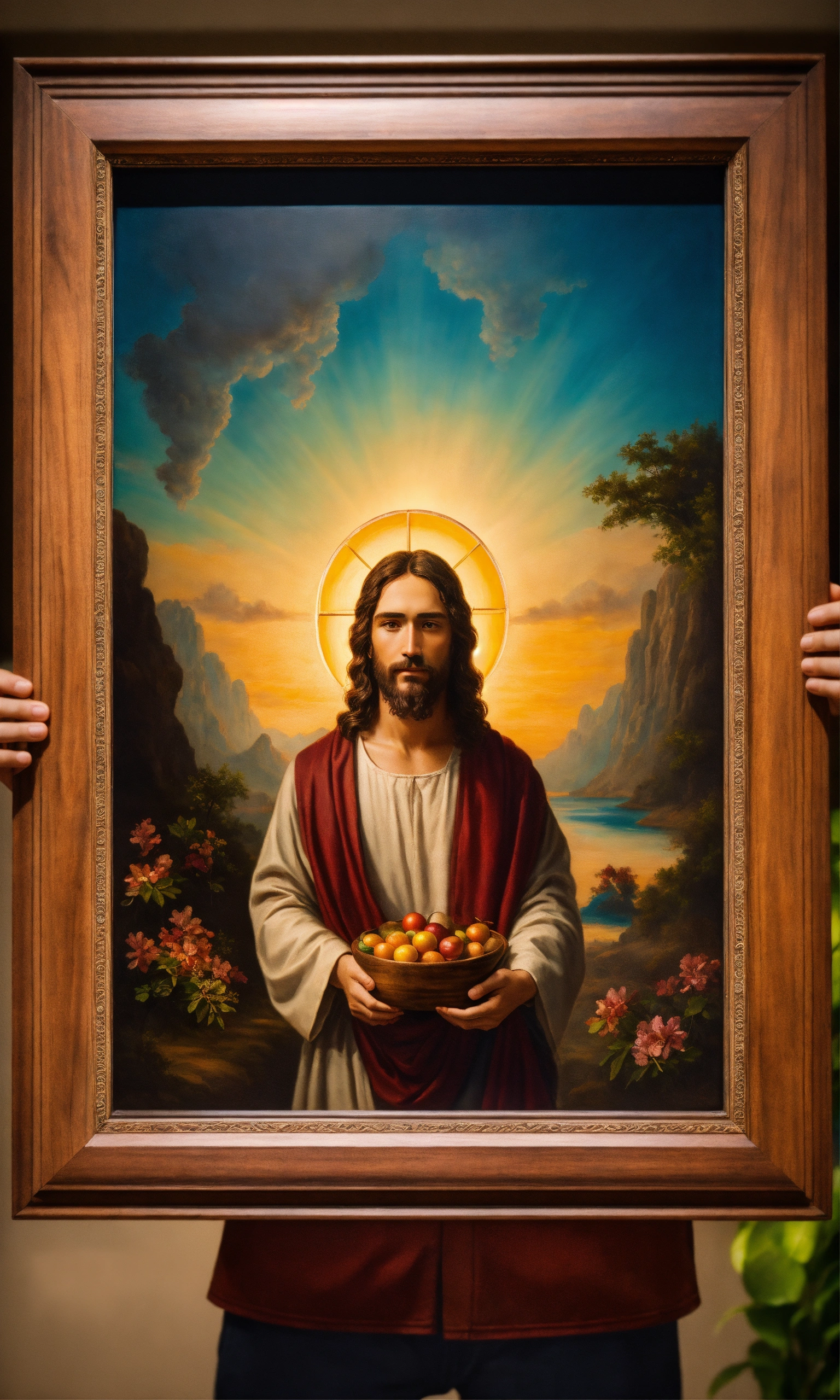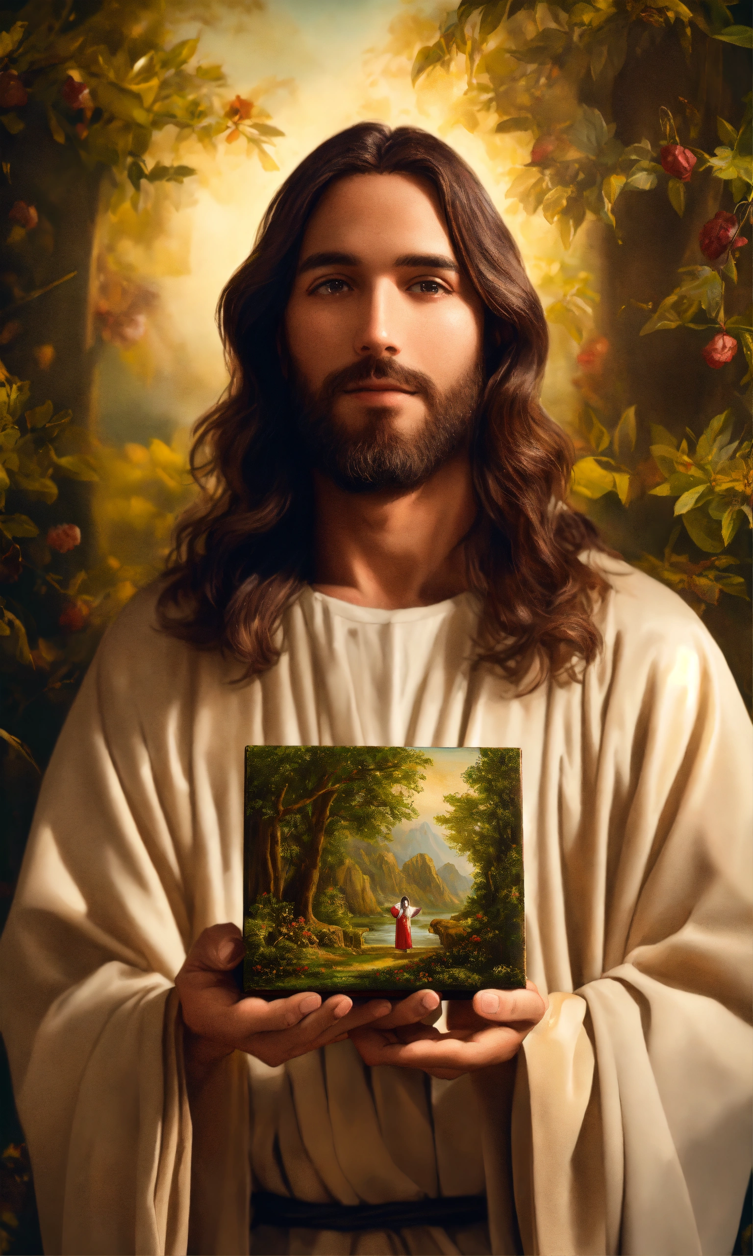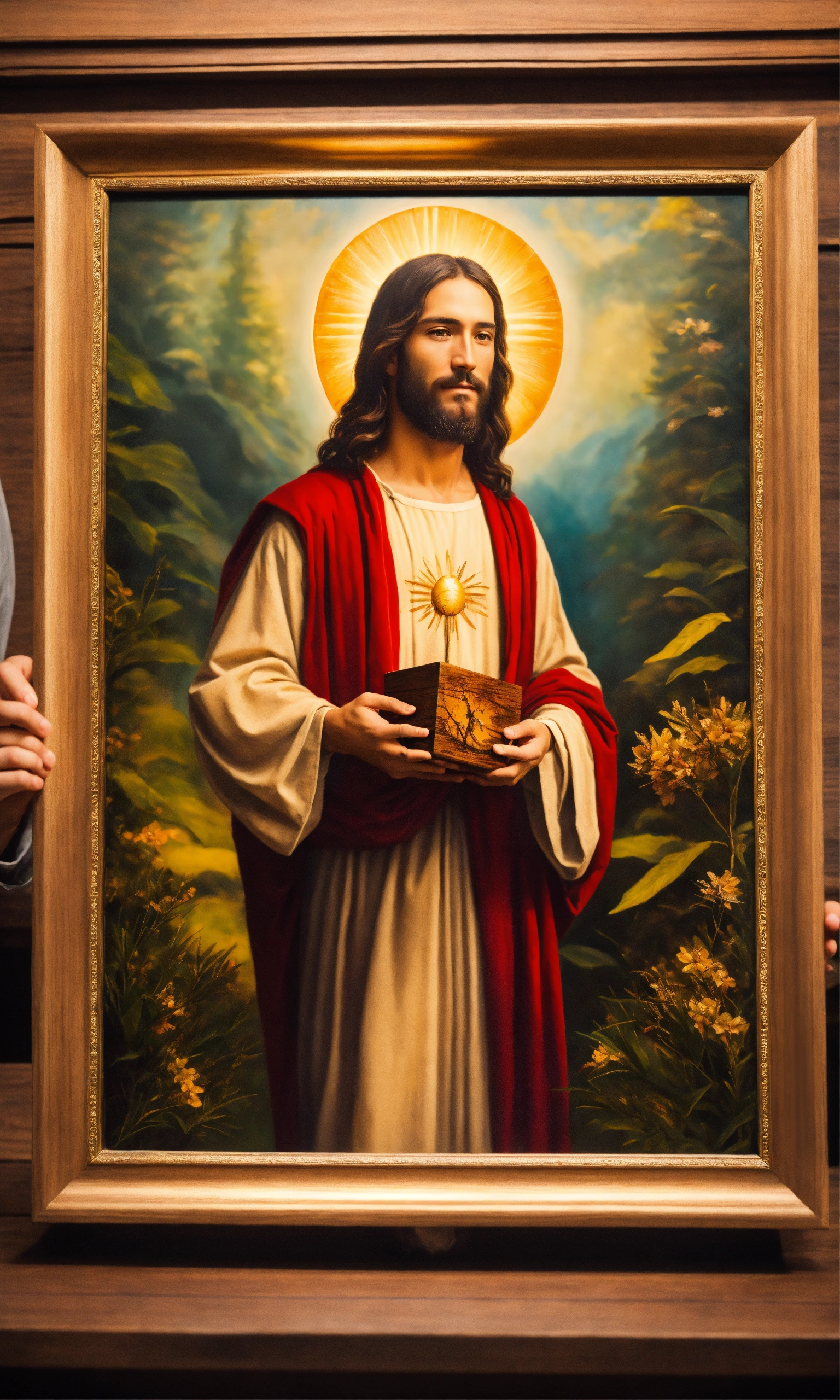 Jesus happily holding a beautiful wooden nature oil painting, surreal photo, fujifilm xt3, indoor, good lighting, raw photo, 8k uhd, film grain, unreal engine 5, ray trace