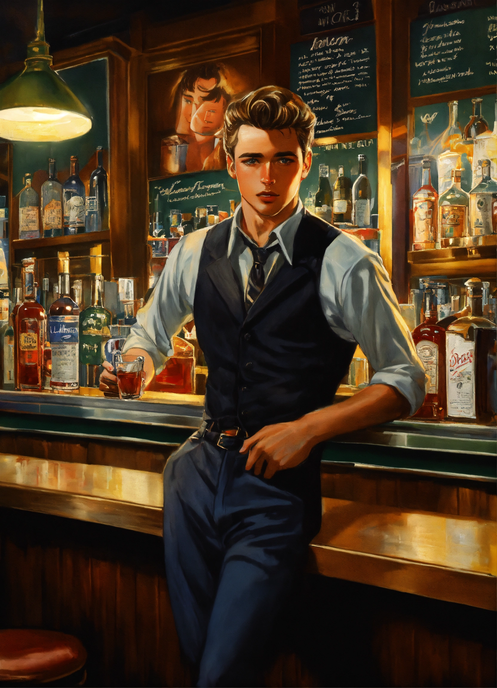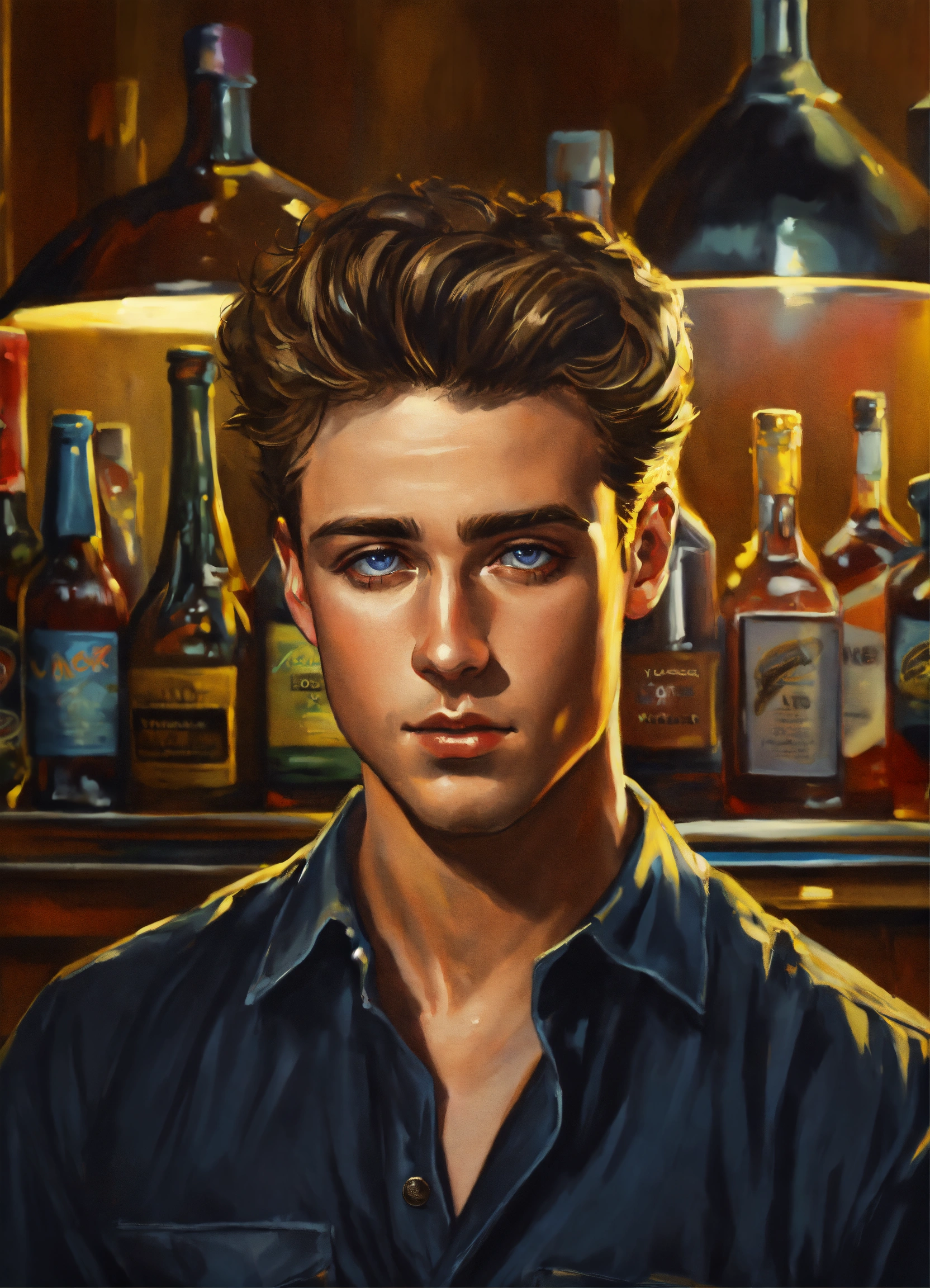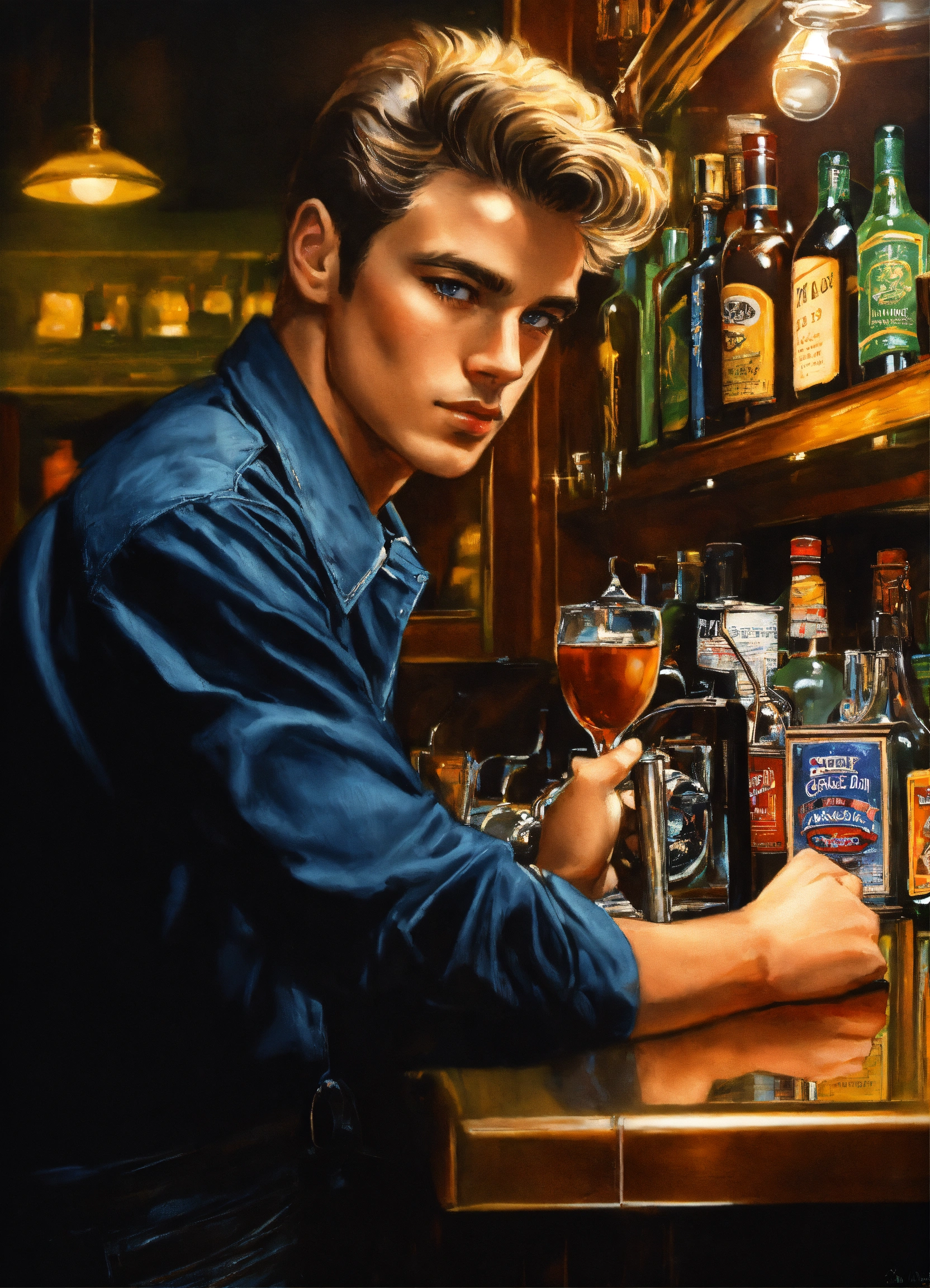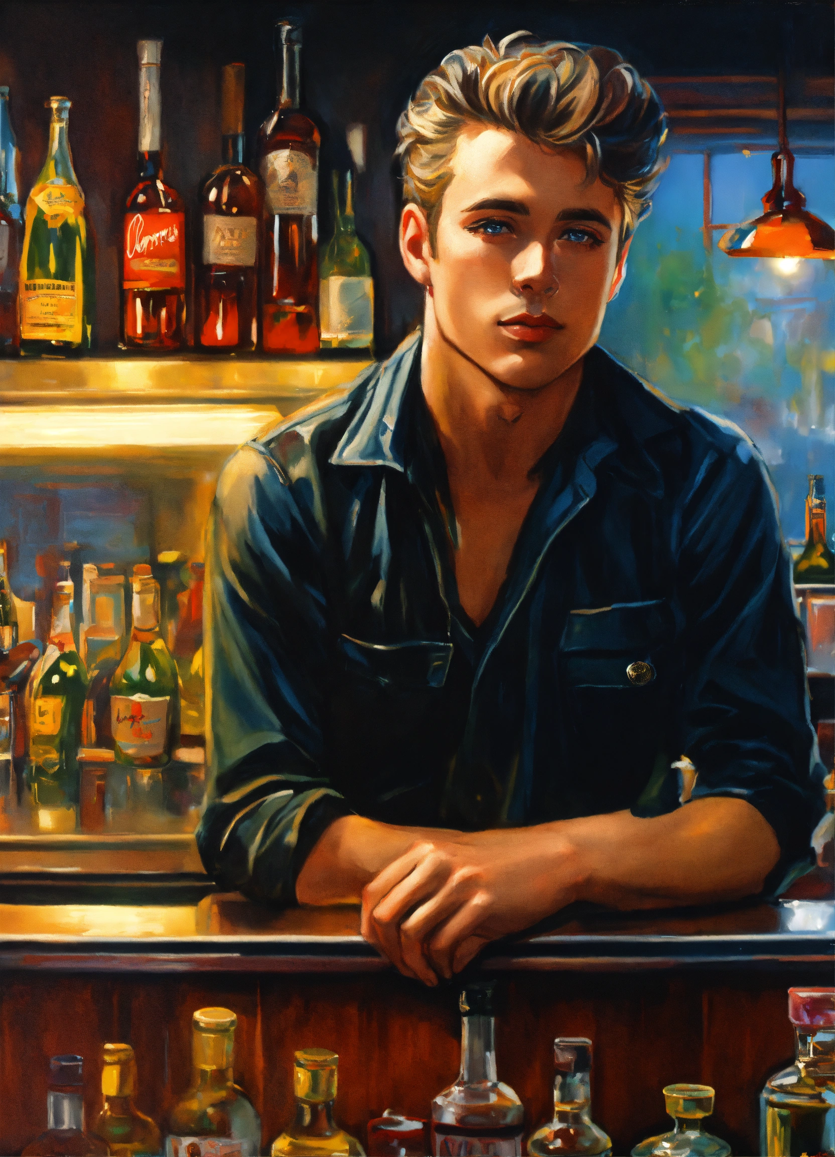 "photo_realistic_by_greg_rutowski_and_dan_mumford_ hips_up_portrait_of_smug_bartender_with_short_1980s_hair_wearing_black_button_up_played_by_young_james_dean_standing_alone_behind_bar_counter_looking_directly_at_you pefect_eyes_and_irises"
