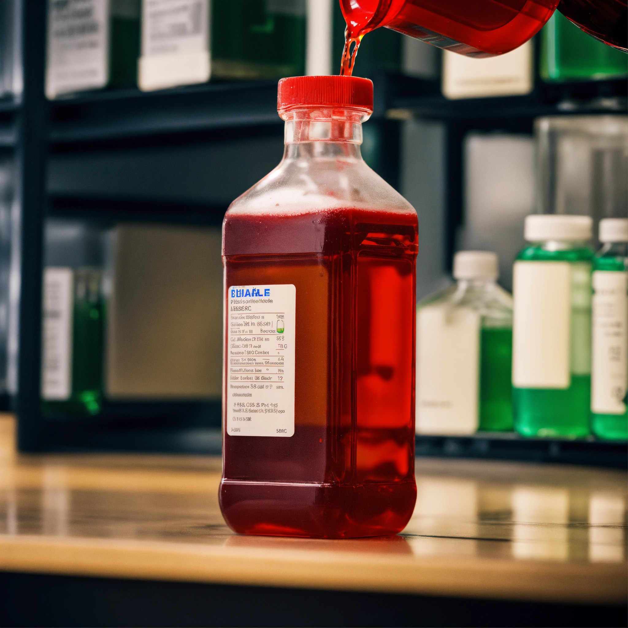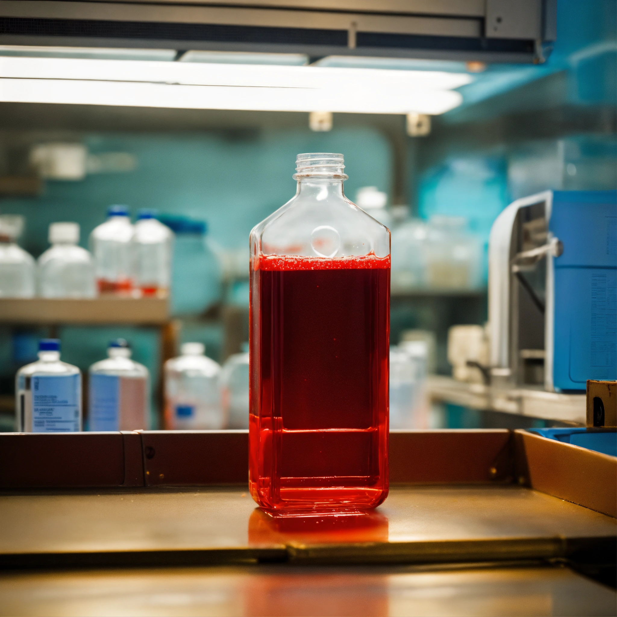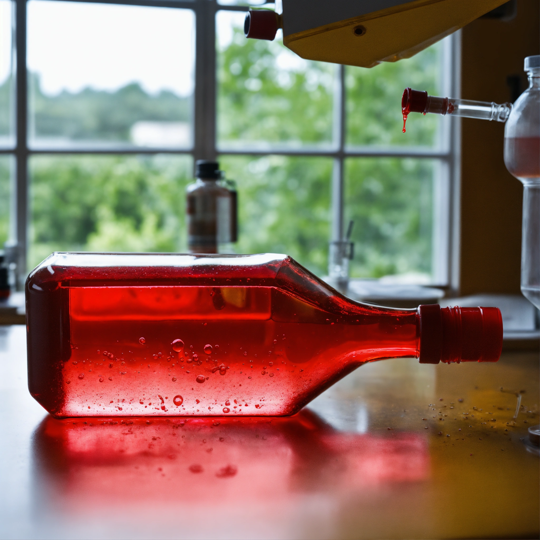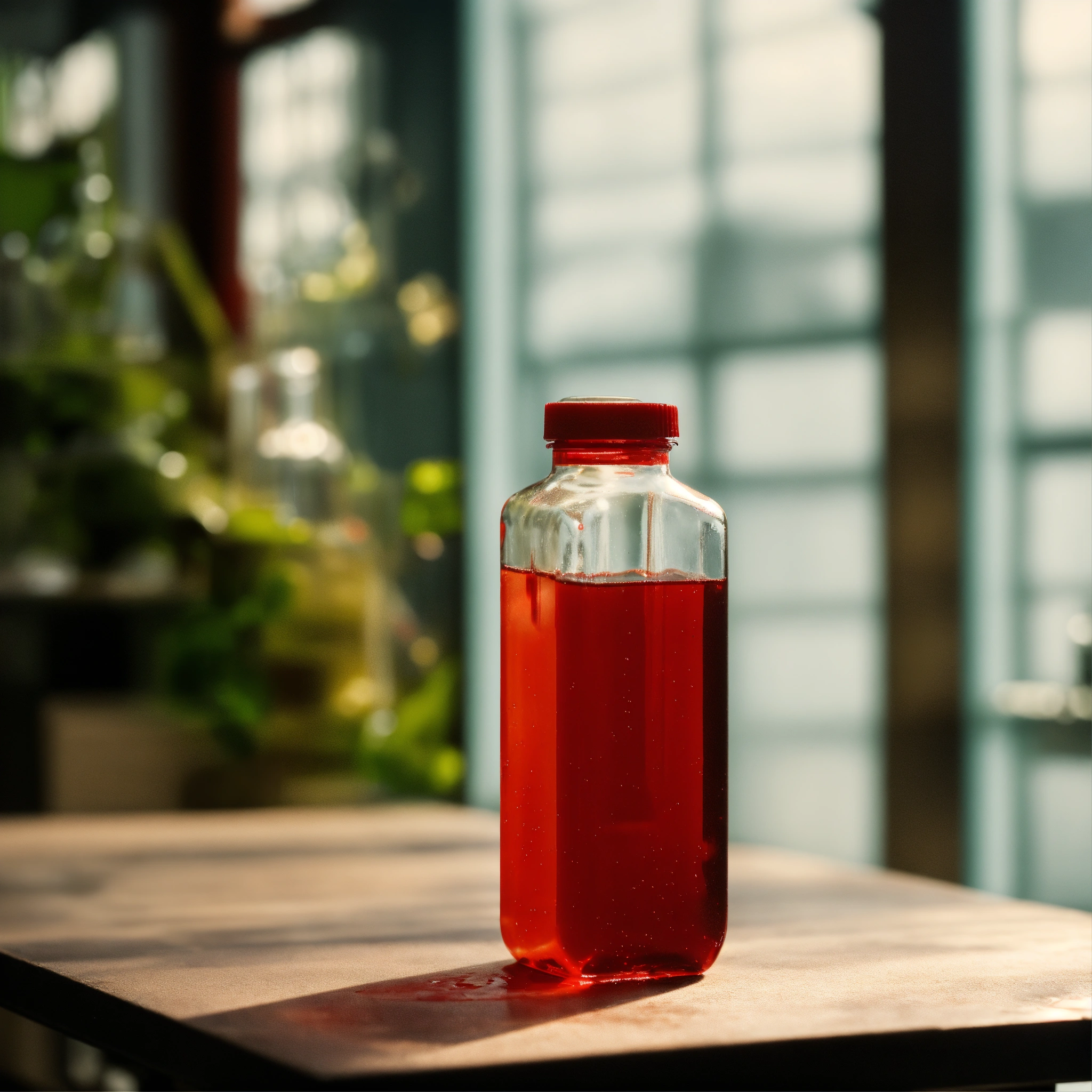 A rectangular plastic bottle with a clear red liquid inside in a laboratory environment