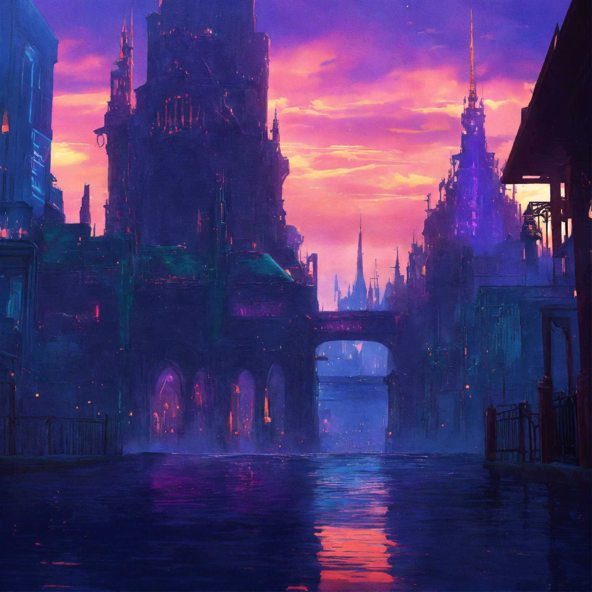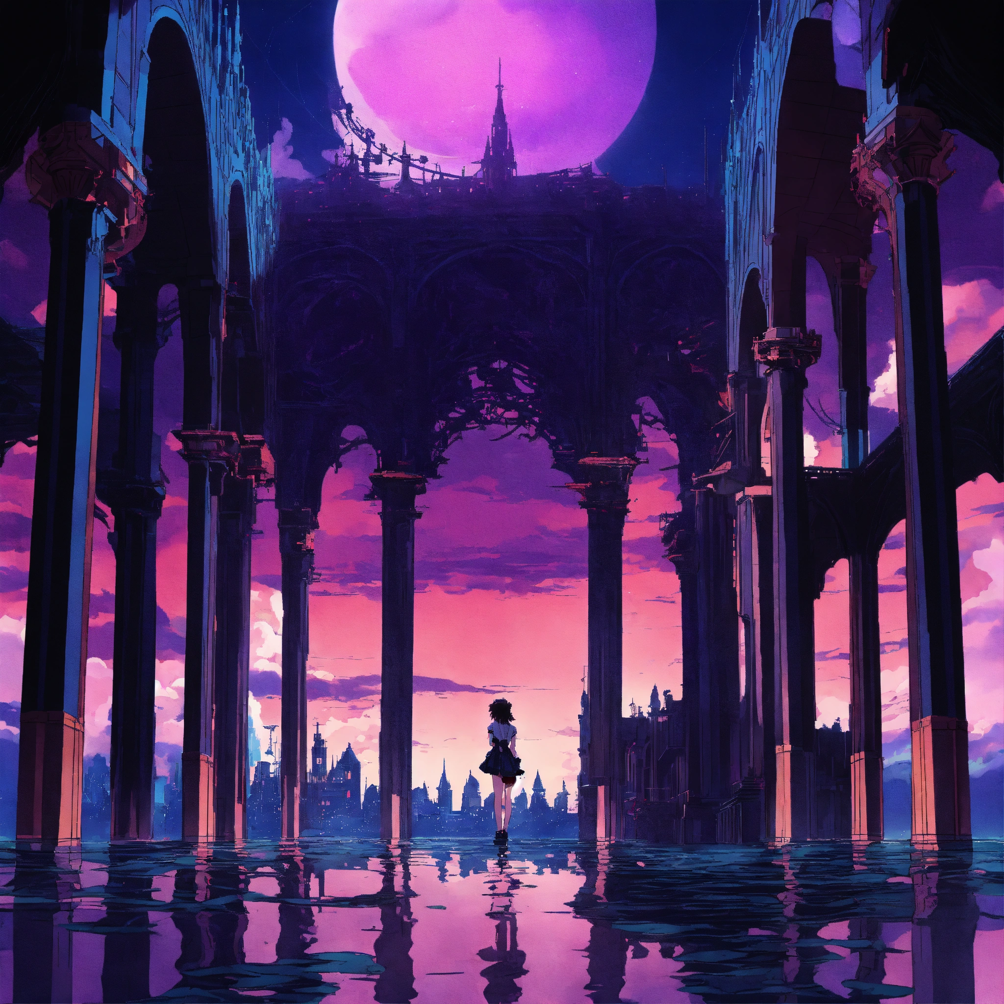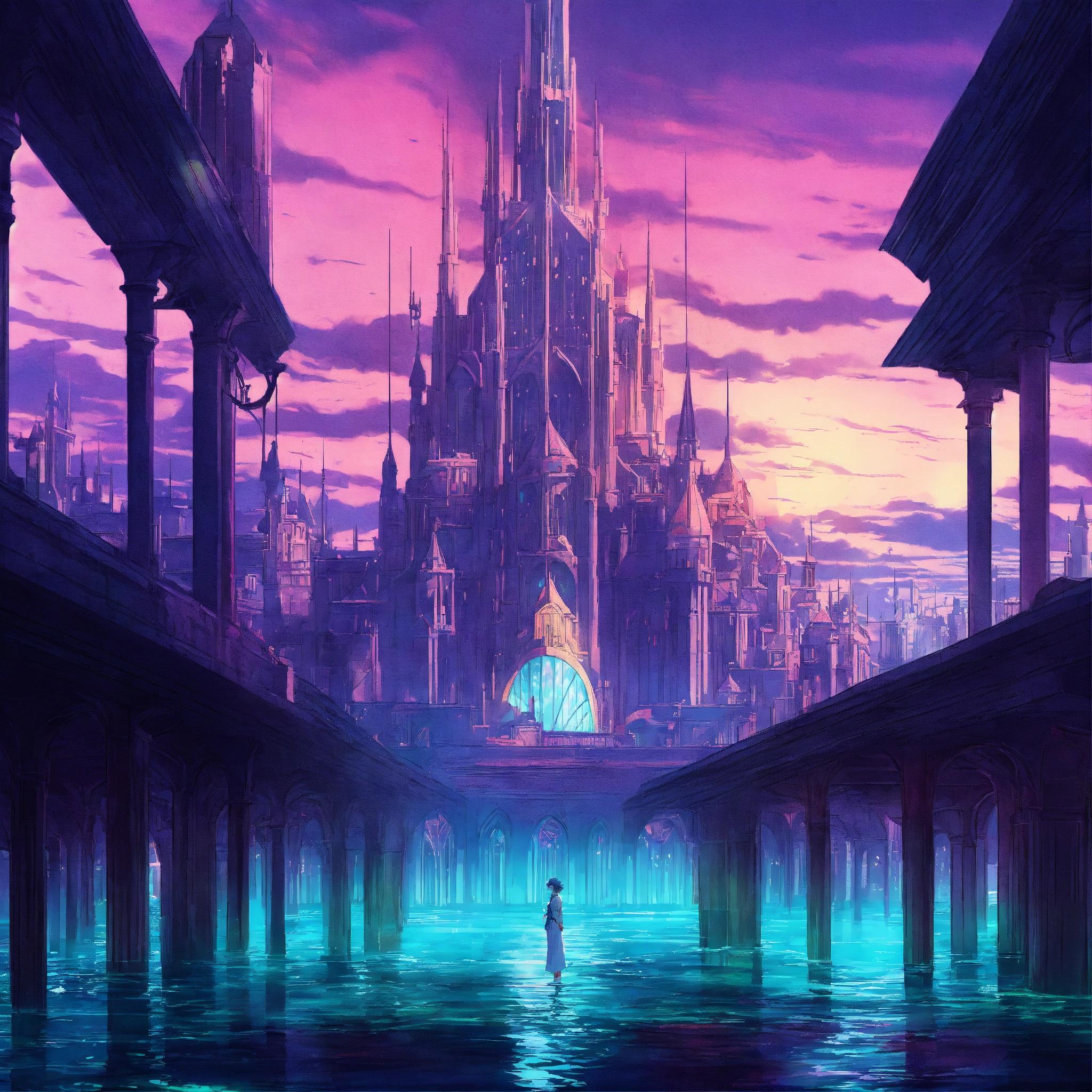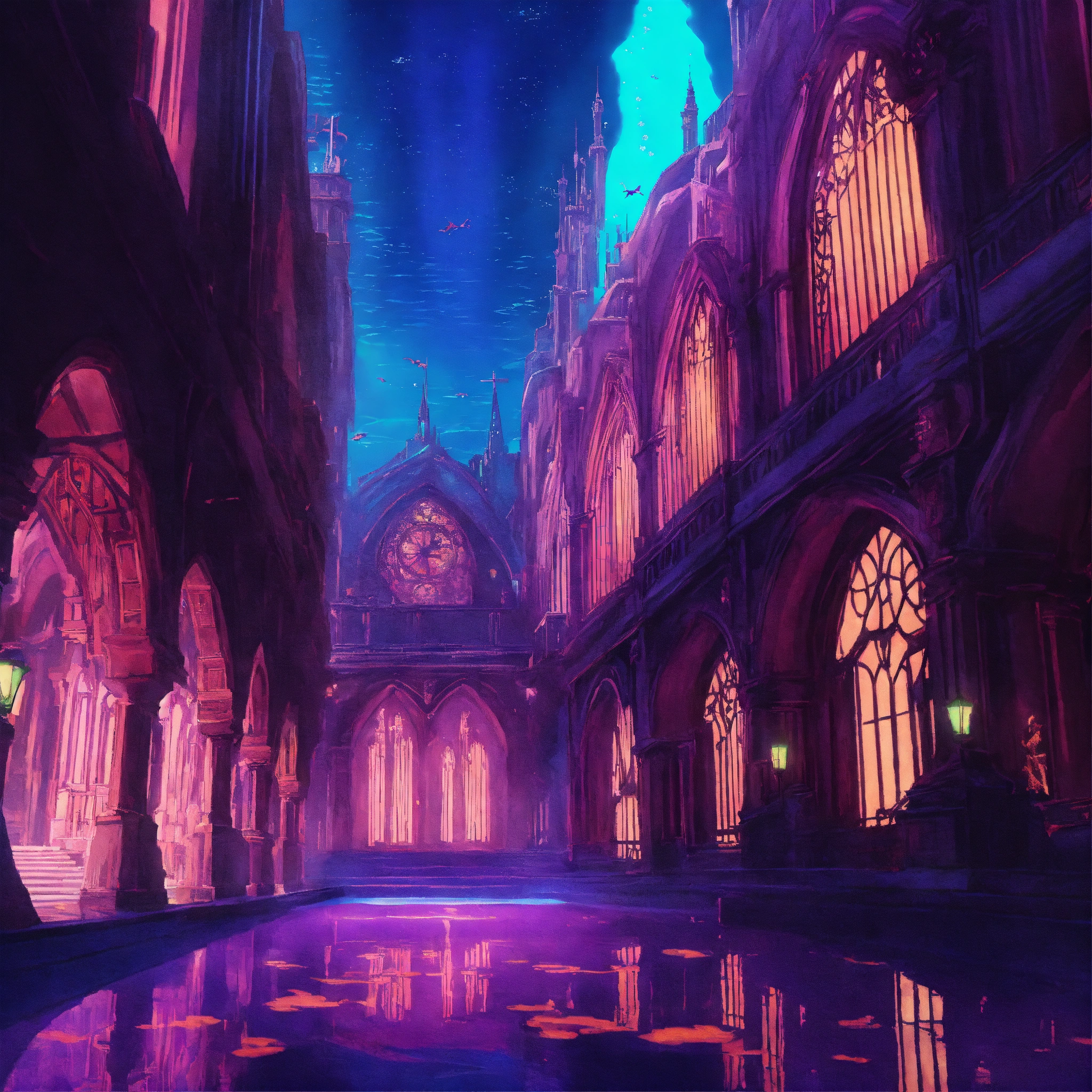 The city of atlantis of disney with high fantasy but with in a throwback animation shot from evangelion, a 90's anime. gothic architecture. underwater perspective. i want the color purple more present.