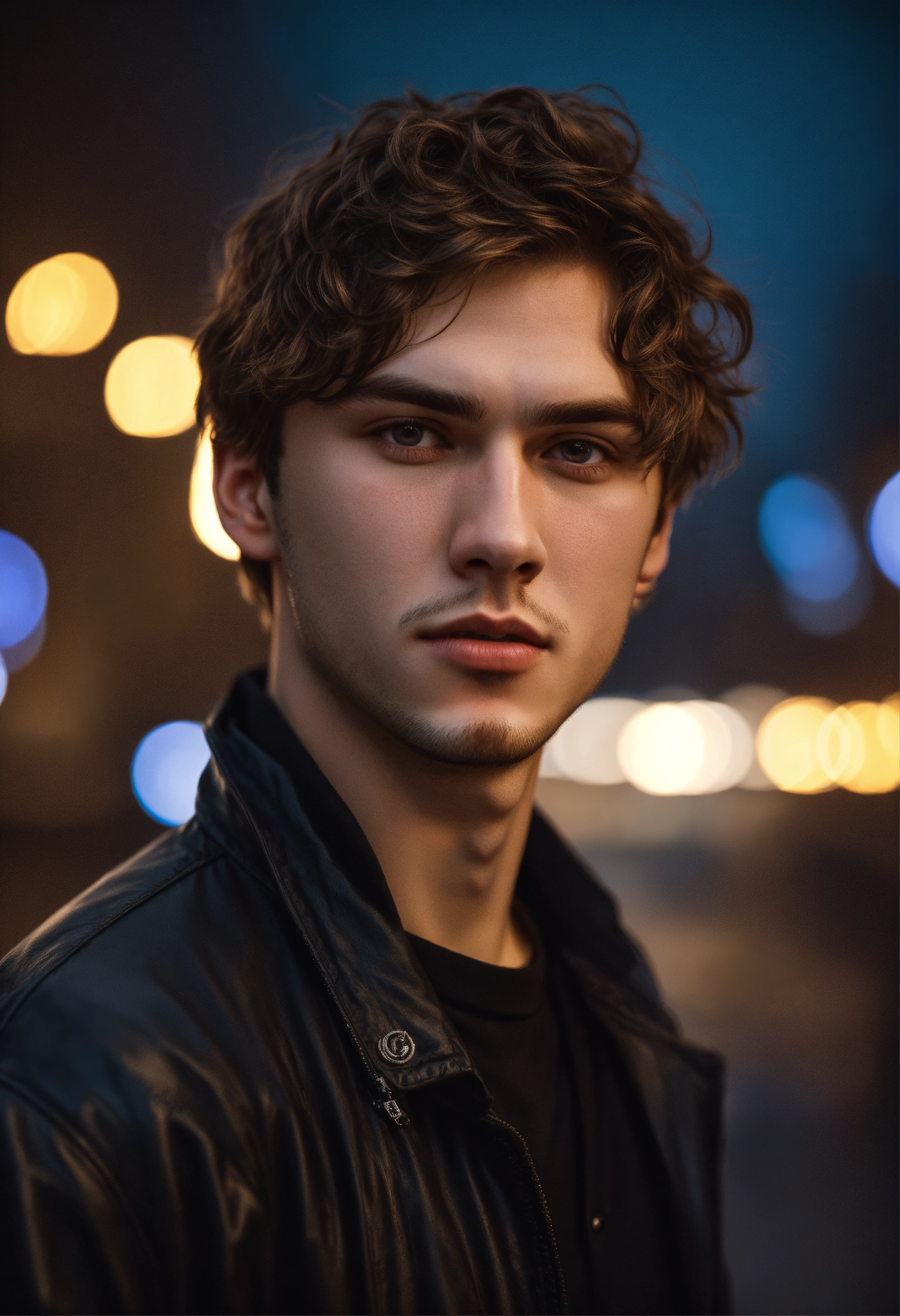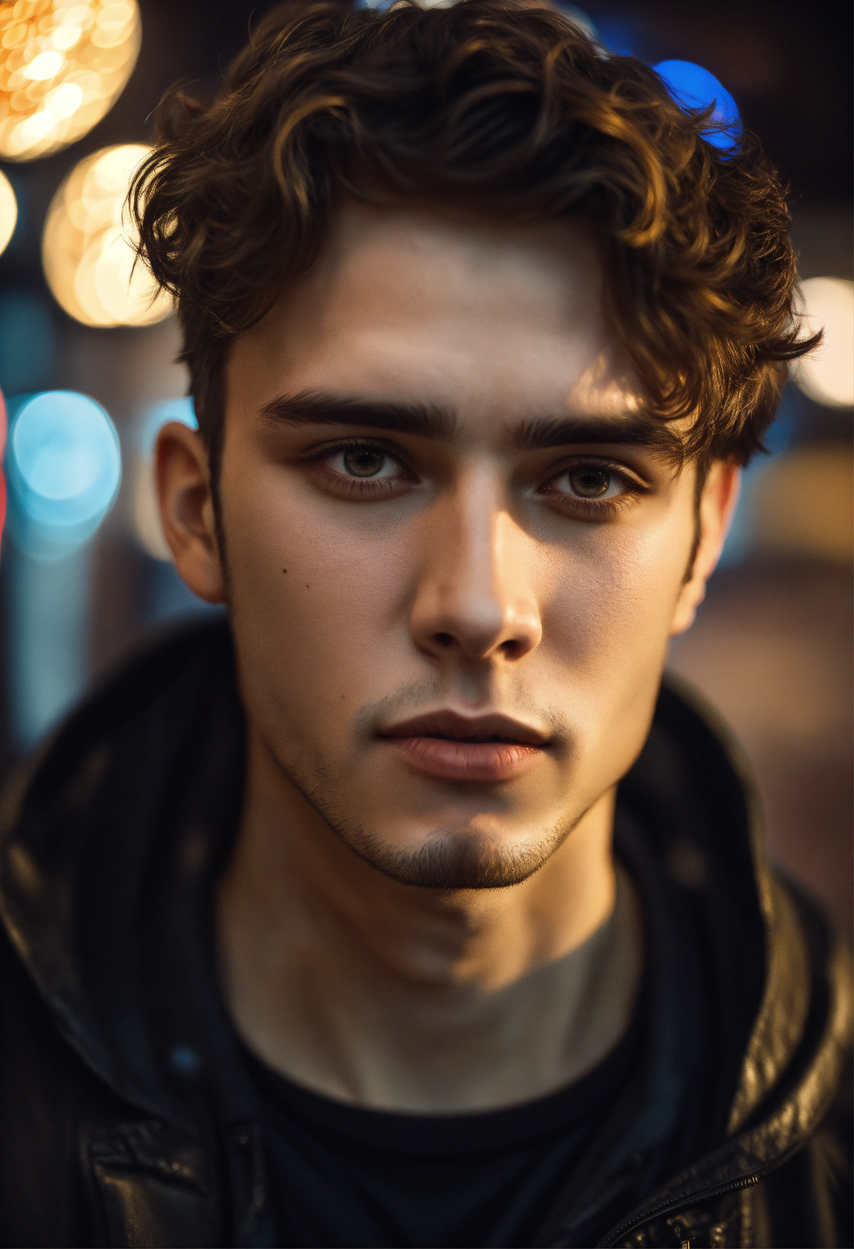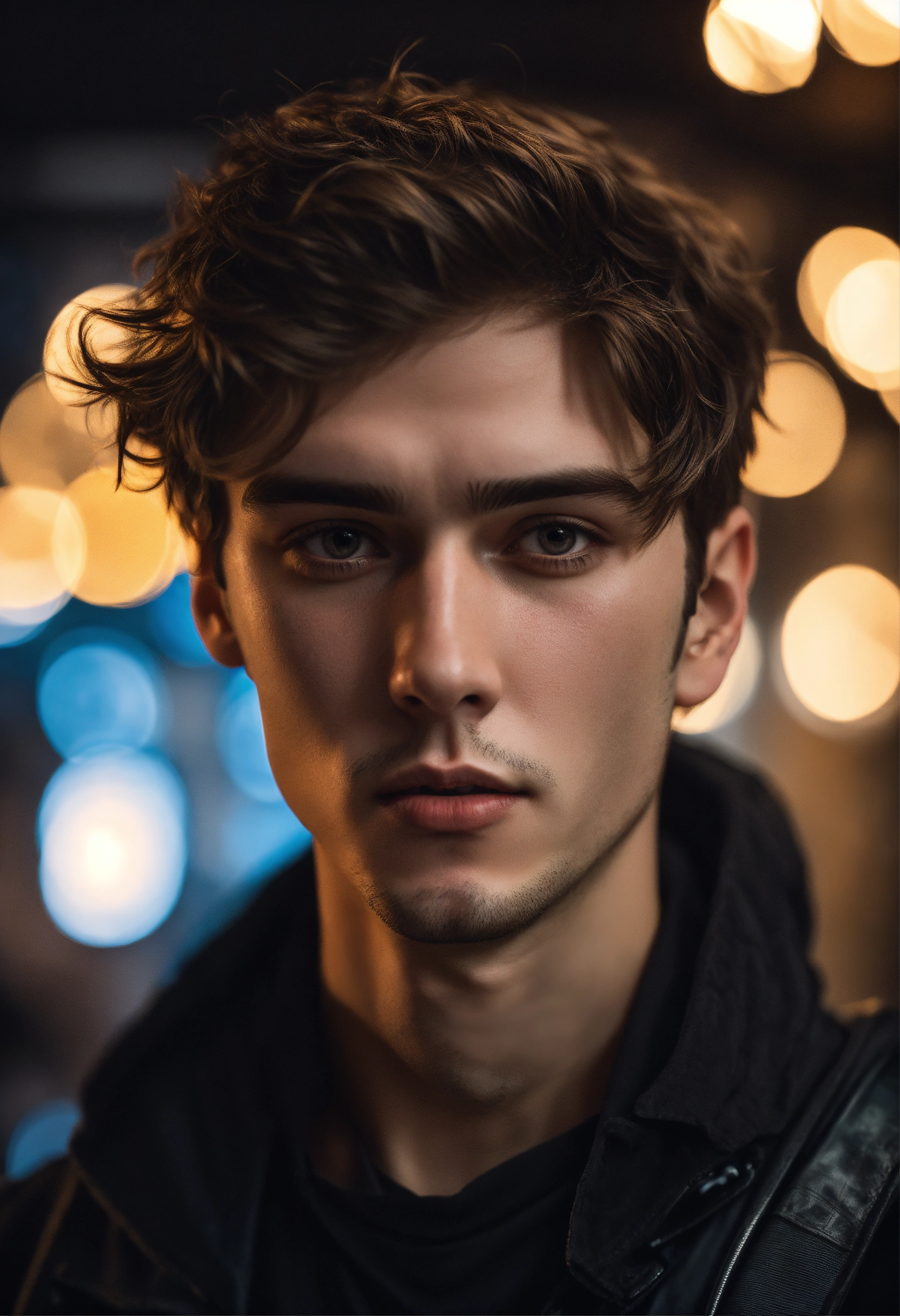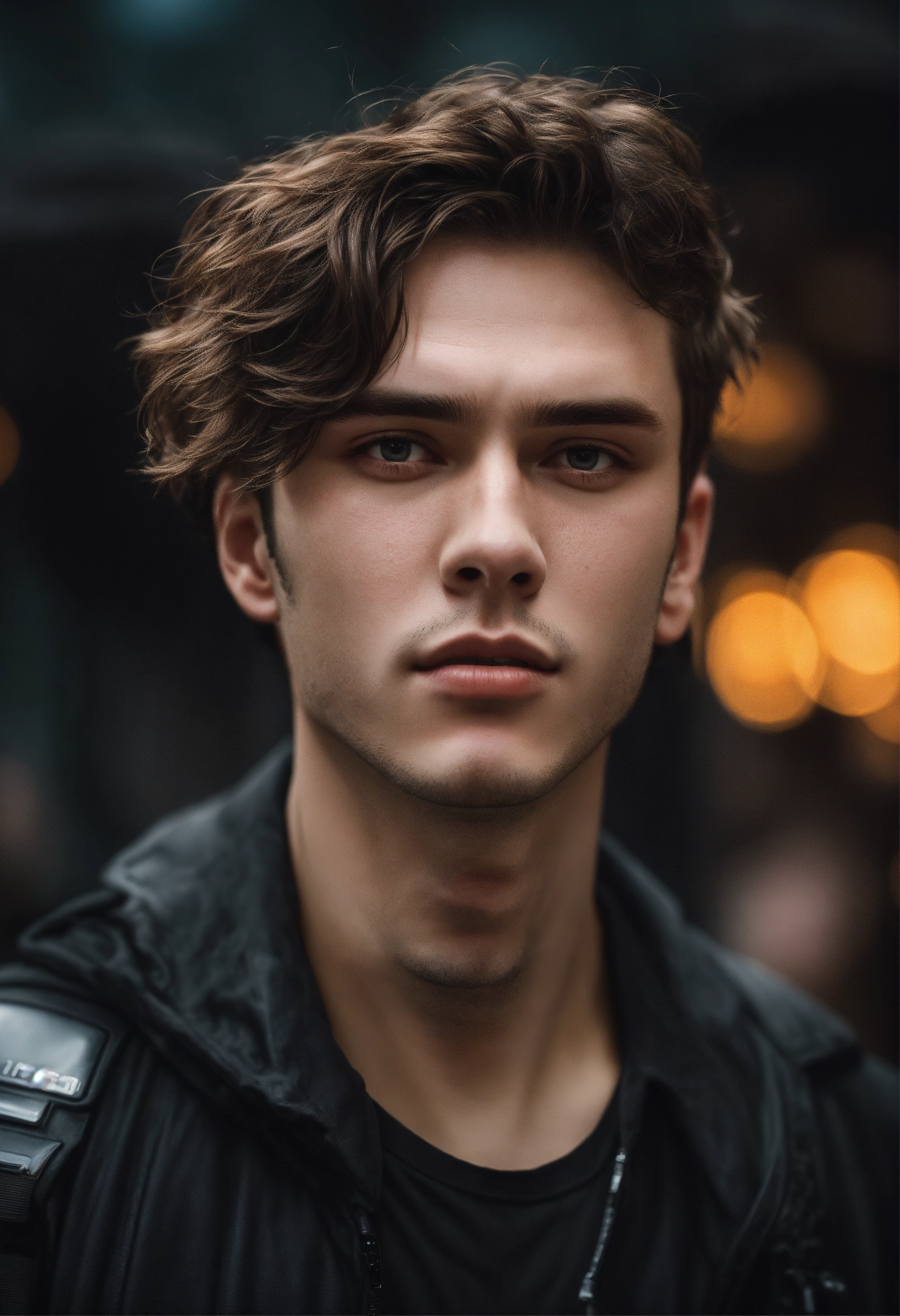 Highly detailed portrait of russian young man 25 years old, thin, brown short wavy hair, clean shaven, brown eyes, kind eyes, clean, handsome, cyberpunk, wearing black corpo clothes, cartoon realism, black, grunge aesthetic!!! bokeh