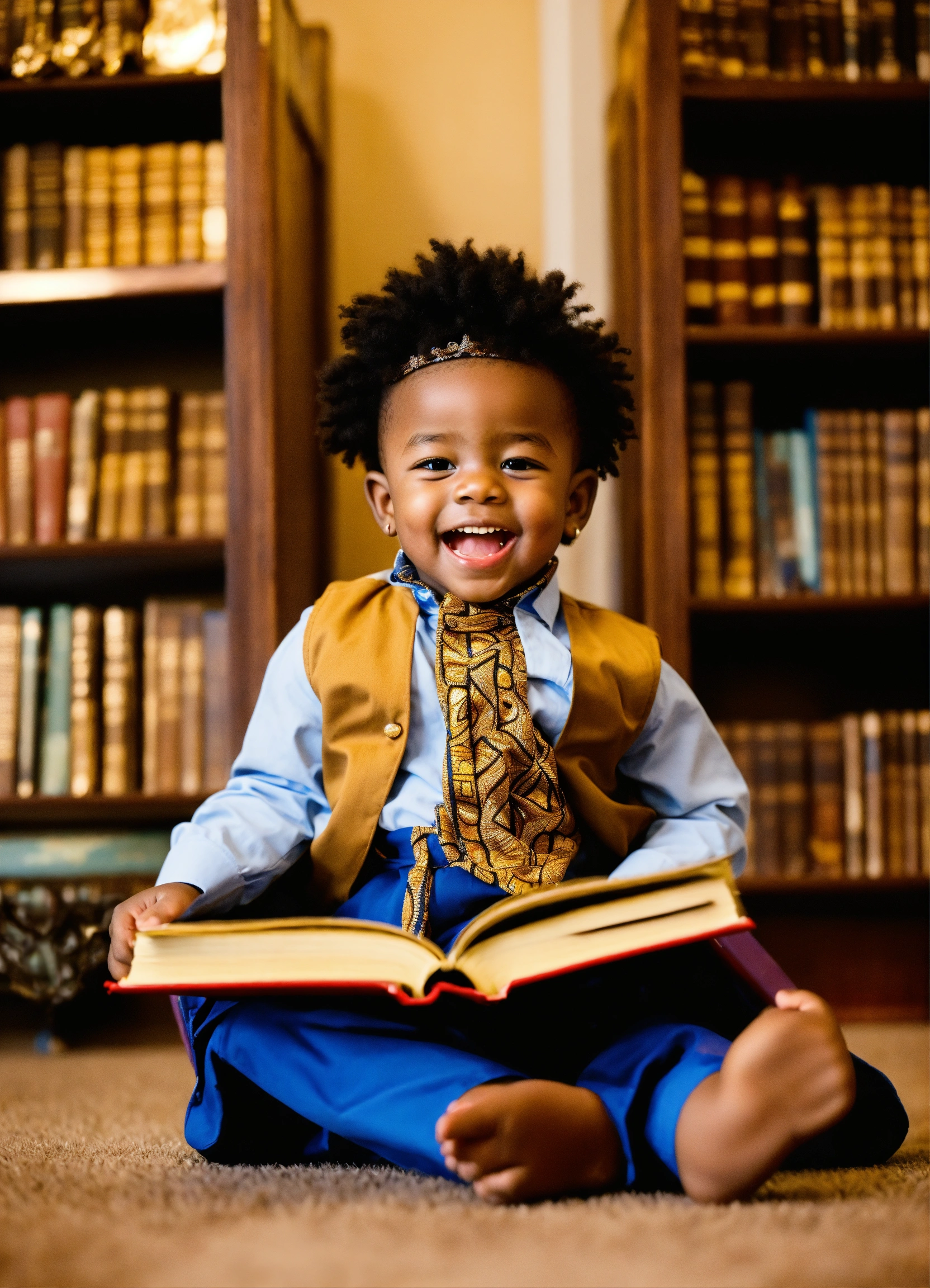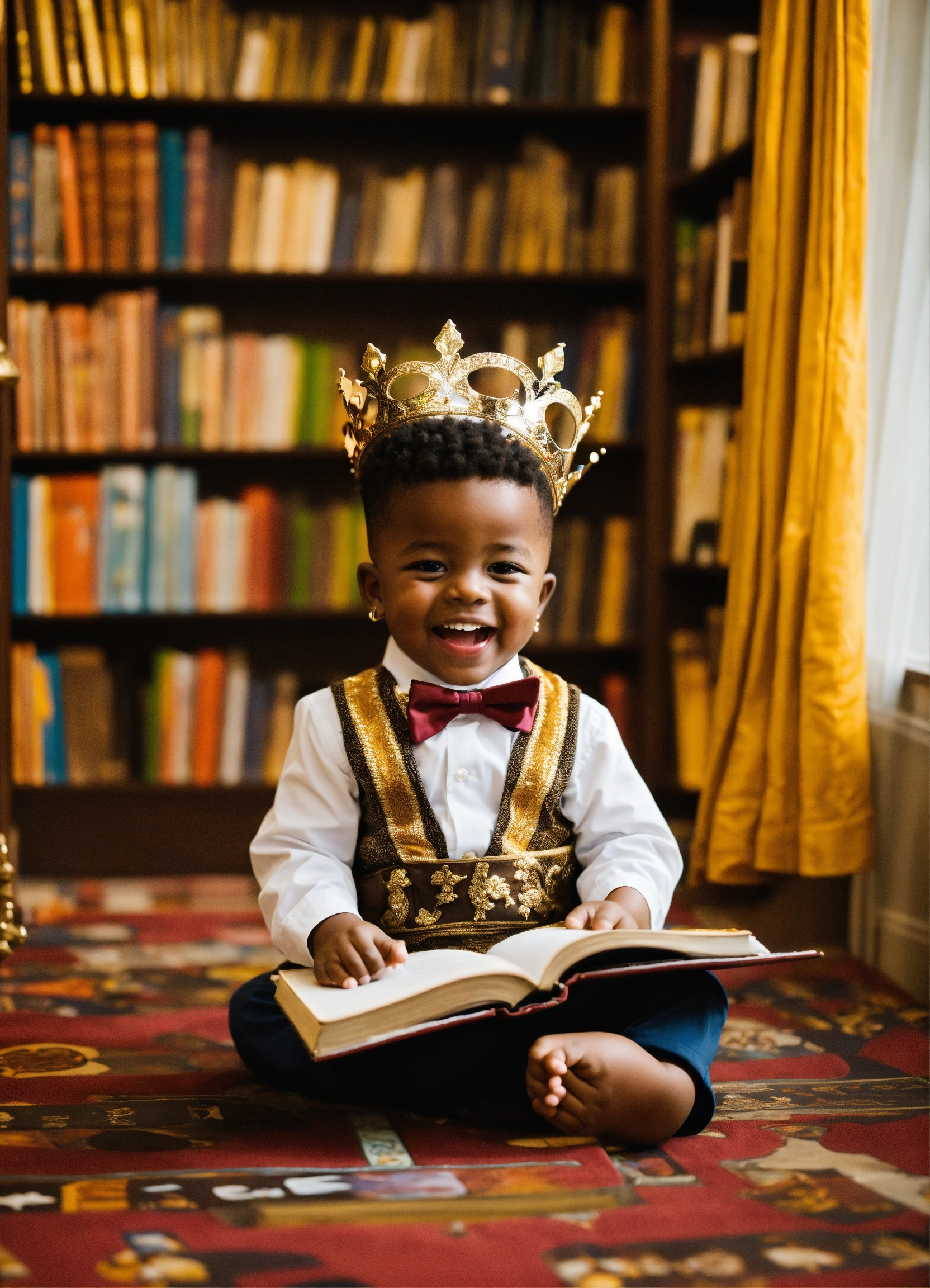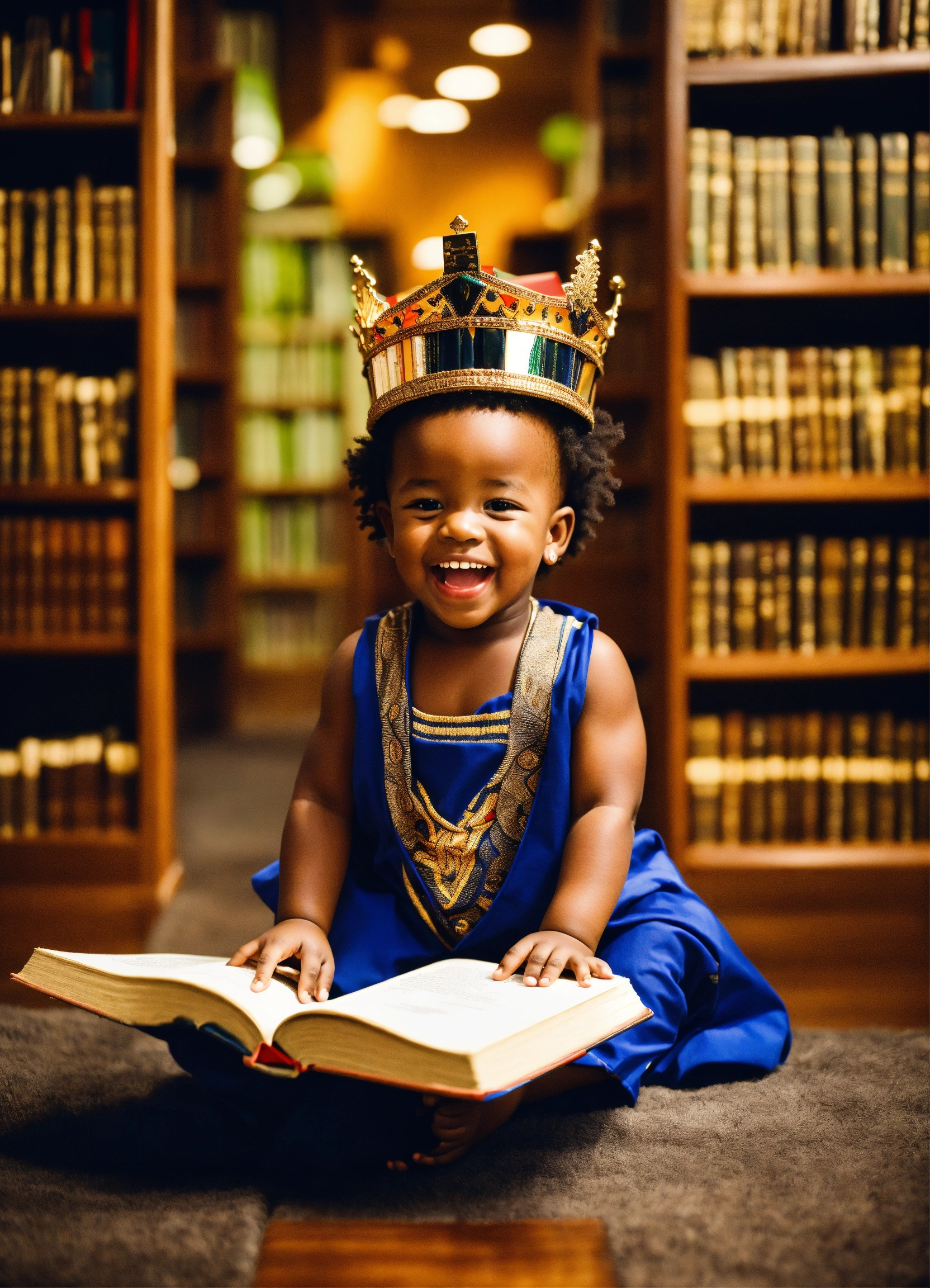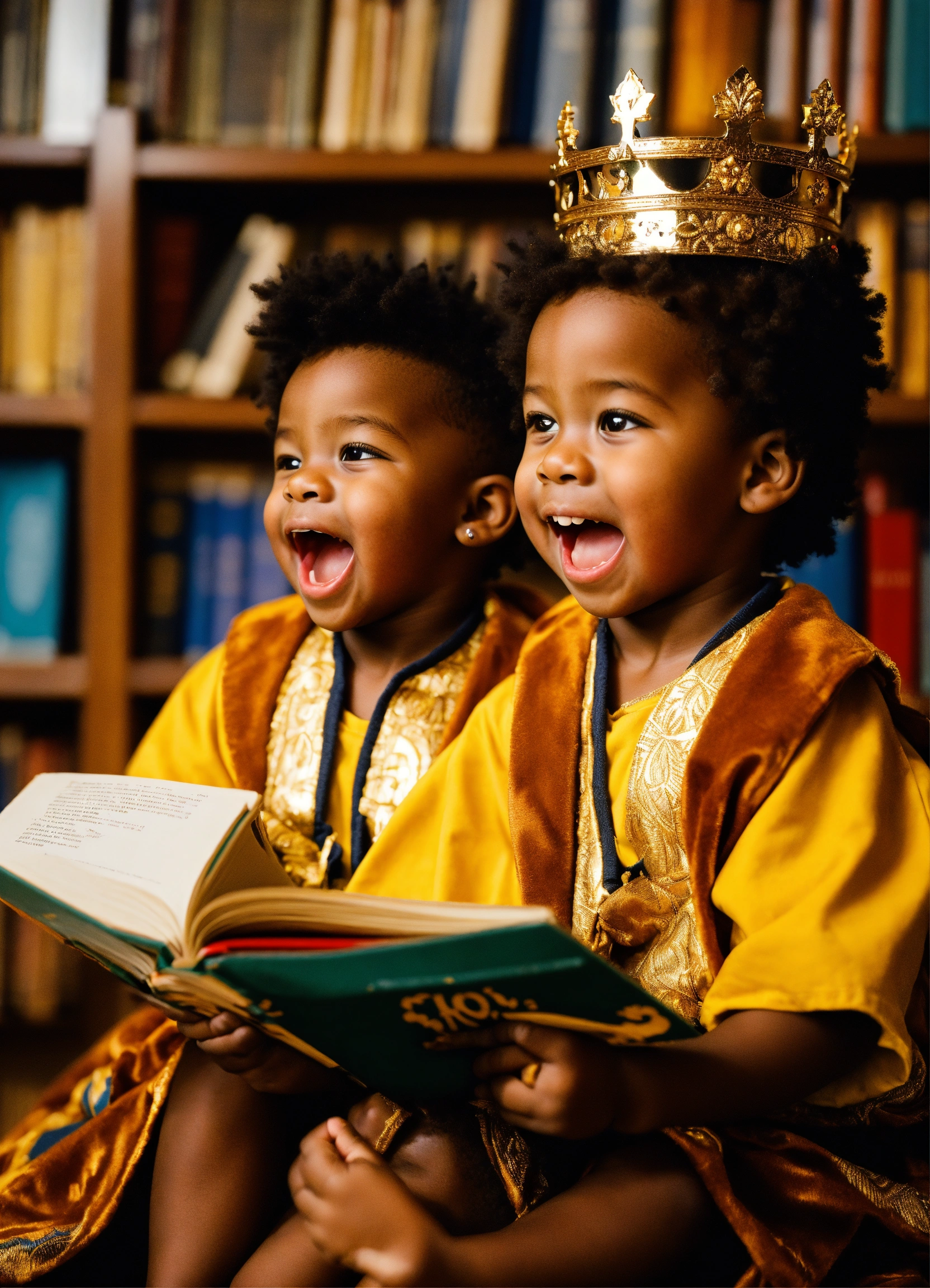 Very beautiful dark skinned african american toddler boys dressed as kings roaring with laughter with books all around them in a library