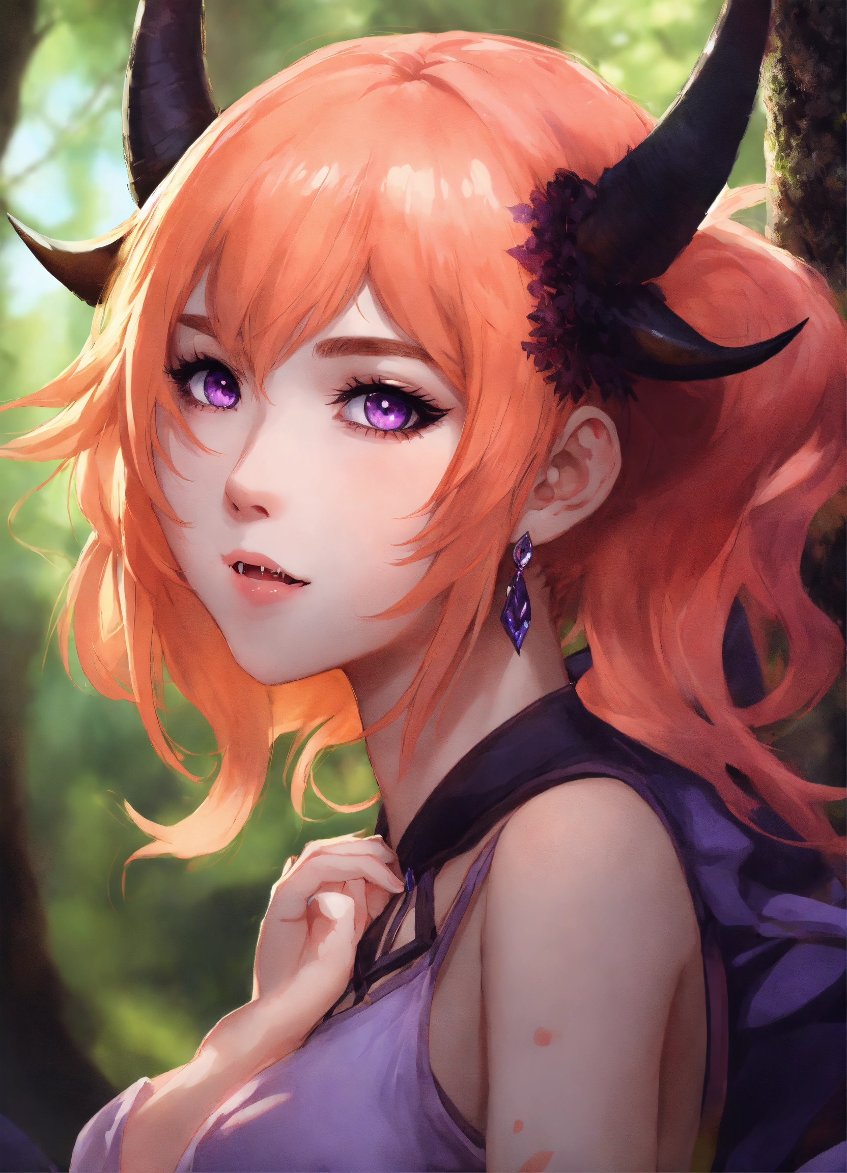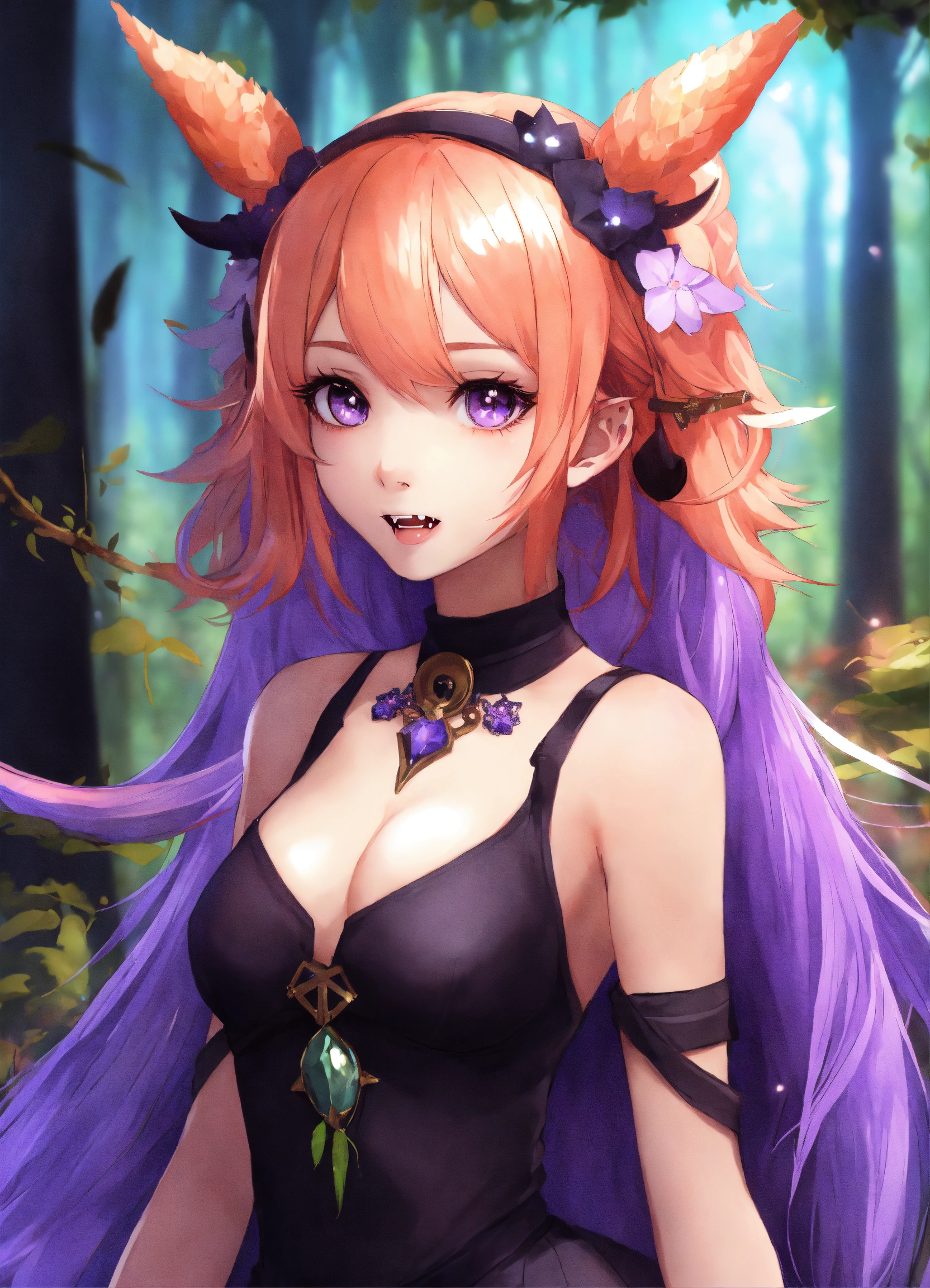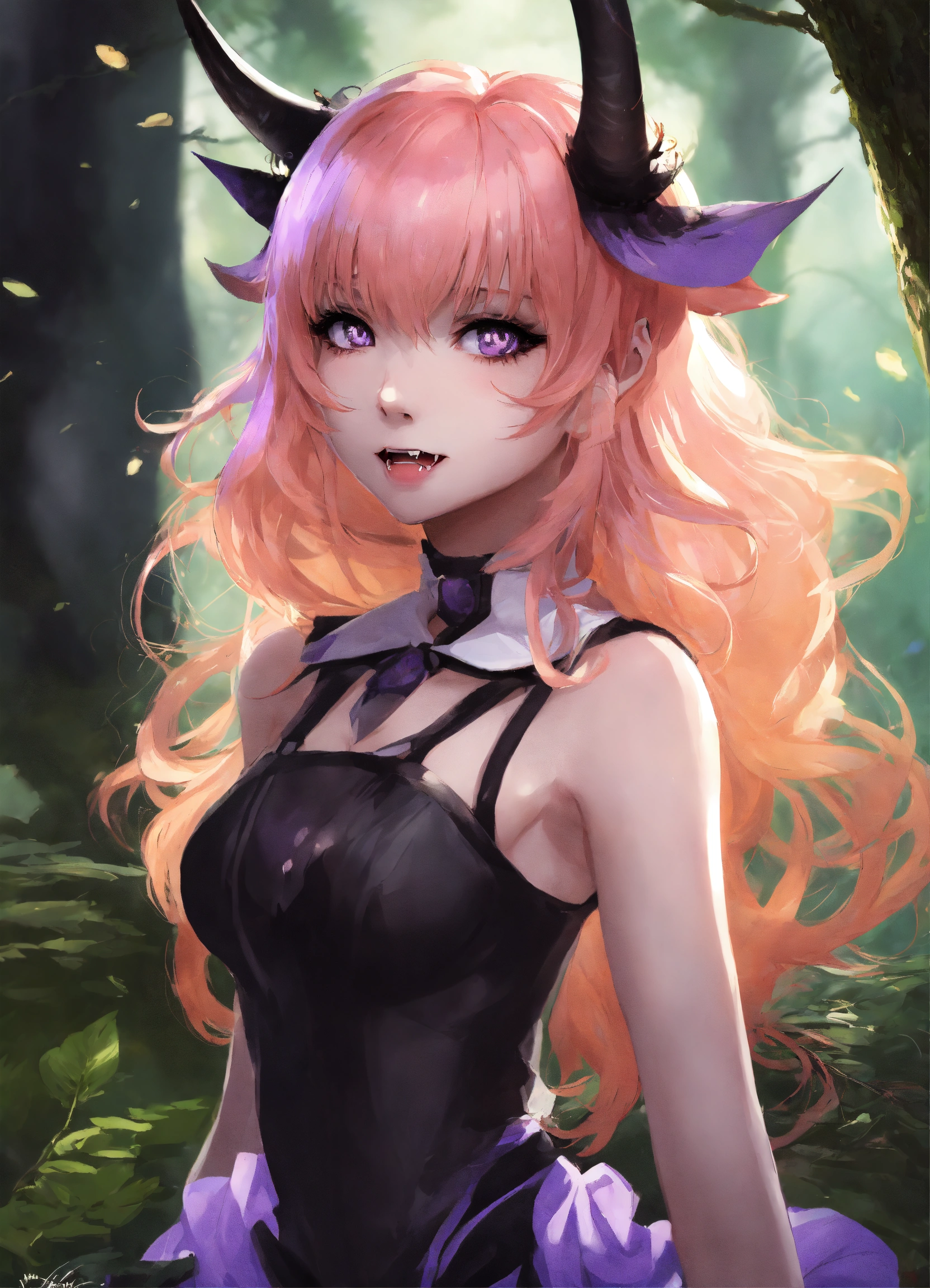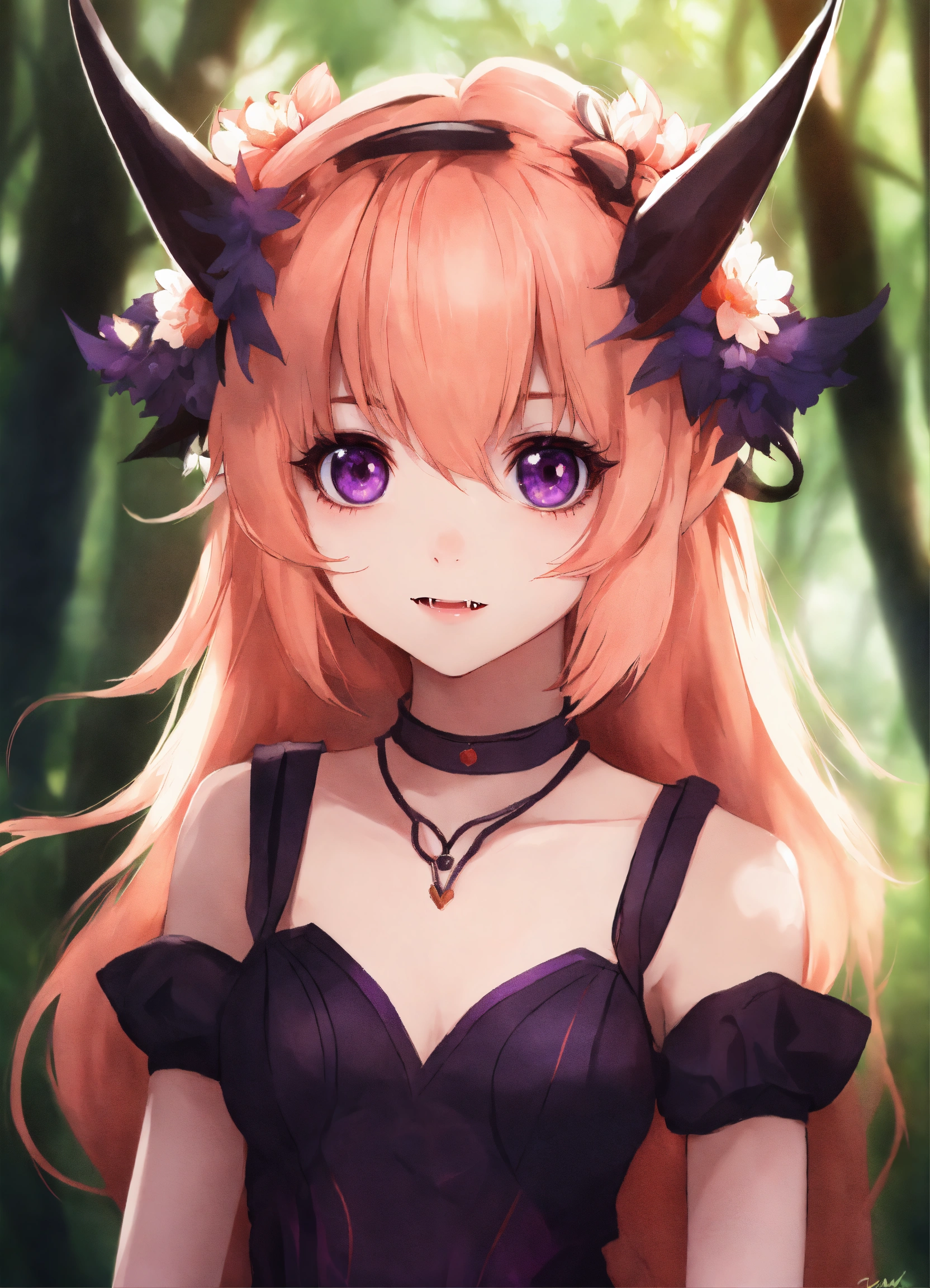 Cute petite anime girl, peach hair, purple eyes, fangs, pointed ears, black head horn halo shape, forest background, girm fantasy