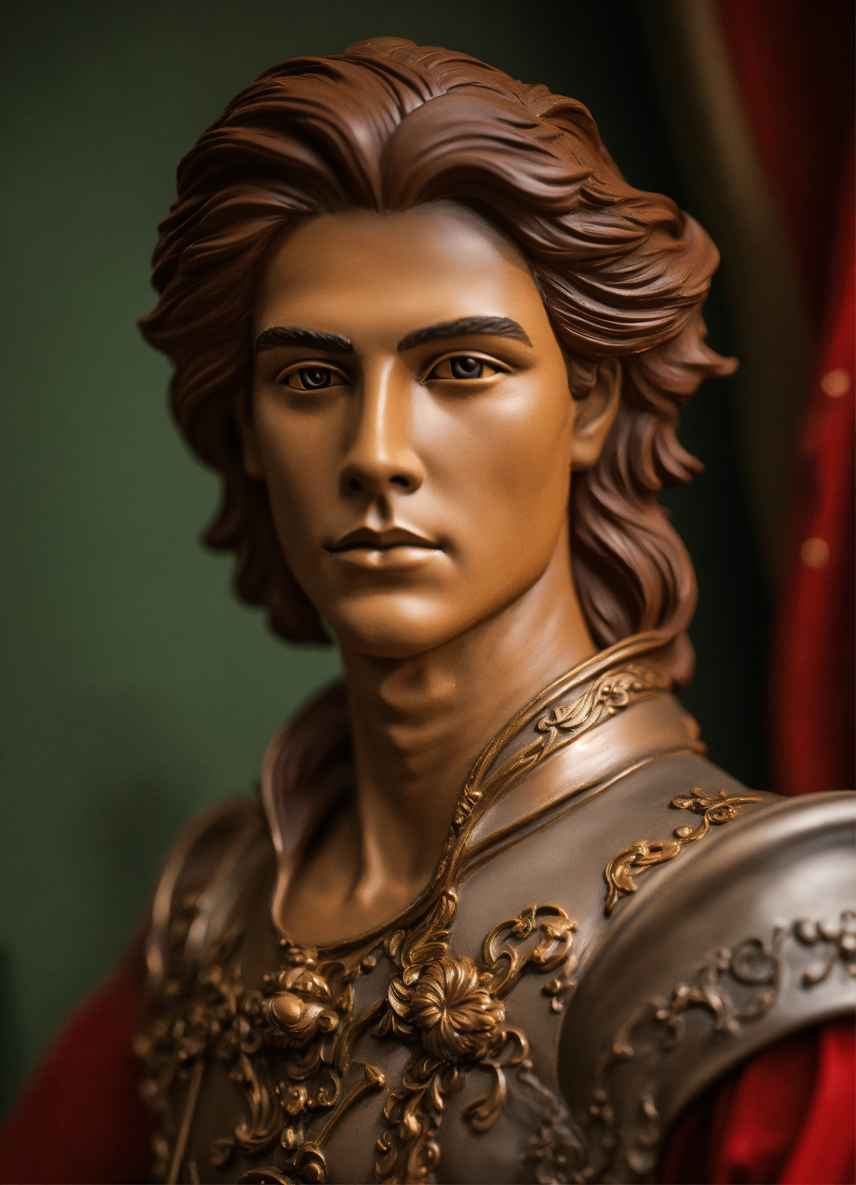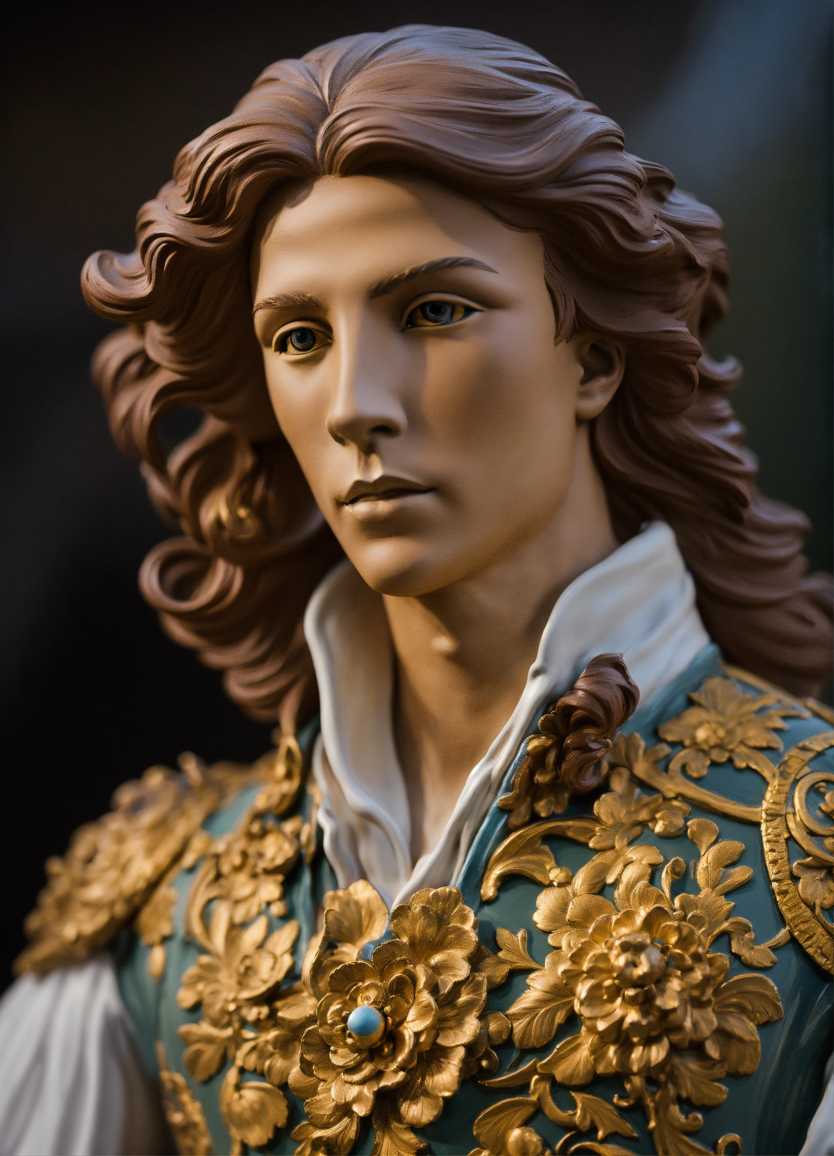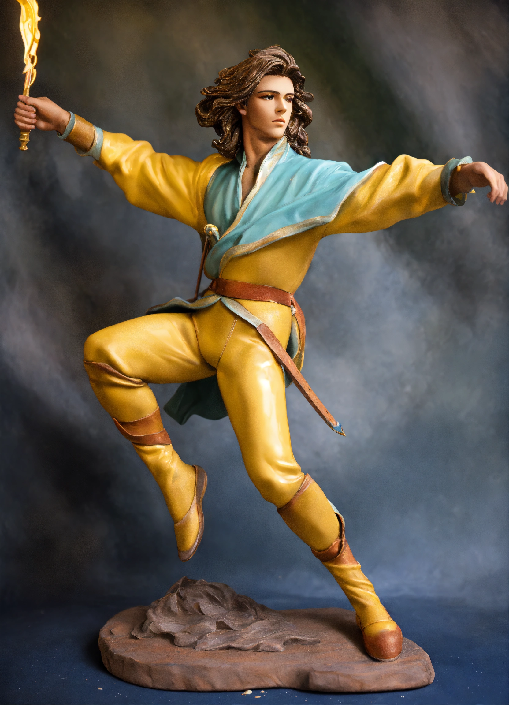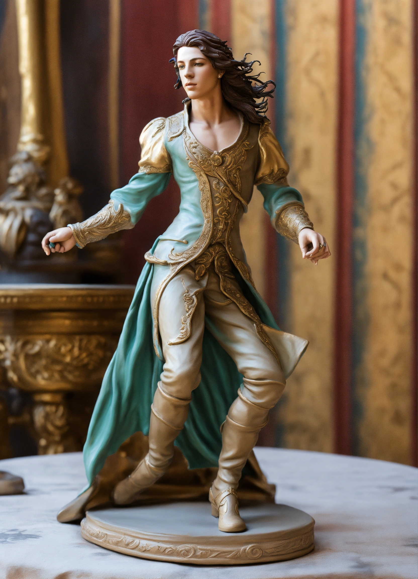 A realistic lifelike painted lifesized clay sculpture of a dazzling androgynous young man dancing with a rapier. makeup, sculpted curves, long flowing hair.