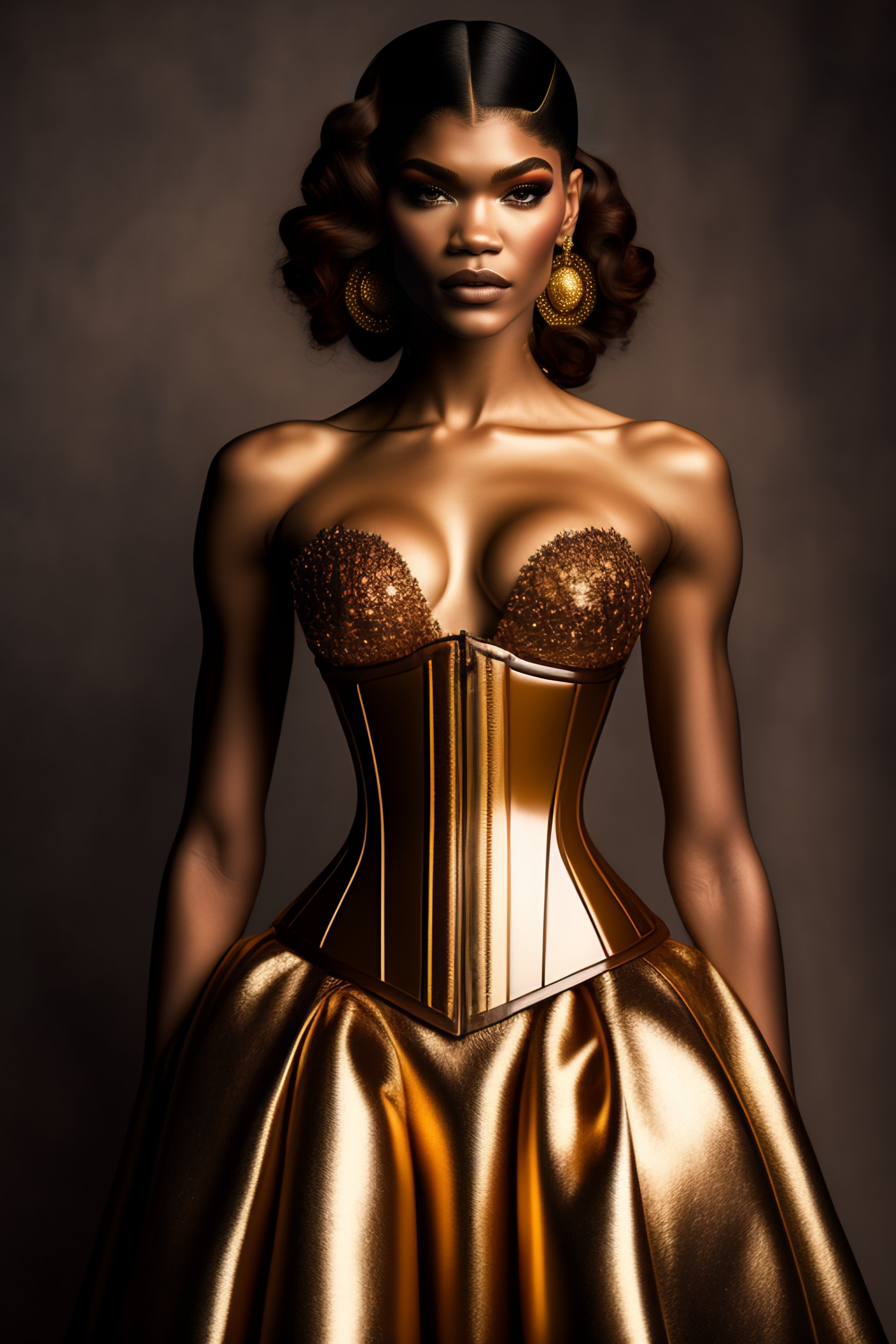 Portrait shot of zendaya wearing a corset, with christina hendricks upper body type, shiny skin, intricate, elegant, highly detailed, centered, zeiss lens, canon eos, cinematic lighting, photography, film still