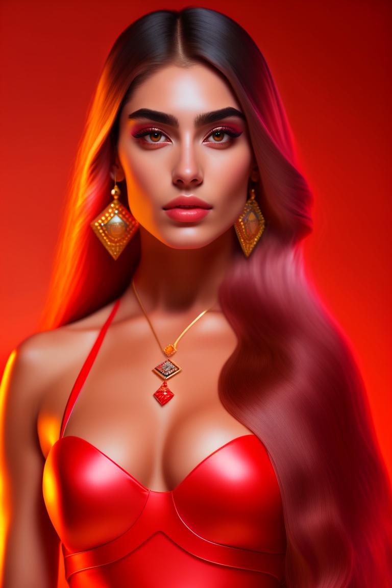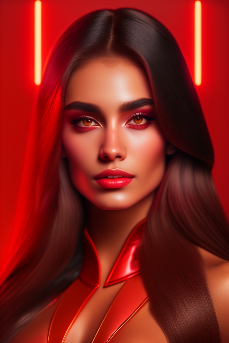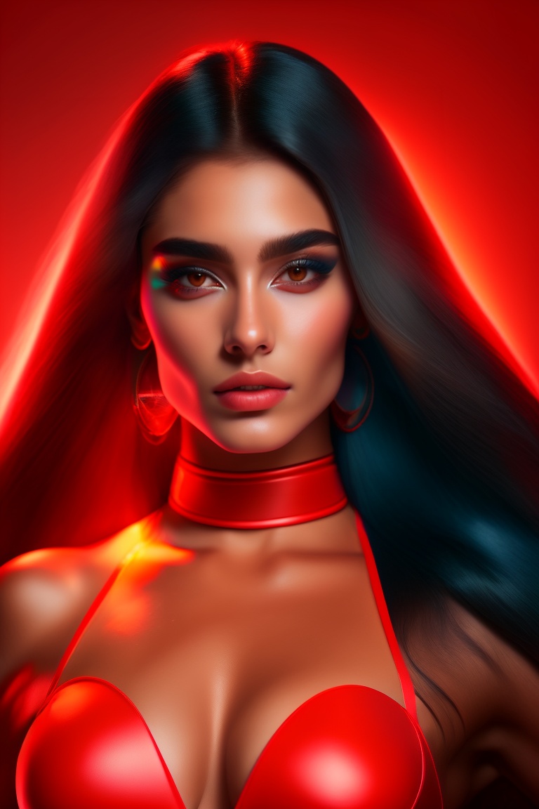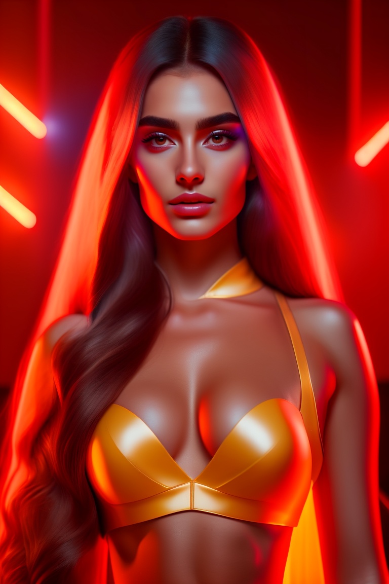 An aesthetic top female model in lifeguard outfit, arab heritage, long hair, golden ratio face, big eyes, big quads, wide bust, in a bedroom with red lights background