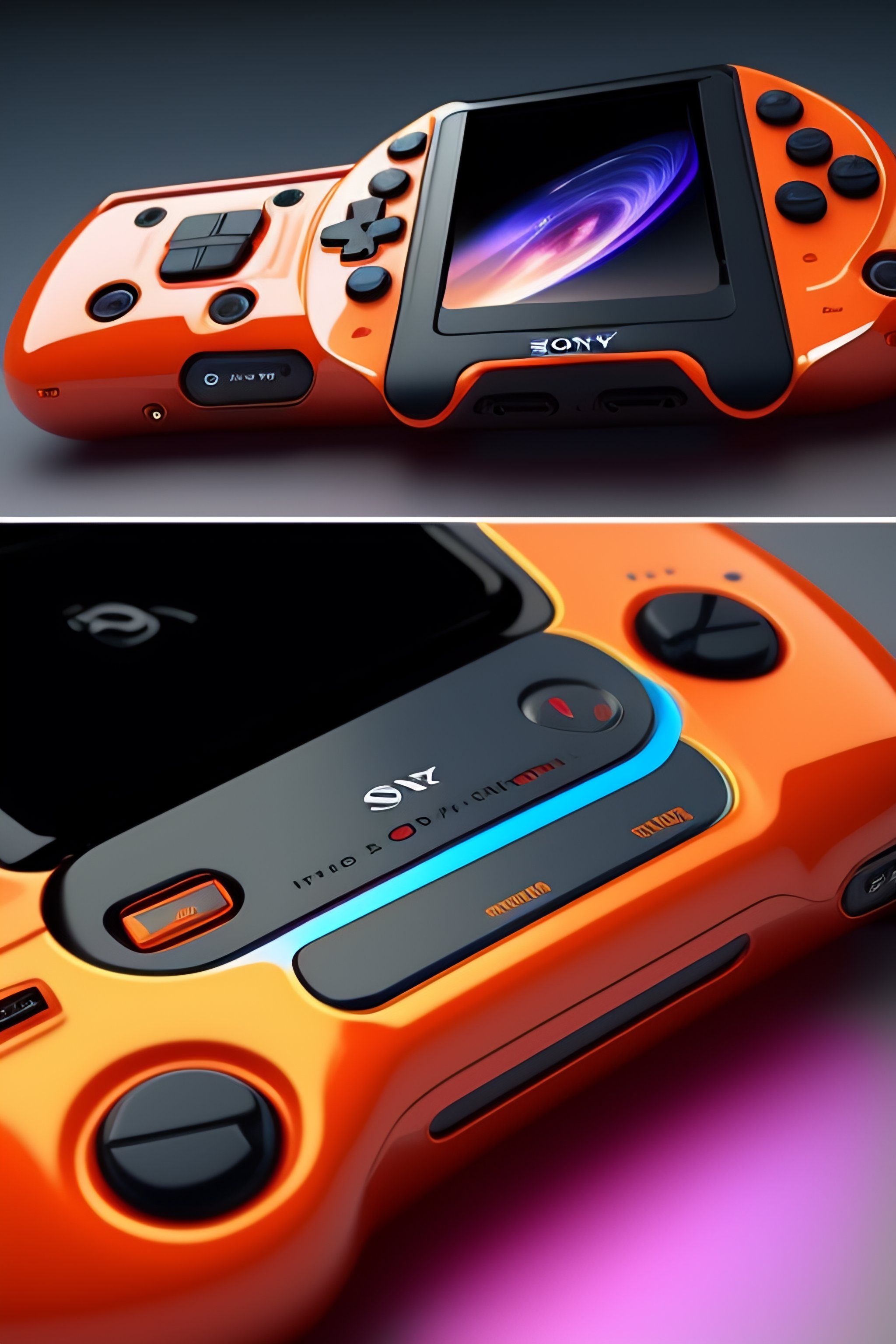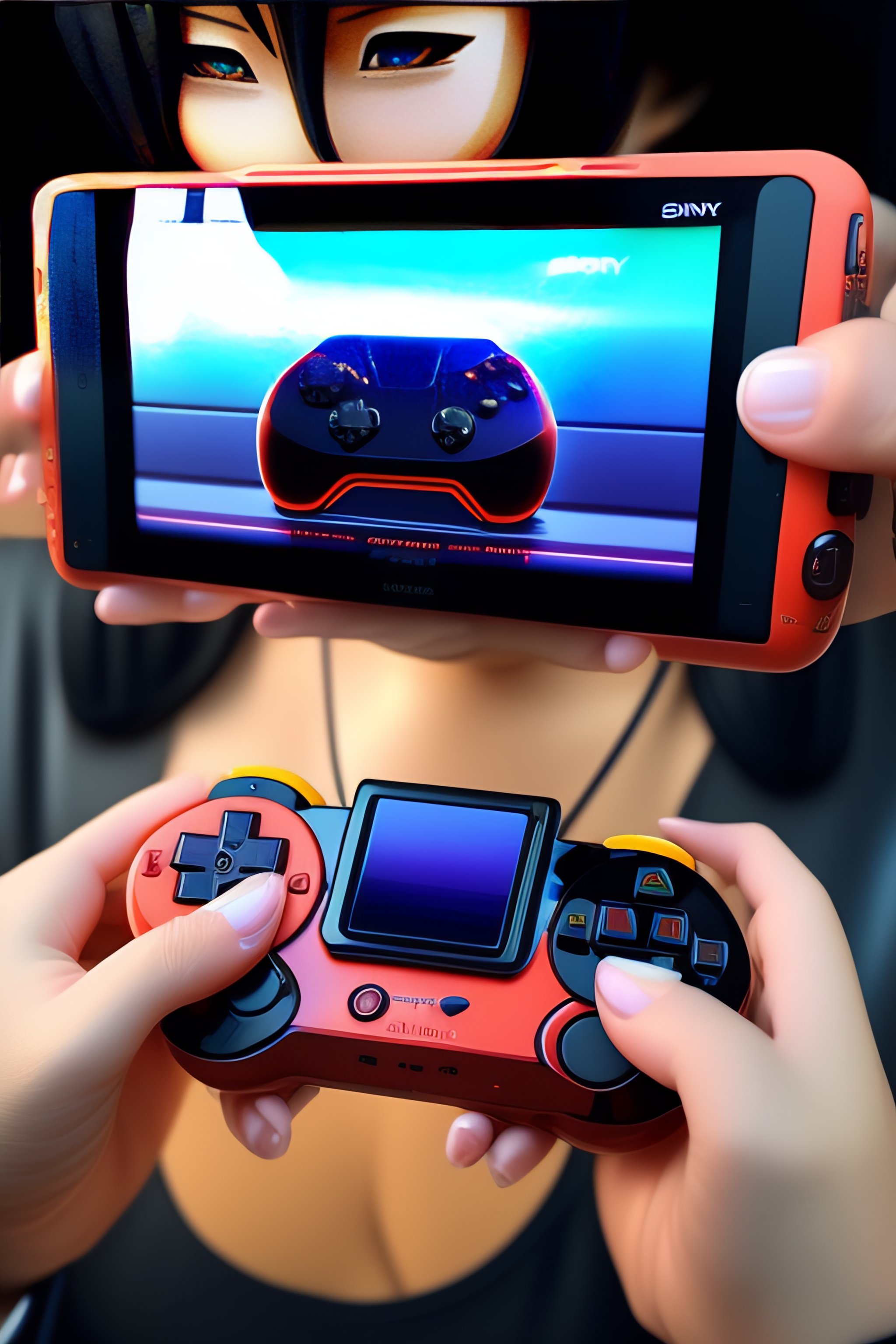 Futuristic handheld gaming console made by sony in an anime cartoon style
