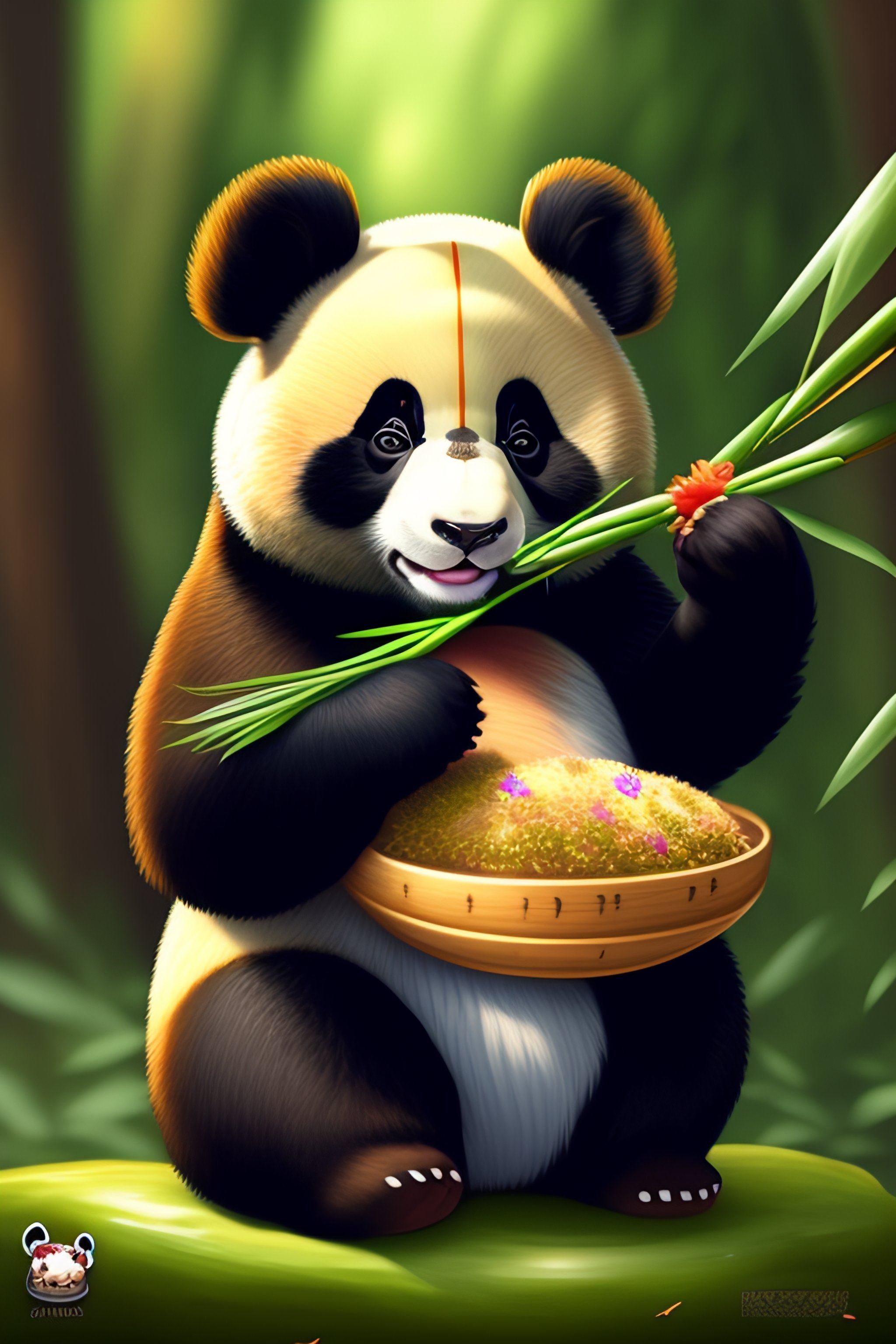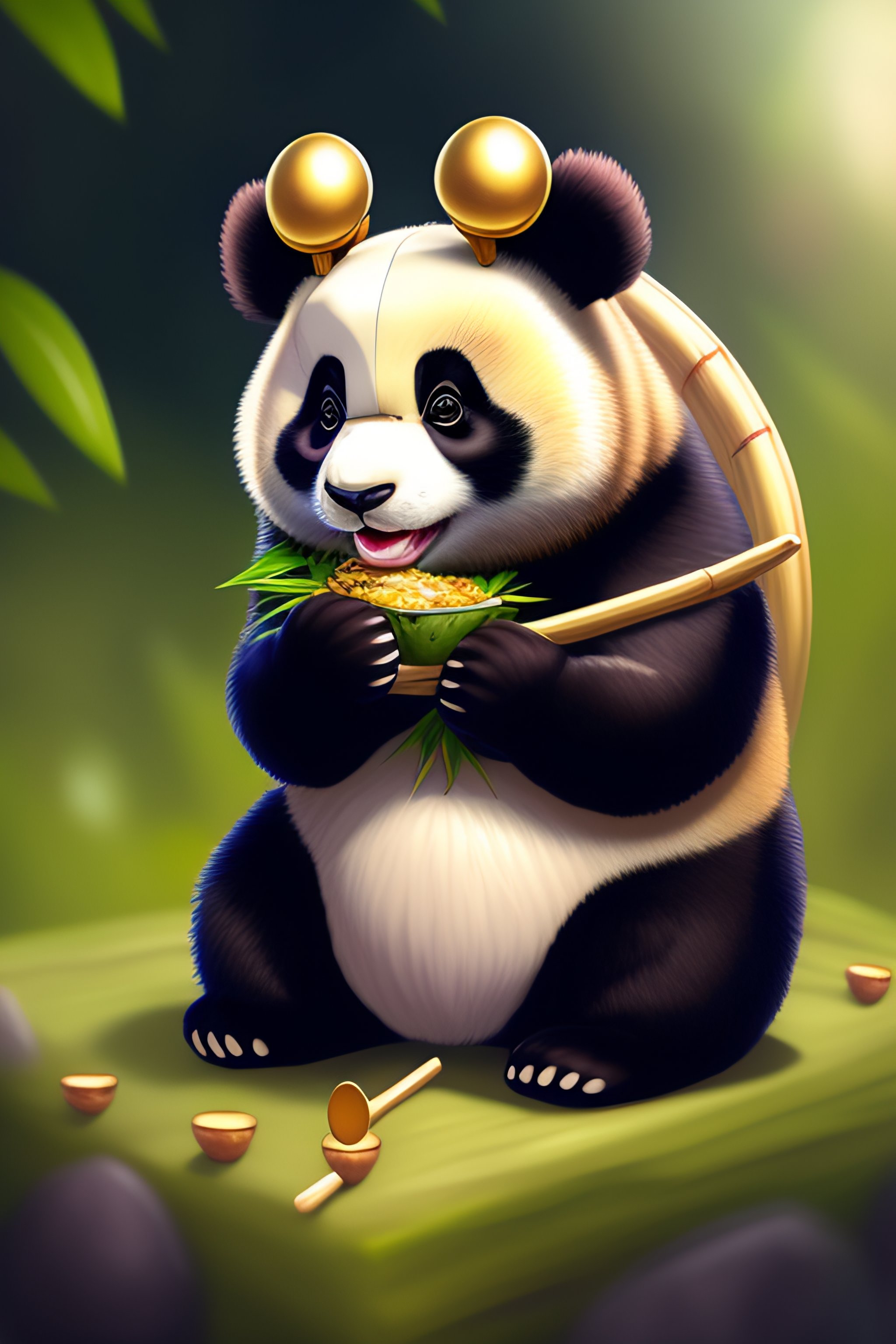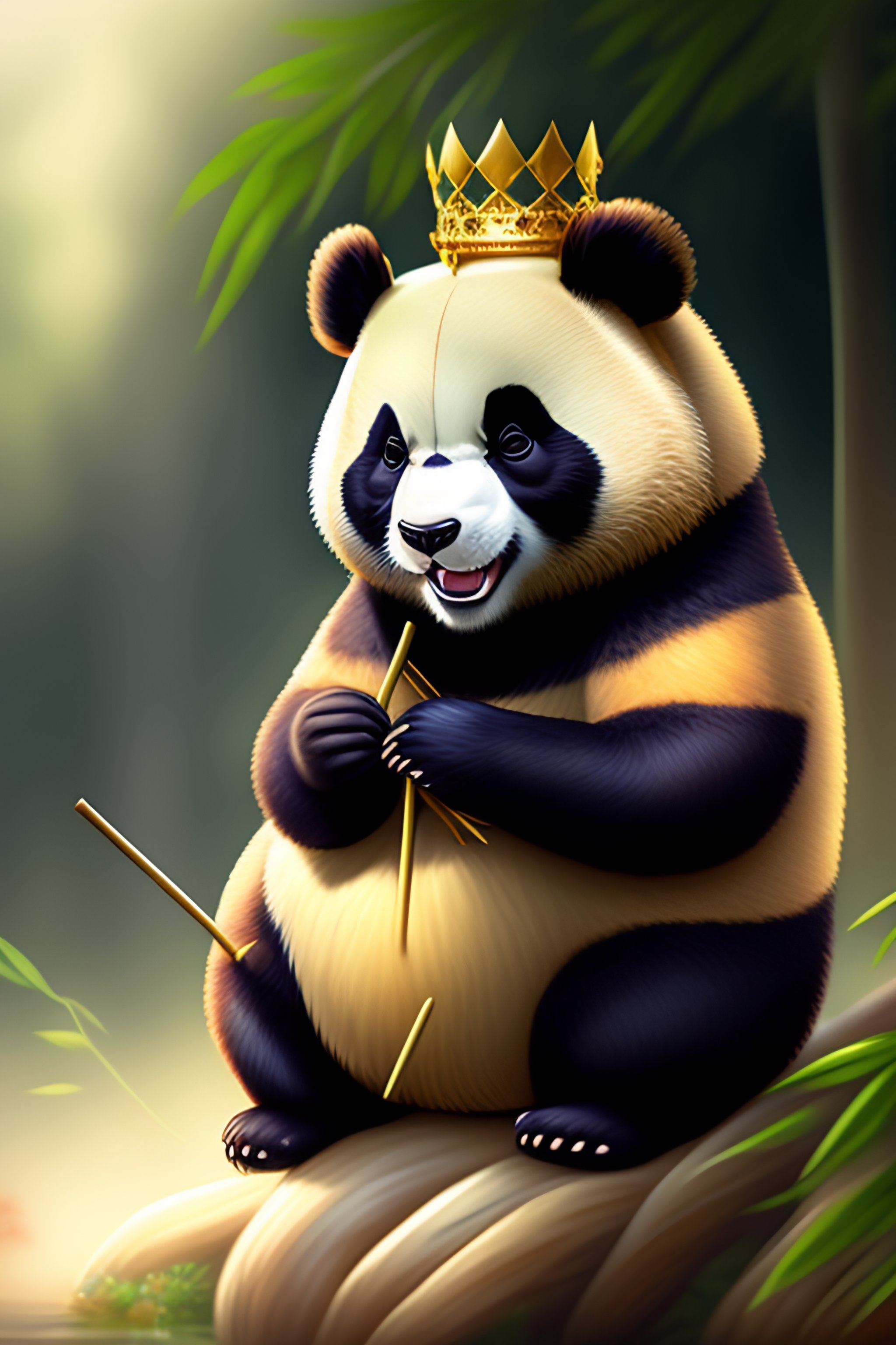 Cute anthro anime panda with a king crown on his head eating bamboo
