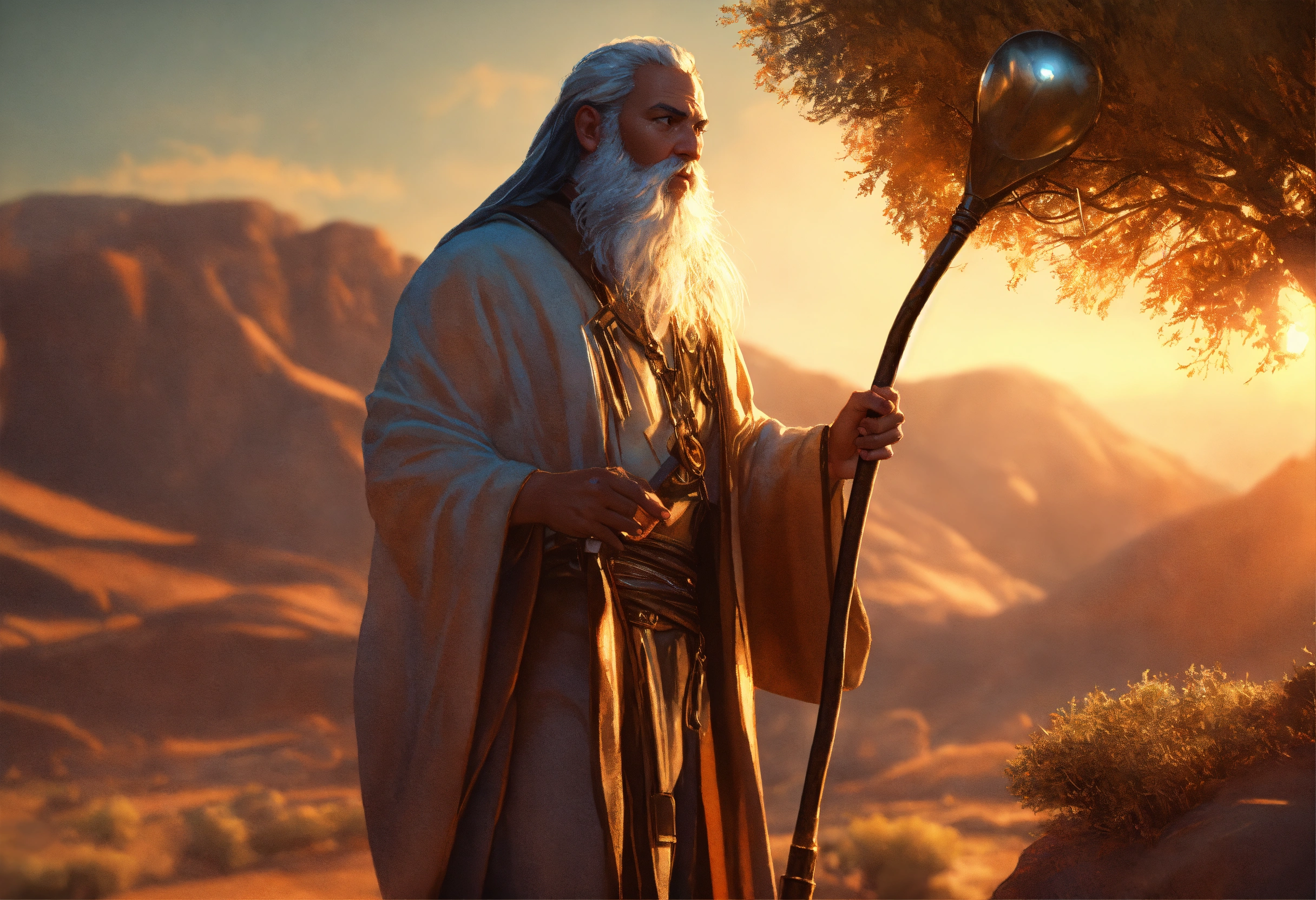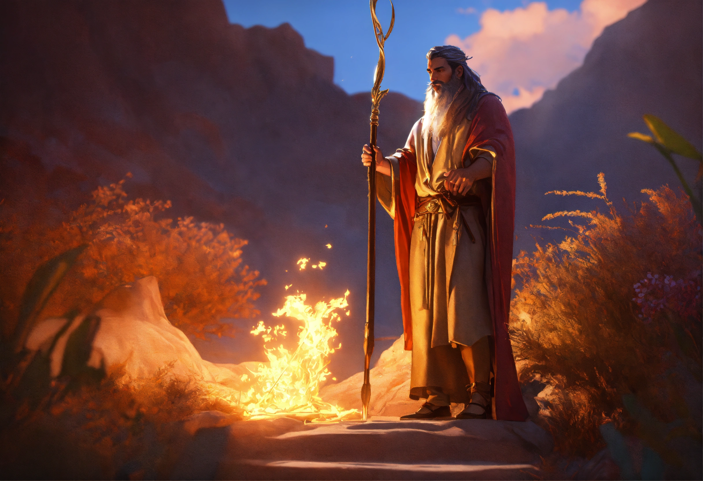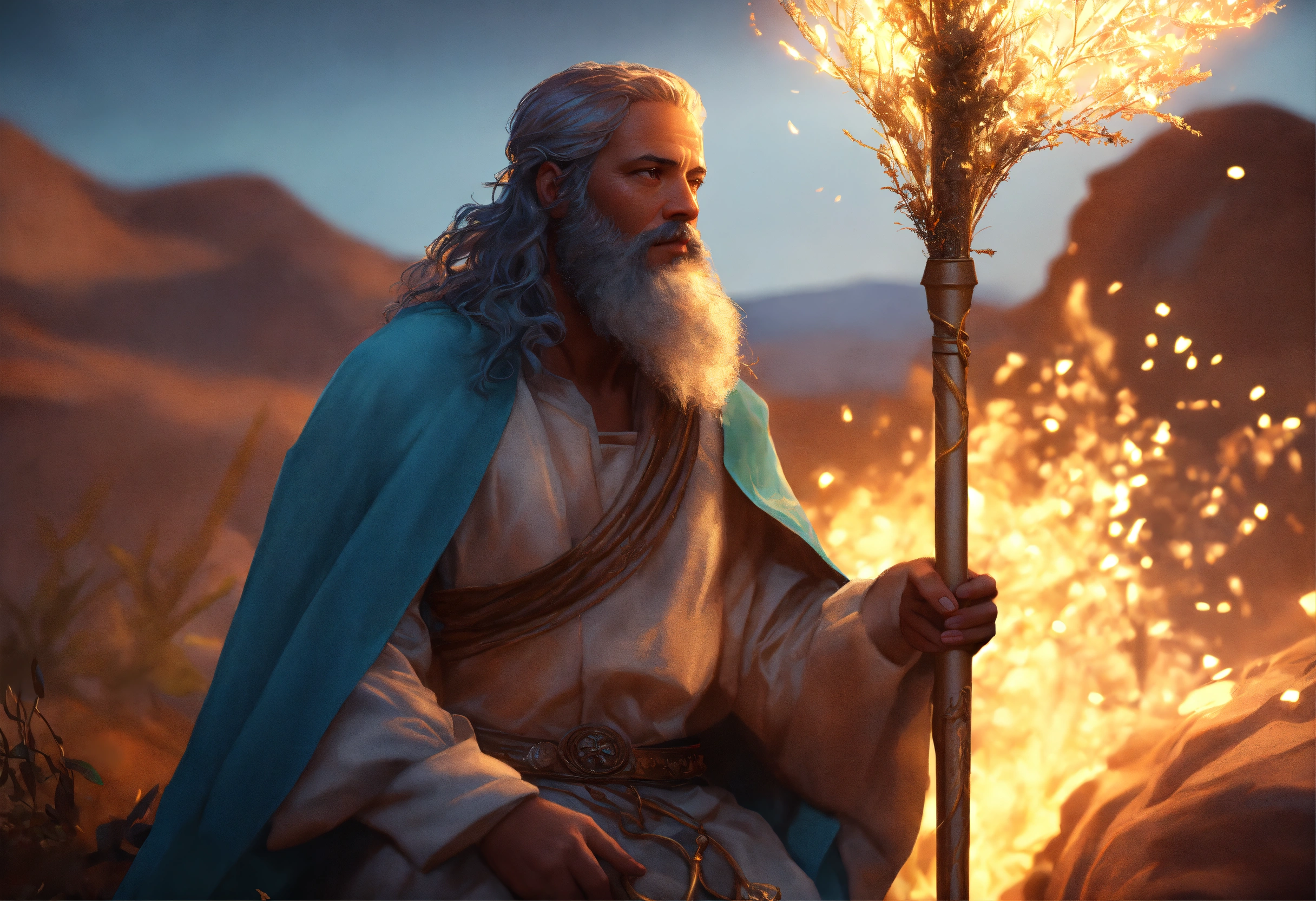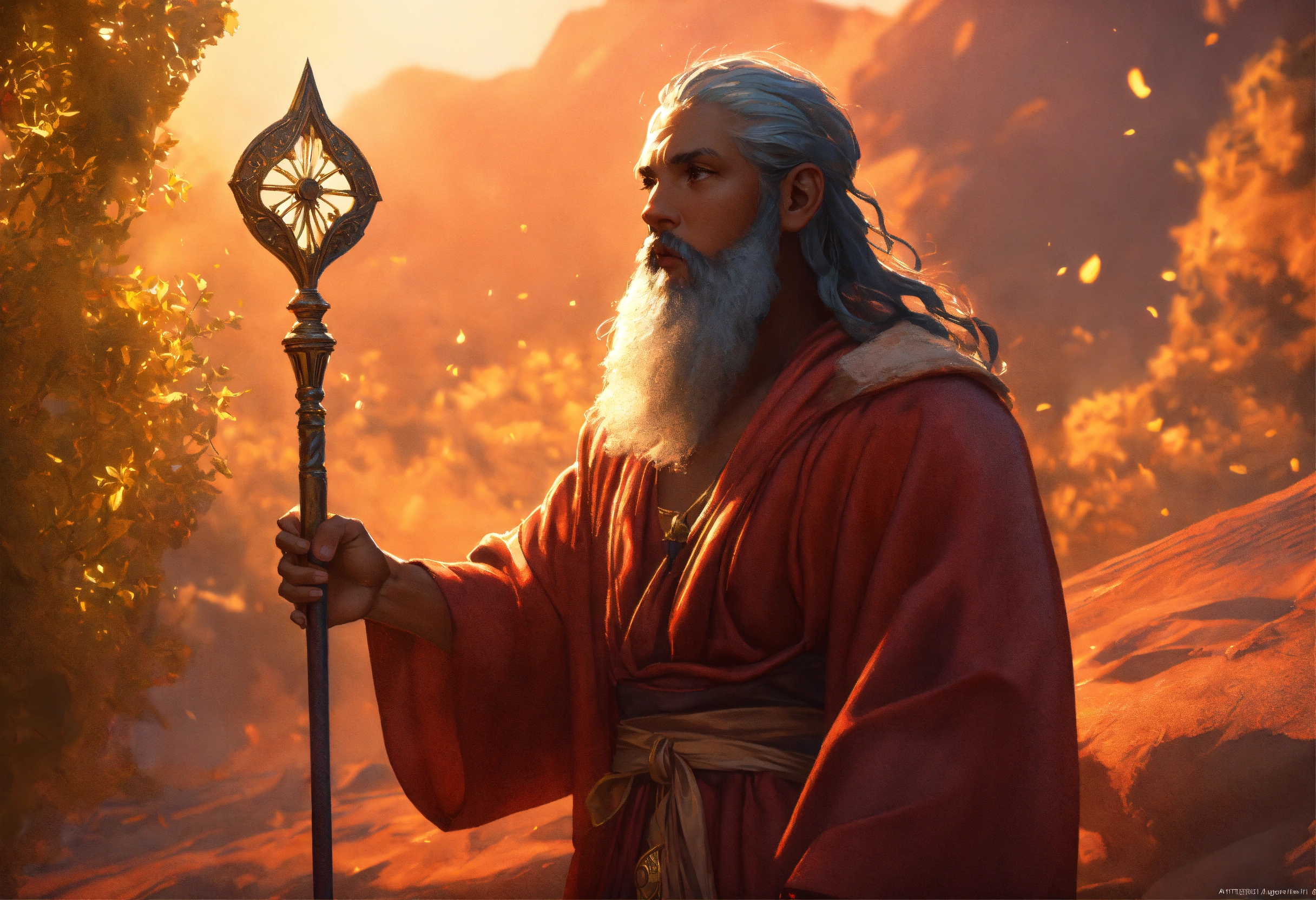 Moses with a staff in his hand, talks to god at the little burning bush, cinematic lighting, complex, elegant, super highly detailed, art station, concept art, smooth, sharp focus, no blur, no dof, extreme illustration, unreal engine 5, photorealism, hd quality, 8k resolution, cinema 4d, 3d, beautiful, delicate, art by artgerm and greg rutkowski and alphonse mucha and loish and wlop