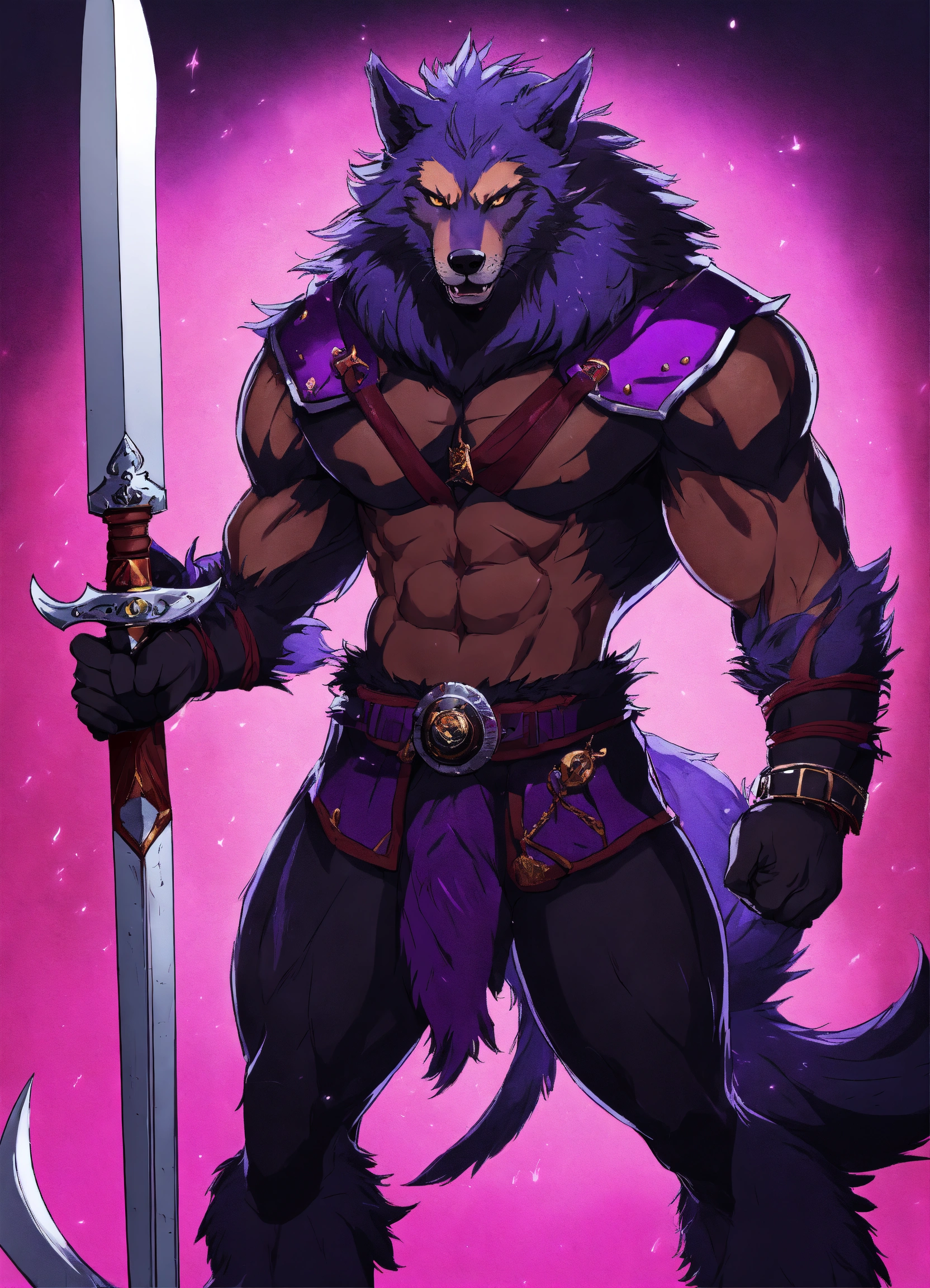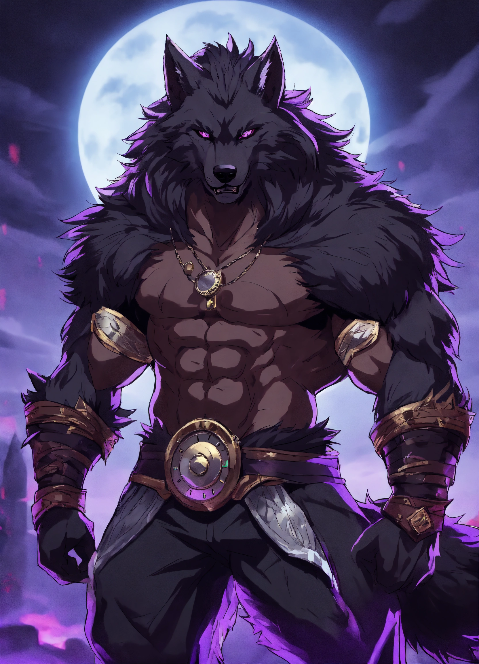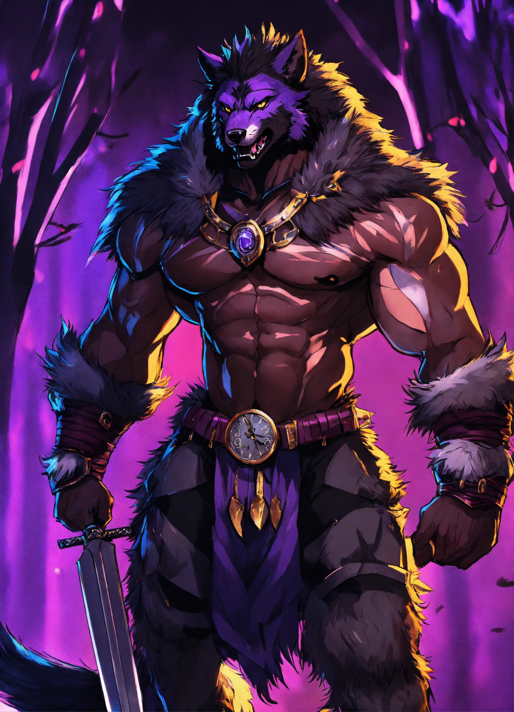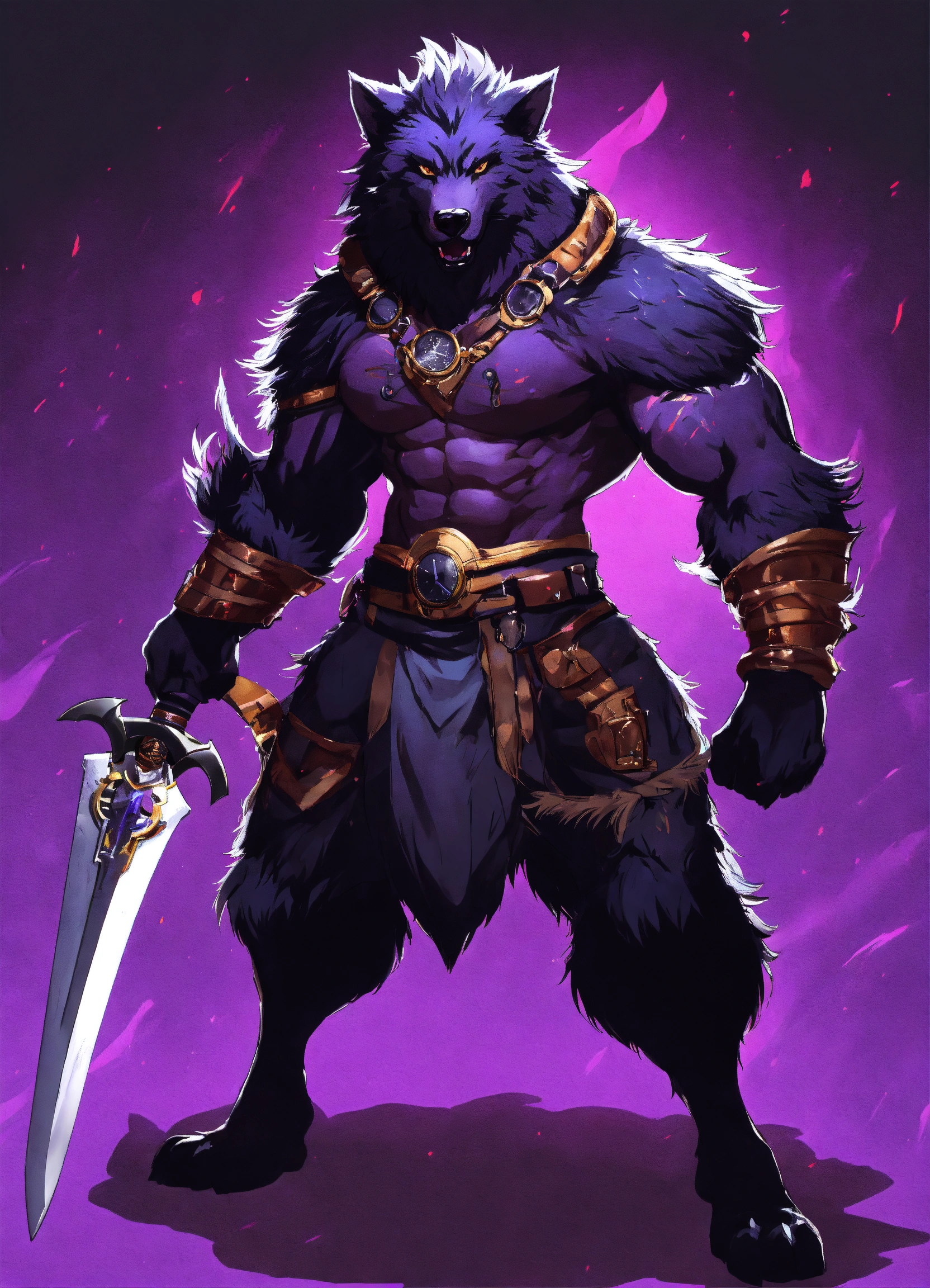 African werewolf anime character, muscular physique, which is styled in a wild black fur and untamed manner, he wears a black and purple clock, anime style, male, werewolf form, werewolf transformation fur in heavy armor with sword in each hand, dual swords