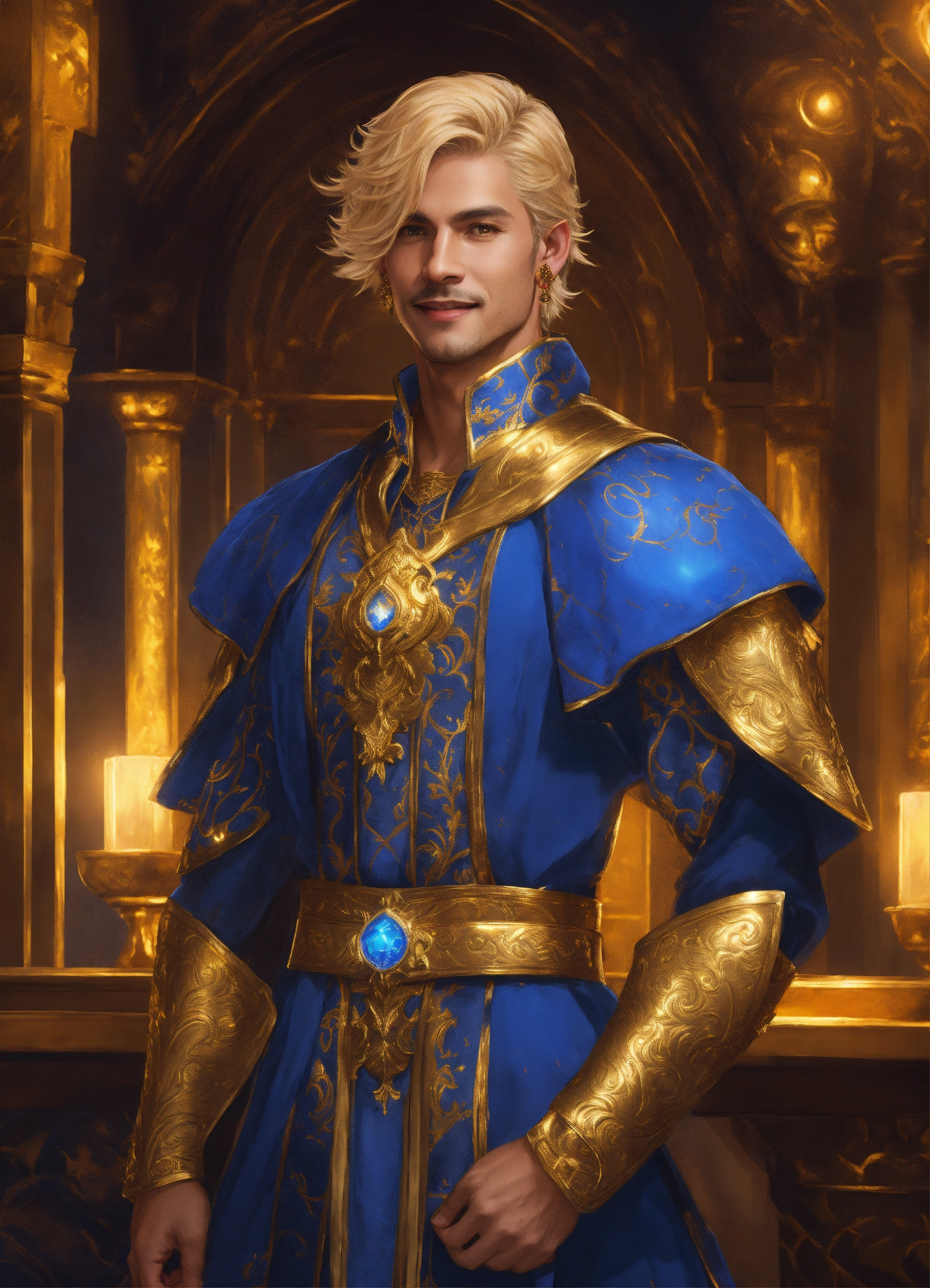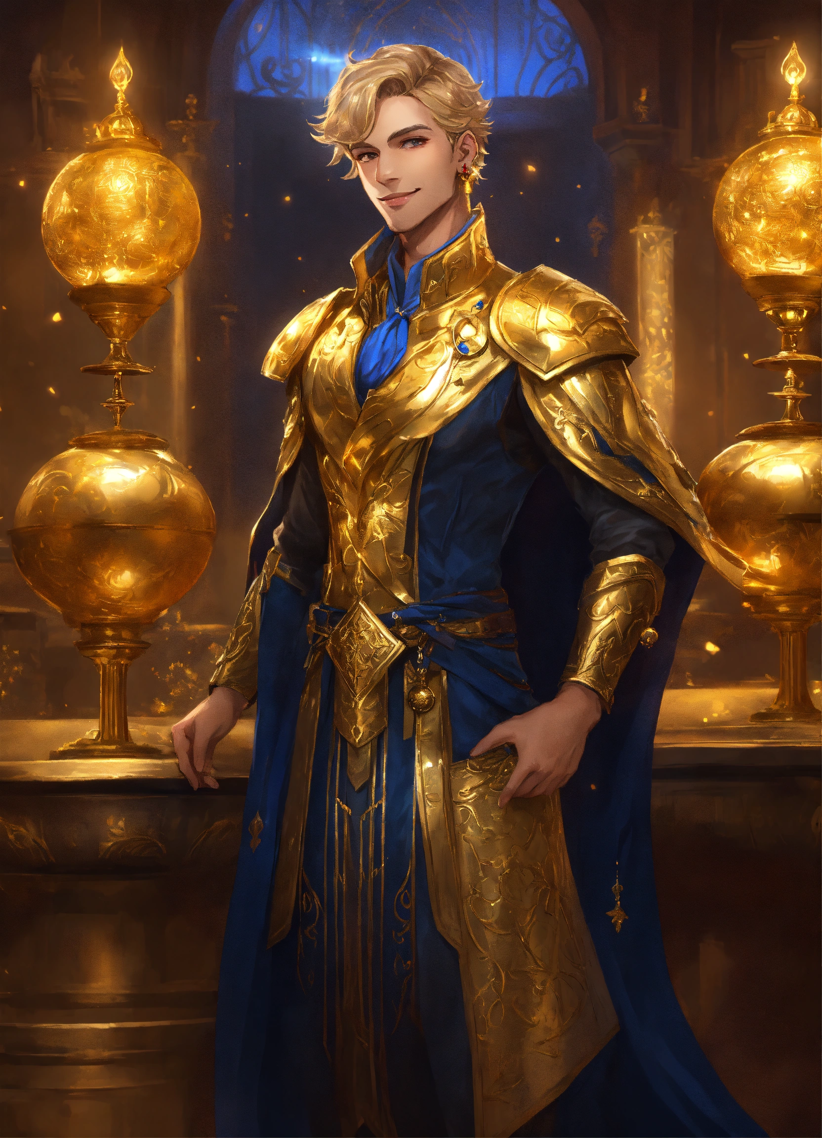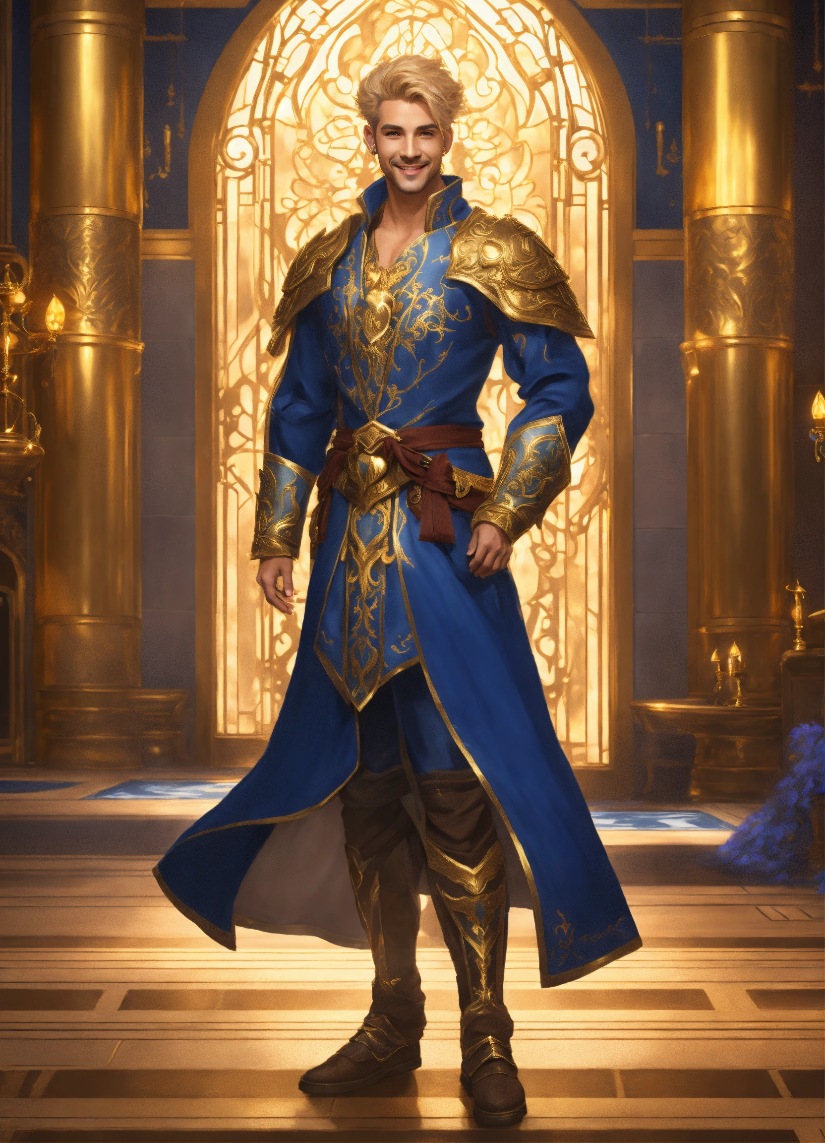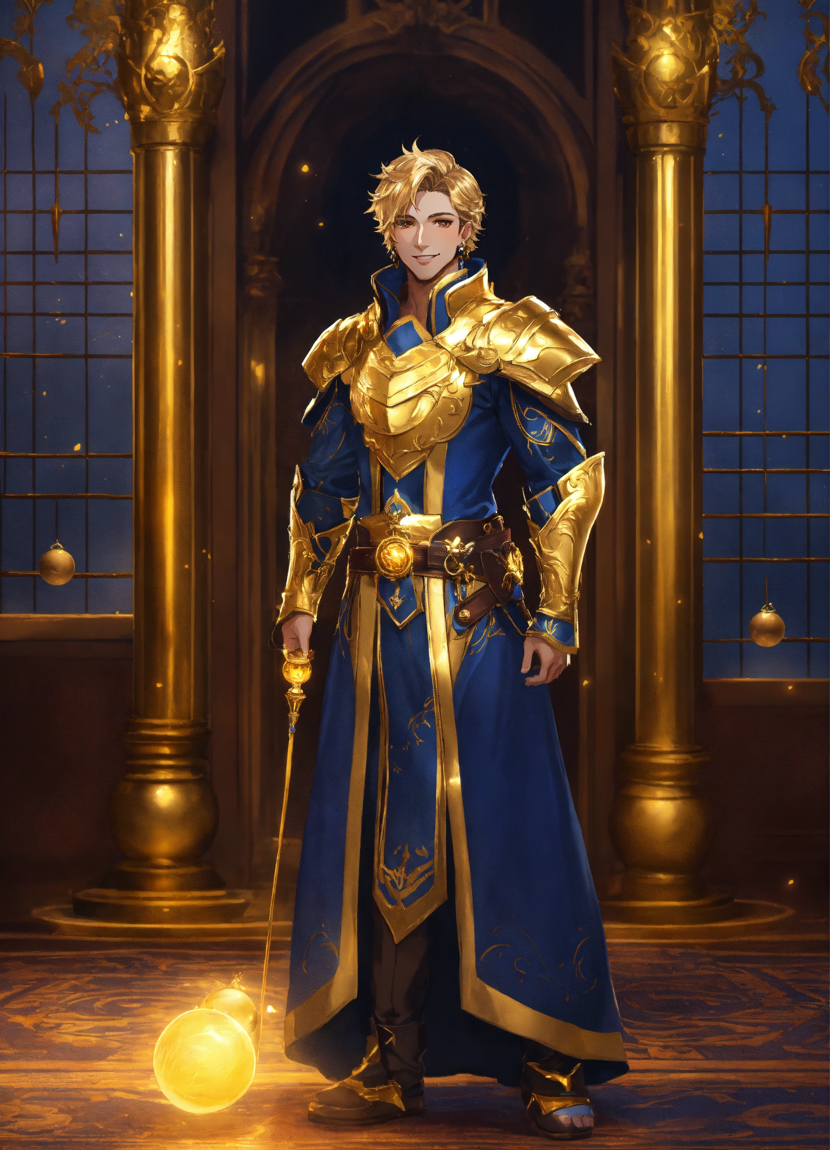 Male aisimar full body portrait, pathfinder style, class oracle. athetic body, sassy feminine look, sassy smile, short golden hair. gold earings, main colors gold and dark blue, fancy armored robe, casting golden magic orbs mansion interior background