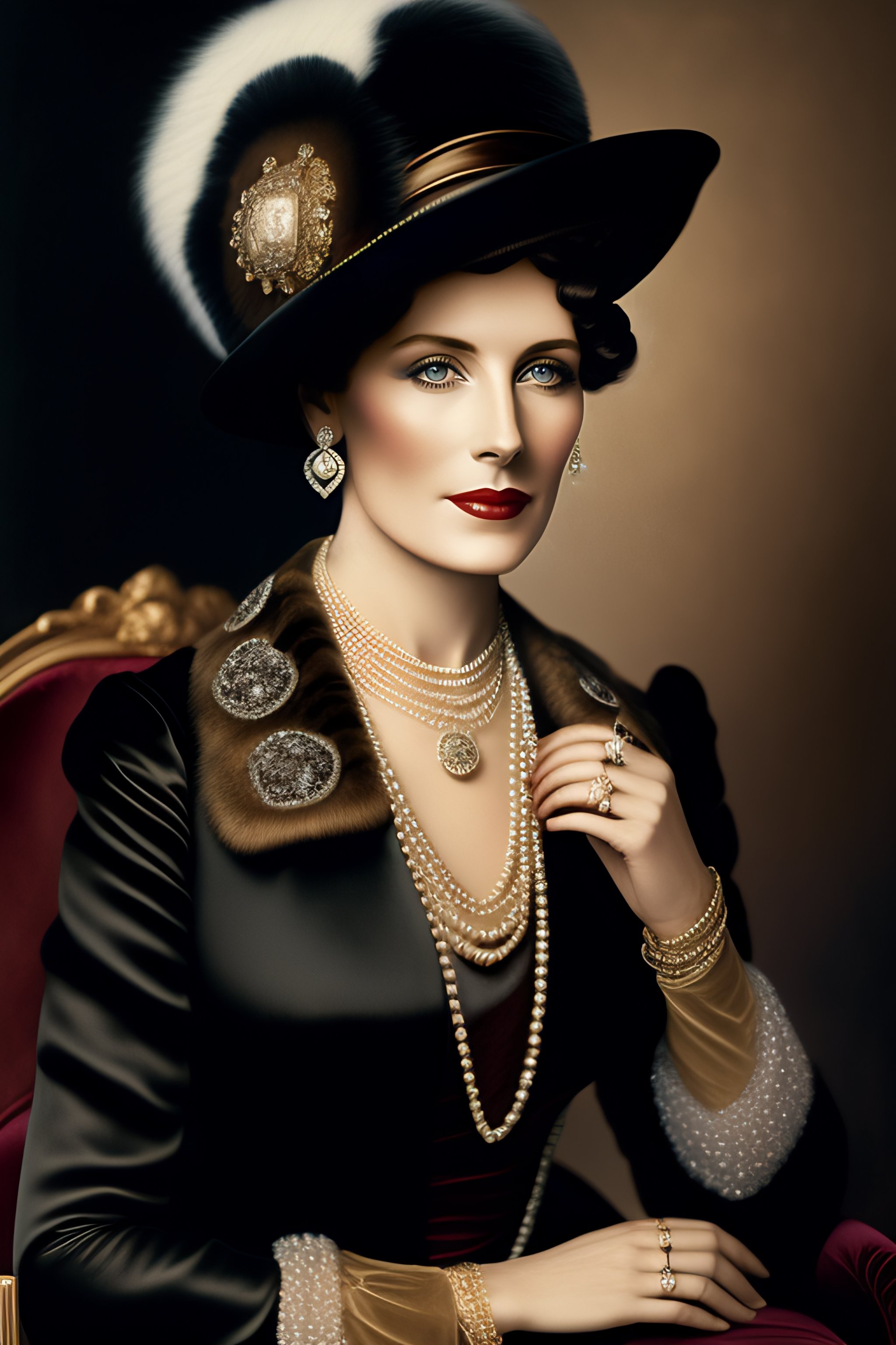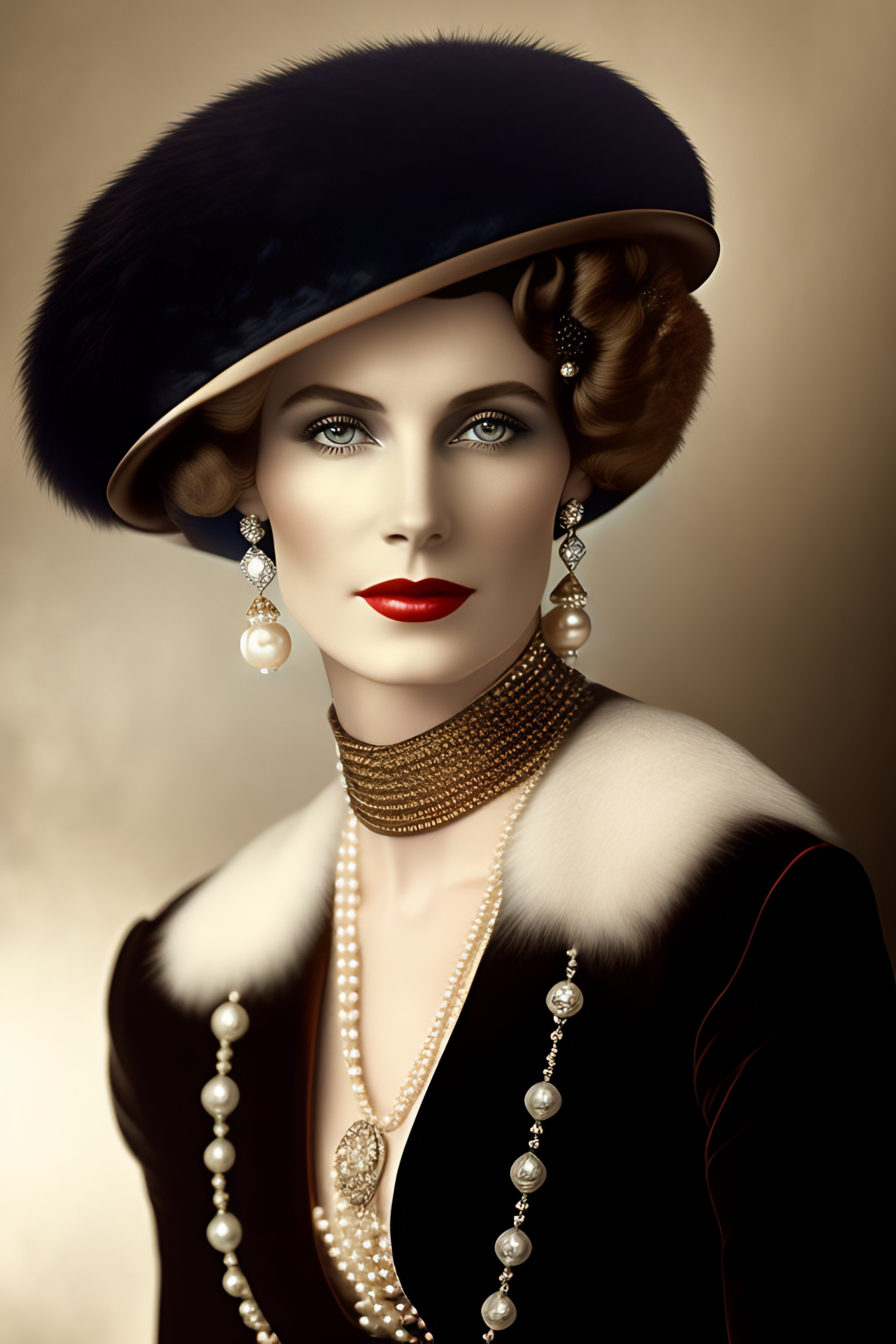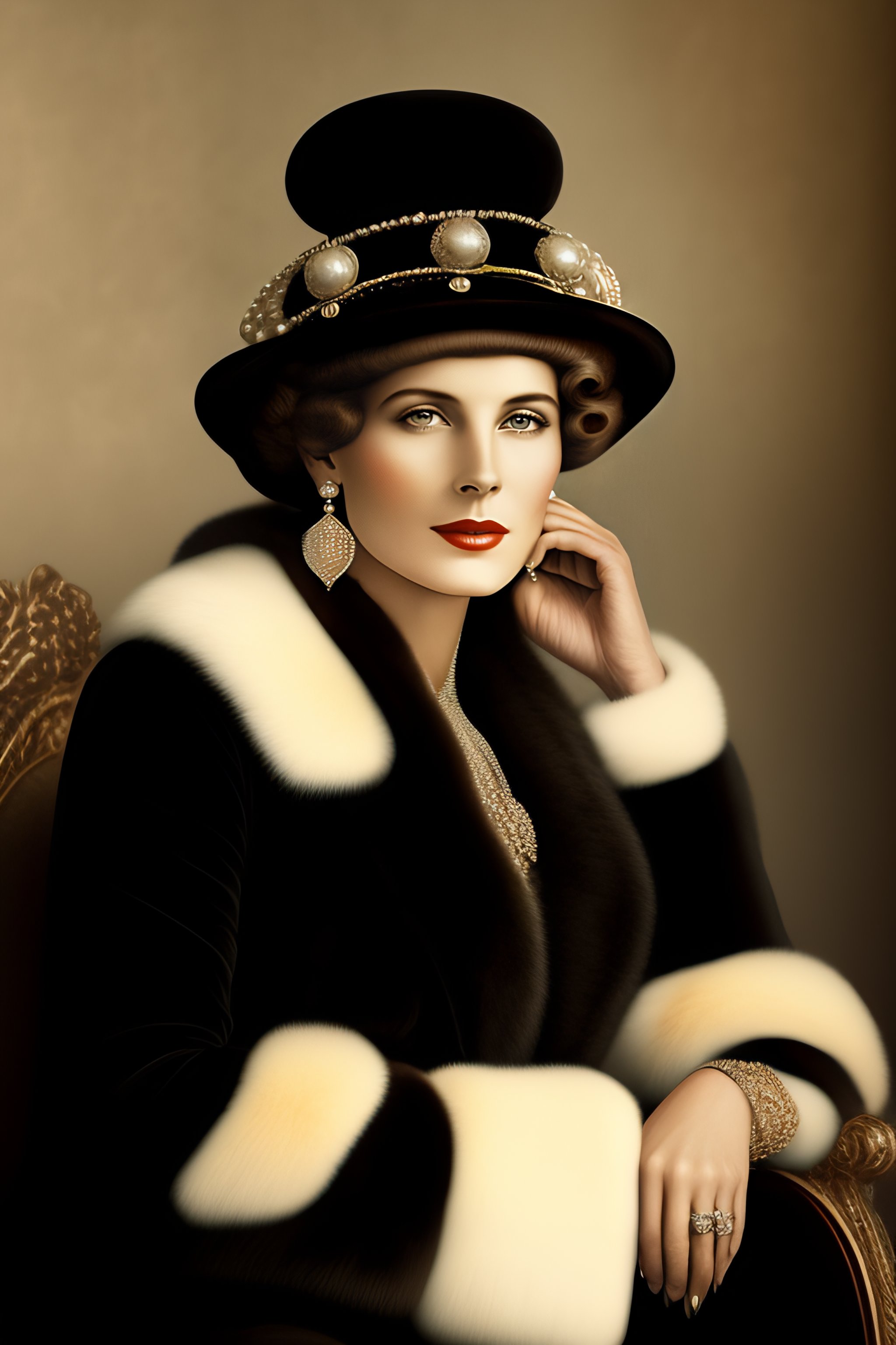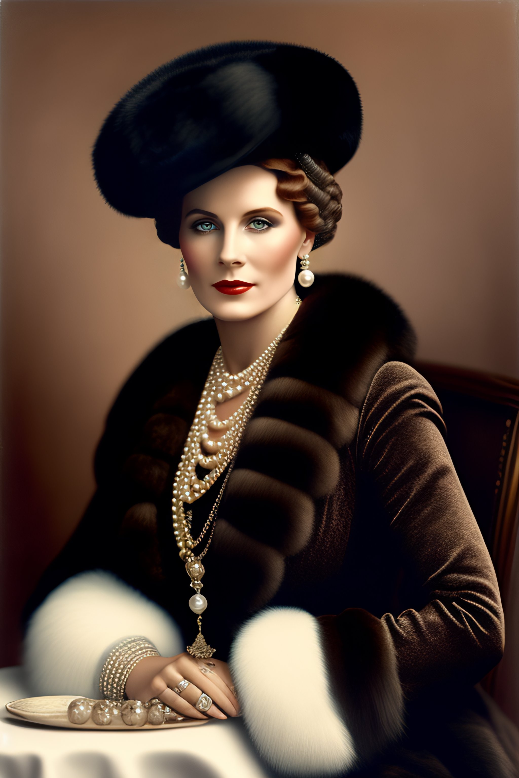1910s woman in black fur hat with and diamond earrings and pearls and fur coat sitting down colorized