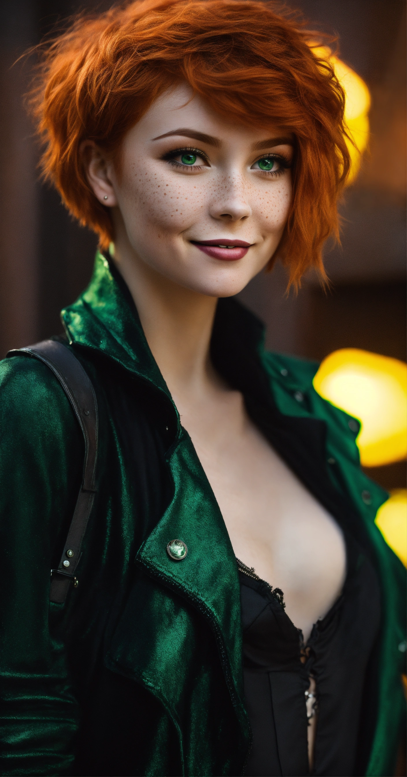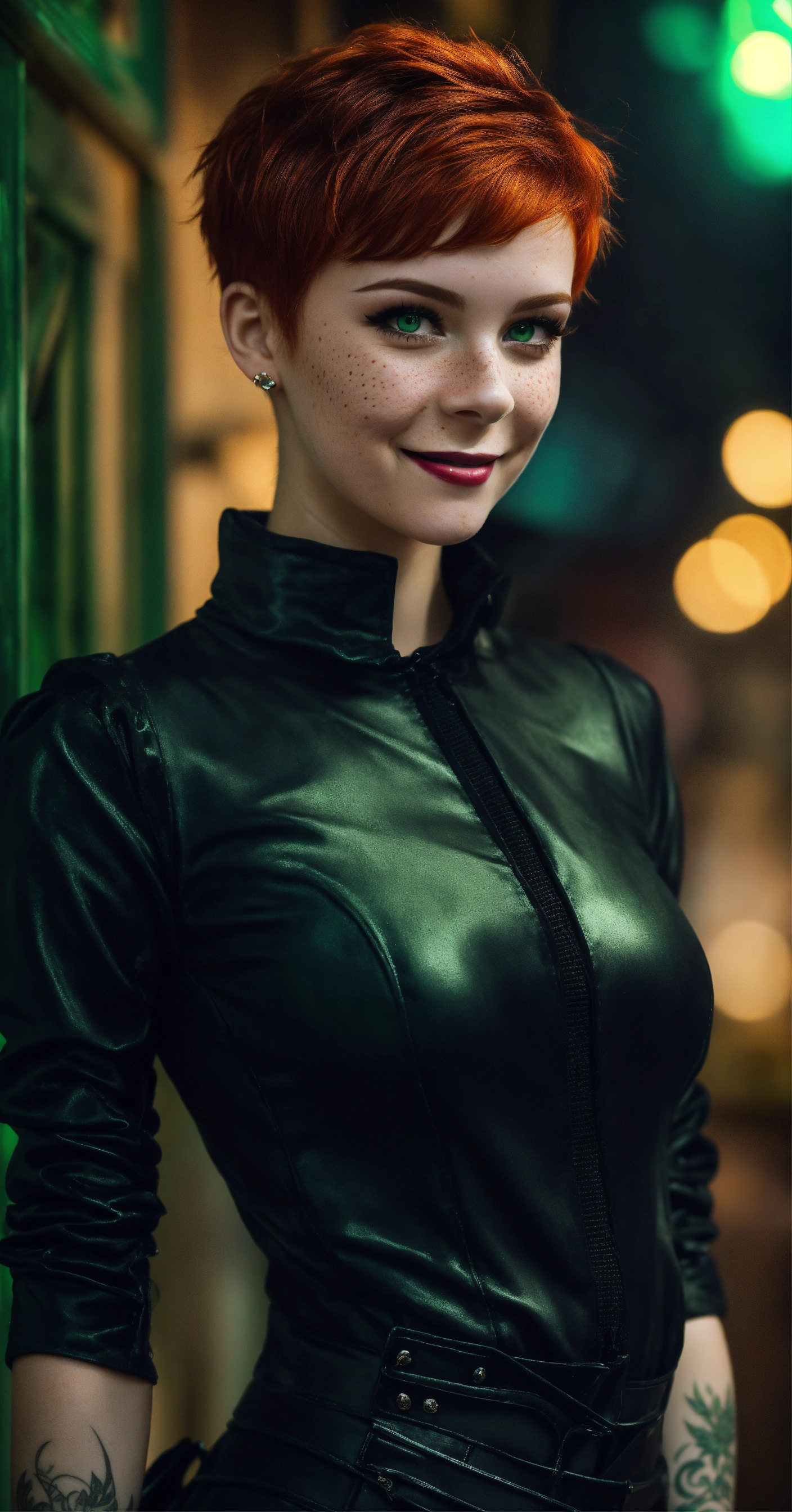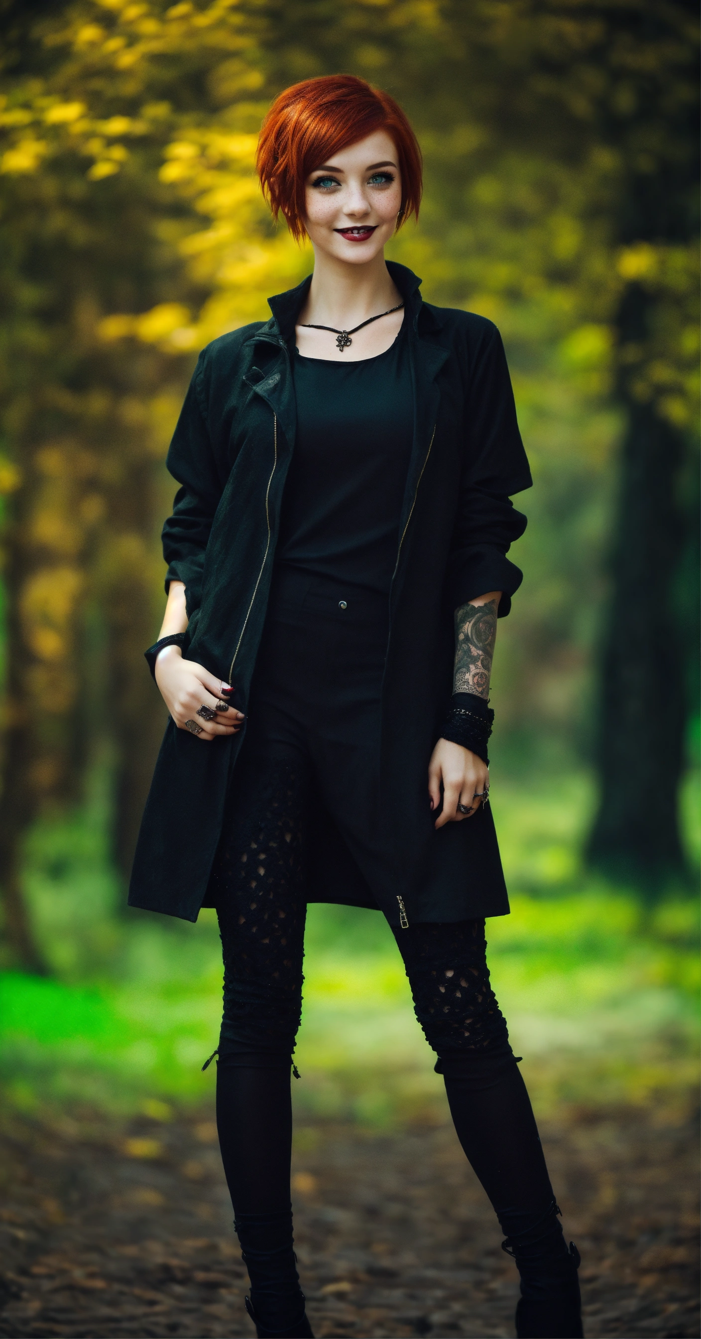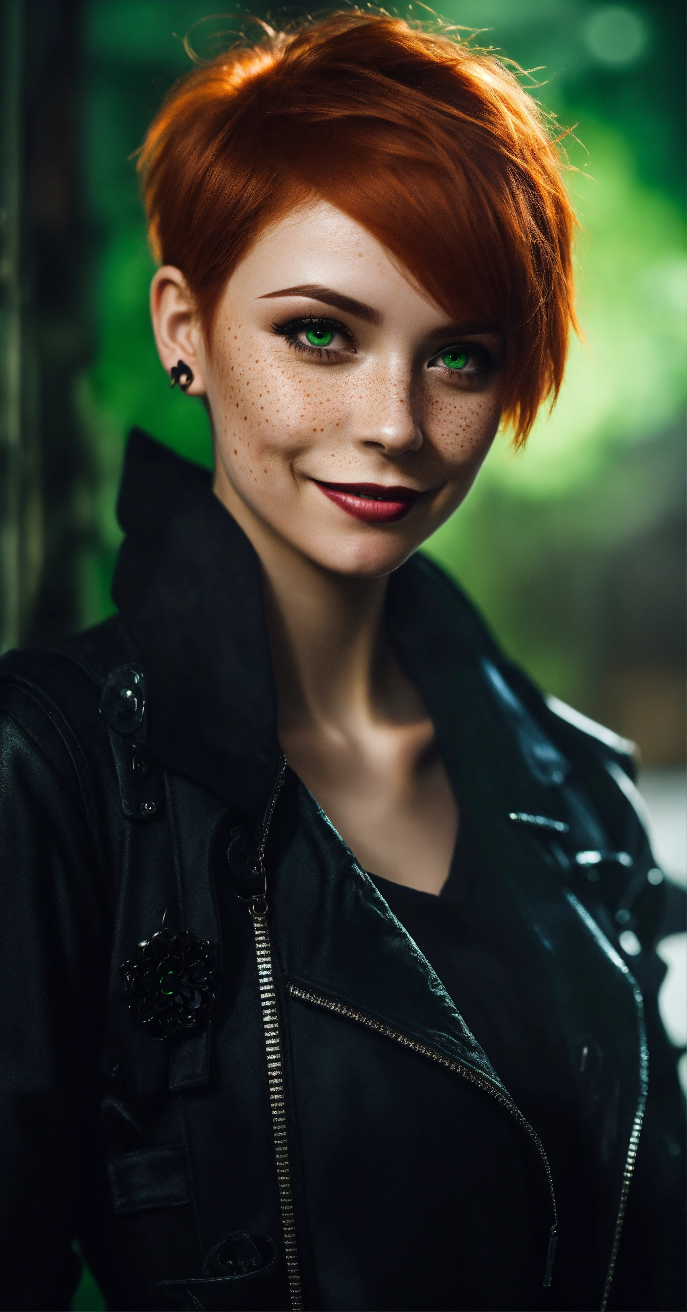 Render beautiful ginger young woman in dark goth outfit with modern pixie short style hair, green eyes, freckles, smiling and look at the camera, full body, dark goth scene