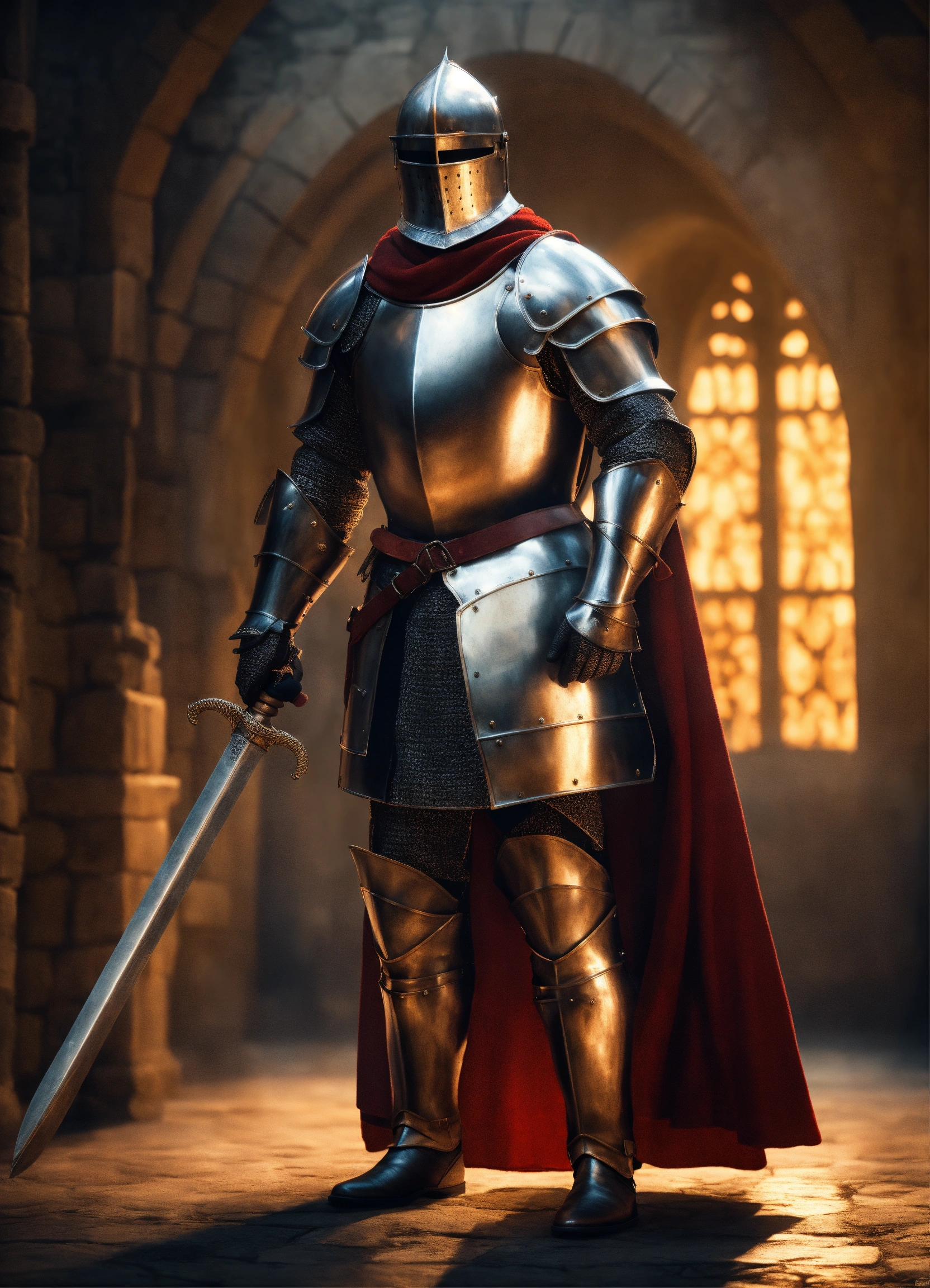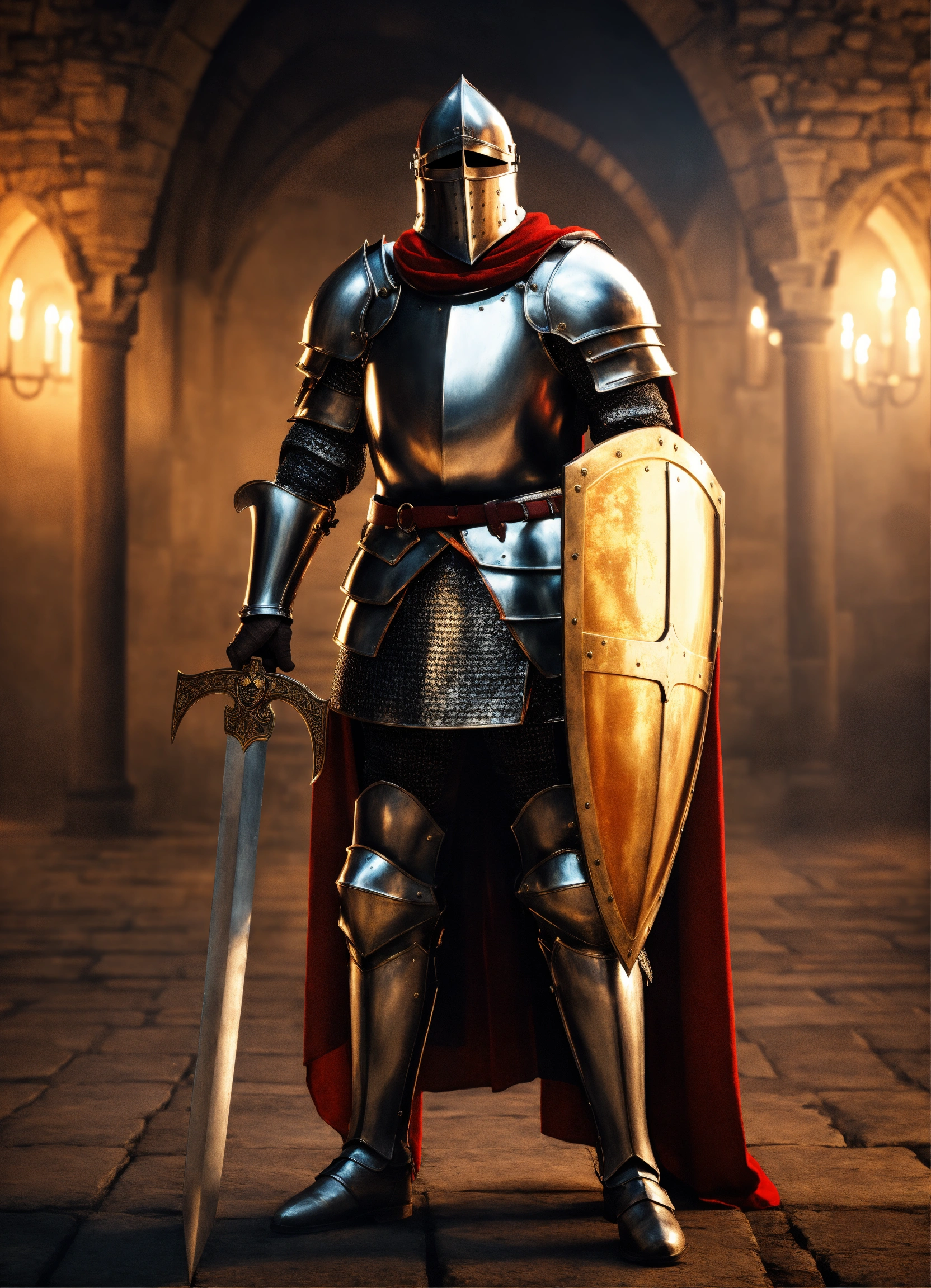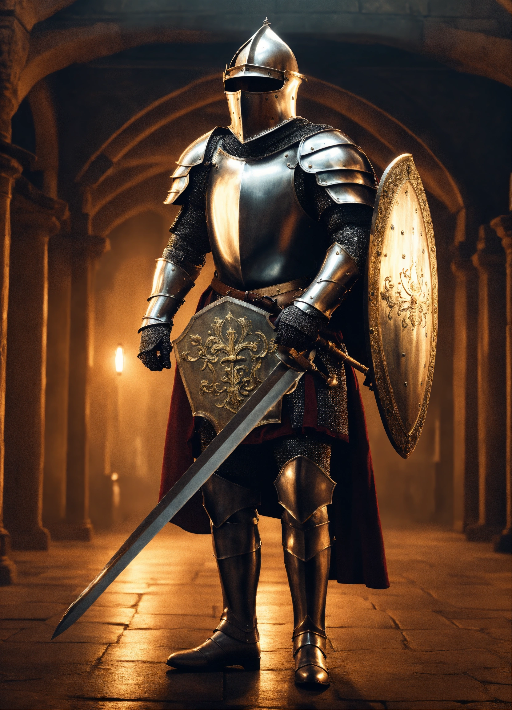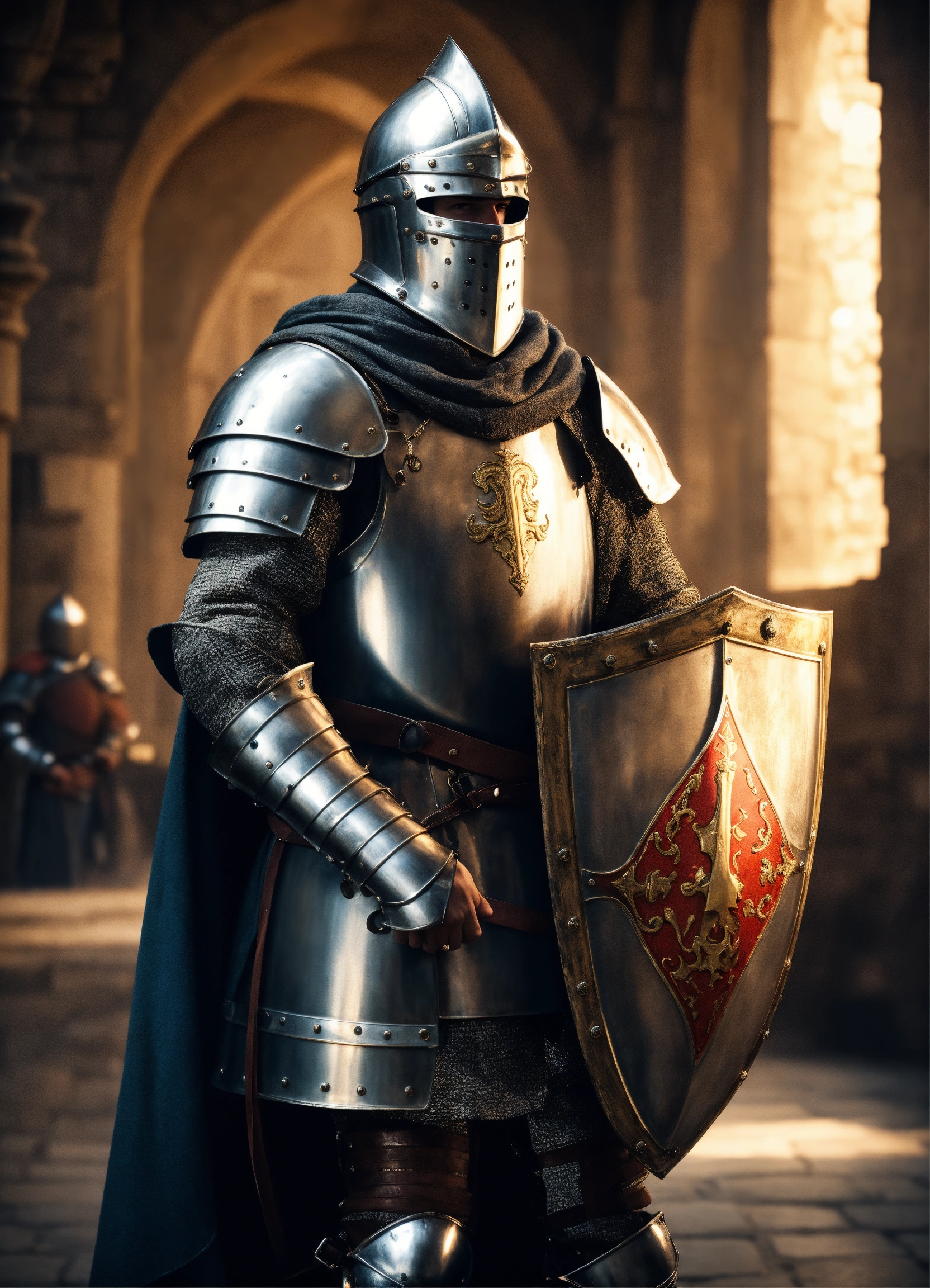 A realistic full body portrait of a medieval knight with shield, neutral background, moody, photorealistic, cinematic scene, super detailed, hyper realistic, bright lights, 8 k