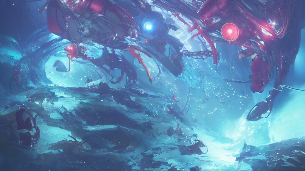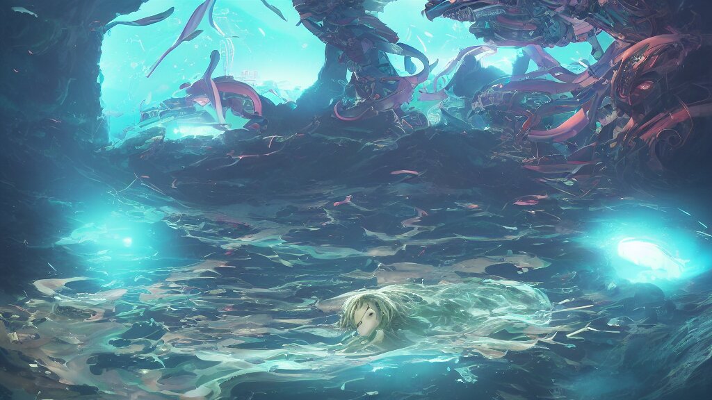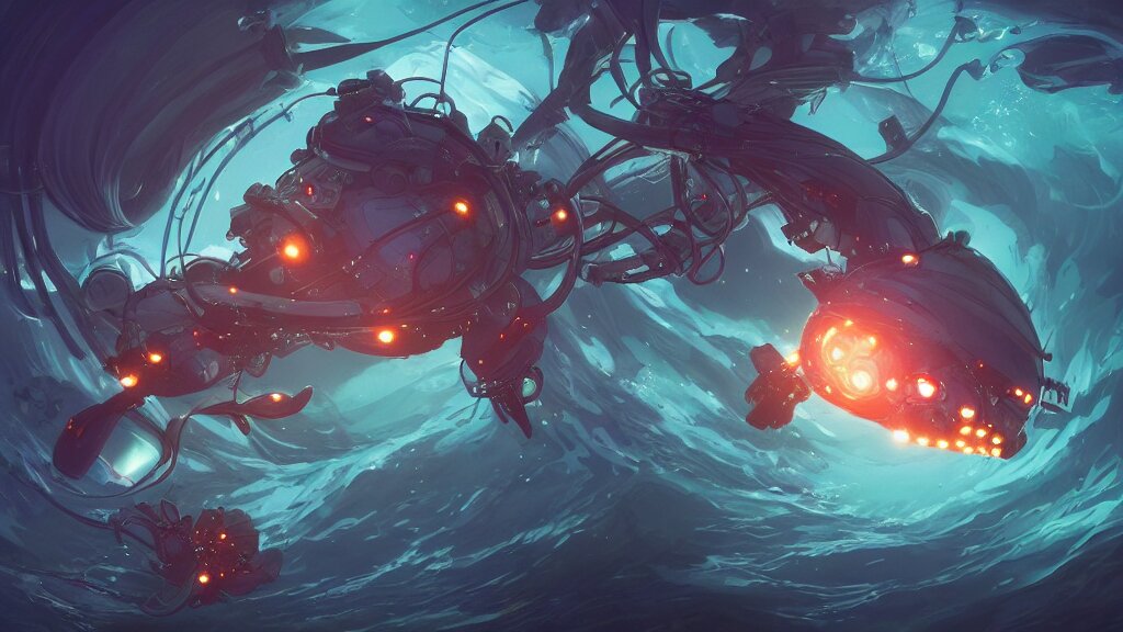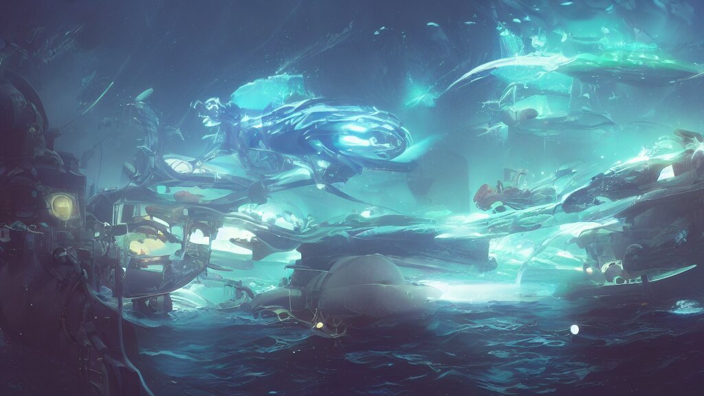 I watch with joy the marvellous bioluminescent creature that live in the depth from the sea from the bay of a futuristic submarine, dramatic lighting, dynamic lighting, cinematic lighting, by makoto makoto, krenz cushart and artgerm, anime, featured on artstation, ultrawide angle
