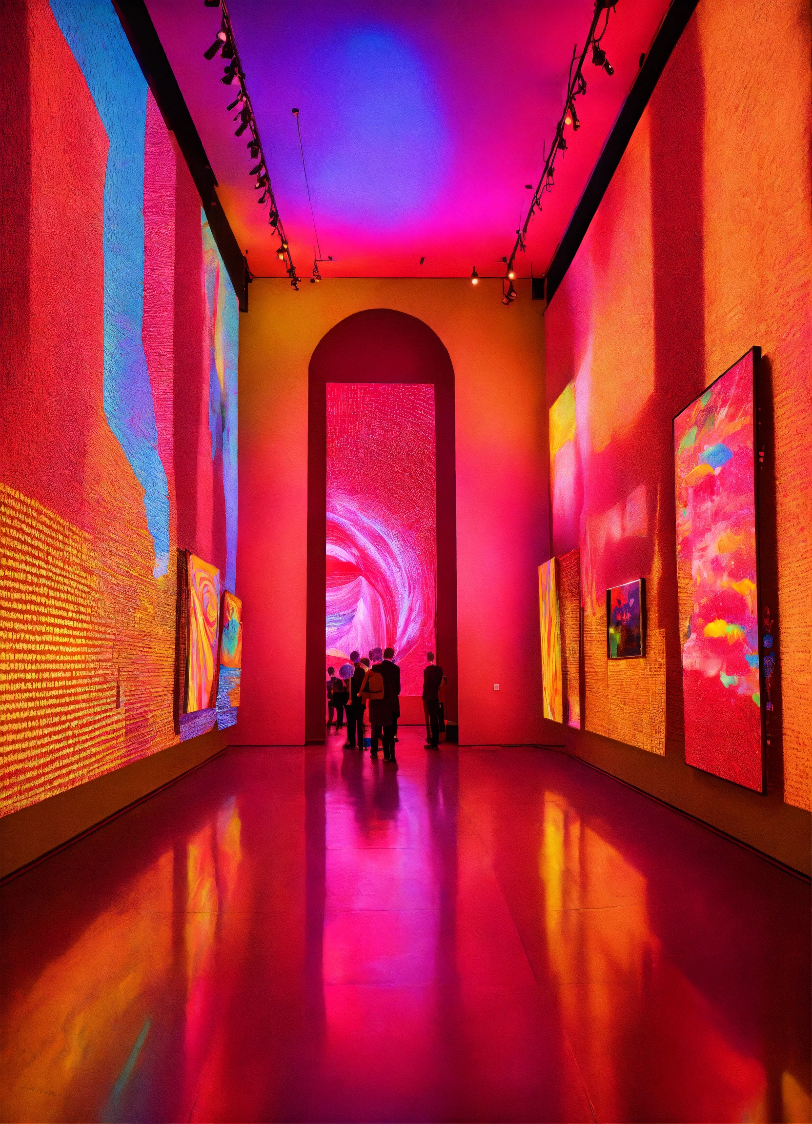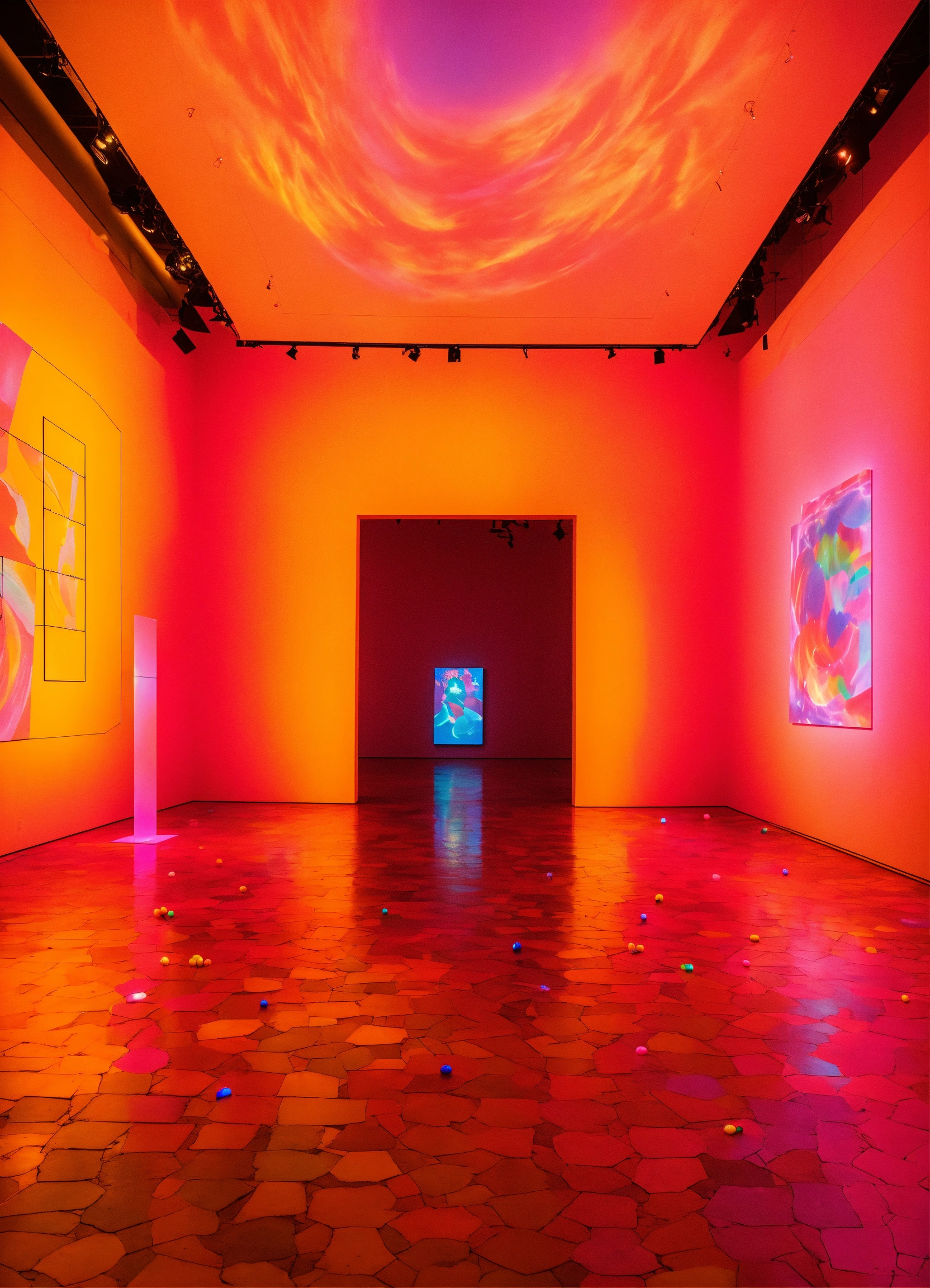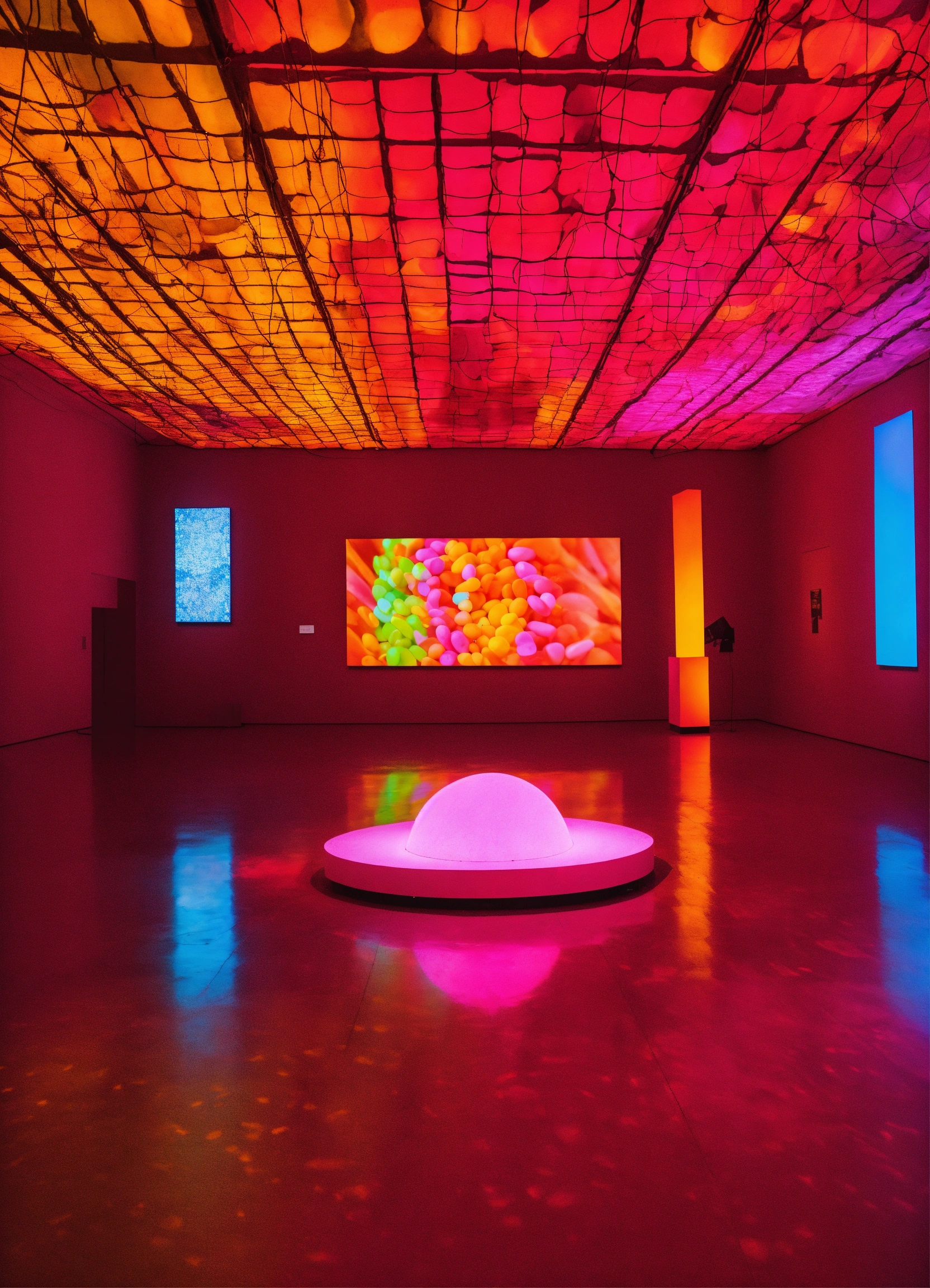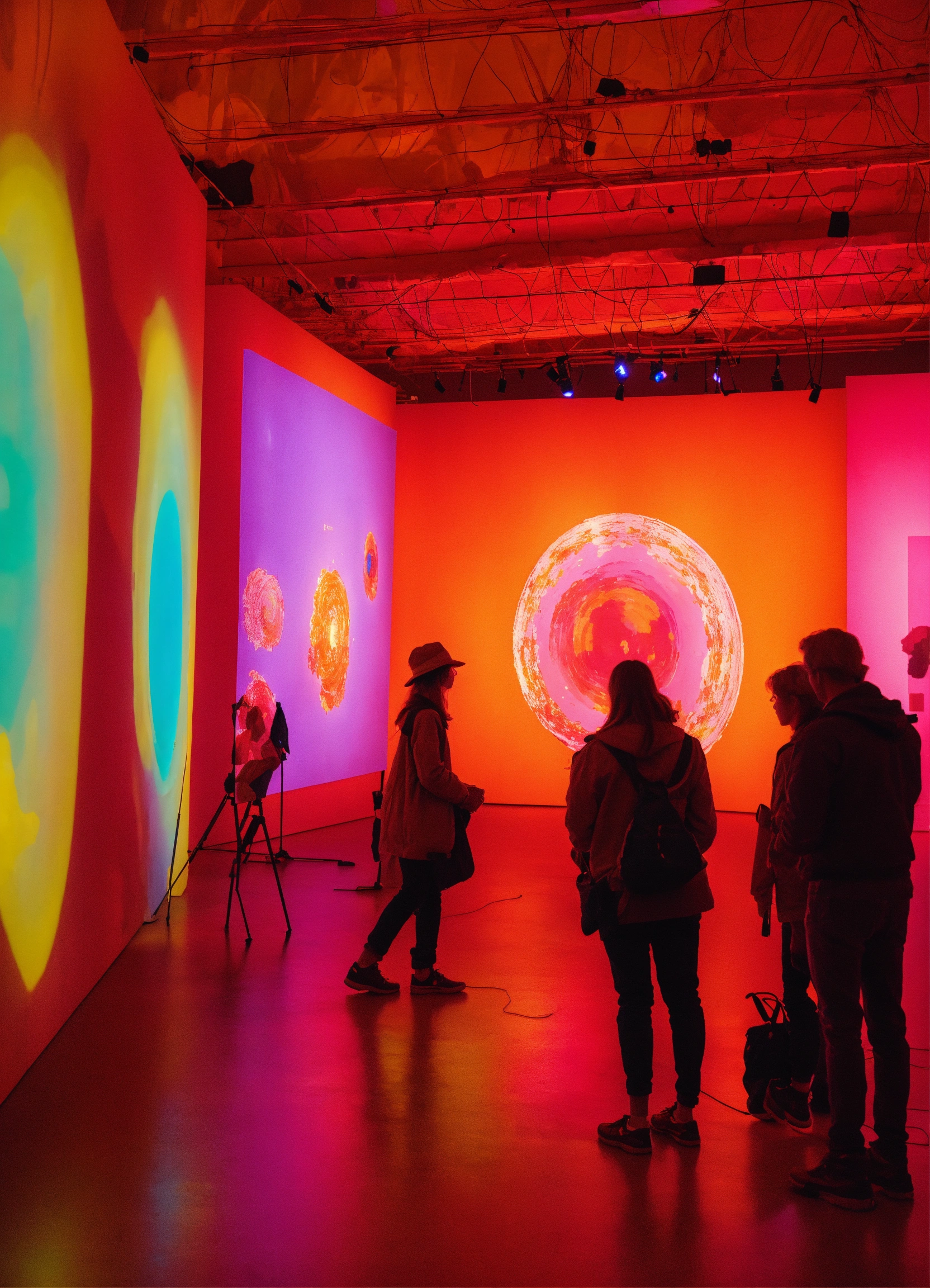 A museum art exhibition with projections and candy color lights