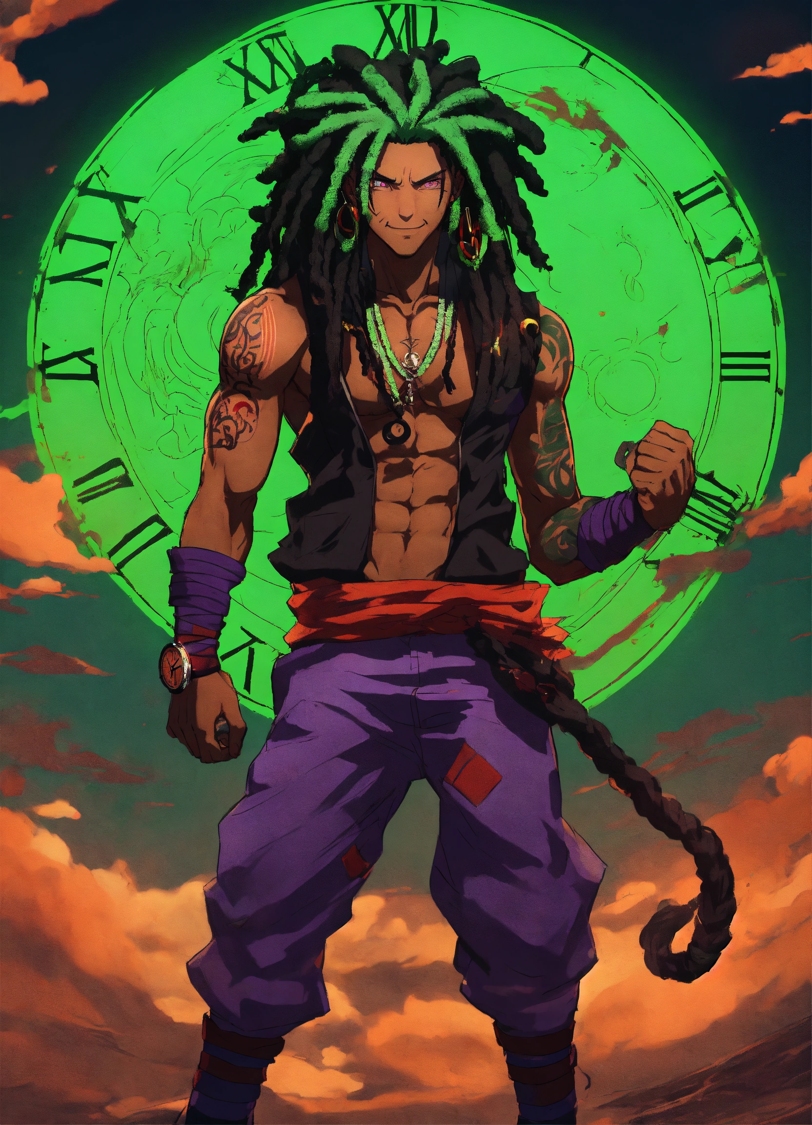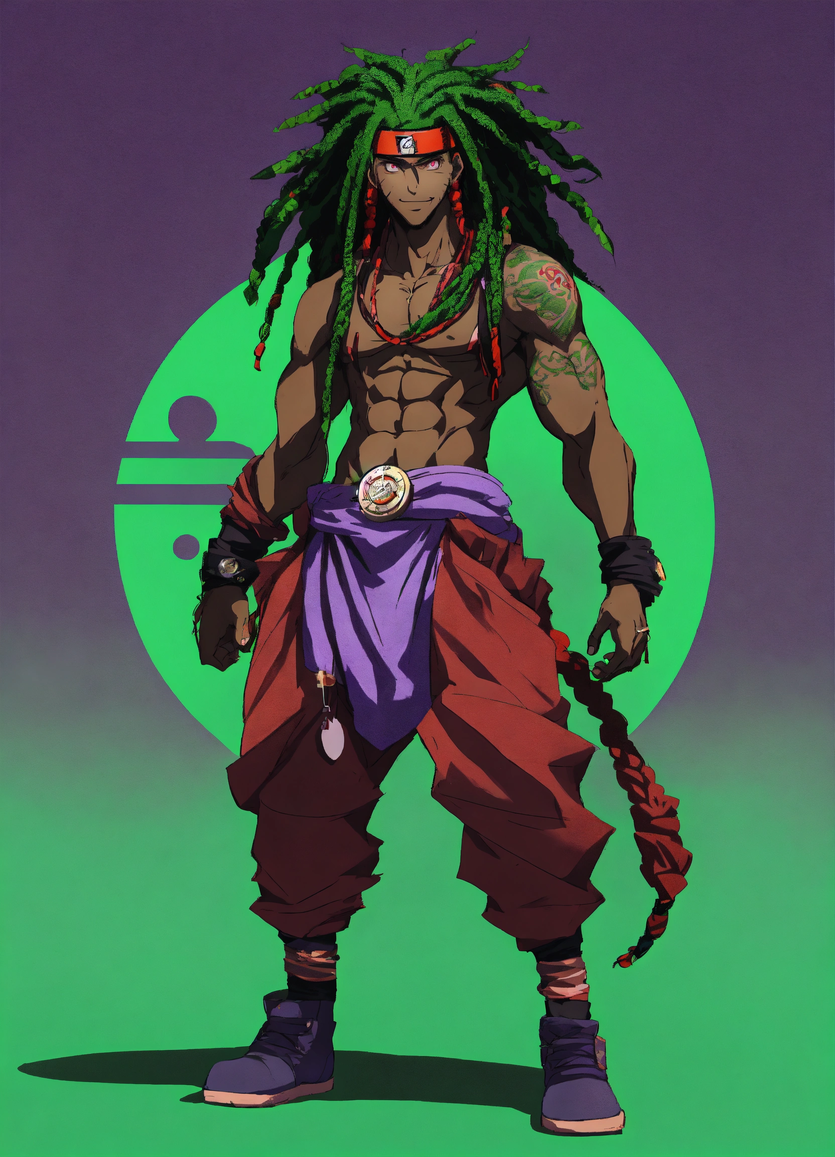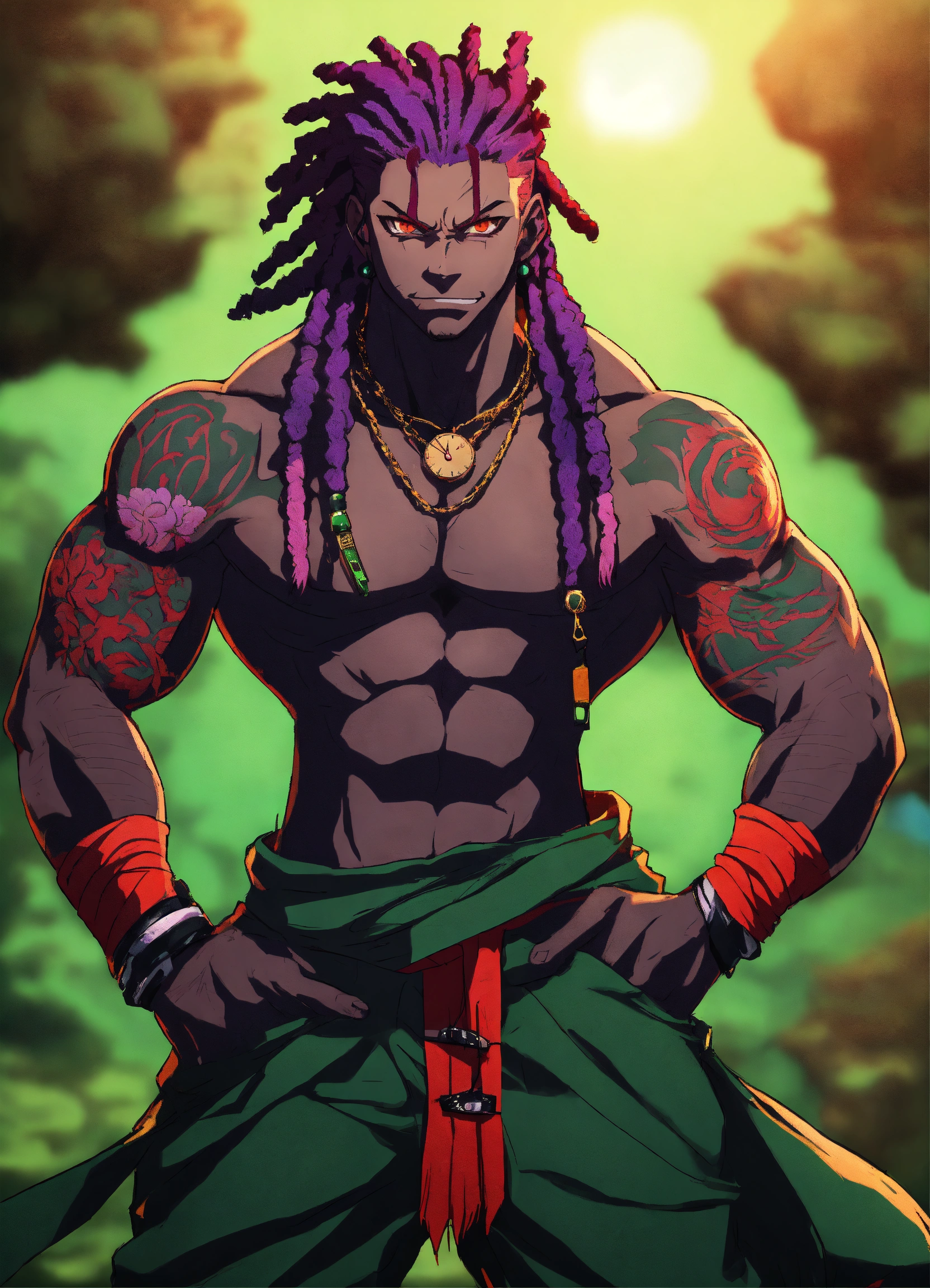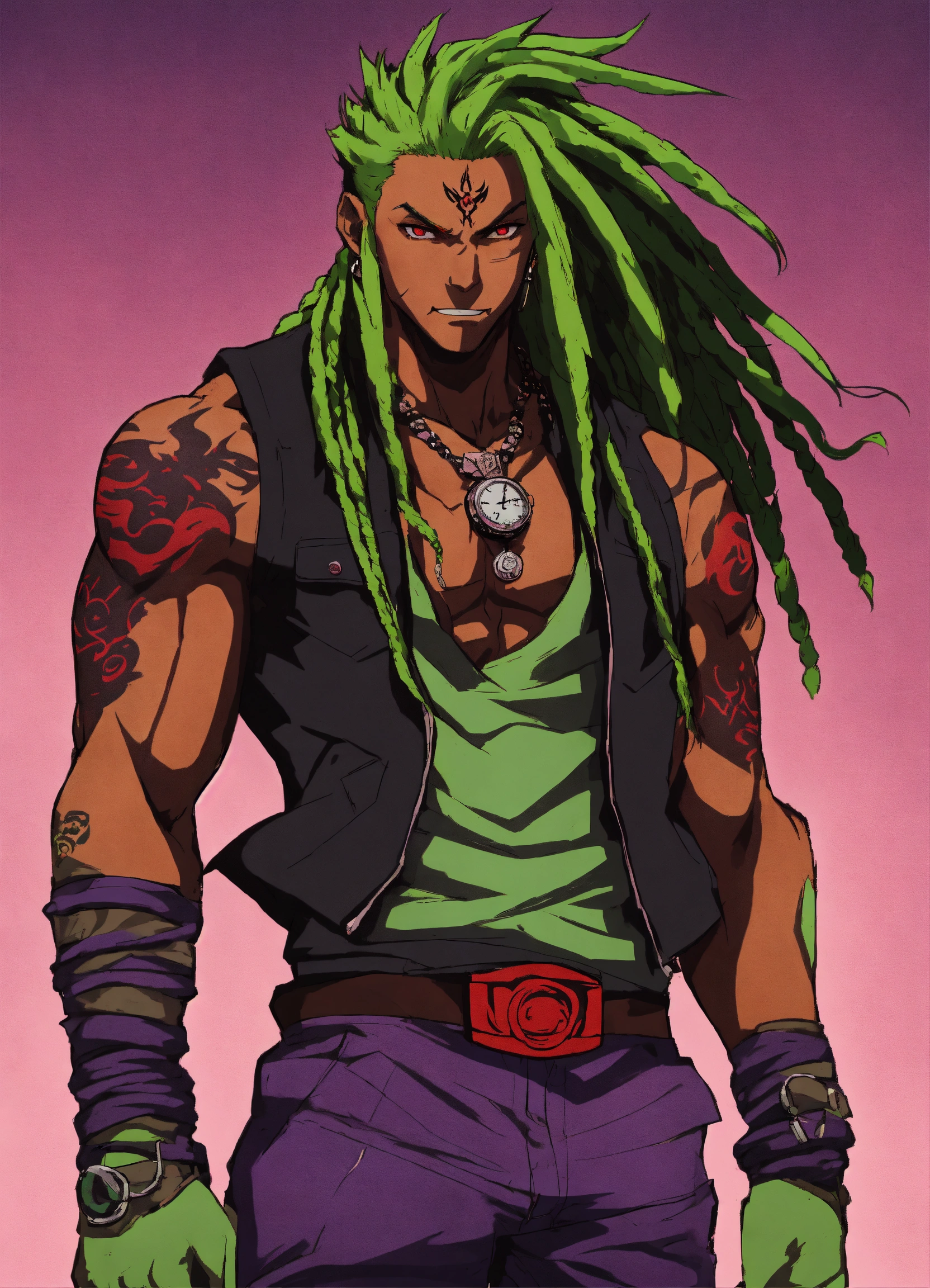 African naruto anime styled character, muscular physique, long green hair, which is styled in a wild dreads and untamed manner, red demon eyes, he wears a black and purple clock, anime style, male, has a smirk on his face, has tattoos, full body view.