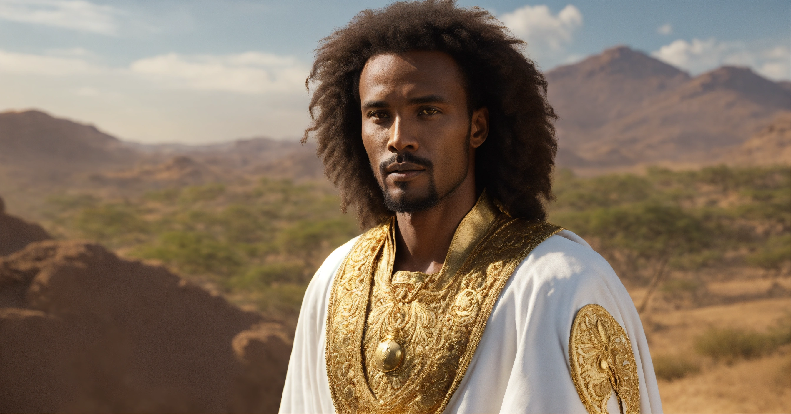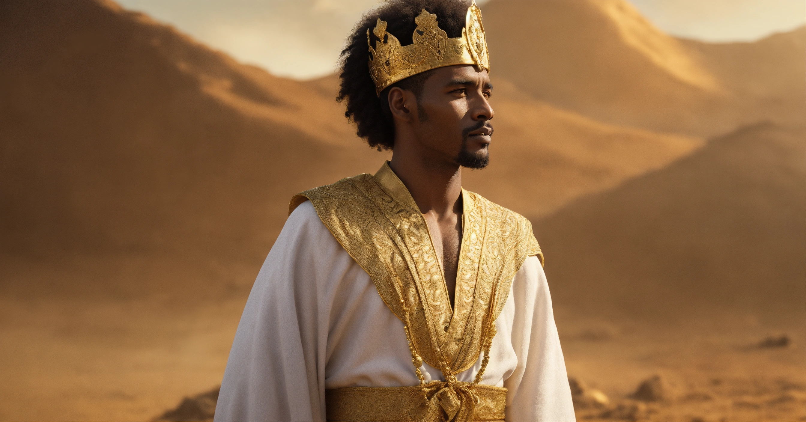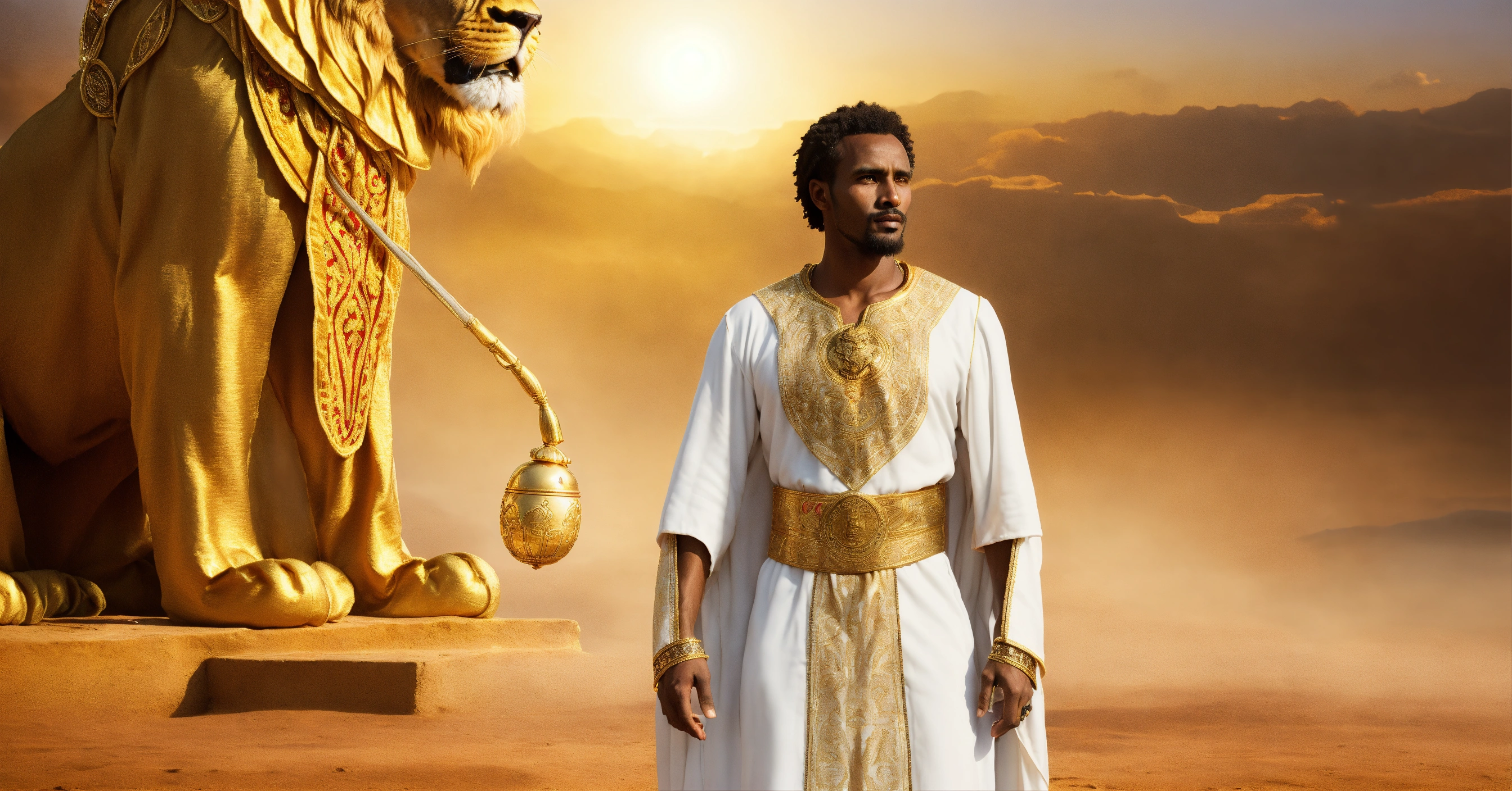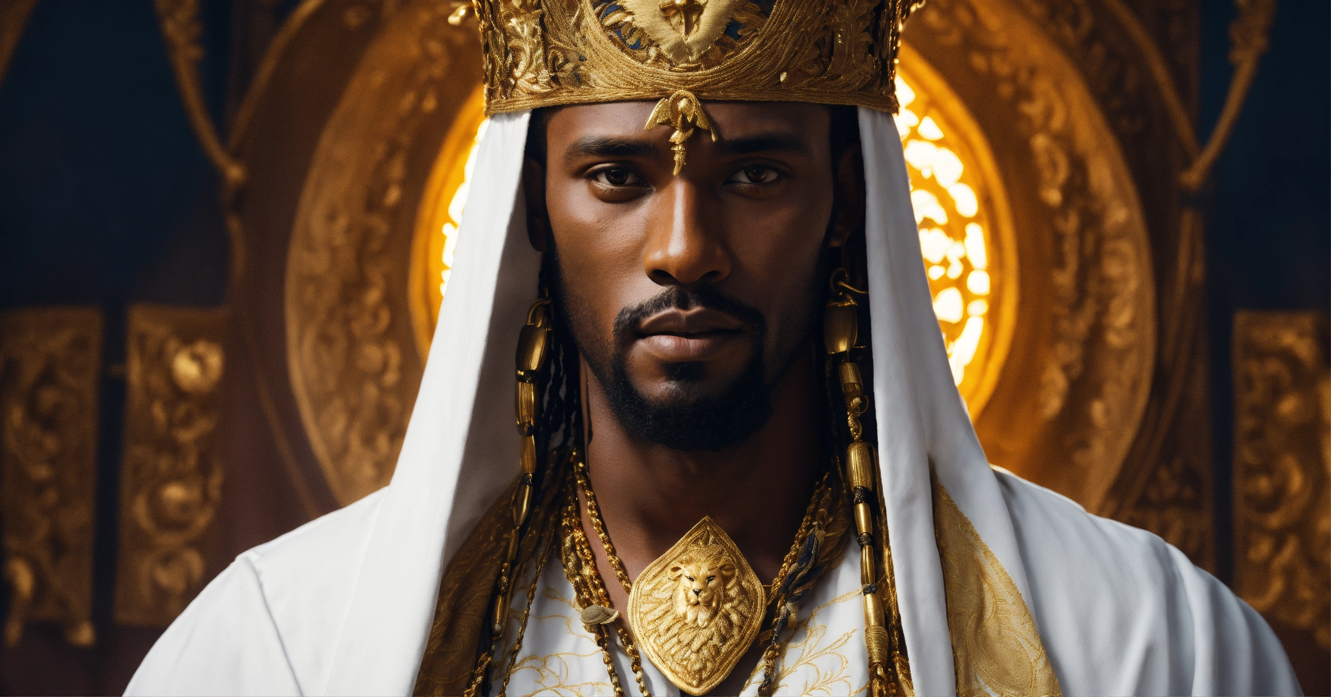 Illustrate a view of a handsome, strong, broad-shouldered ethiopian man. he is wearing a long glorious white robe with gold embroidery. he is wearing a golden breastplate with the symbol of a lion on it. he wears a golden crown. there is a look of protection and compassion on his face. head-to-toe view. fantasy. photorealistic 8k
