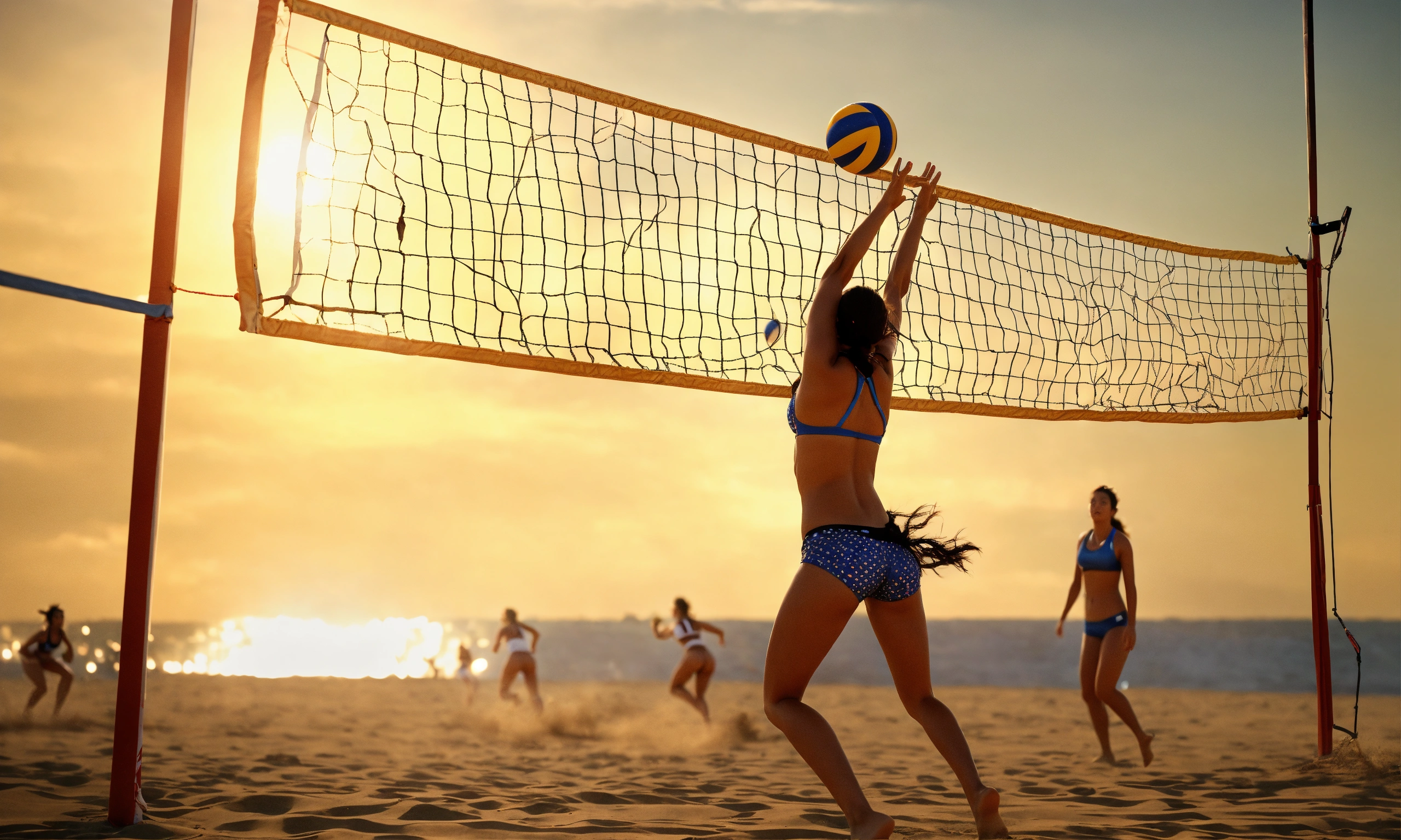 Women's beach volleyball on the sand. girl jumps and hits the ball over a volleyball net. female back bodies, girls game with a grid. team, group sport game. summertime. octane render, trending on artstation, highly detailed, lighting, professional, realistic, sharp focus, 4k, 8k, high resolution, candid, personal, –testp, bright lighting, ultra-detailed, bright lighting, photo, high quality photo, cinematic shot, volumetric light, imax