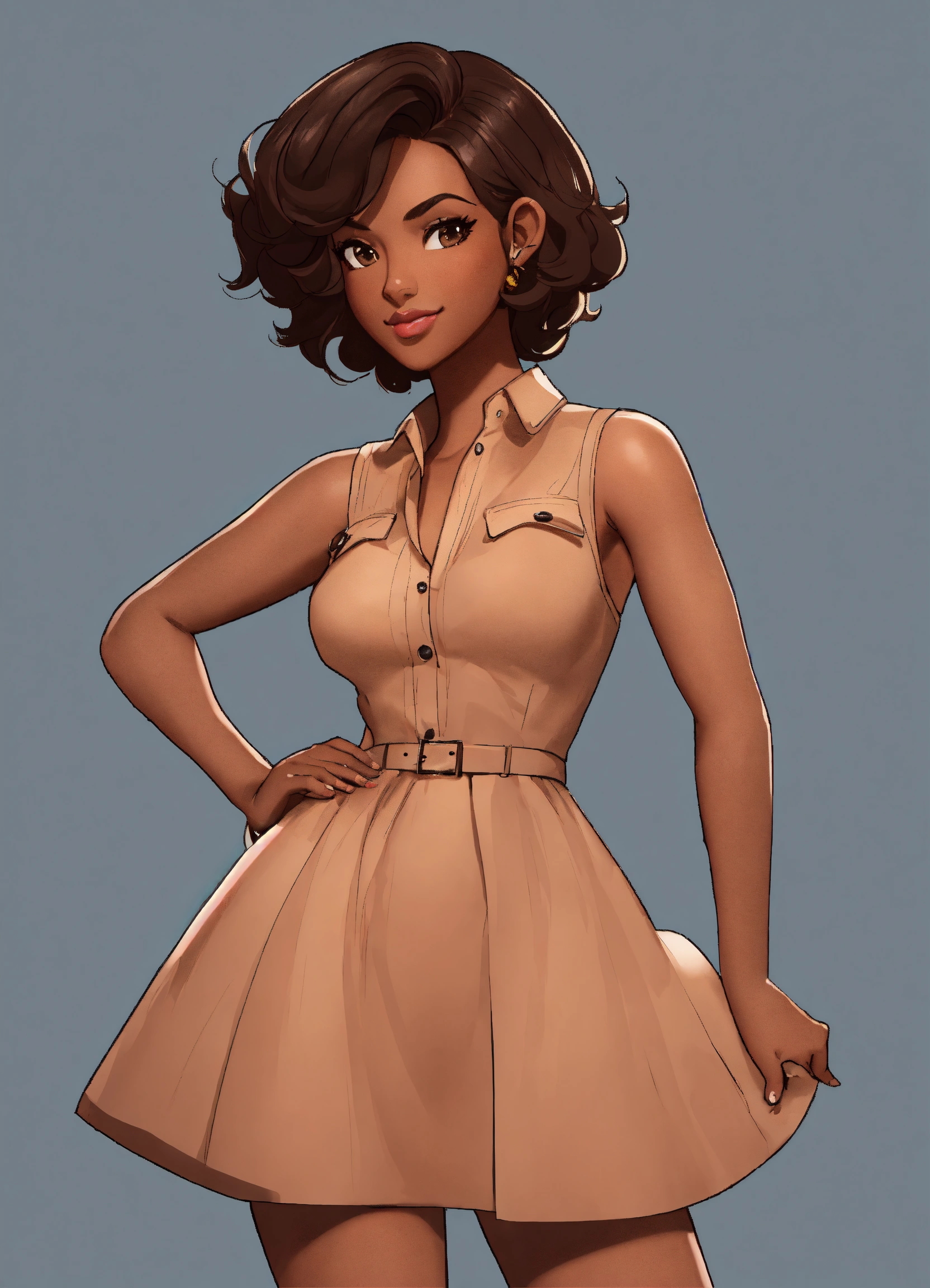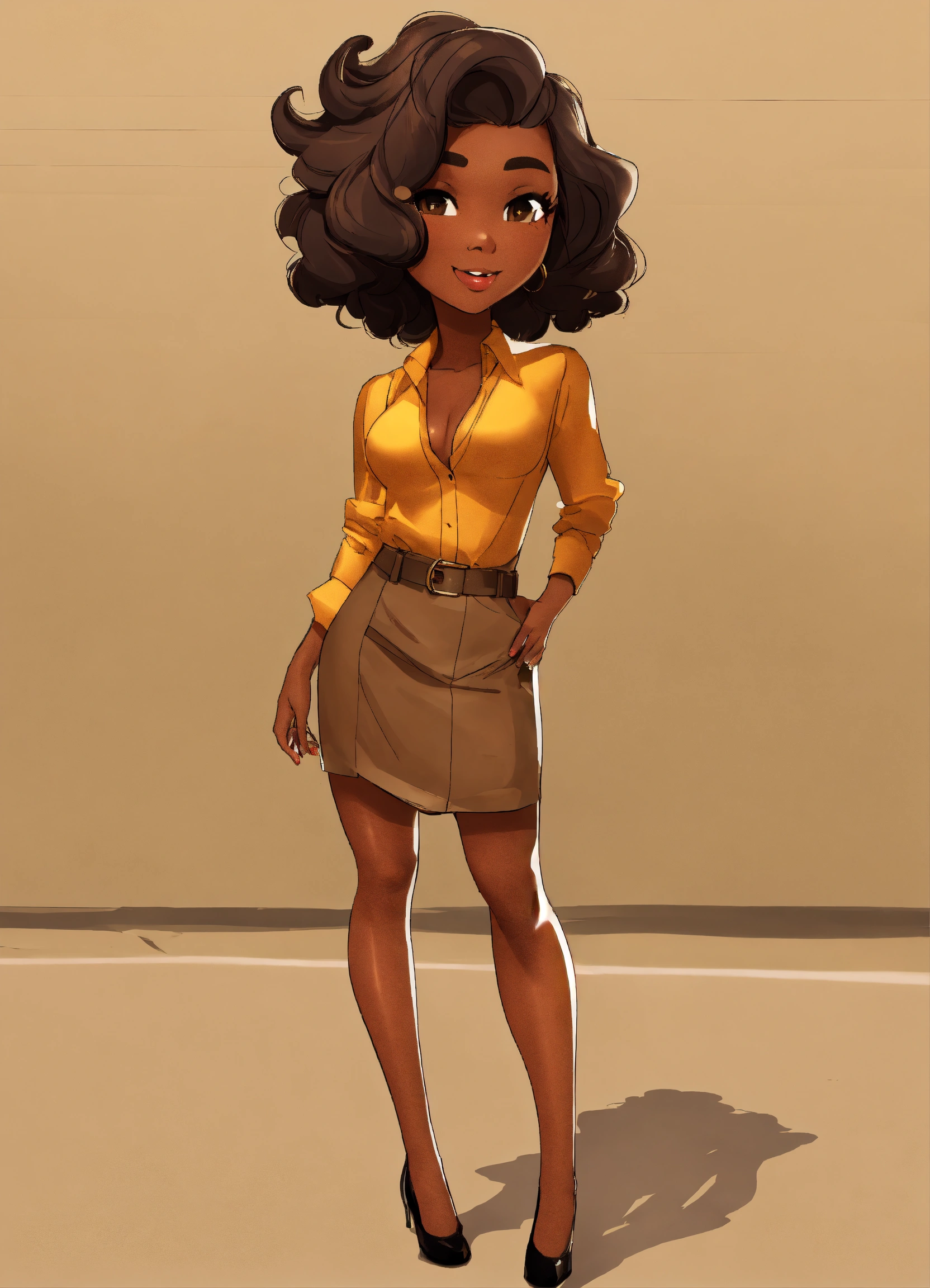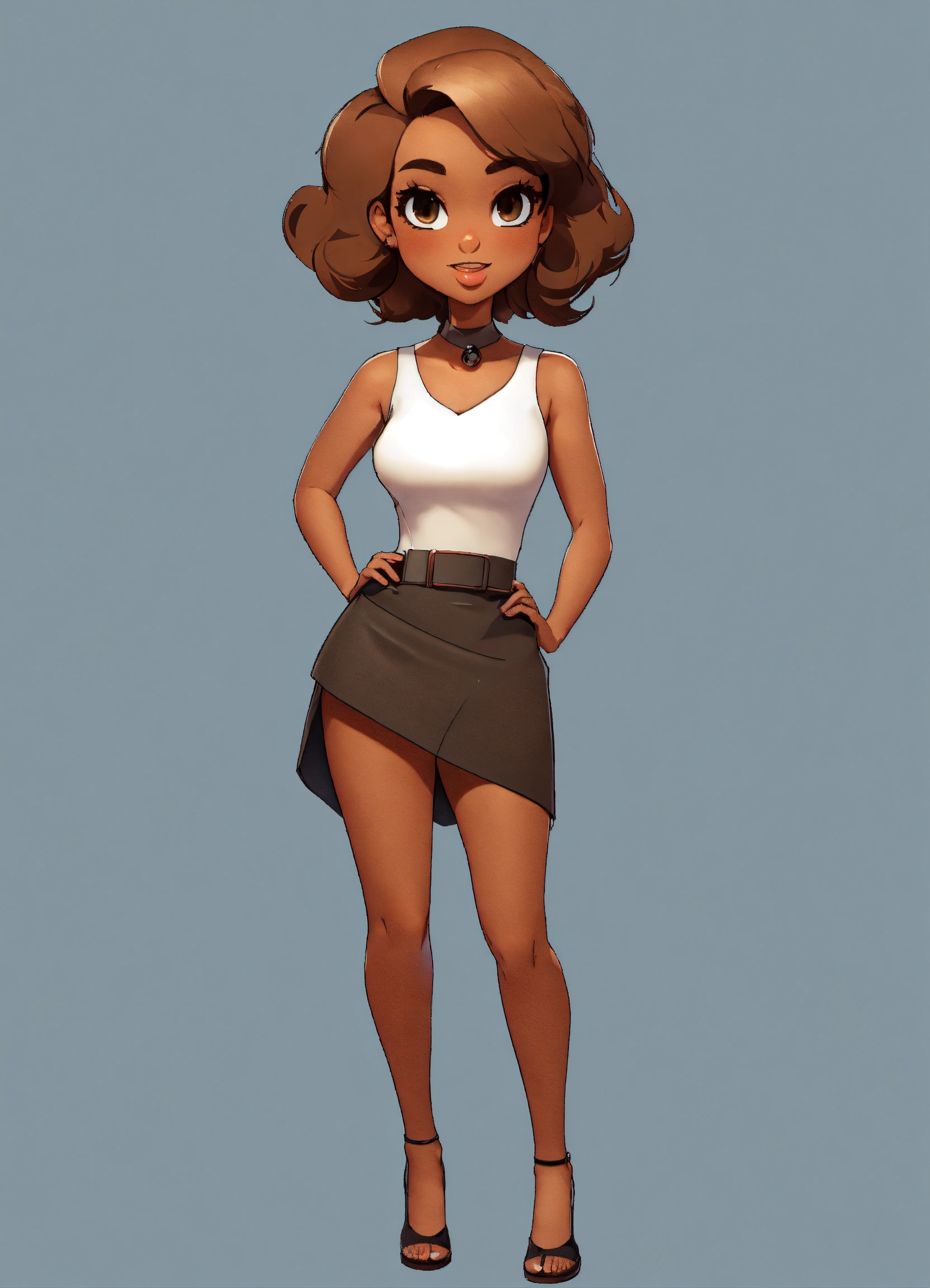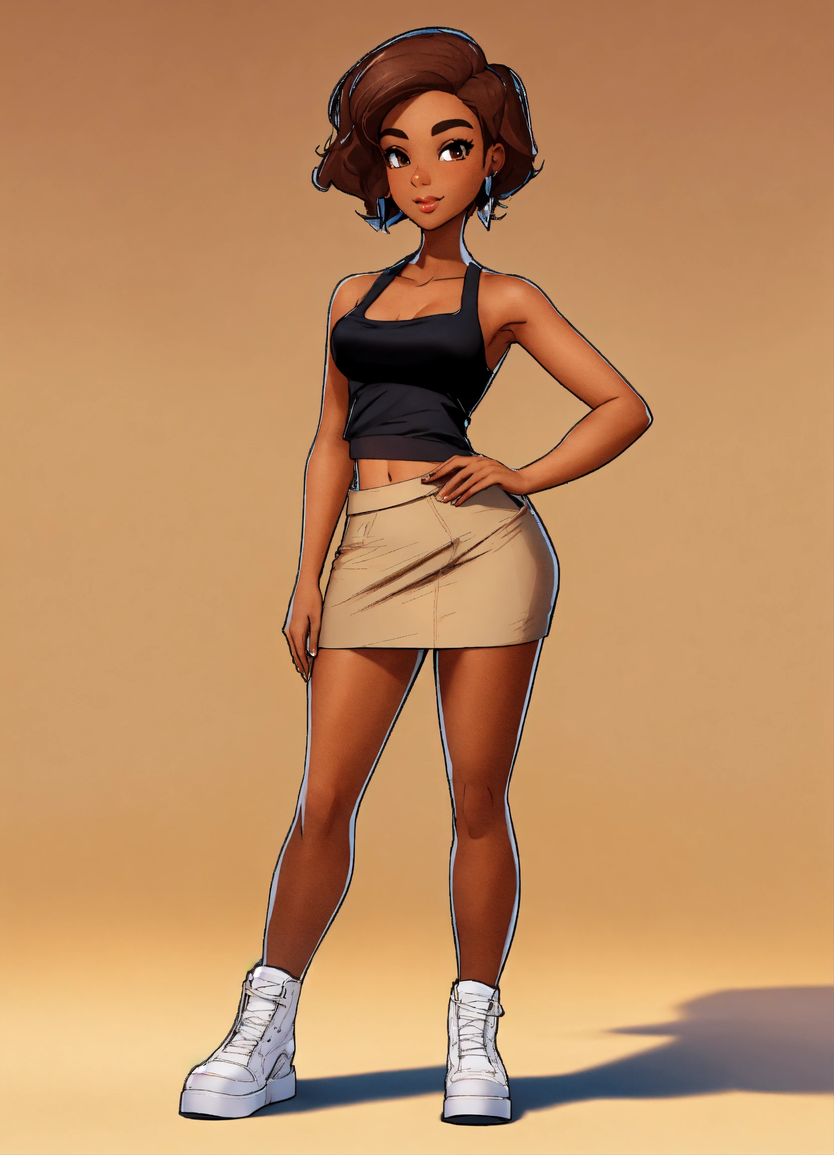 Cartoon brown skin, asymmetrical, no shadows, tan skin, gorgeous woman, white background, short hair, standing, facing front. hd, 3((((((((((((show whole body)))))), no shadows, cartoon, wearing a black mini skirt, full frame of the body 35mm wide angle shot, pin-up styles, make image into 3d, coloring book, vector, normal chest, [[[[[[[make a turnaround sheet of image]]]]]]!, ((((((((((((show whole body)))))), no shadows, cartoon cartoon brown skin, asymmetrical, no shadows, brown skin