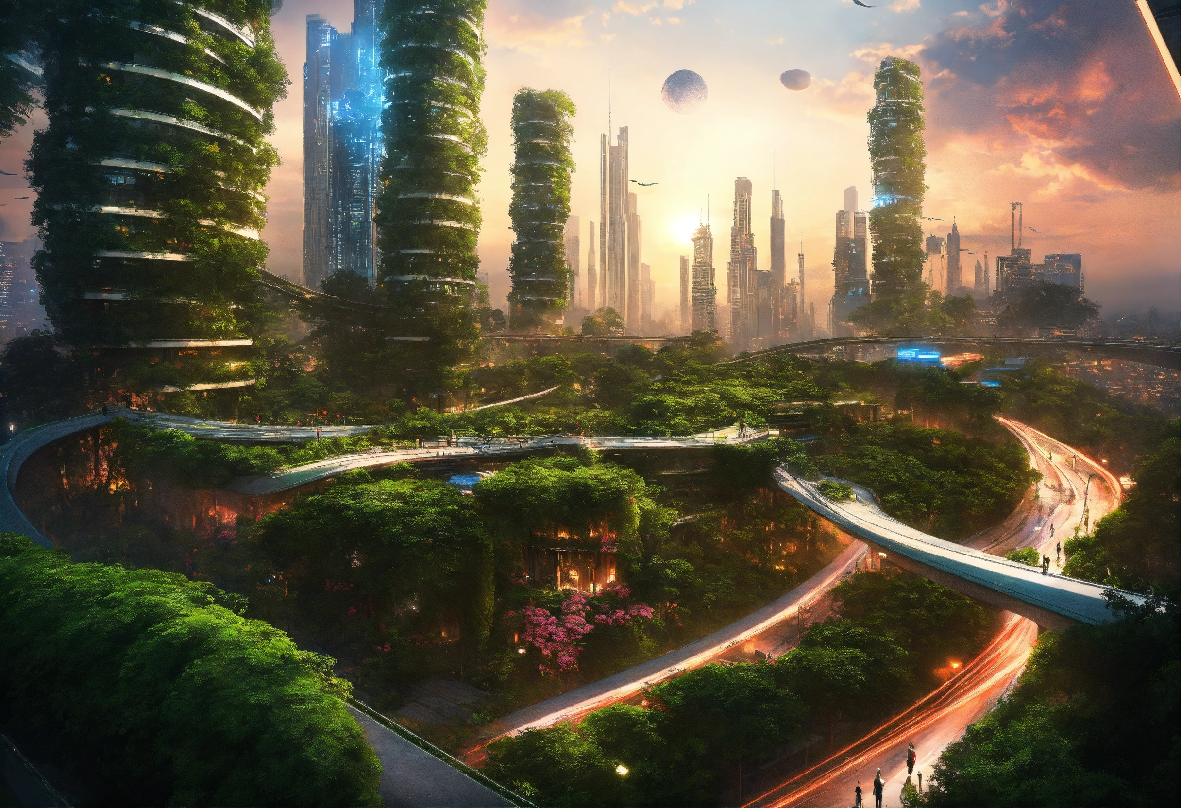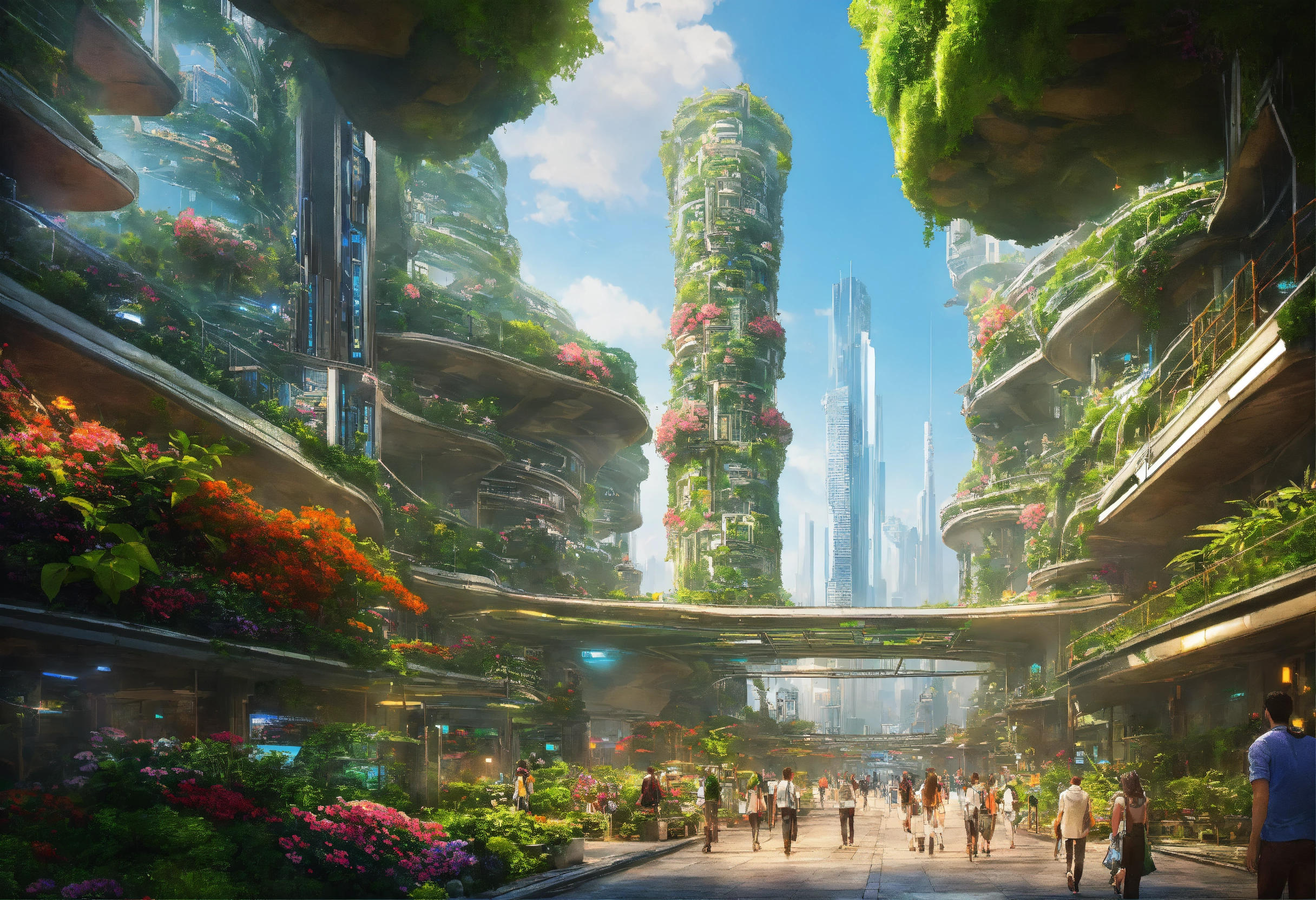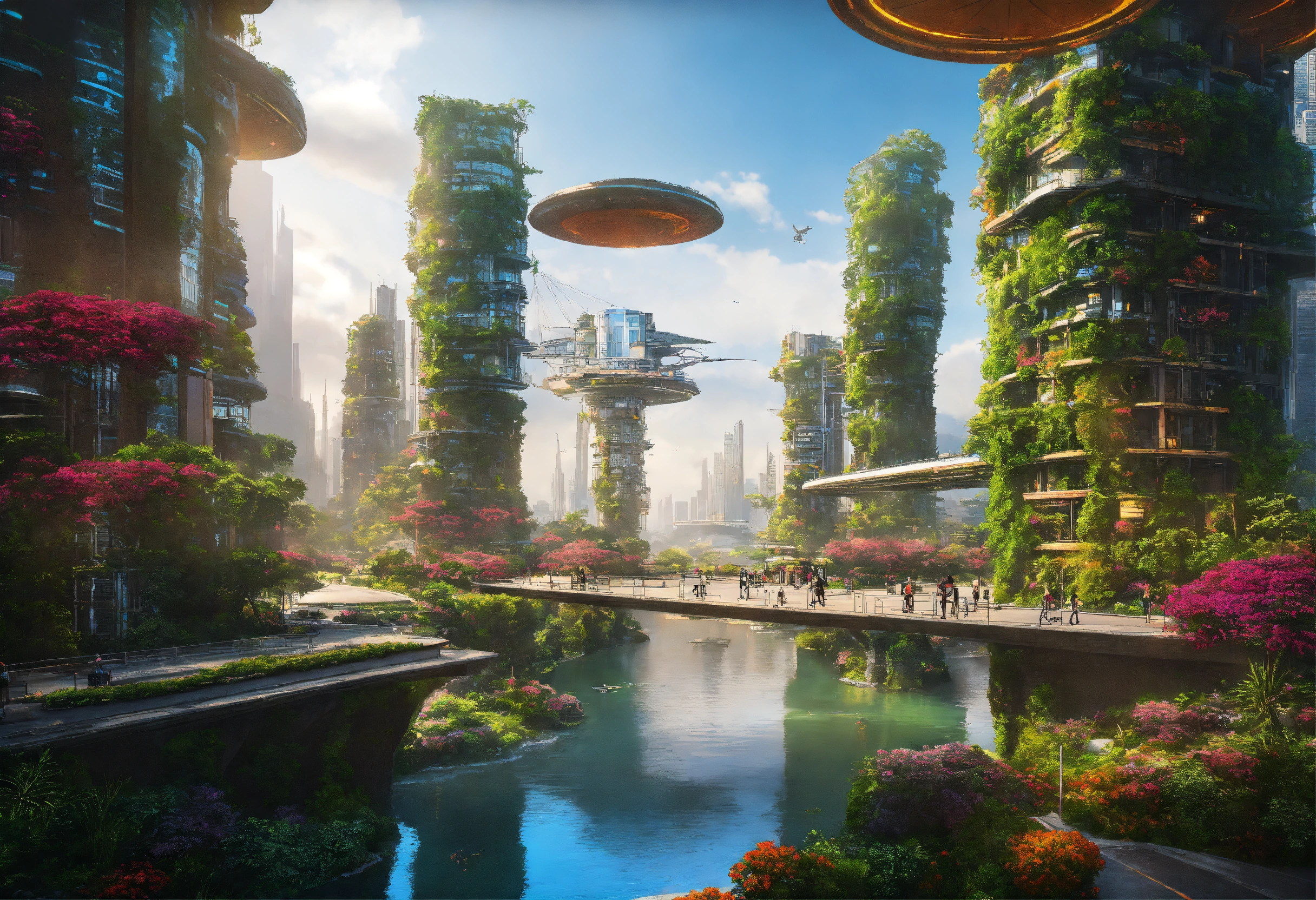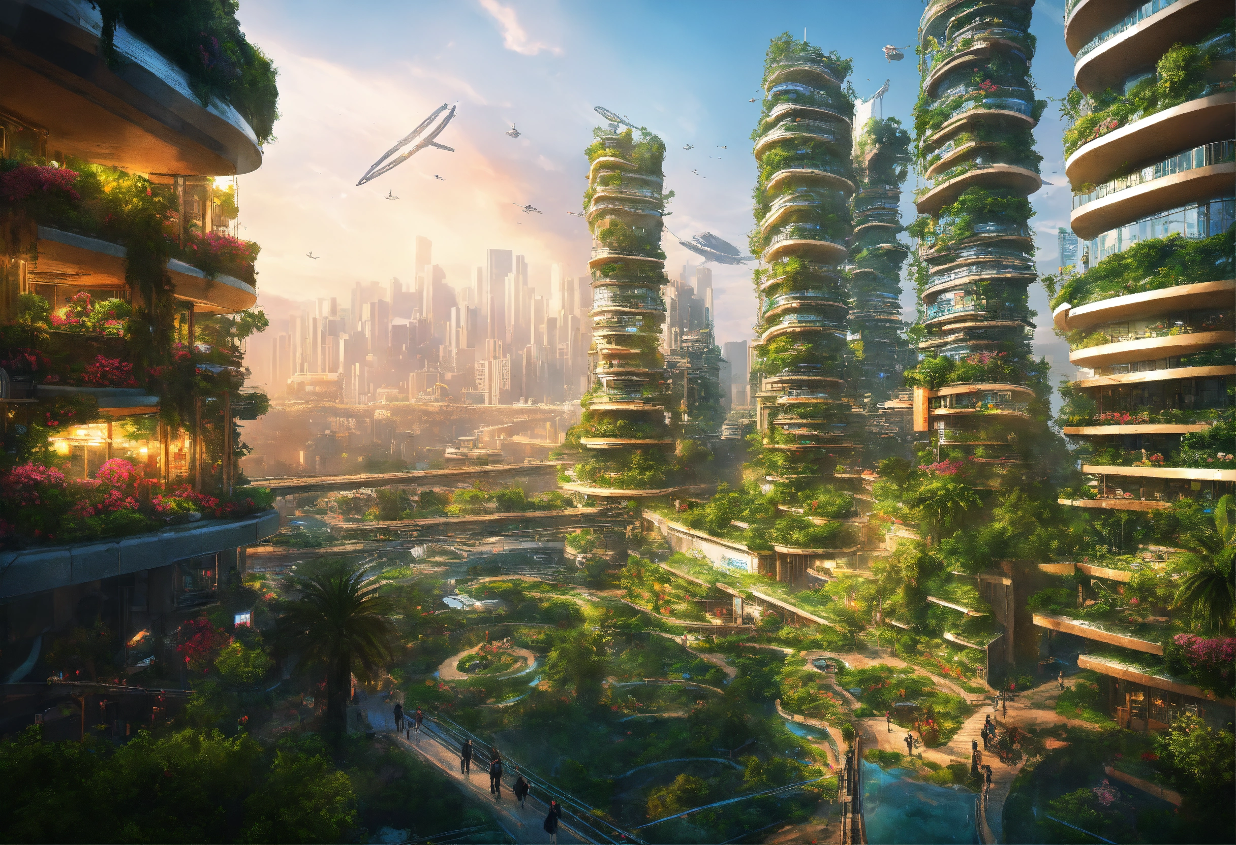 Imagine a futuristic city covered in lush greenery, its buildings connected by a network of sleek, high-tech infrastructure. the atmosphere is filled with a sci-fi ambiance, with vibrant and vivid hues creating an otherworldly feeling. picture yourself walking through this city, surrounded by towering structures adorned with cascading plants and vibrant flowers. the air is filled with a sense of possibility and innovation. this is a city where nature and technology coexist harmoniously, creating a utopia for both humans and the environment. welcome to tech haven, where the future meets nature in a truly mesmerizing way.
