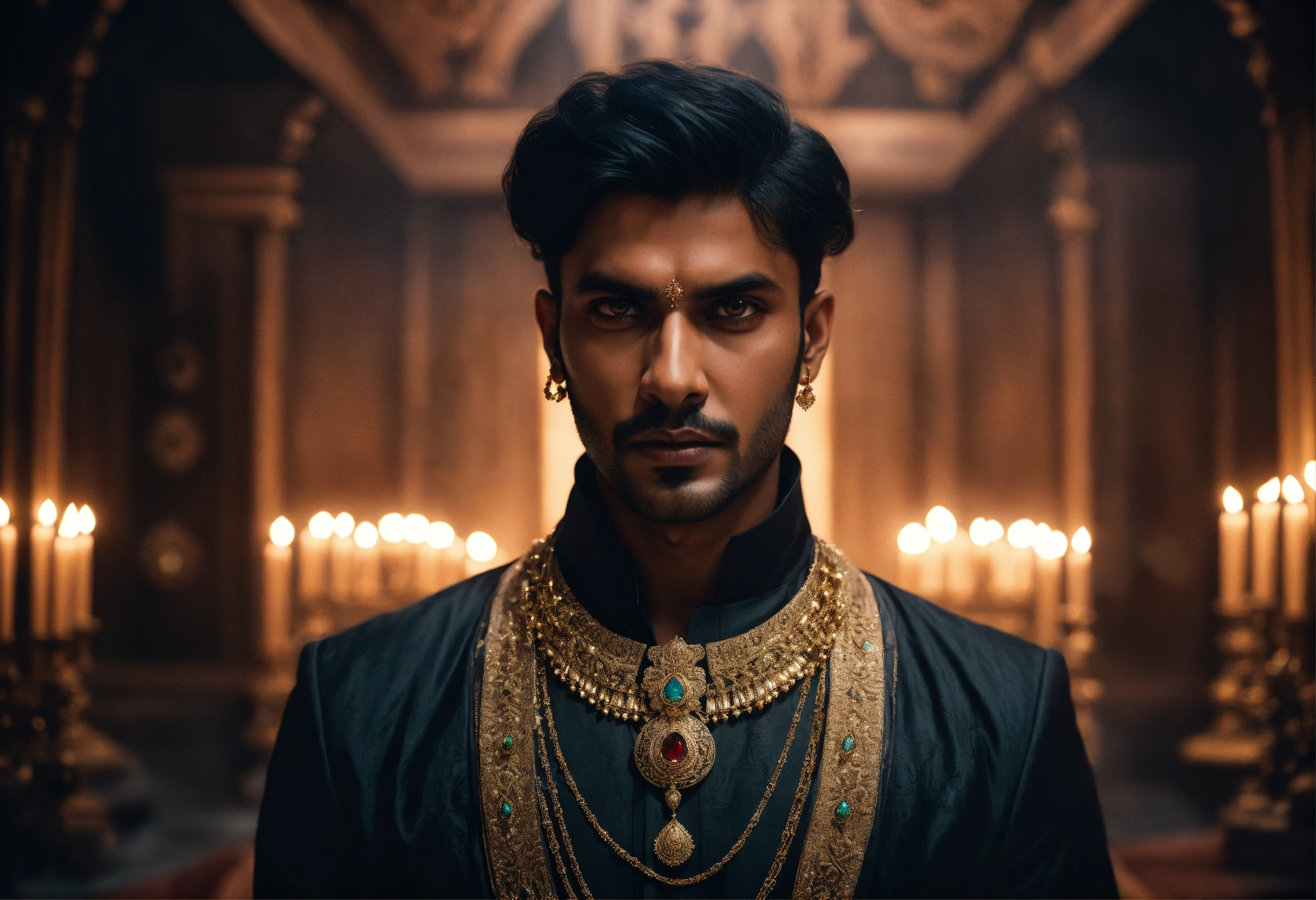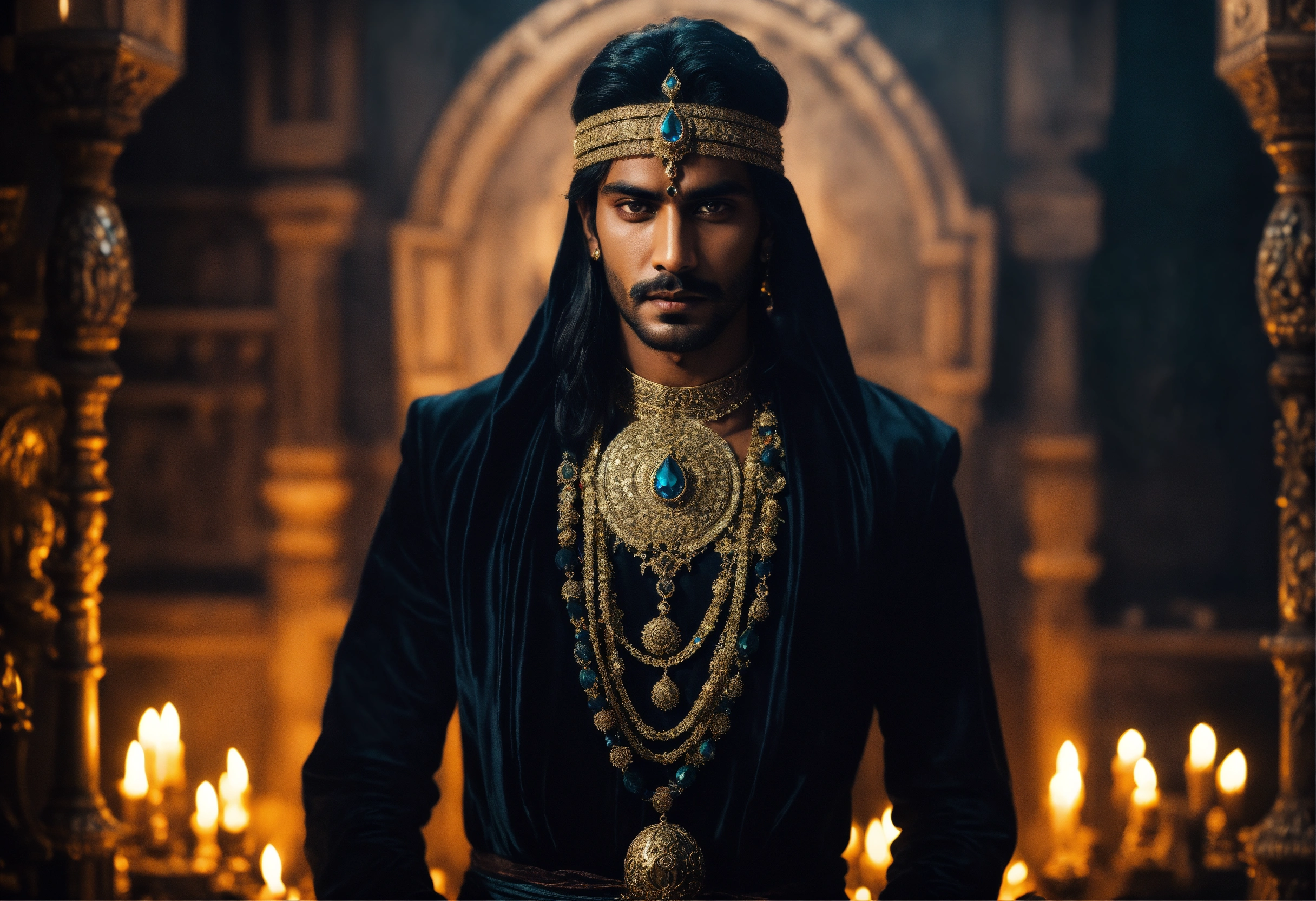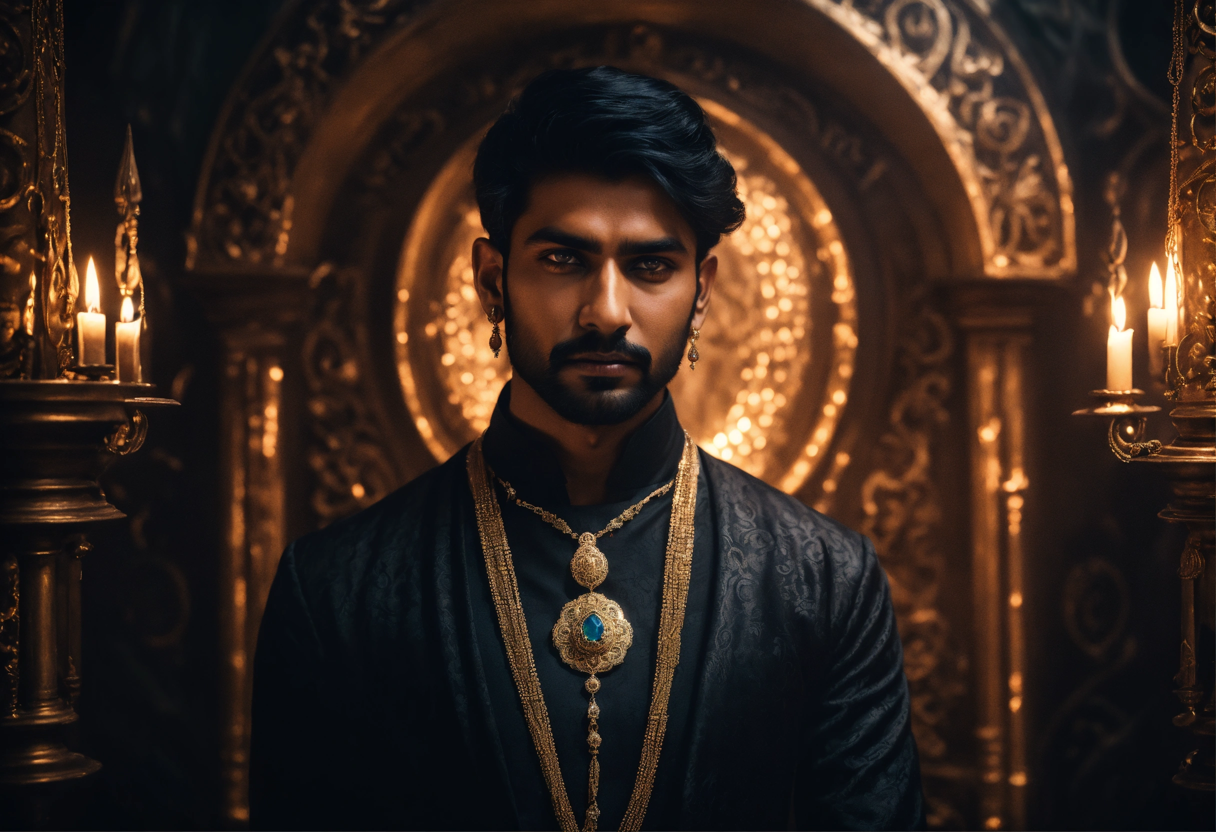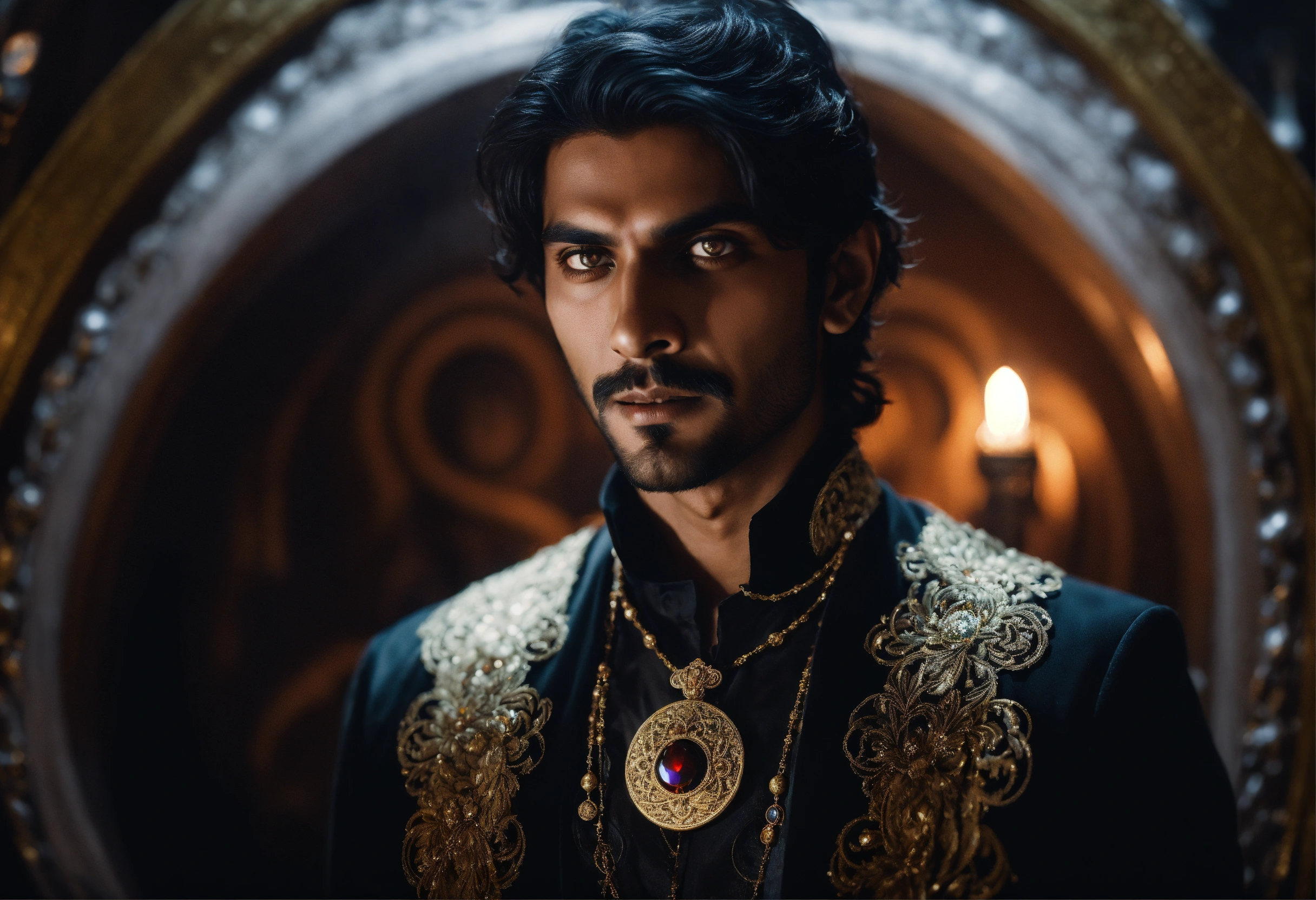 Dark and cinematic fantasy portrait of a young and handsome indian sinister sorcerer with gleaming hypnotic eyes hypnotising the viewer, dressed in dark mysterious clothes and wearing ornate jewellery in a secret occult chamber.