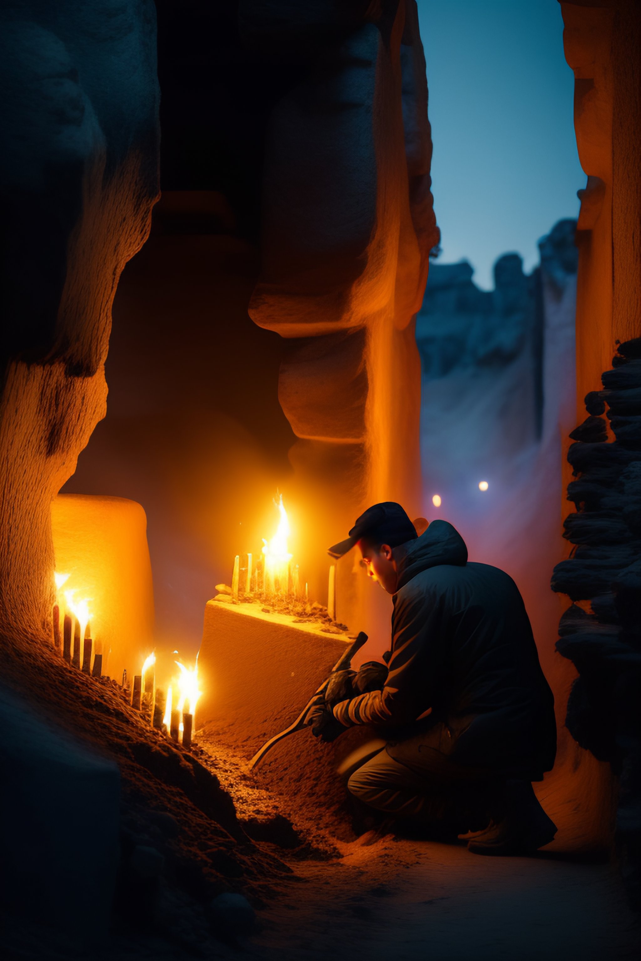 Archaeologist excavating a tomb in night with lights
