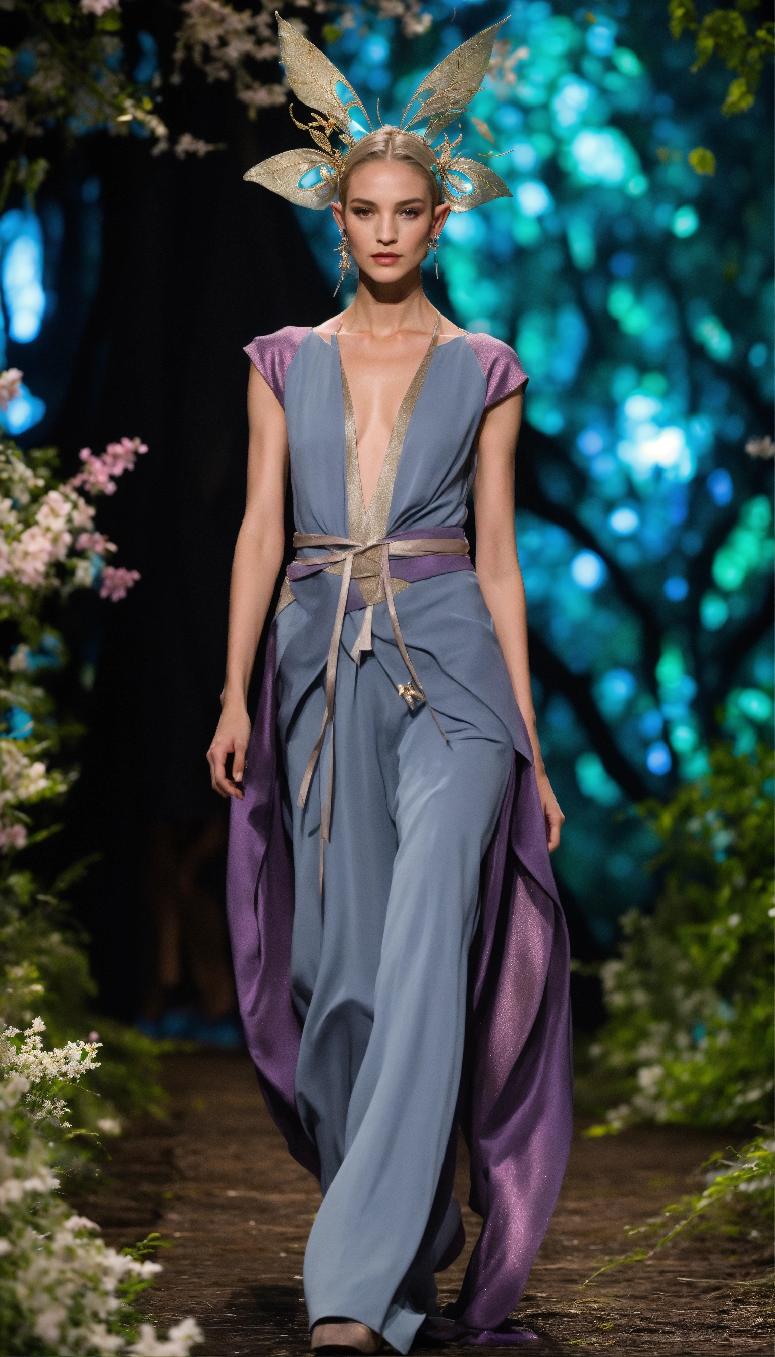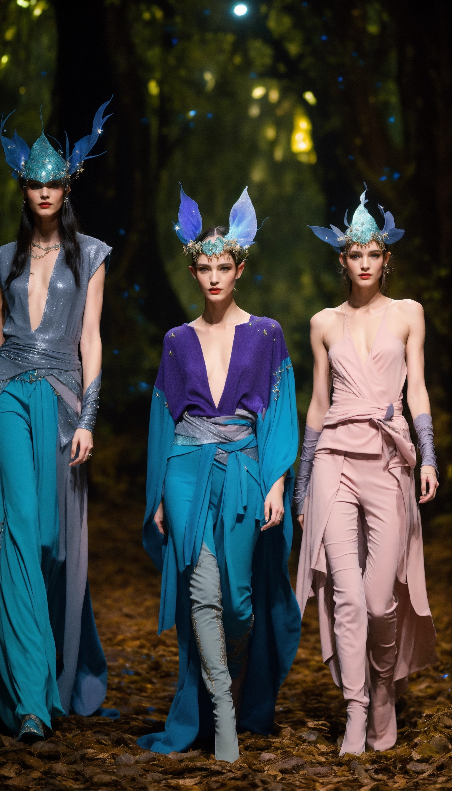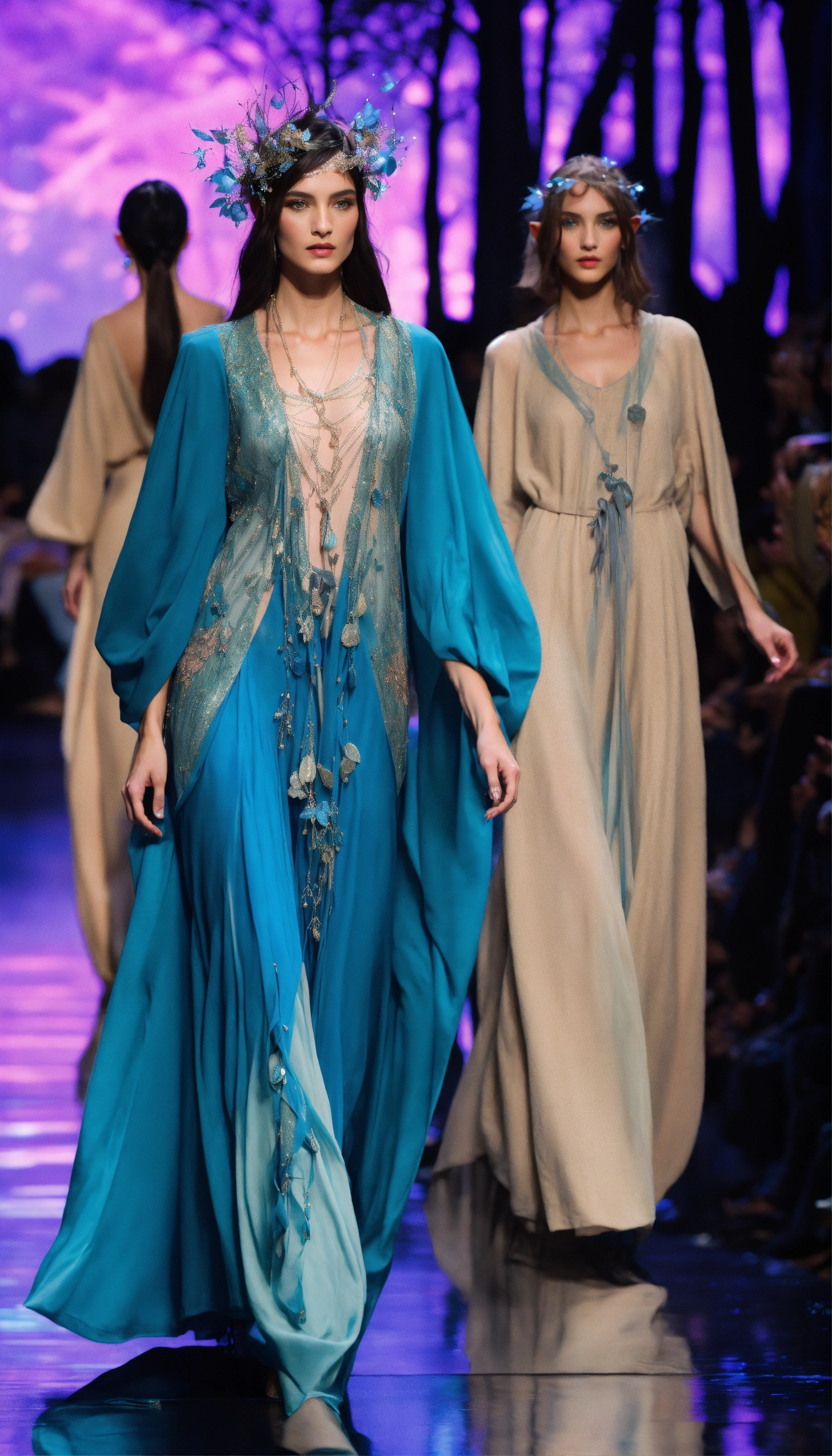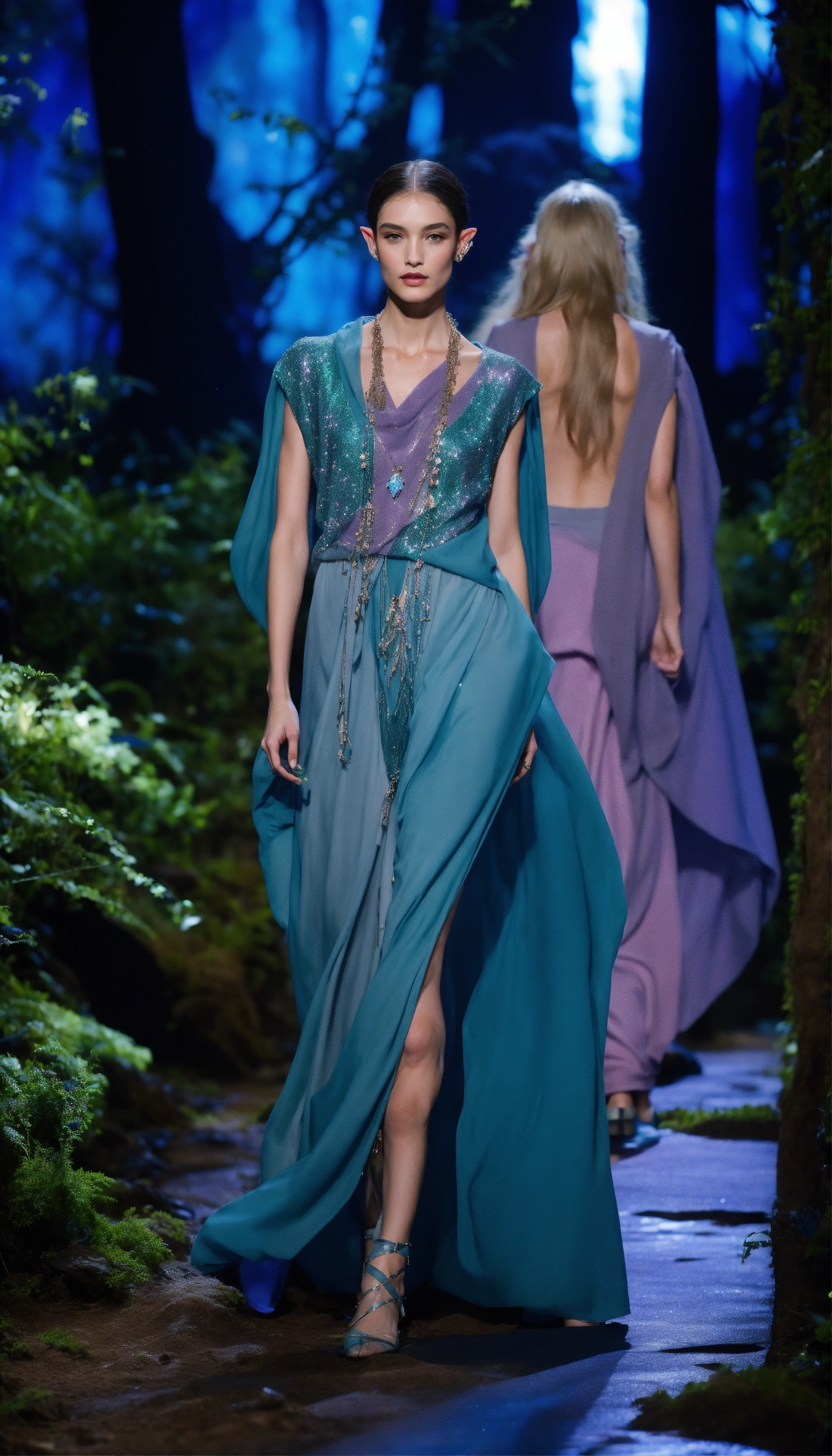 Lothlorien androgynous elves walking runway during elvin fashion week wearing dolman sleeve elvish donna karan fashion in blues, teals, purples, pinks, whites, grey, beige, stone, metallics, shimmer at an enchanted forest runway at starry nighttime, fireflies