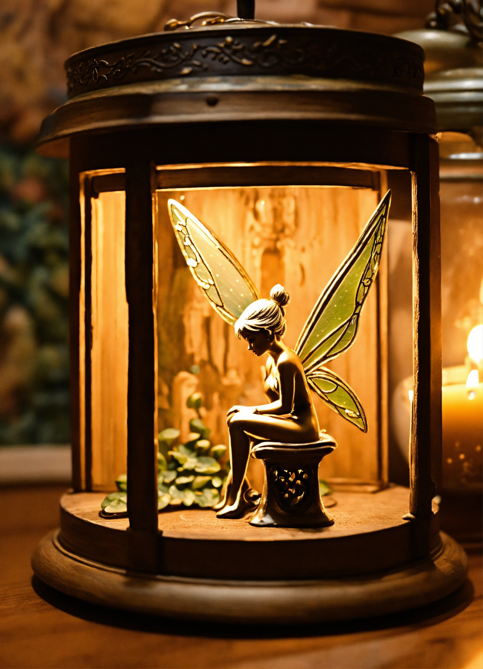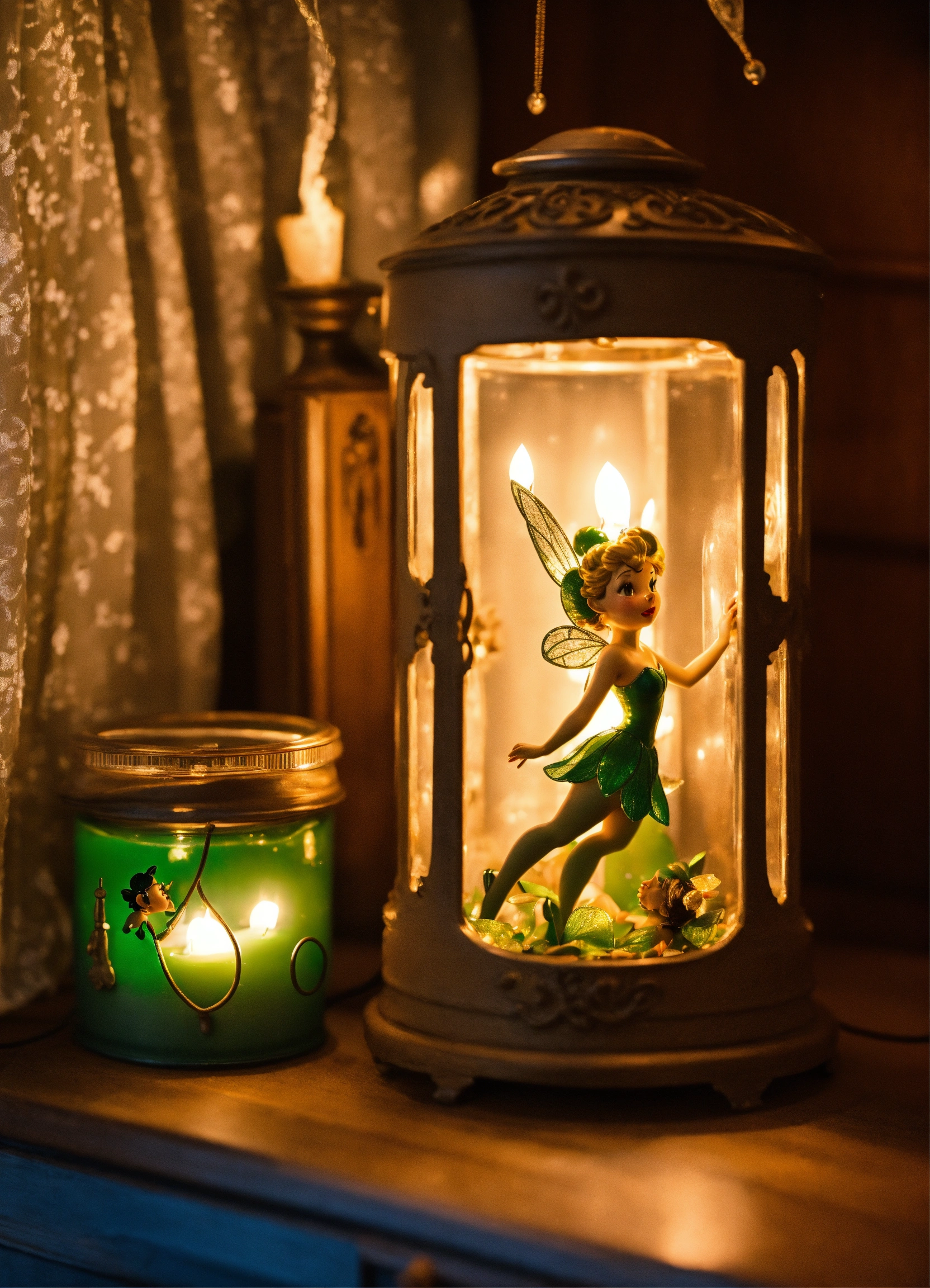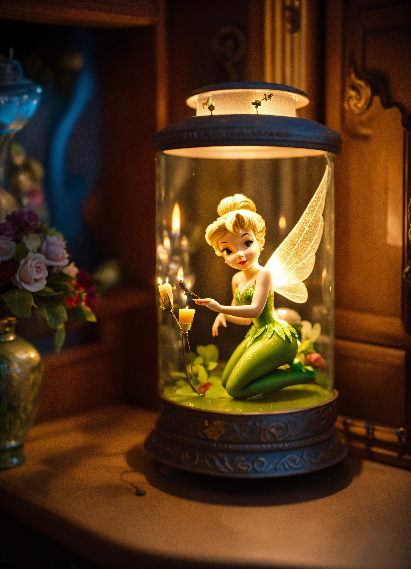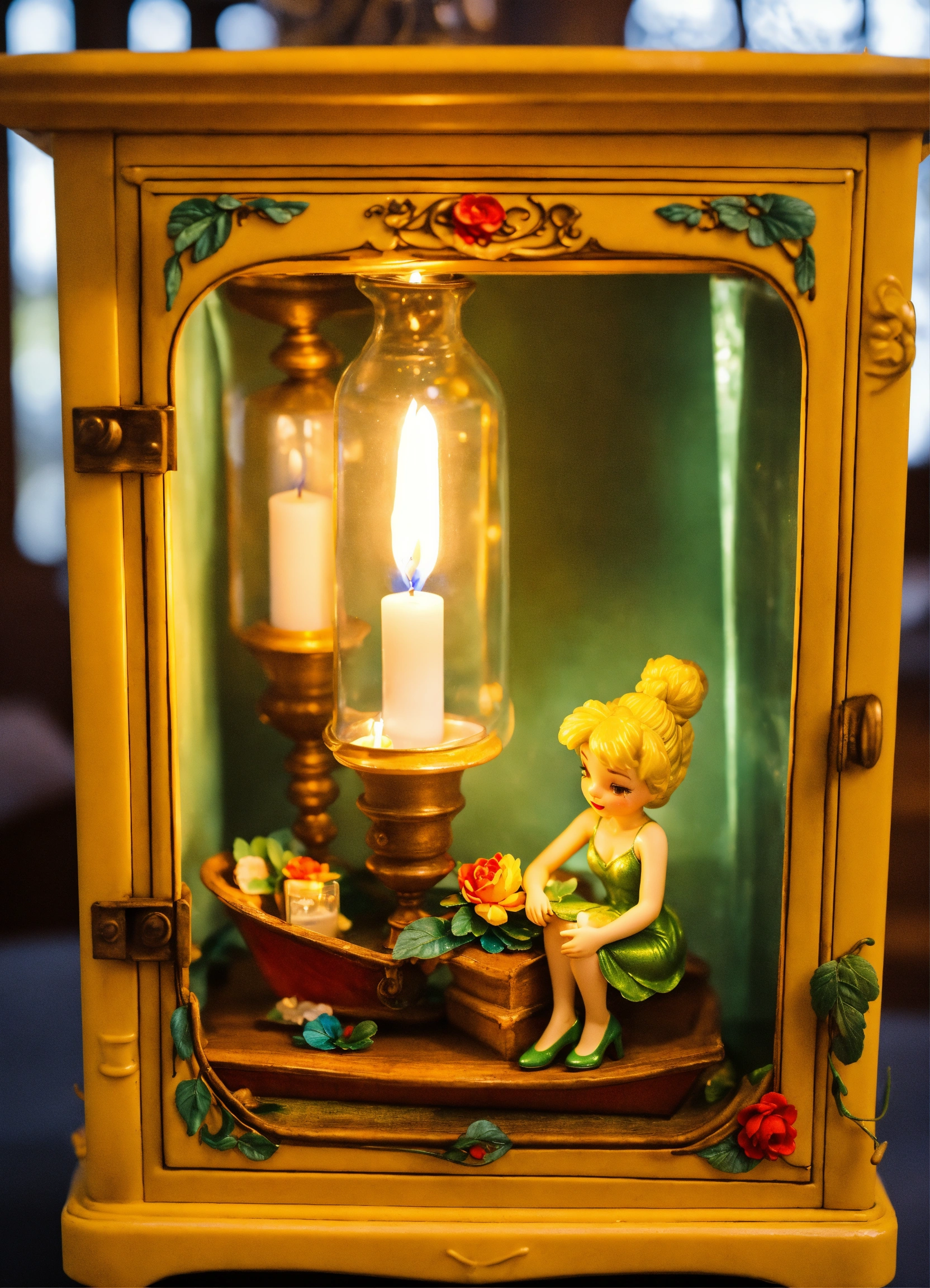 Tinker bell disney fairy, disney style, sad and crying inside a lamp candle, vintage, inside a cabinet ship