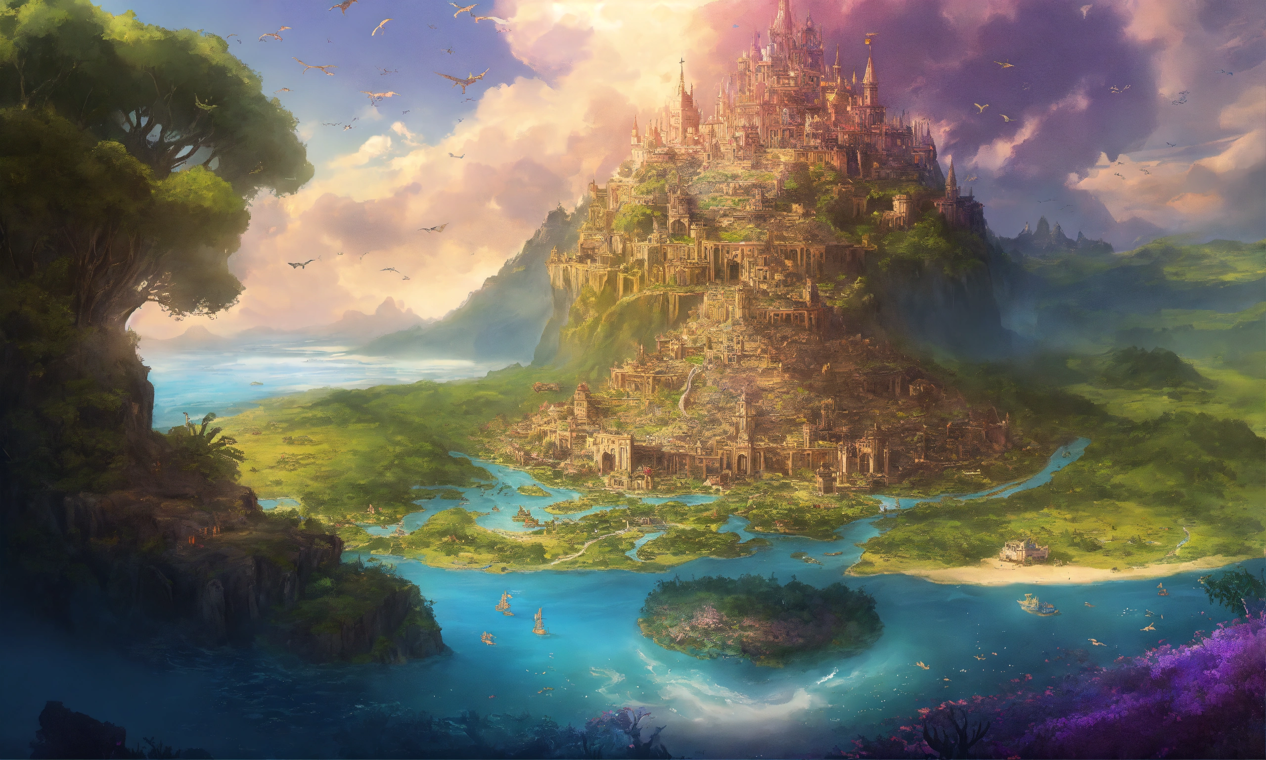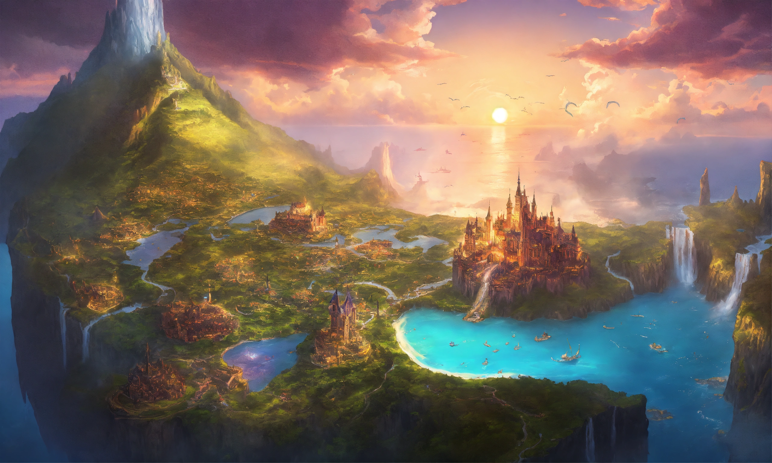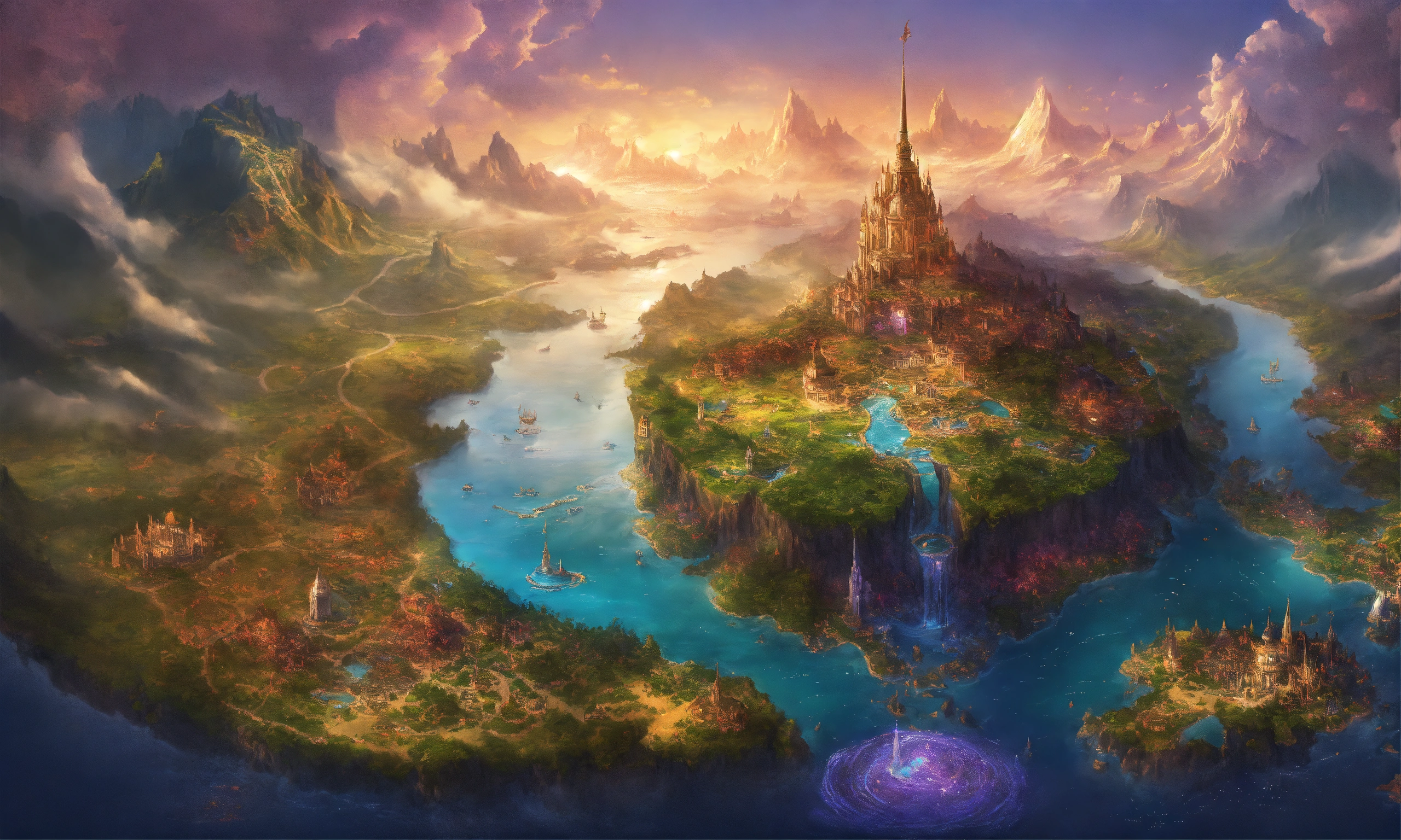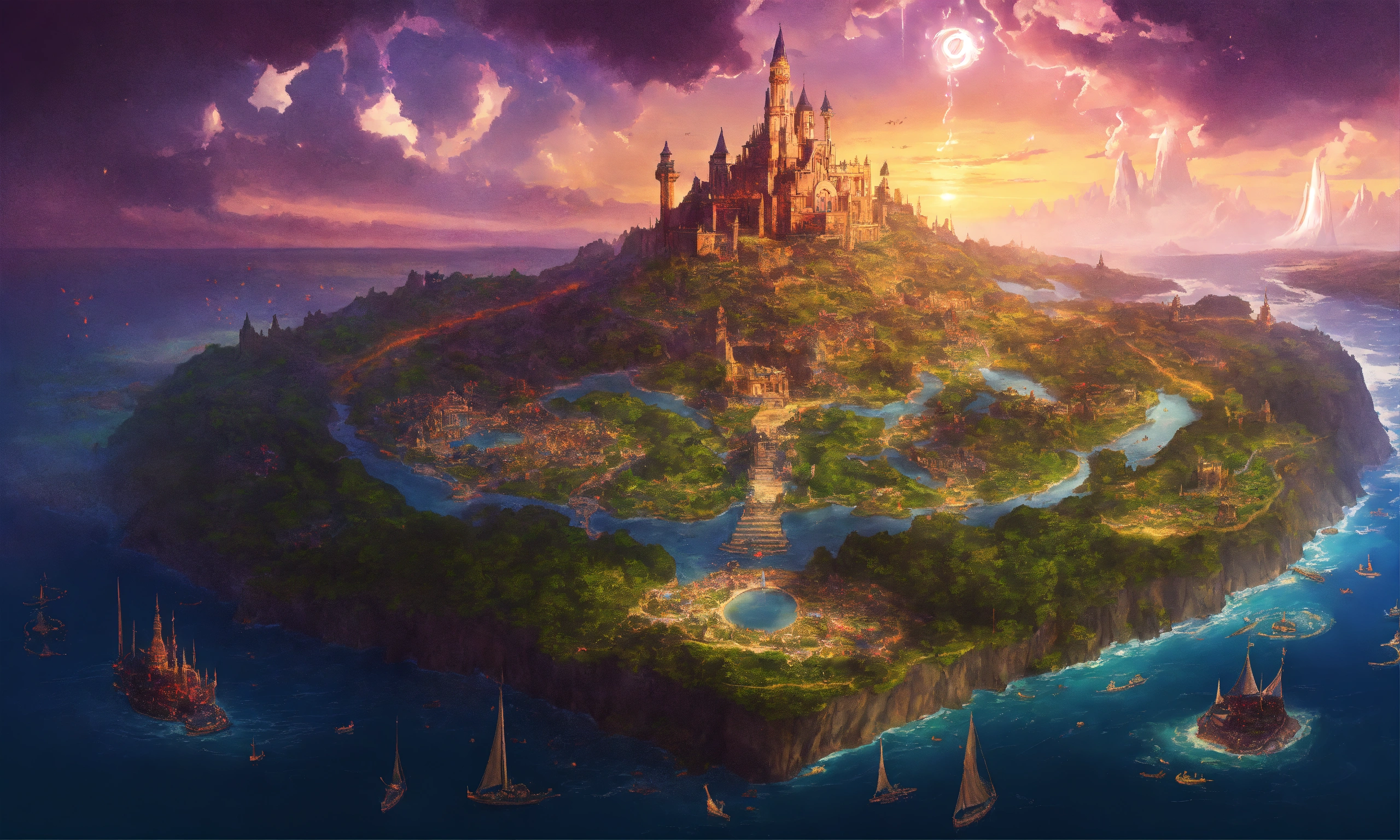 Fantasy map of a magical world called eden, with 9 kingdoms, with one kingdom called rosalithia being in the middle of a large body of water on a large island as the capitol of the entire realm. with a fairy kingdom called solaria, a mermaid underwater kingdom called atlantis, a kingdom called lemuria, a kingdom called camelot, a kingdom called auros, a kingdom called mythondew, and the kingdom of demons and shadows the undermoore. purple oceans, important landmarks, very detailed