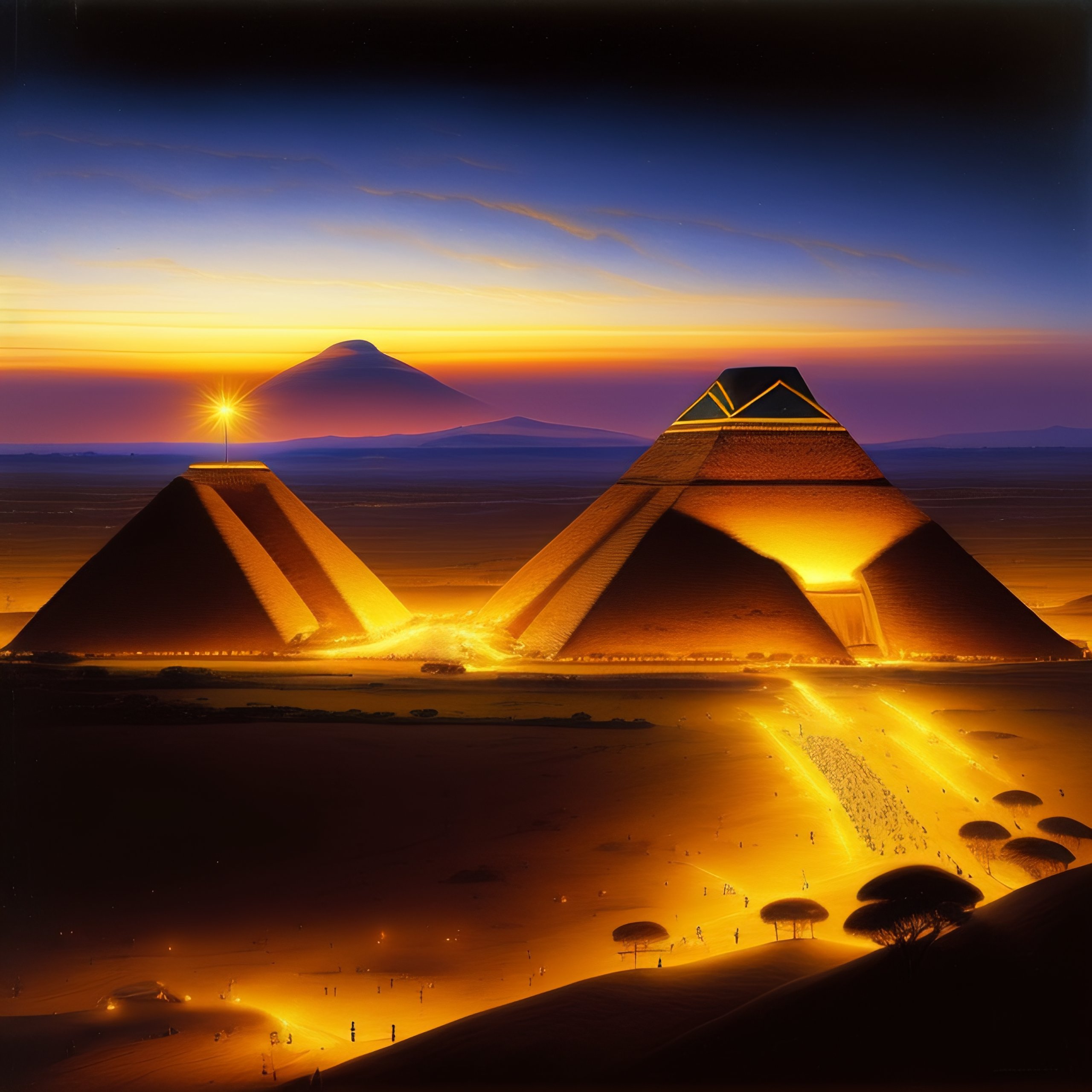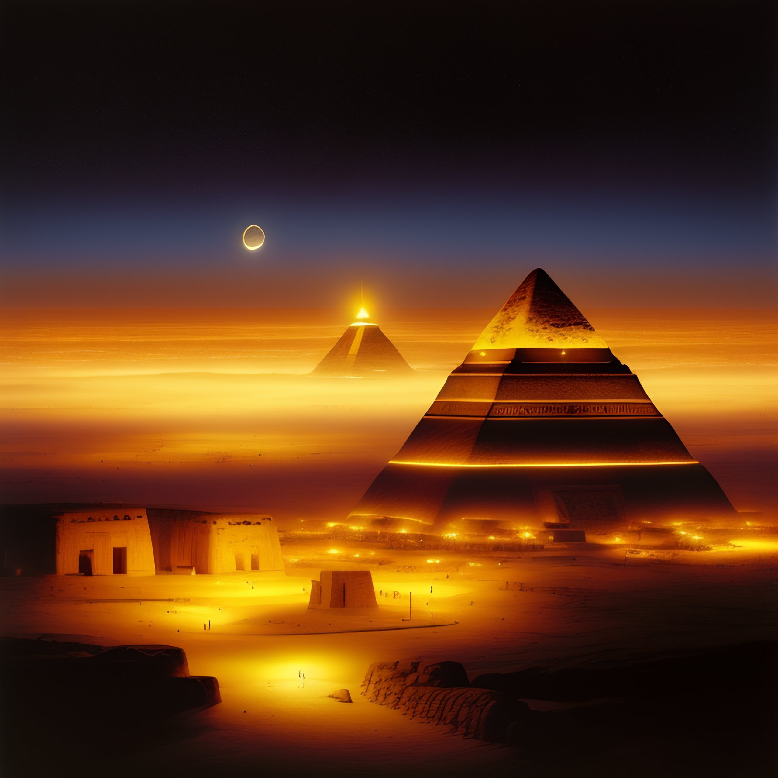 Tilt-shift photo of khufu, khafre, and menkaure pyramids of giza, in the sky, landscape by jacques-laurent agasse, night time, winter season.