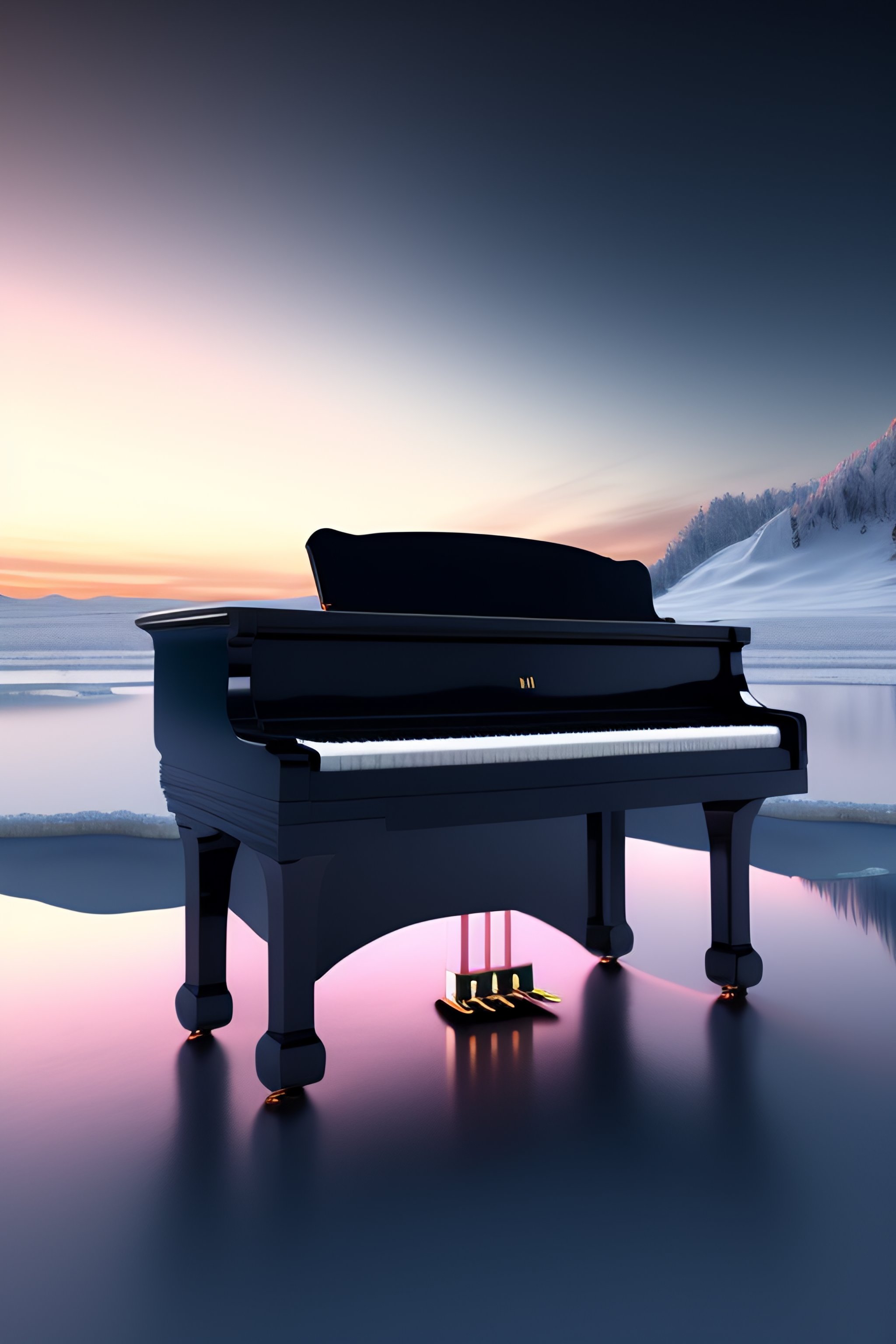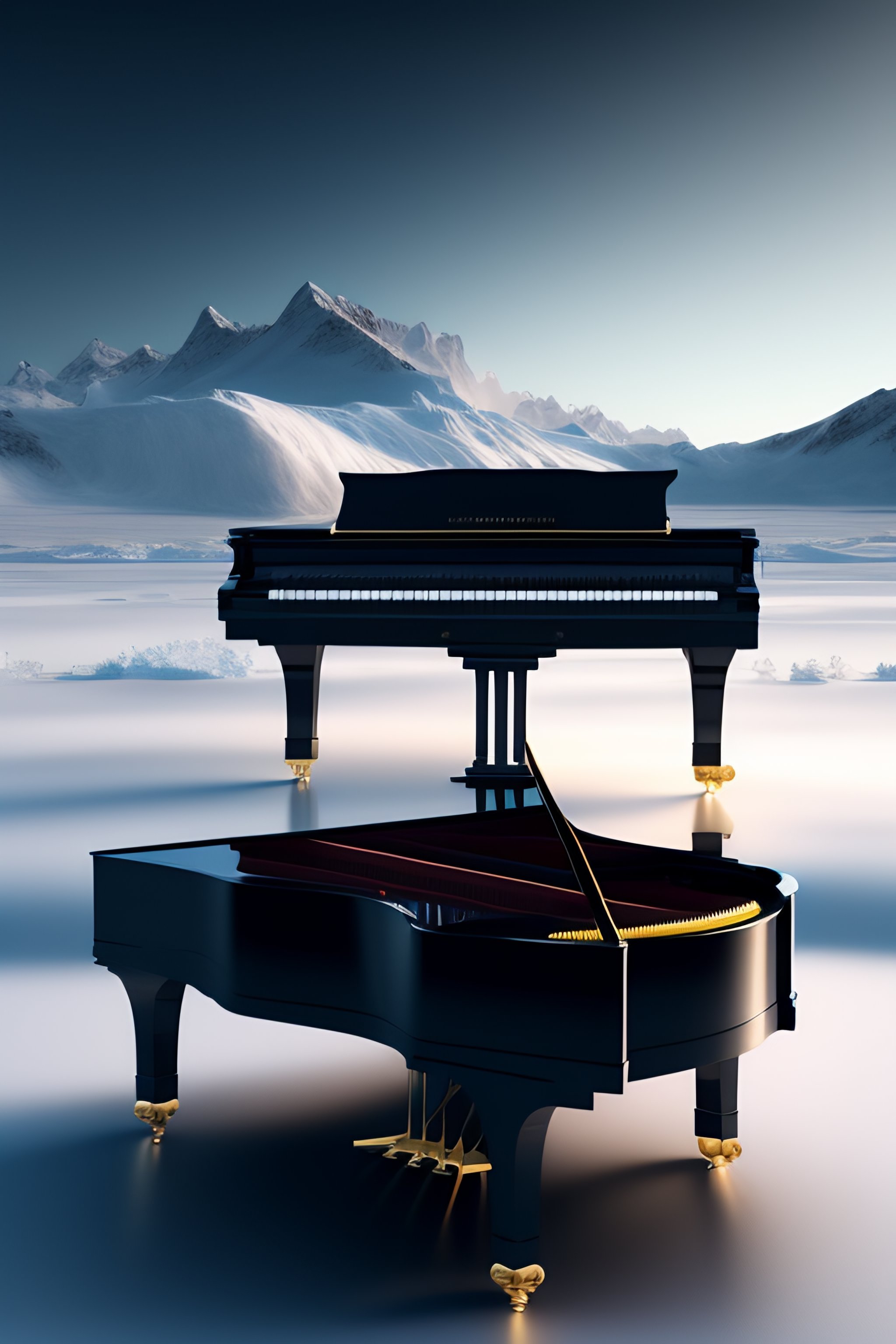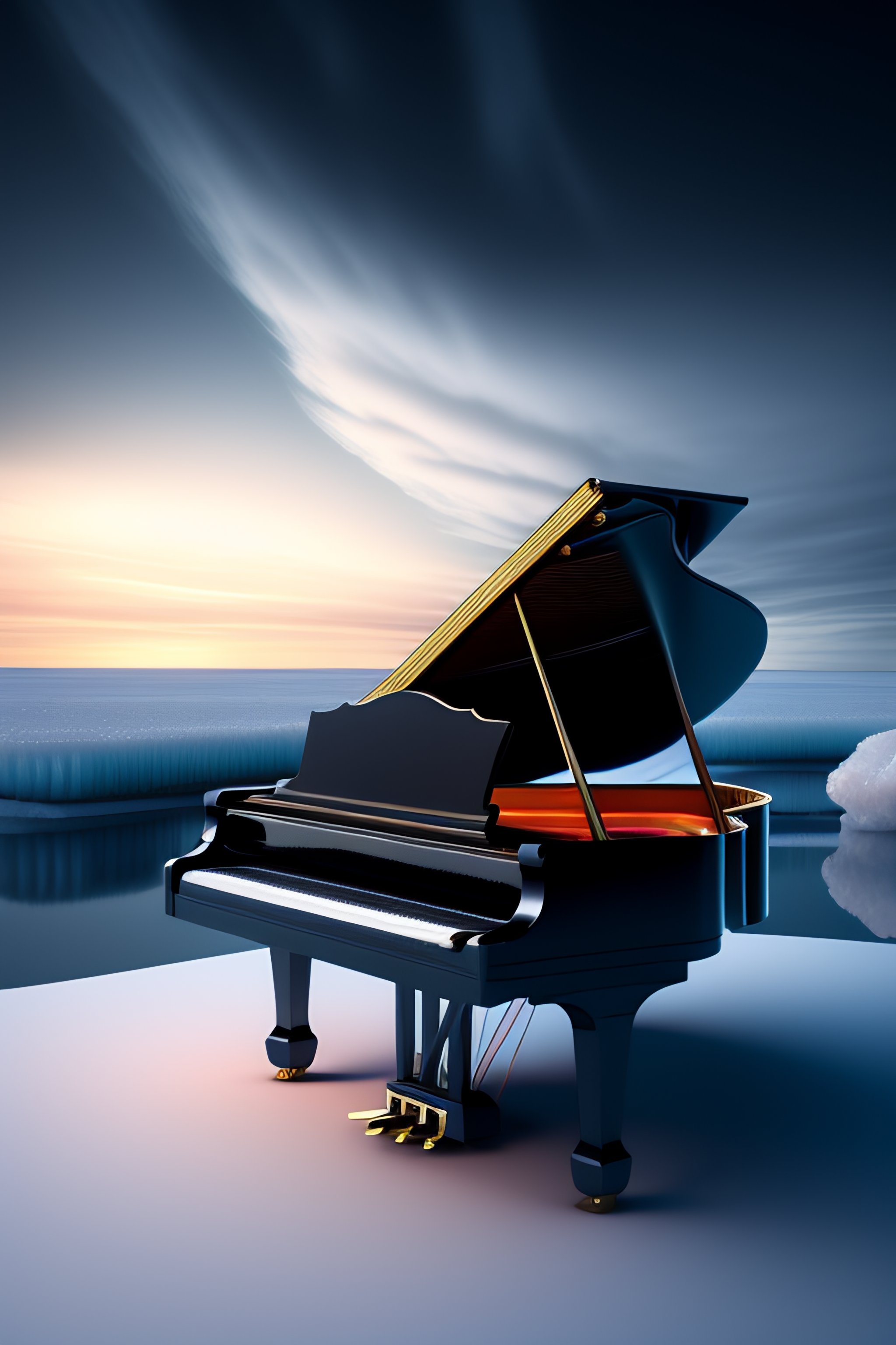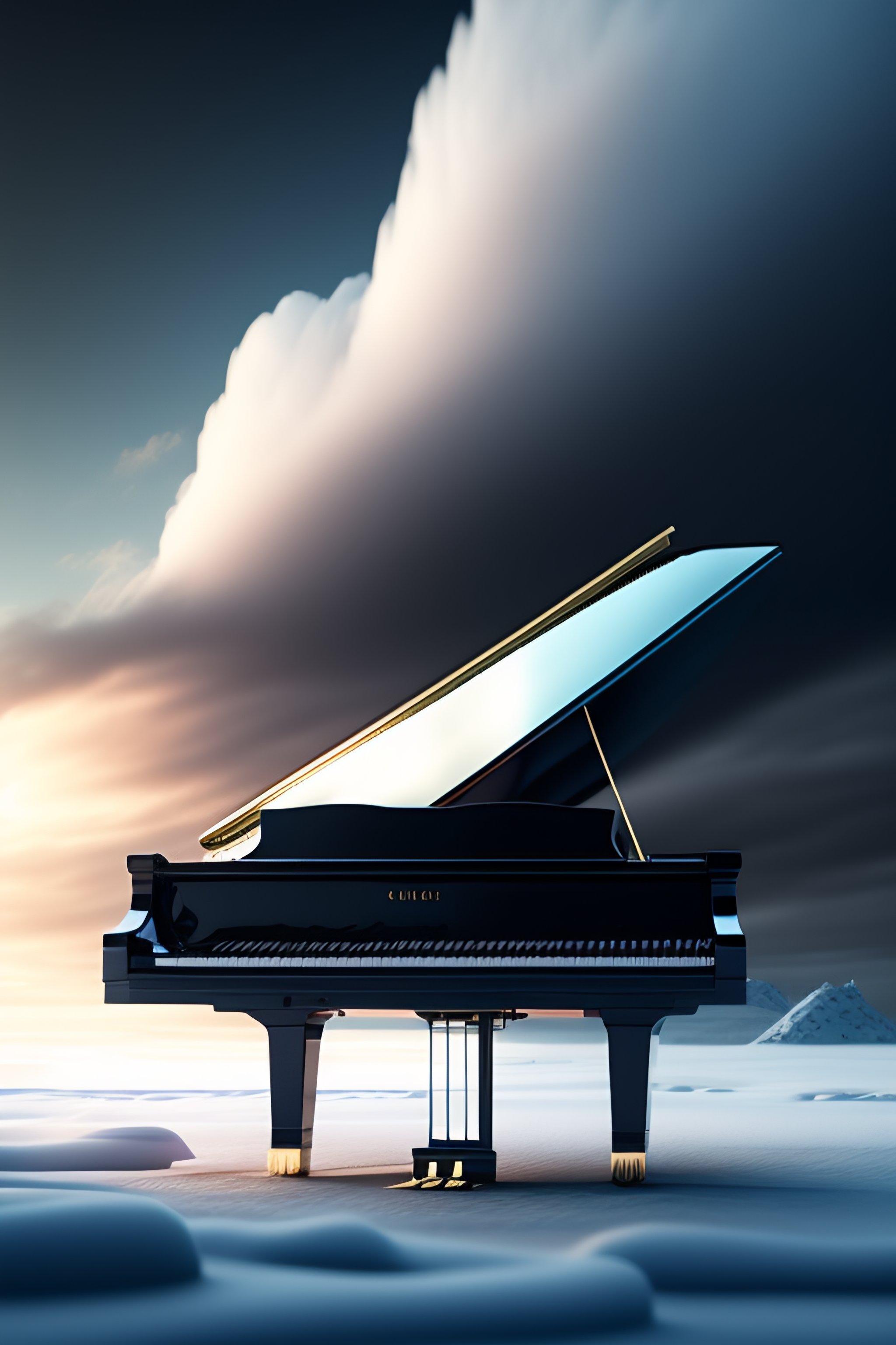 Piano floating in an icy landscape, particles, dark feelings, 3d render, cinematic, hyperrealistic, cloud, hd, hdr