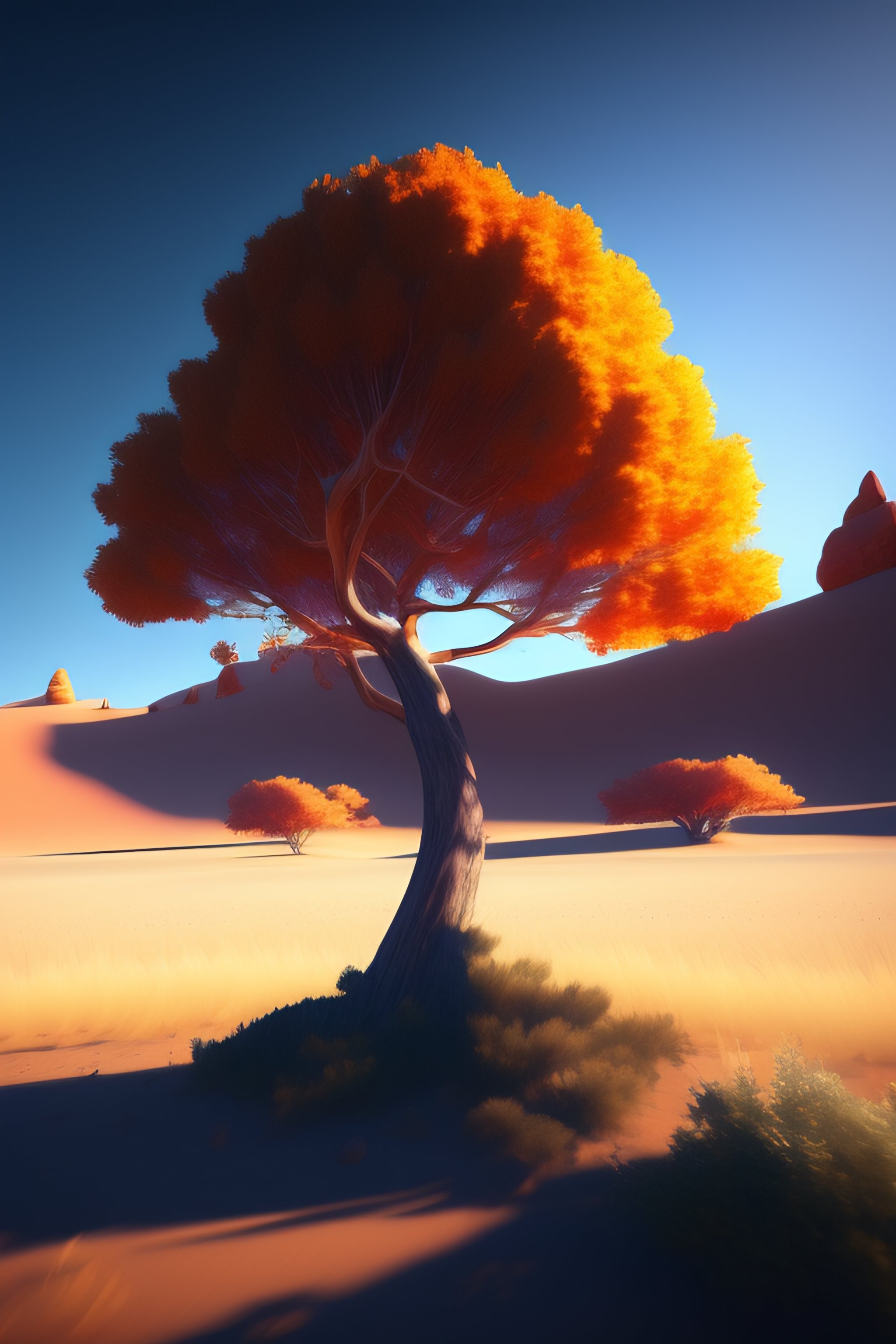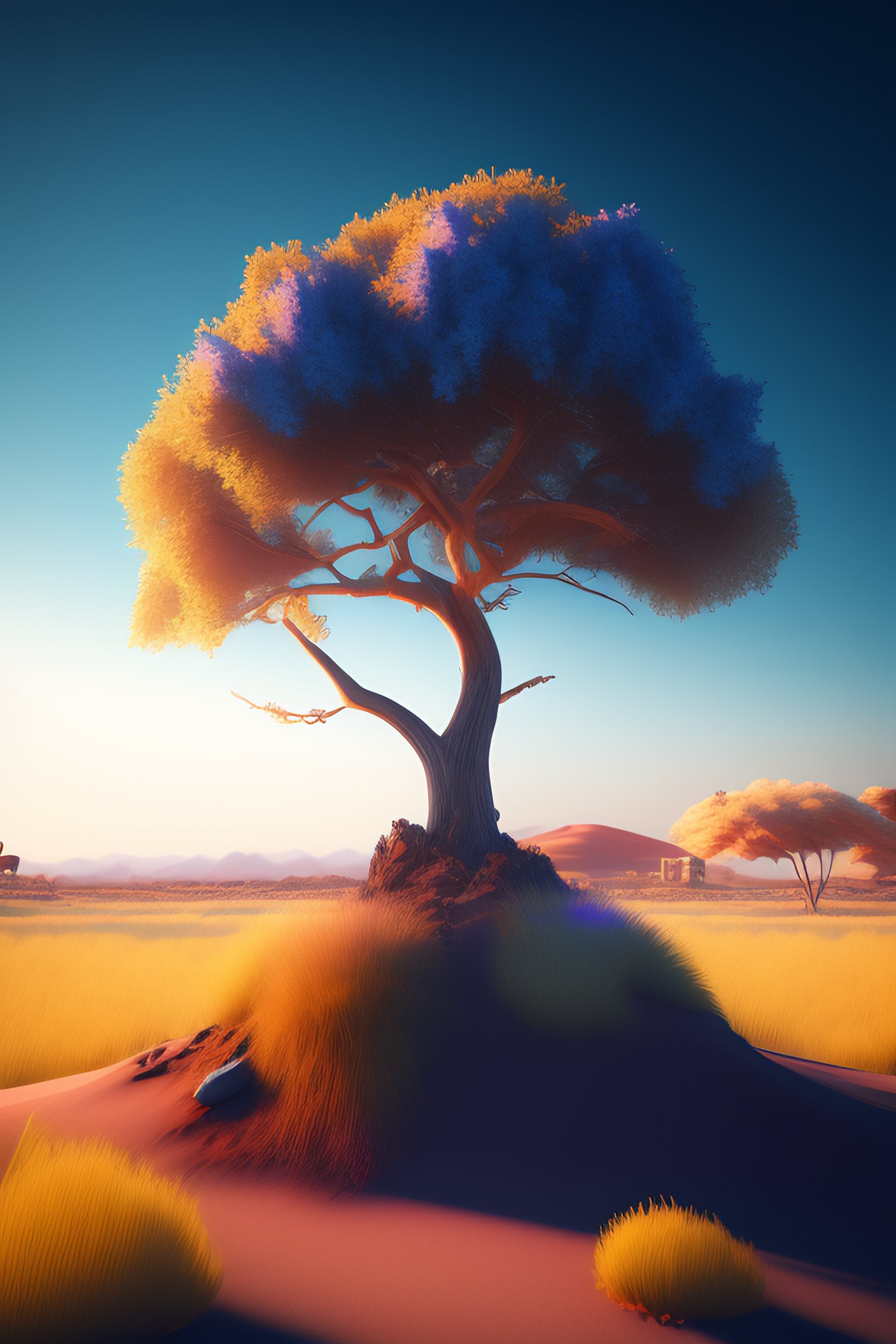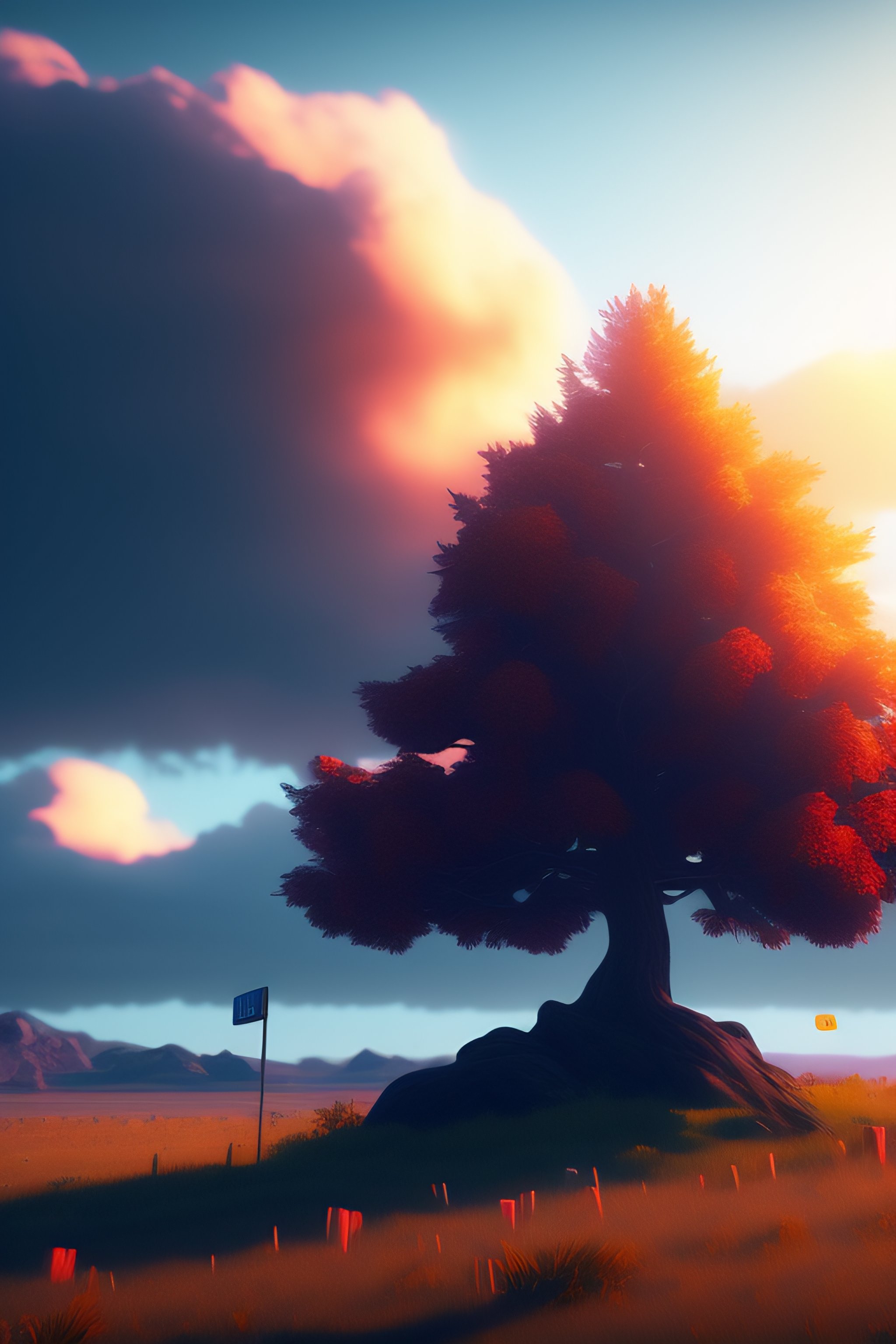 Photo of 8k ultra realistic lone dead tree dead tree on which a sign is hanging, bleu sky, warm, full of colour, cinematic lighting, battered, trending on artstation, 4k, hyperrealistic, focused, extreme details, unreal engine 5, cinematic, masterpiece, art by studio ghibli