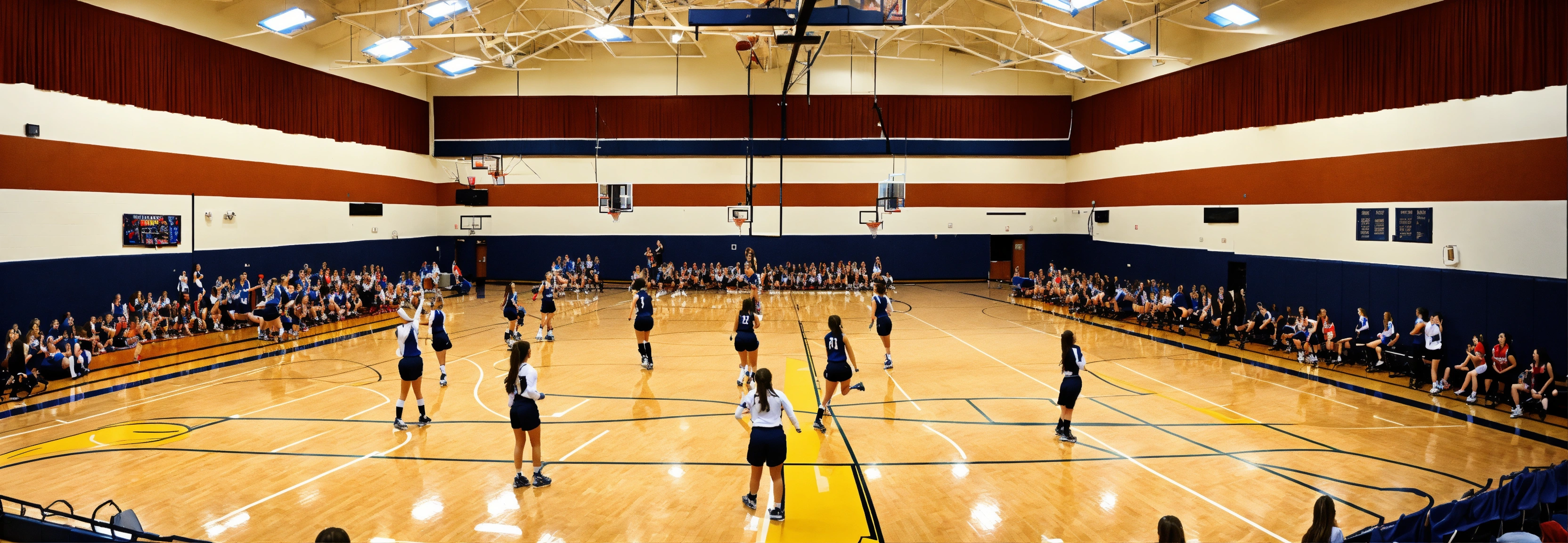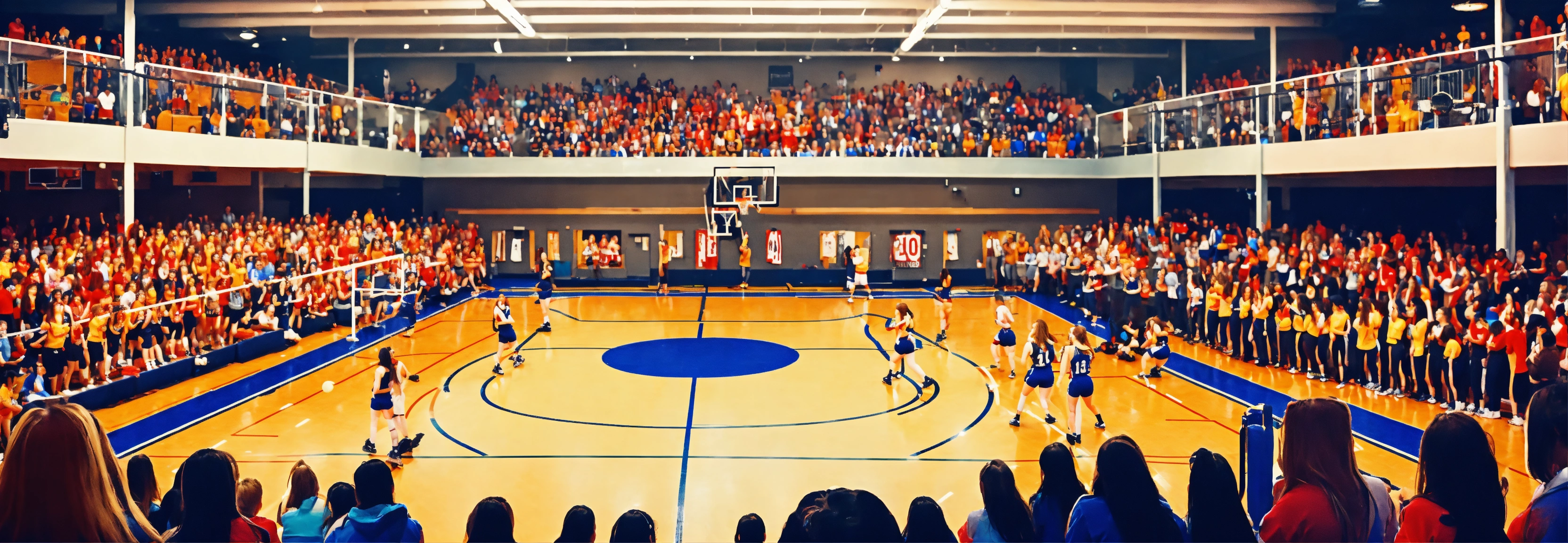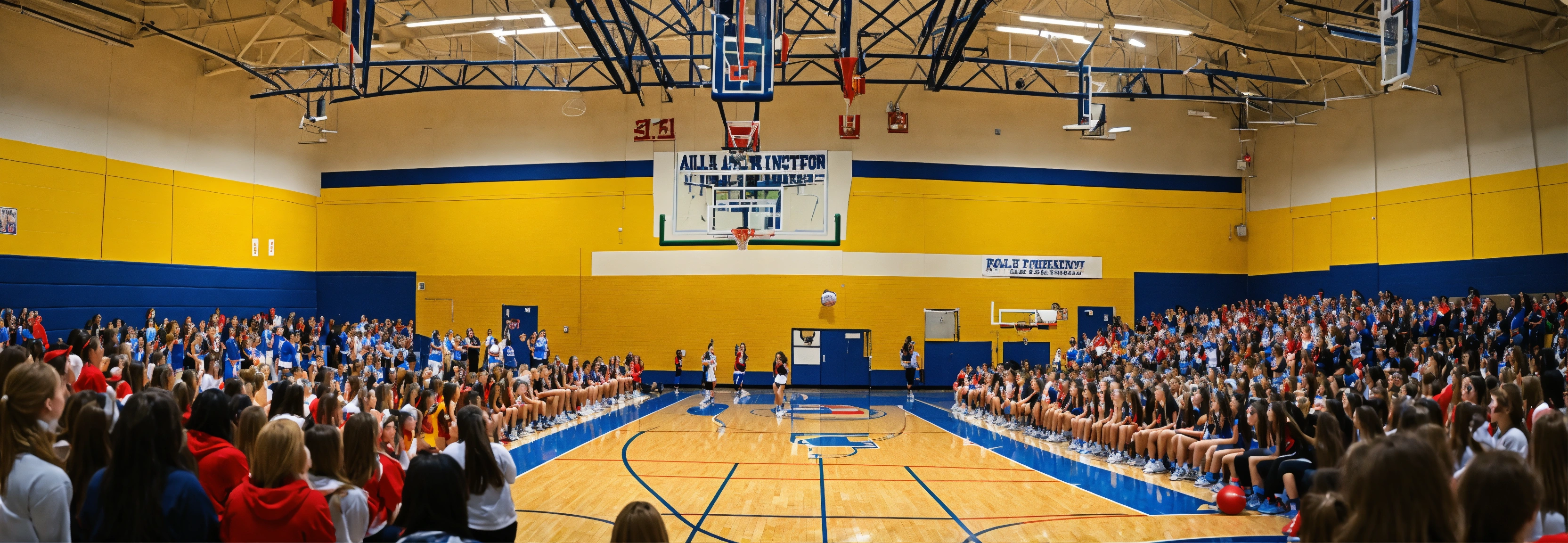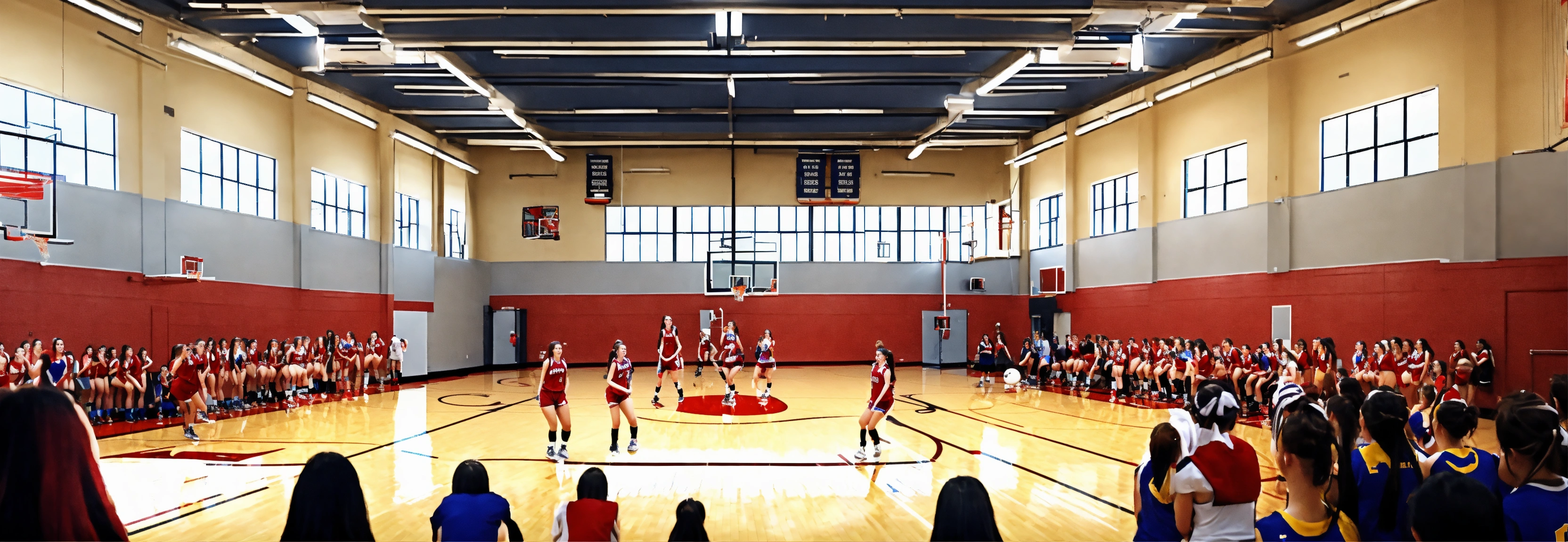 A high school gym filled with an all-female crowd, everyone is happy and cheering, realistic, panoramic view