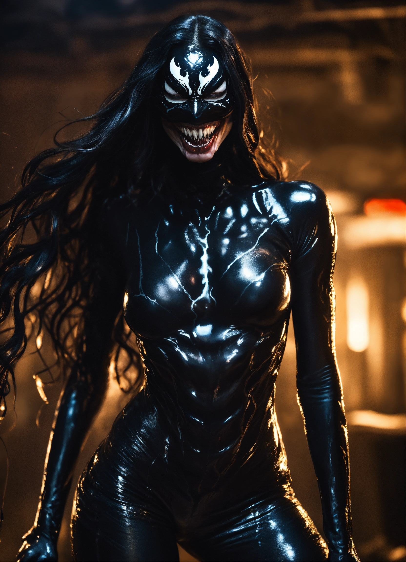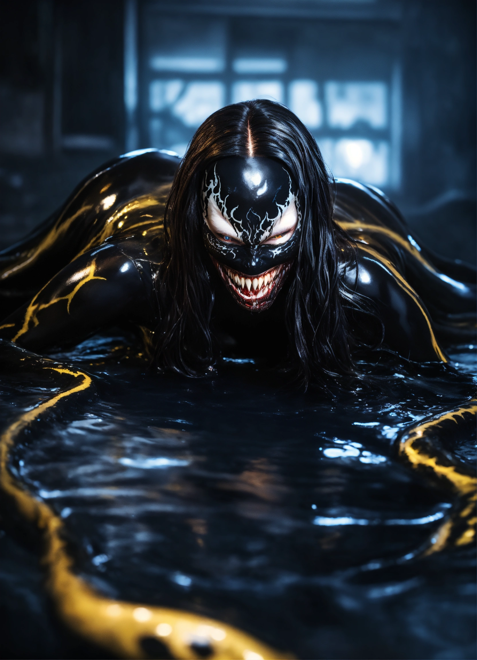 An ultrarealistic full body photograph of woman venom symbiote, laying in dark black liquid, long hair, evil smile, evil glowing eyes, venom symbiote on skin, liquid short top, liquid short pants, venom symbiote, 8k