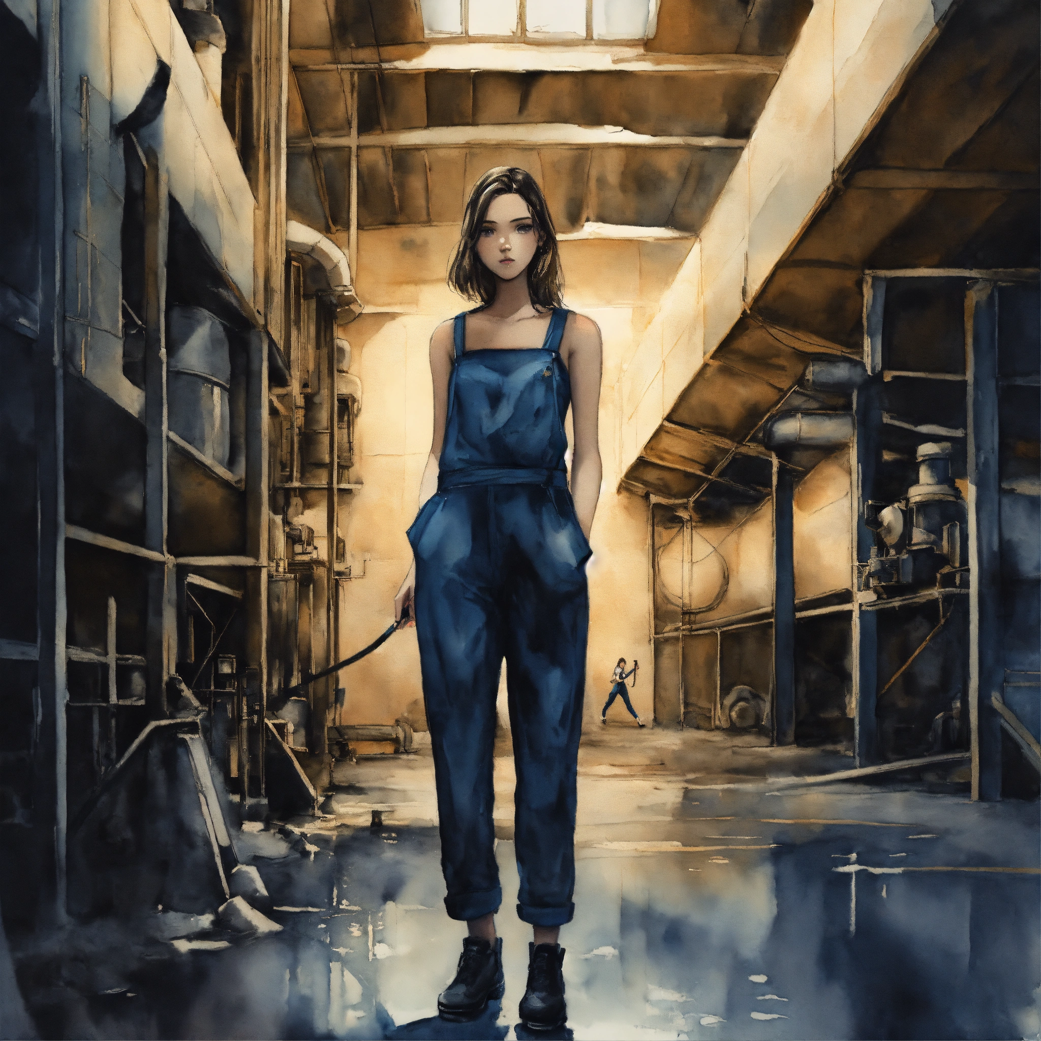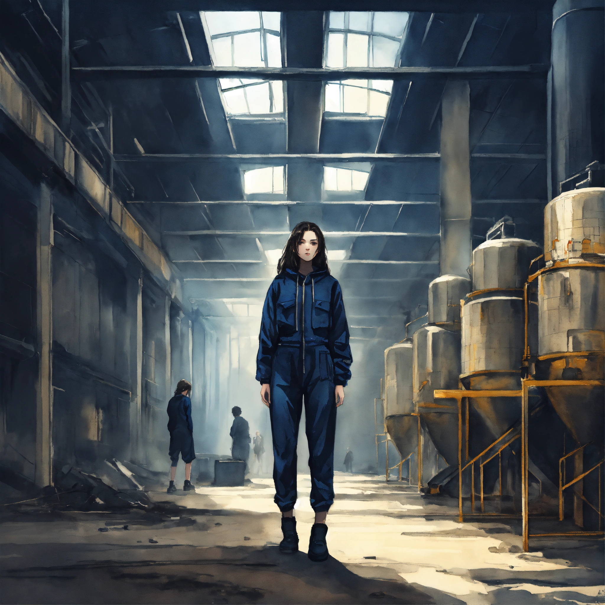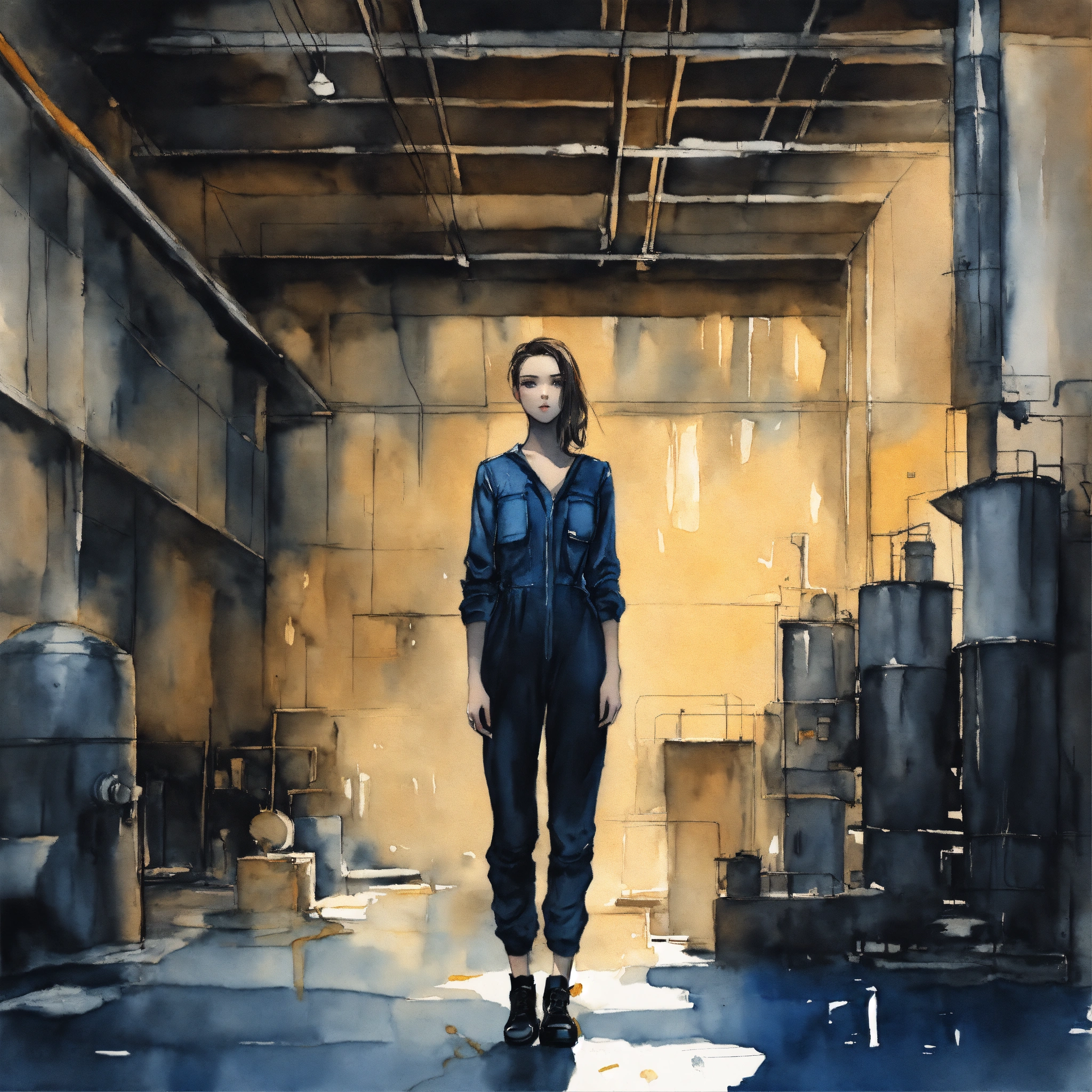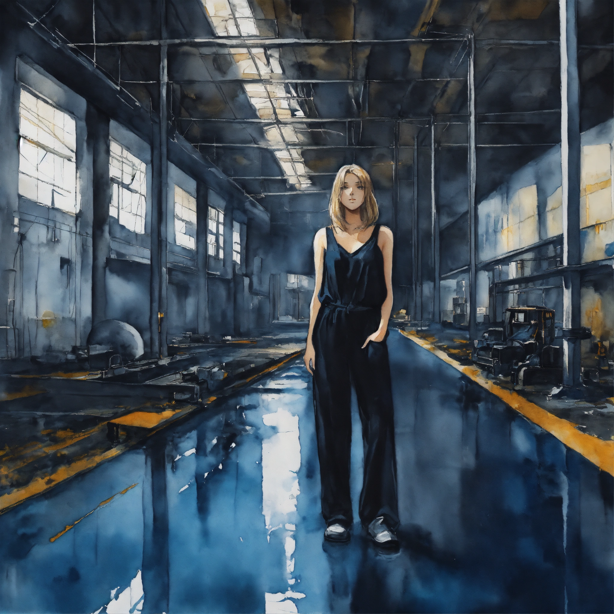 Full body illustration of a woman, young, 18 years old, beautiful, wearing a black jumpsuit, inside a concrete factory hall, dark, blue, watercolors, gloomy and depressing ambient, artwork by tom björklund