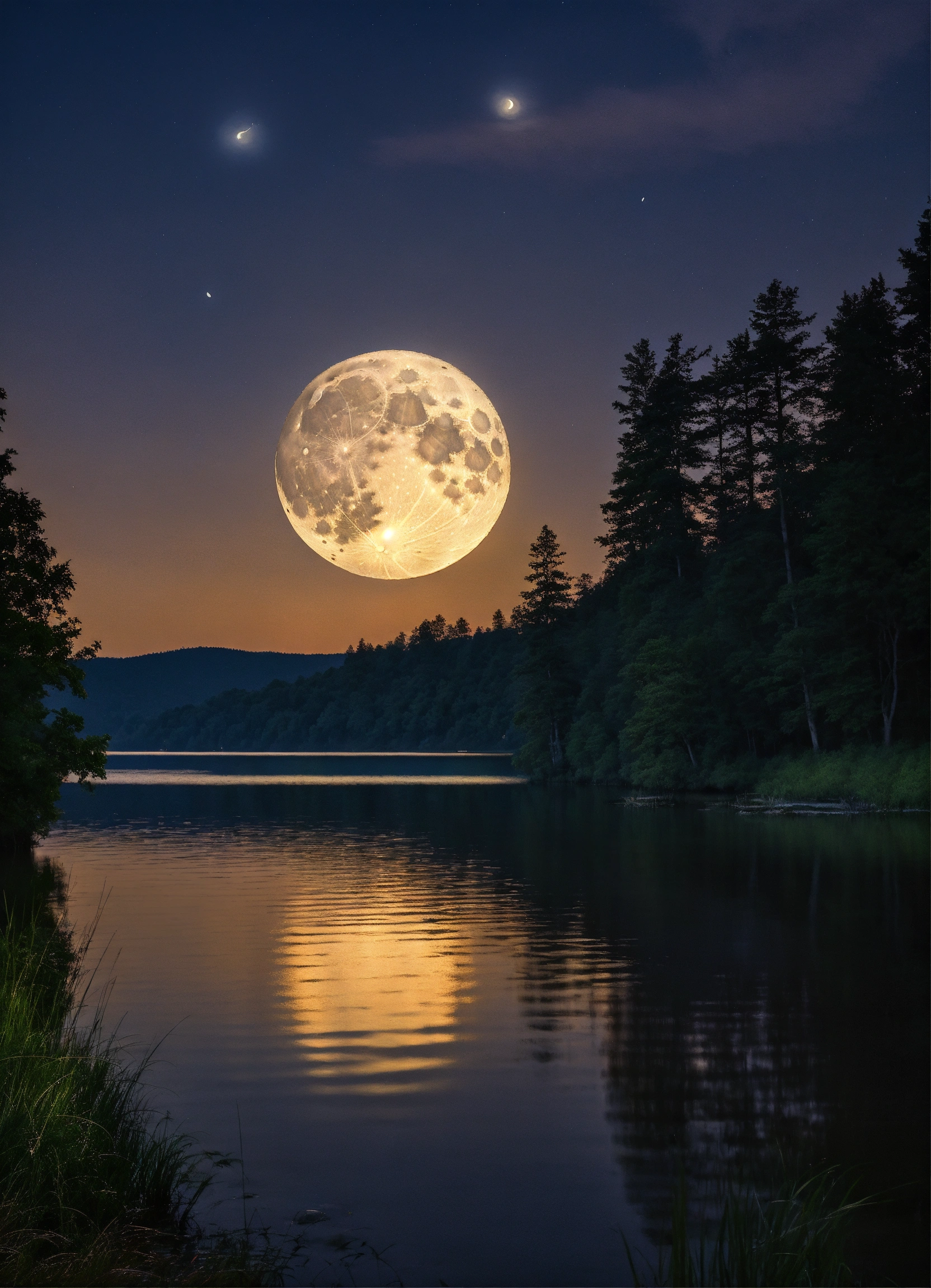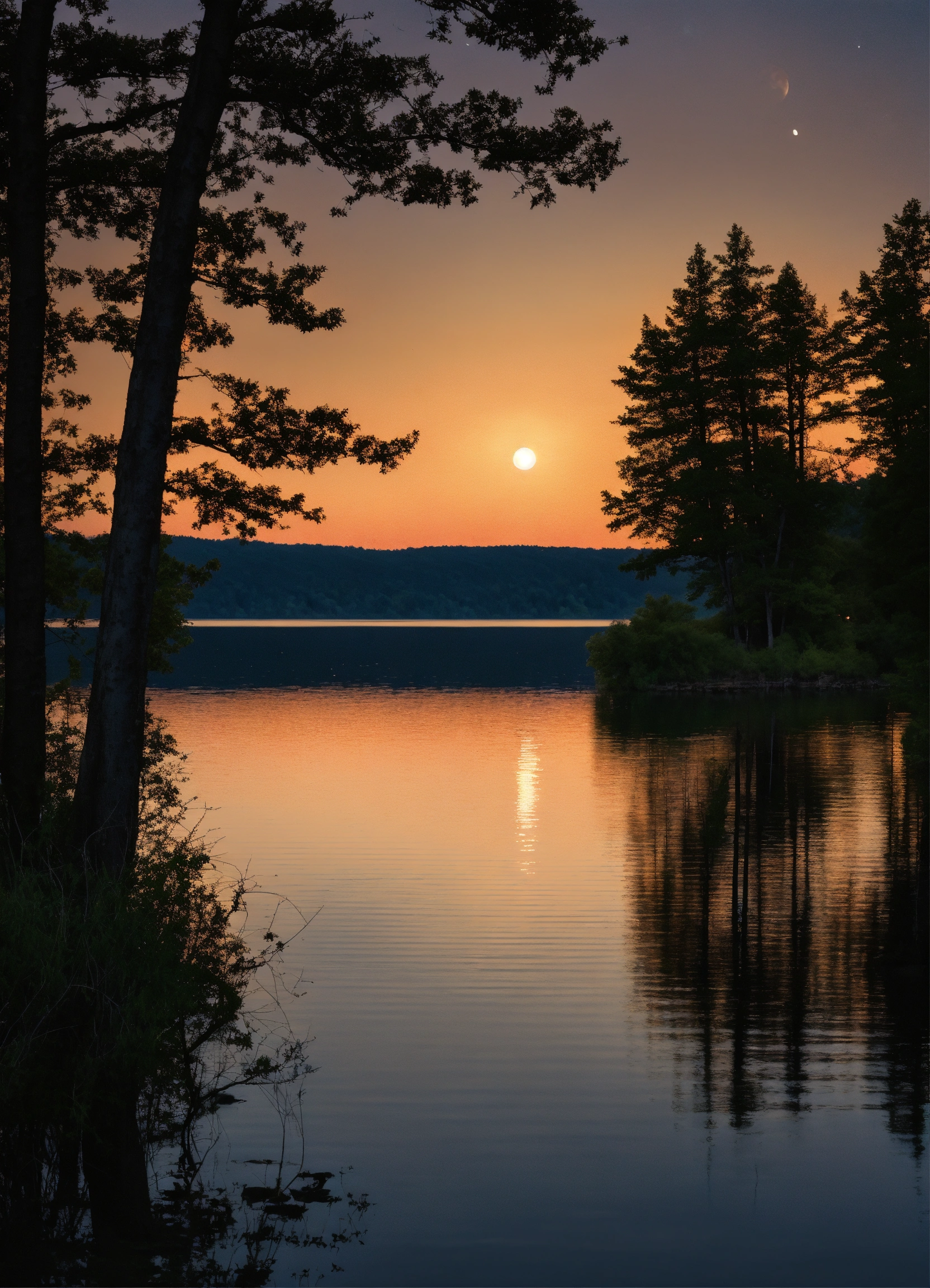 "describe a serene and picturesque night scene by a tranquil, moonlit lake. the moon hangs low in the sky, casting a silvery glow on the calm water. the surrounding landscape is shrouded in darkness, but the moonlight reveals the gentle ripples on the lake's surface. please capture the tranquillity and beauty of this nighttime lakeside vista."