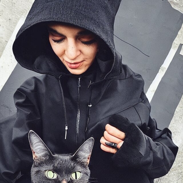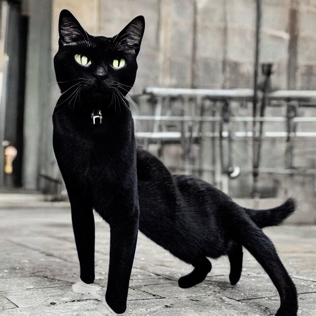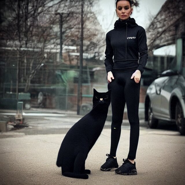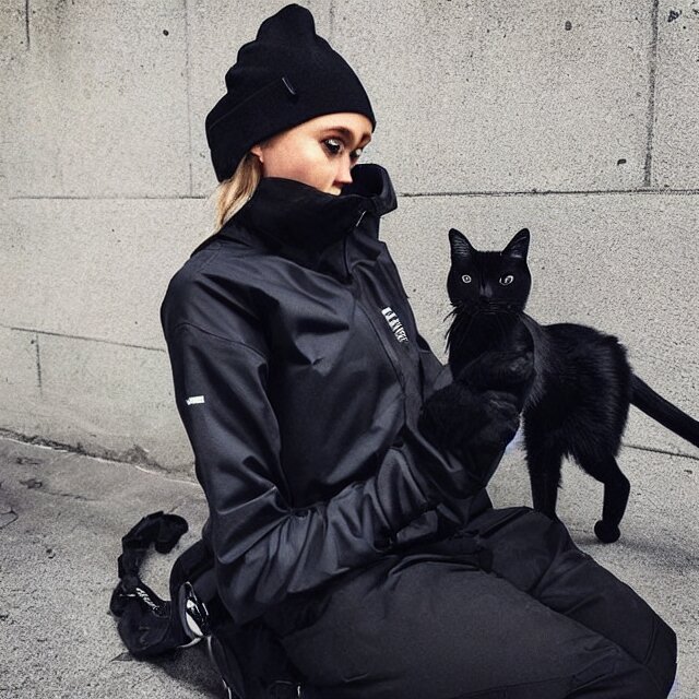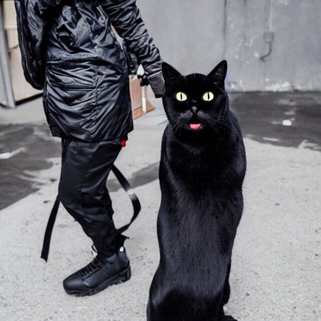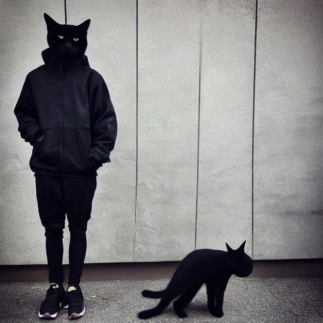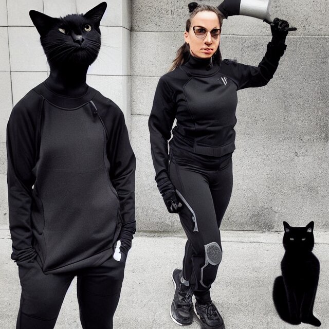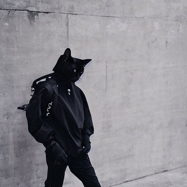 A black cat wearing techwear