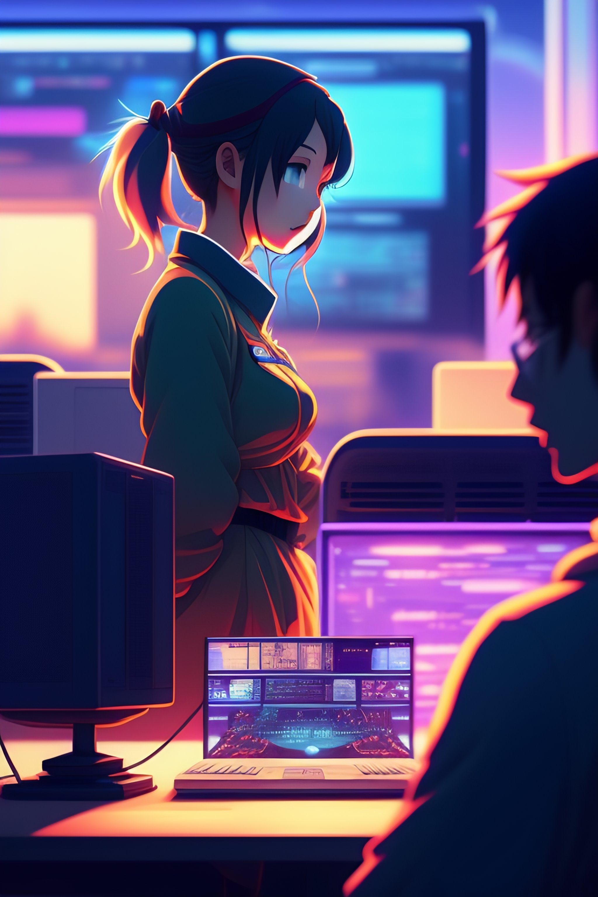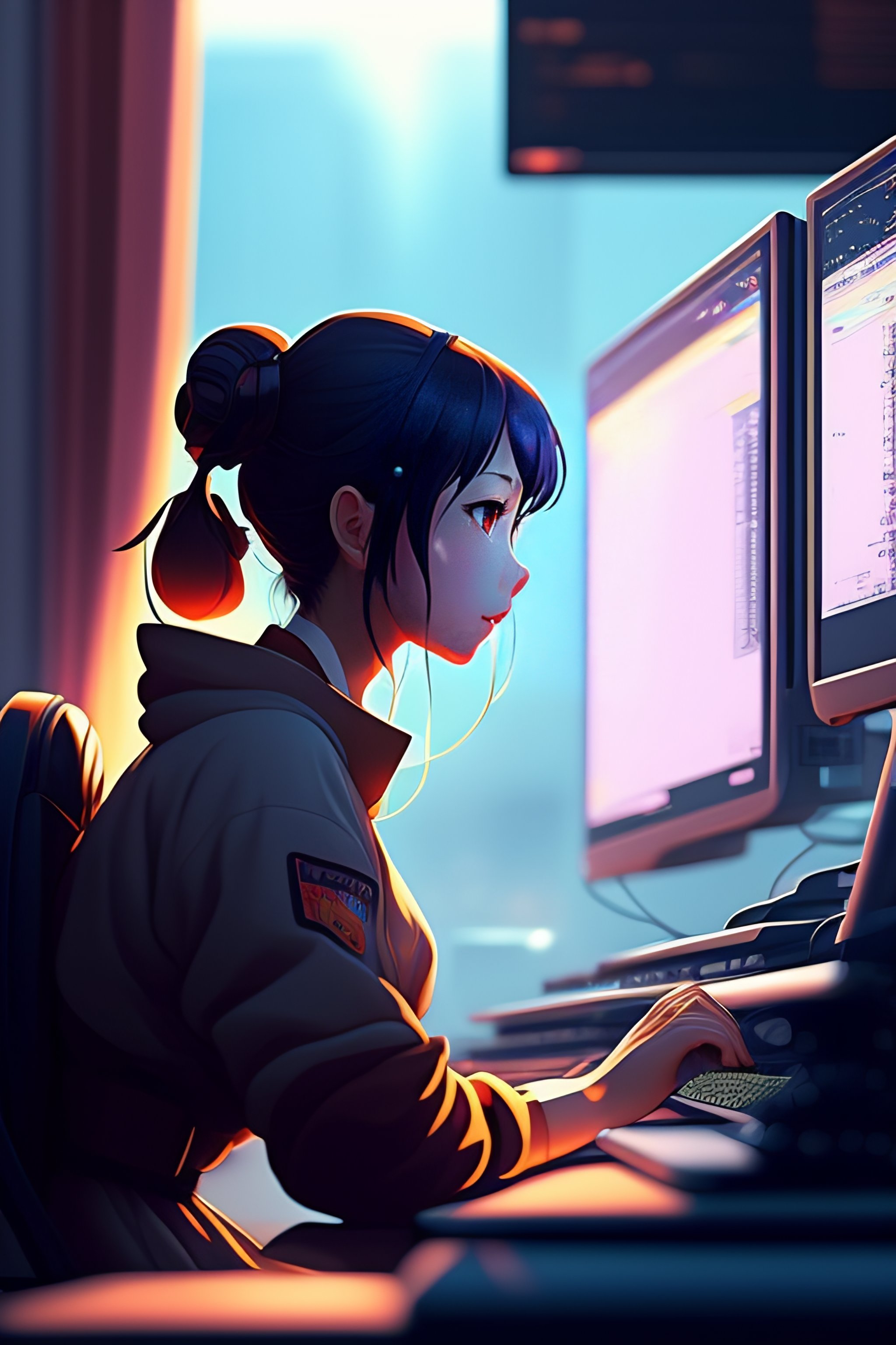 Create a high resolution artwork of lofi, anime girl is programming at a computer in a room full of gadgets, snown, web developer, by makoto shinkai and ghibli studio, outlined silhouettes, dramatic lighting, highly detailed, incredible quality, trending on artstation, masterpiece, 8k