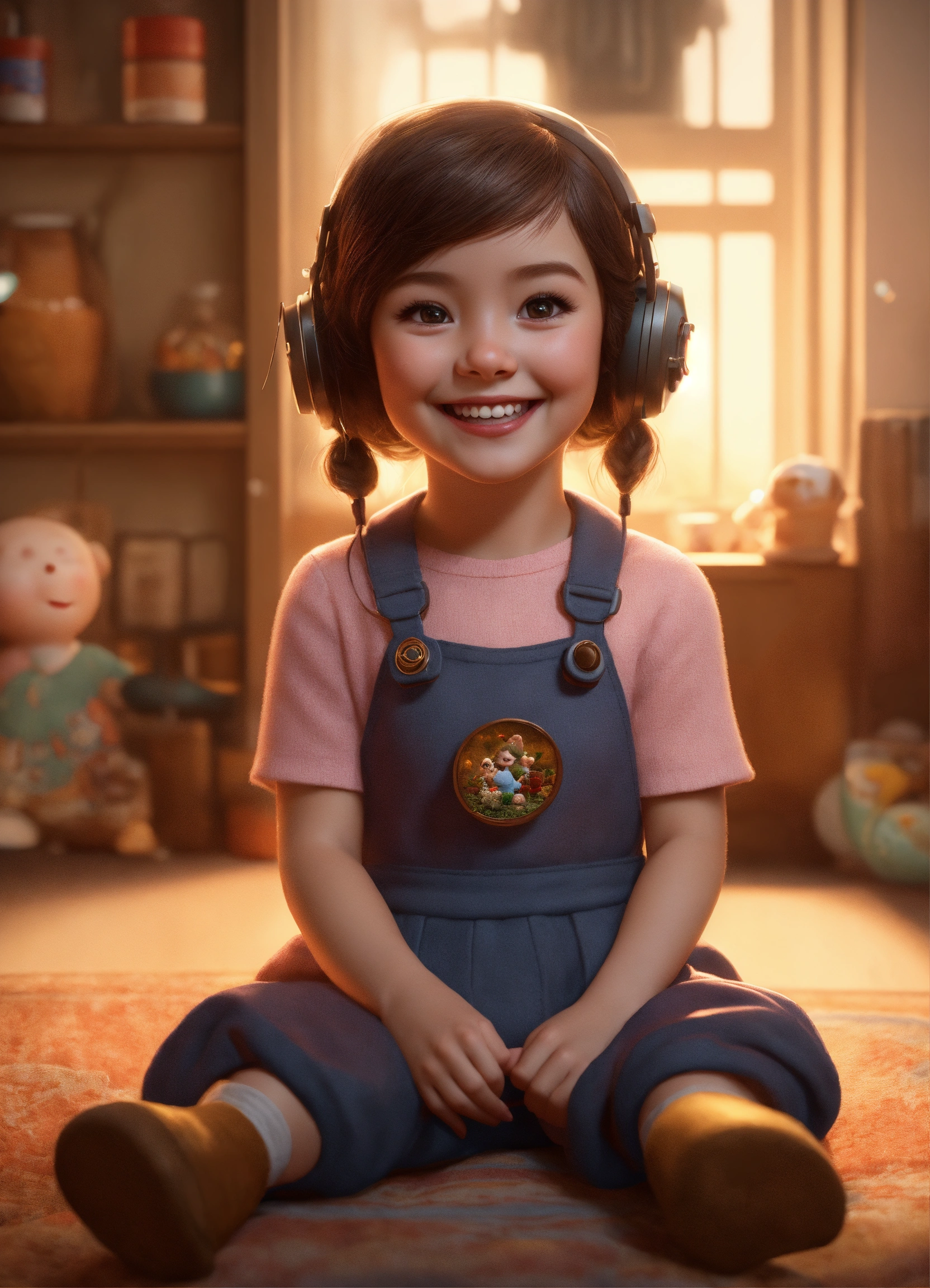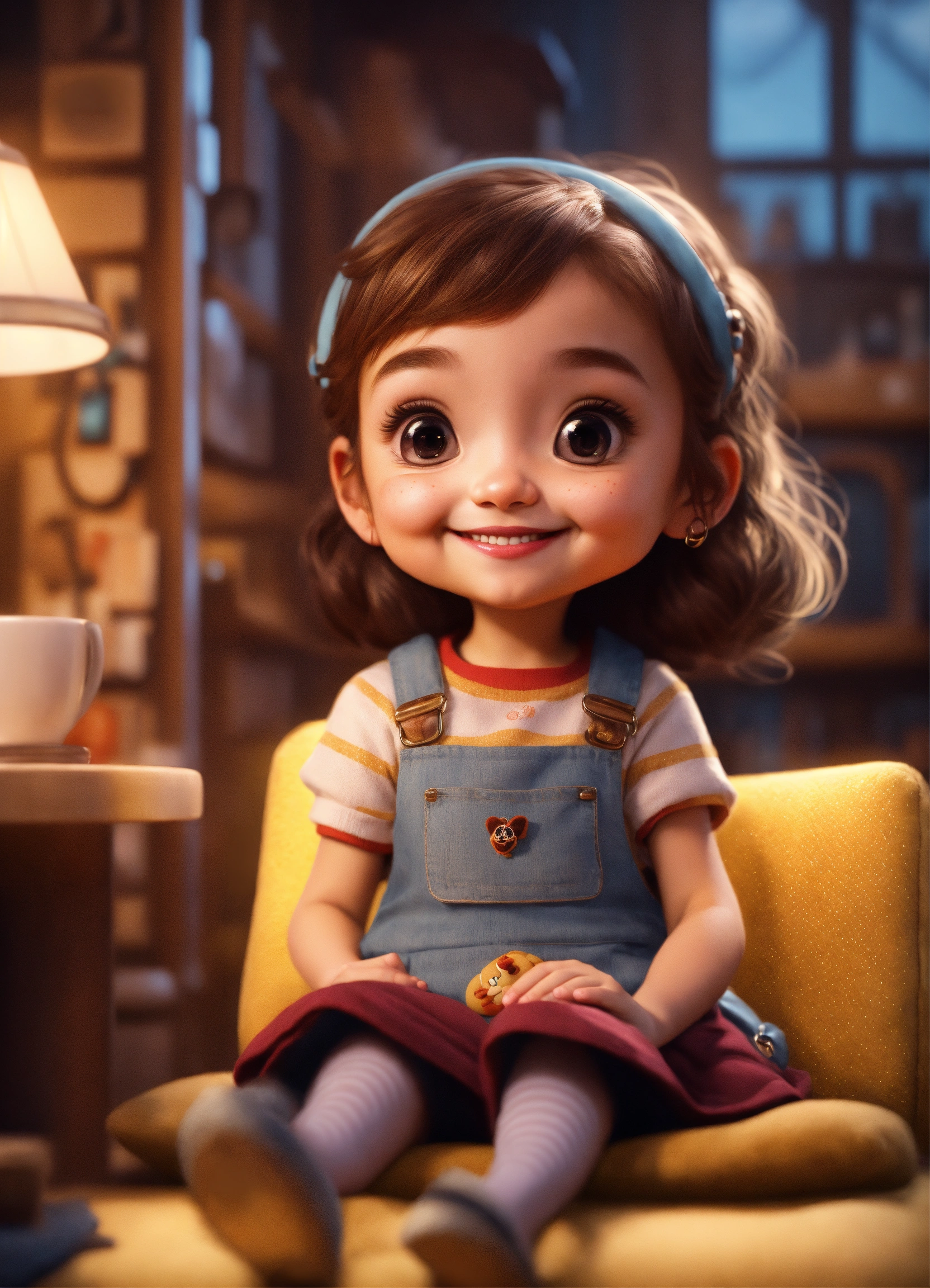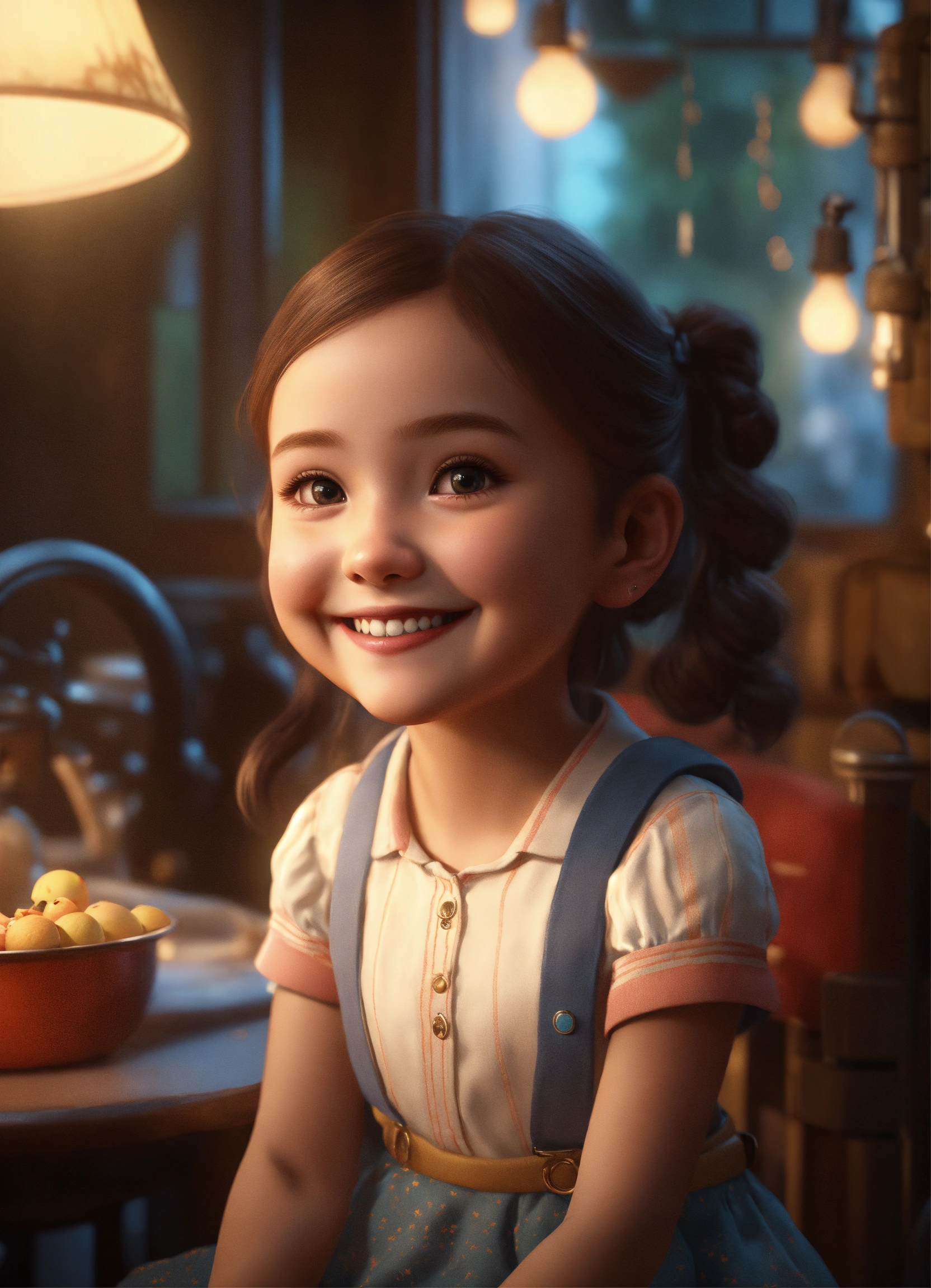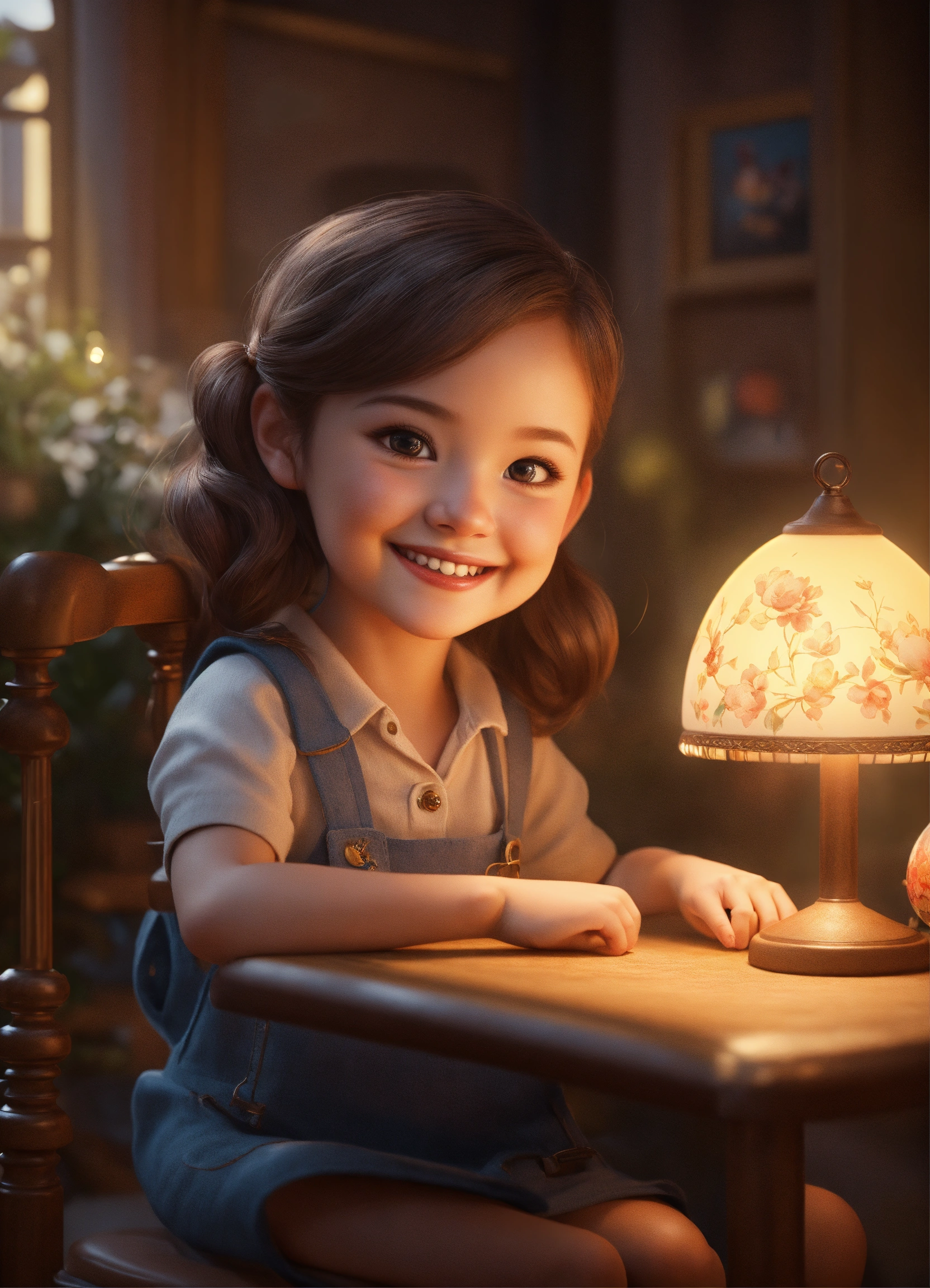 Cute adorable tiny girl smiling greeting me, unreal engine, she is seated, cozy interior lighting, art station, detailed digital painting, cinematic, character design by mark ryden and pixar, unreal 5, daz, hyper realistic