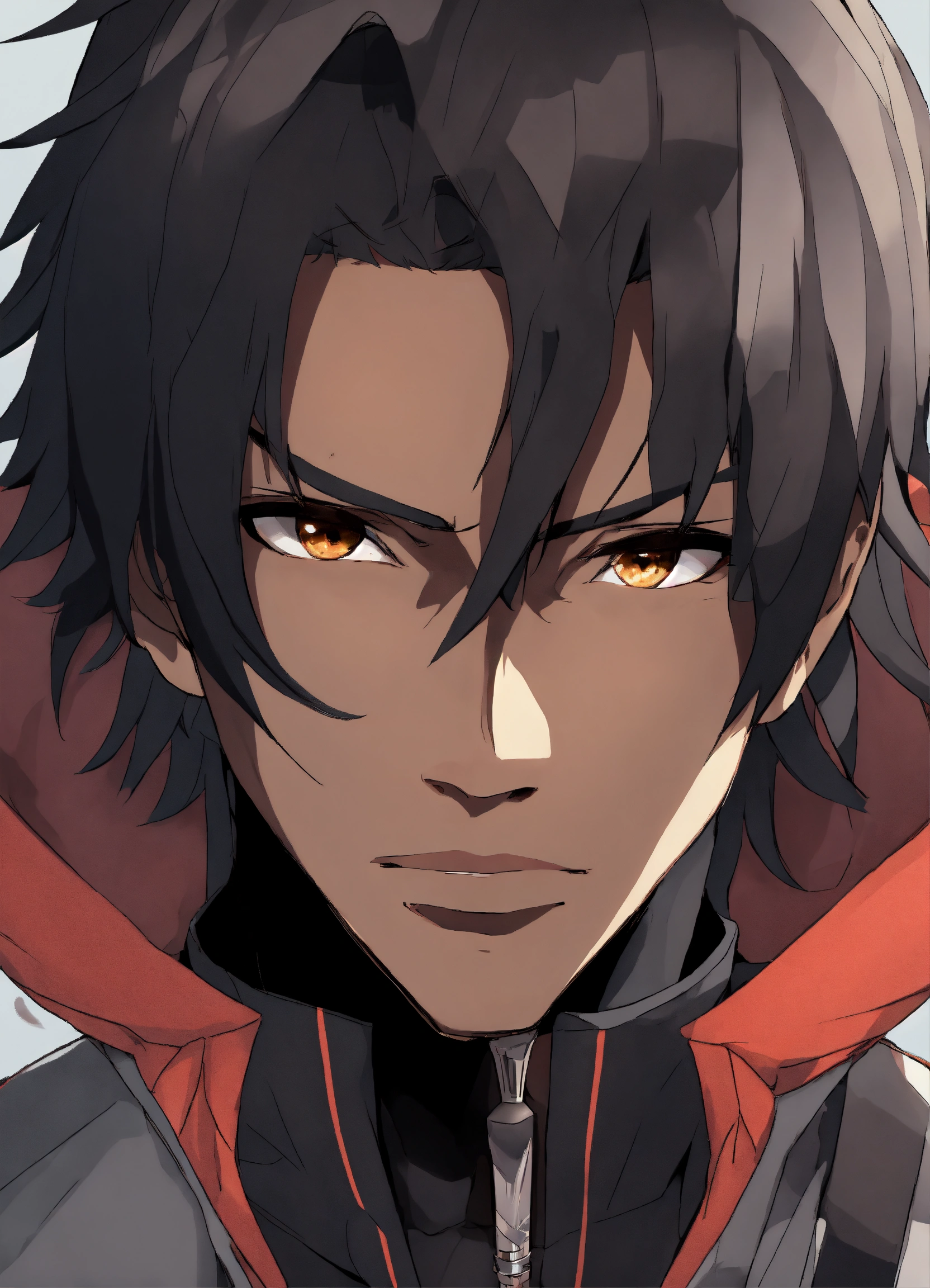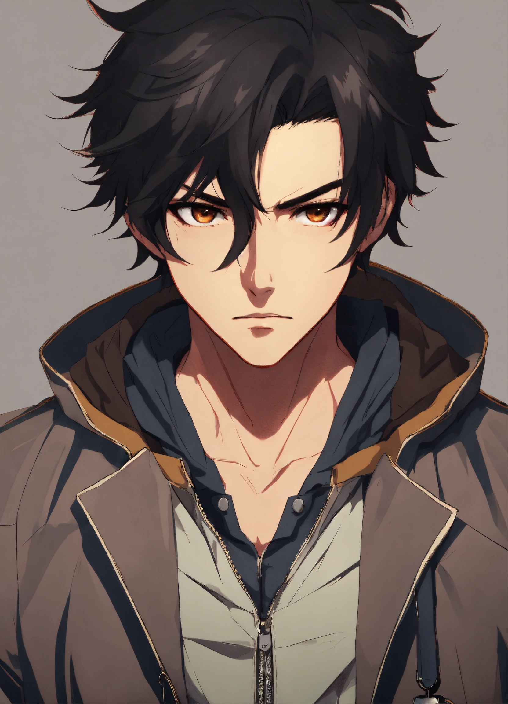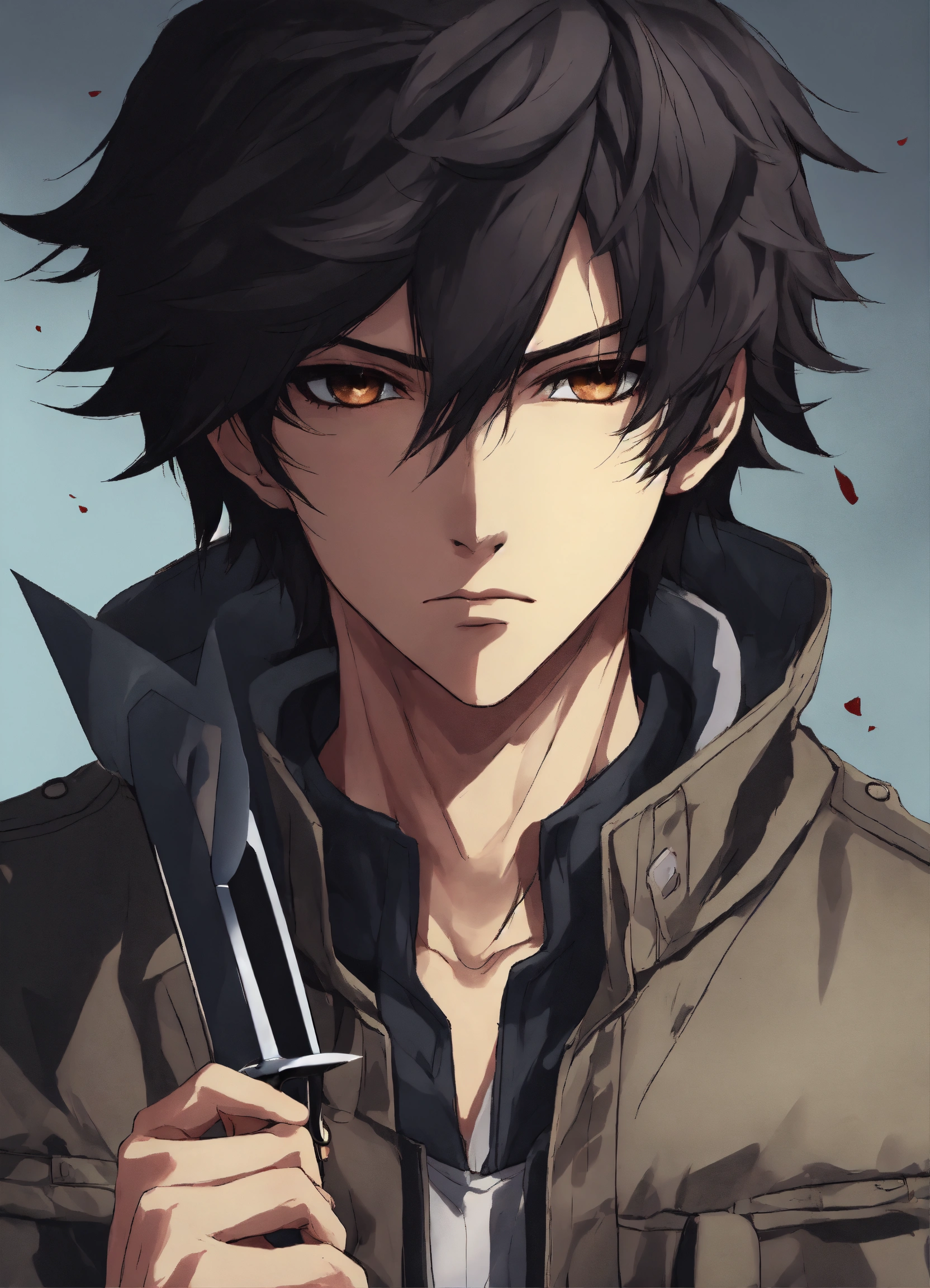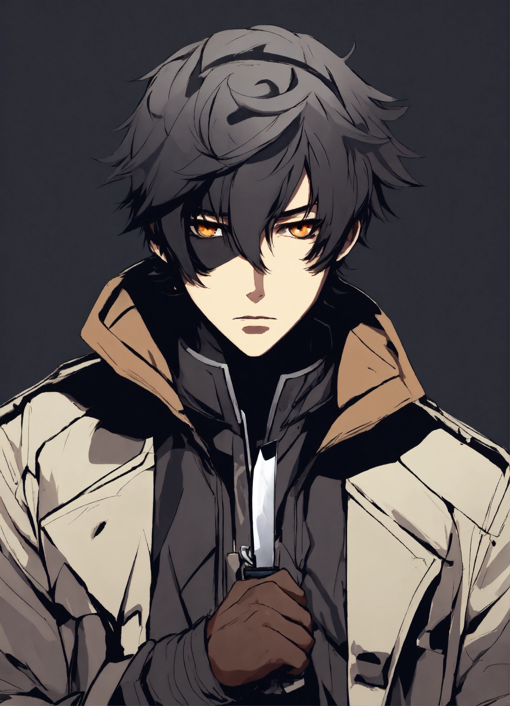 Anime styles, black male with brown eyes, gray jacket, serious expression, black hair, holding knife, mask covering half of face