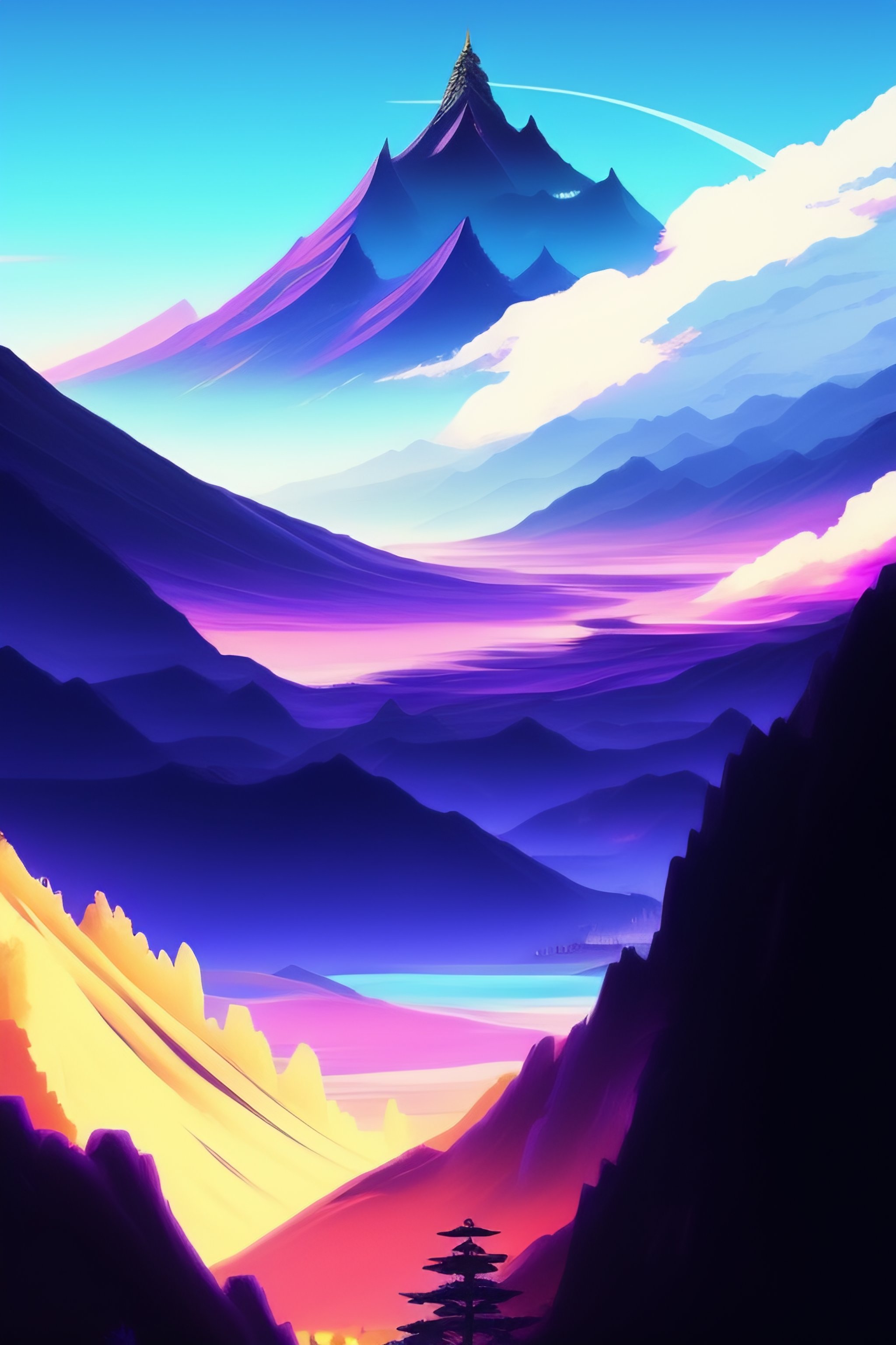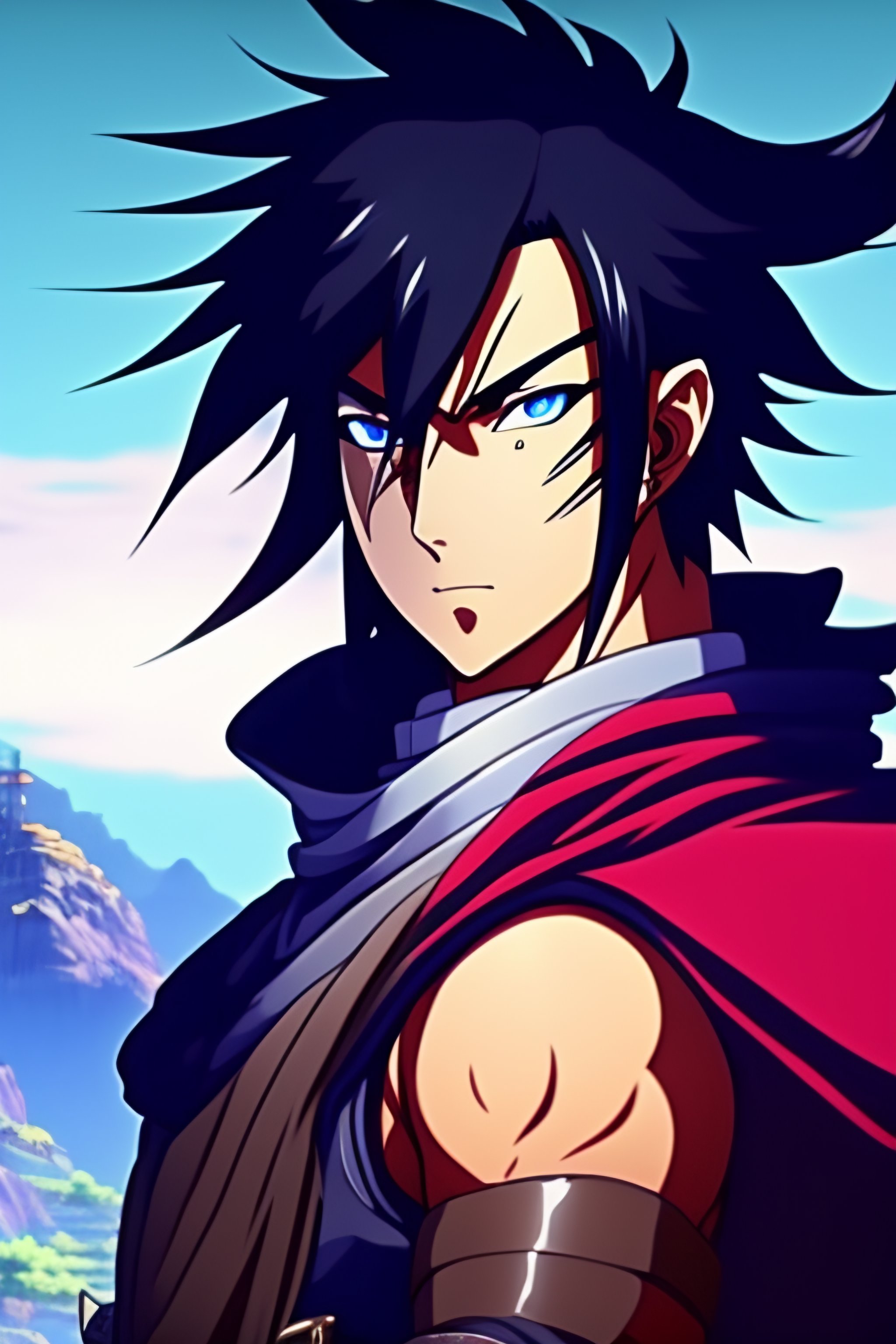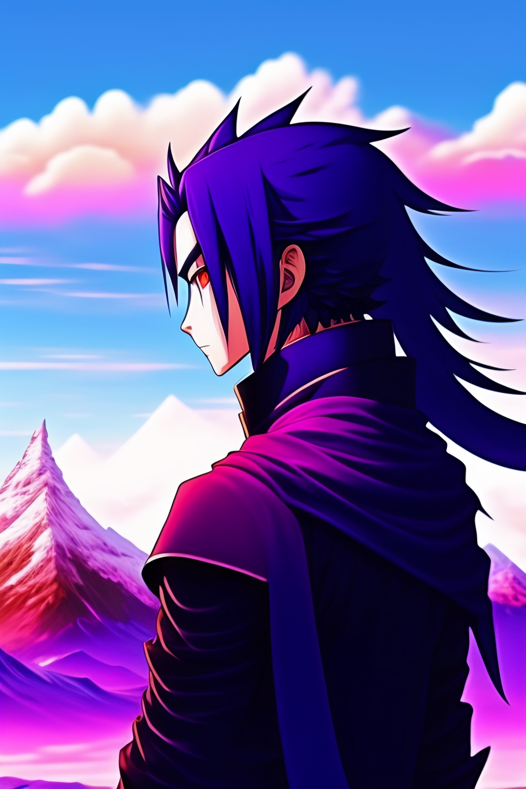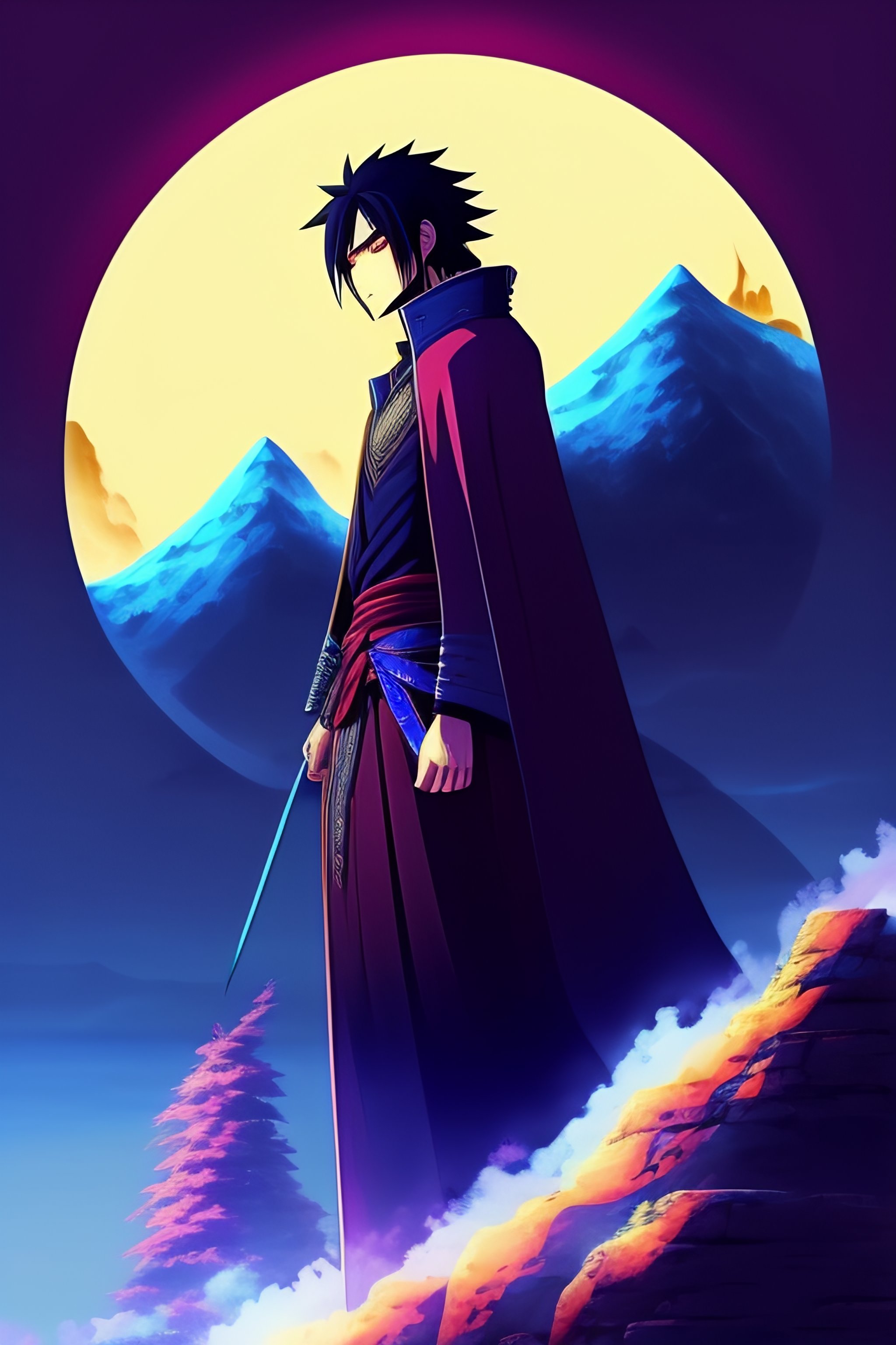 Sasuke uchiha susanoo towering over a mountain anime style 2d